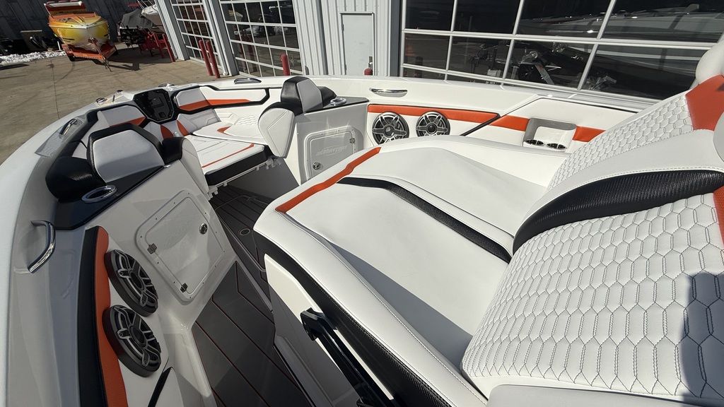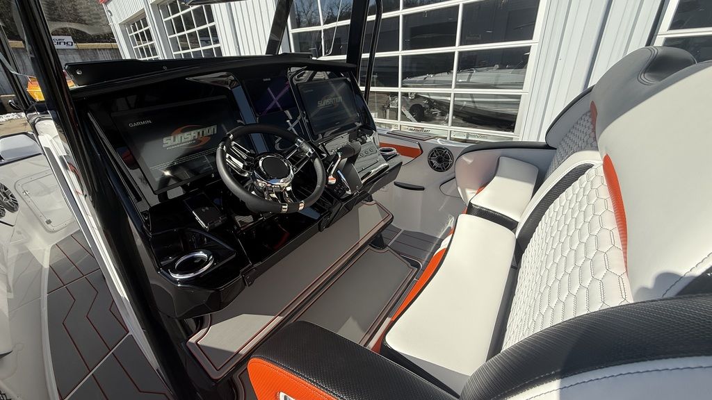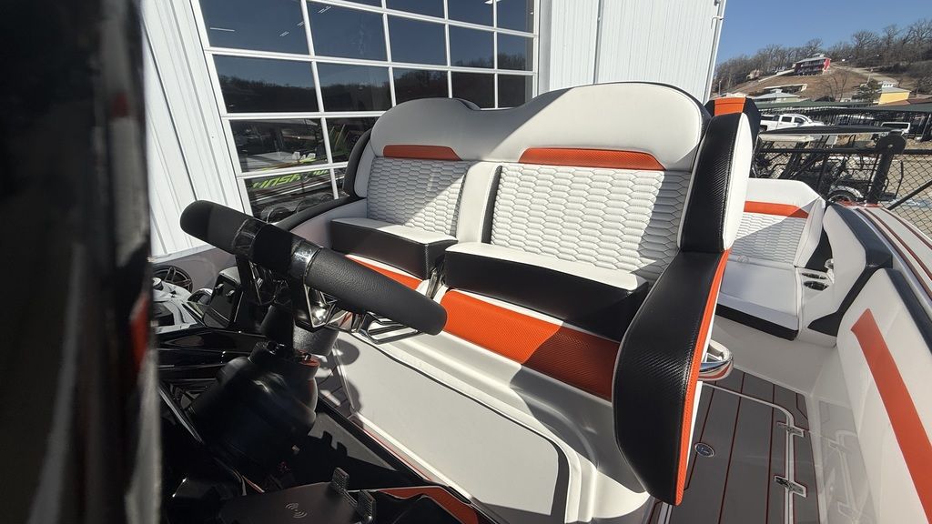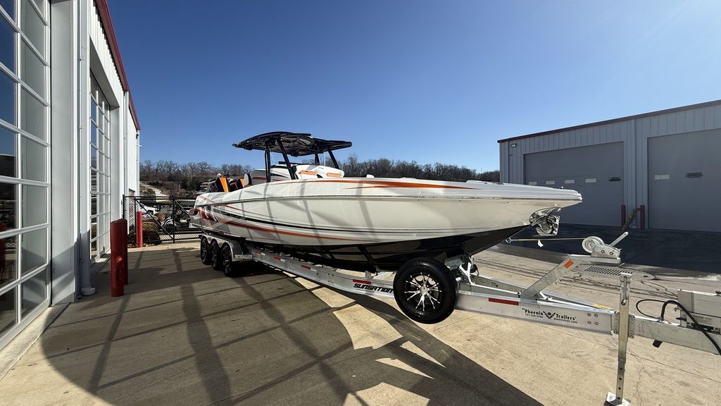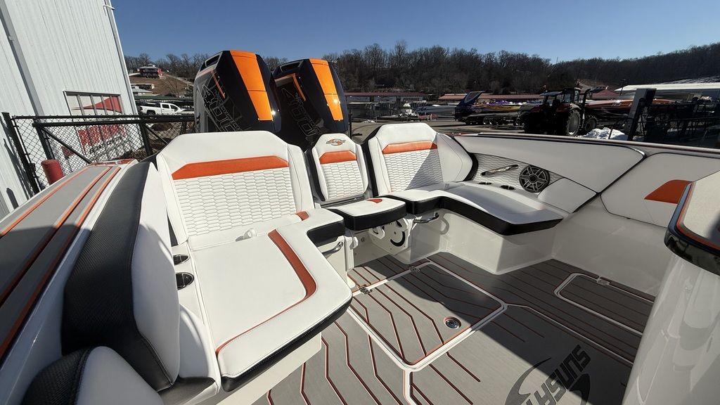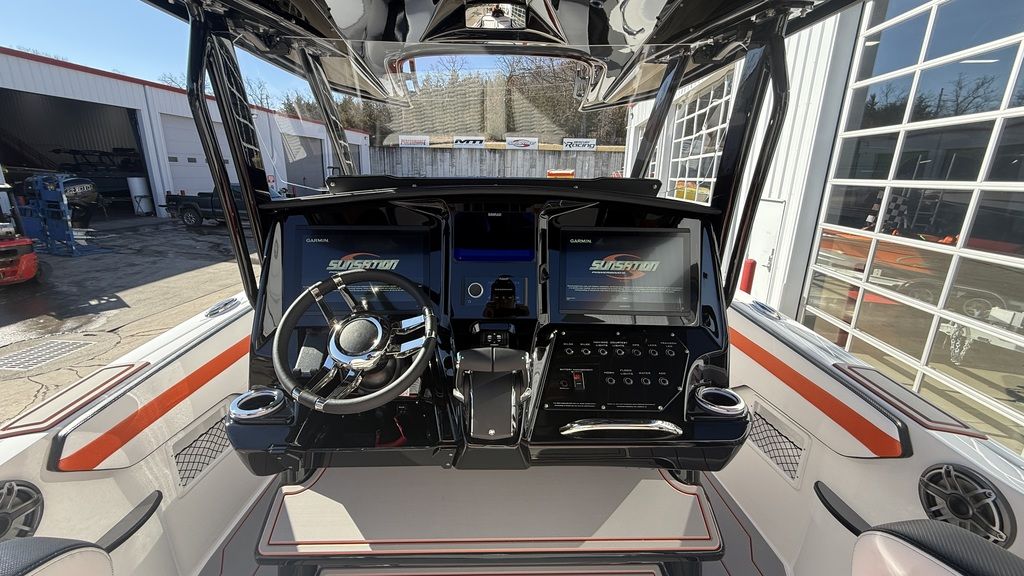 powered by twin Mercury Racing V10 400R V10'S. STANDARD EQUIPMENT; Additional battery with onboard charger and electric switch on dash, dual Garmin 8616s, Mercury Vessel View, Stage 2 JL Audio stereo upgrade with remote in bow, depth sounder, LED RGB color changing cockpit lights, Sea Deck flooring, Isotta steering wheel with tilt, LED trim tab indicators, Mercury Vessel View Garmin, pump out porta potty, and windlass anchor. OPTIONAL EQUIPMENT: Stage 2 stereo upgrade. White gelcoat on deck and modules, black dash, black hard top, Mitcher T custom paint, canvas package; includes TTop cover, and high pressure washdown. Trailer available, financing and transportation available.