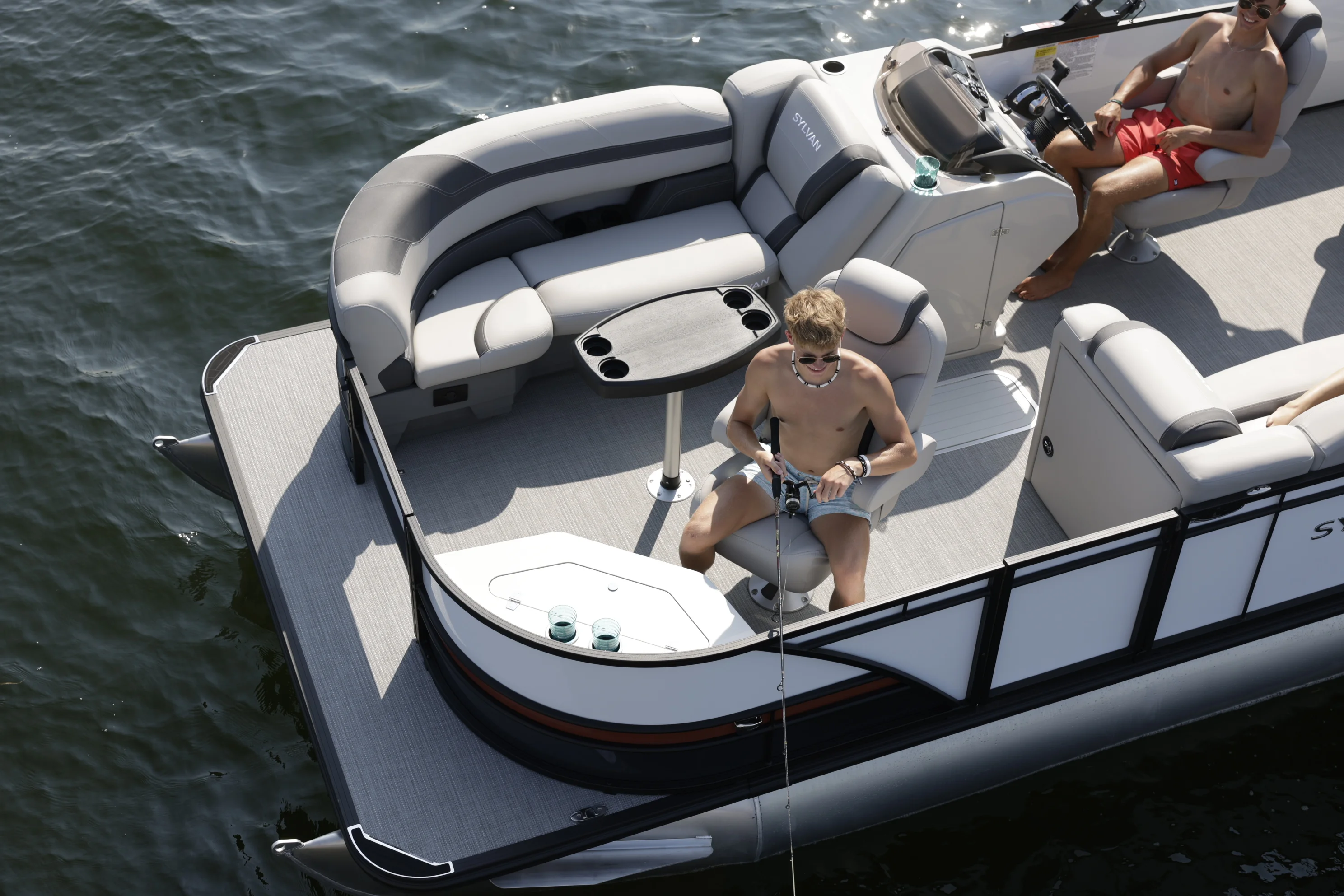 Act fast on this limited-time offer! The Sylvan L3 Party Fish embodies the essence of a family-friendly fishing pontoon, showcasing a dedicated fishing station complete with rod holders and a live well, catering to anglers of all skill levels. Whether casting lines or reeling in the catch of the day, this specialized setup ensures an optimal fishing experience. Equipped with the standard SPX third tube performance package, this pontoon guarantees stable and smooth cruising, providing a secure platform for fishing excursions on the water. Its sleek black exterior rails add a touch of contemporary style, making it a standout vessel on any lake or river. Furthermore, the Sylvan L3 Party Fish features an integrated ski tow, offering versatility for water sports enthusiasts. Plus, a power canopy provides refuge from the sun's rays, ensuring comfort during extended outings. Loaded with family-friendly features and tailored for angling adventures, this pontoon is the ideal companion for creating lasting memories on the water with family and friends.