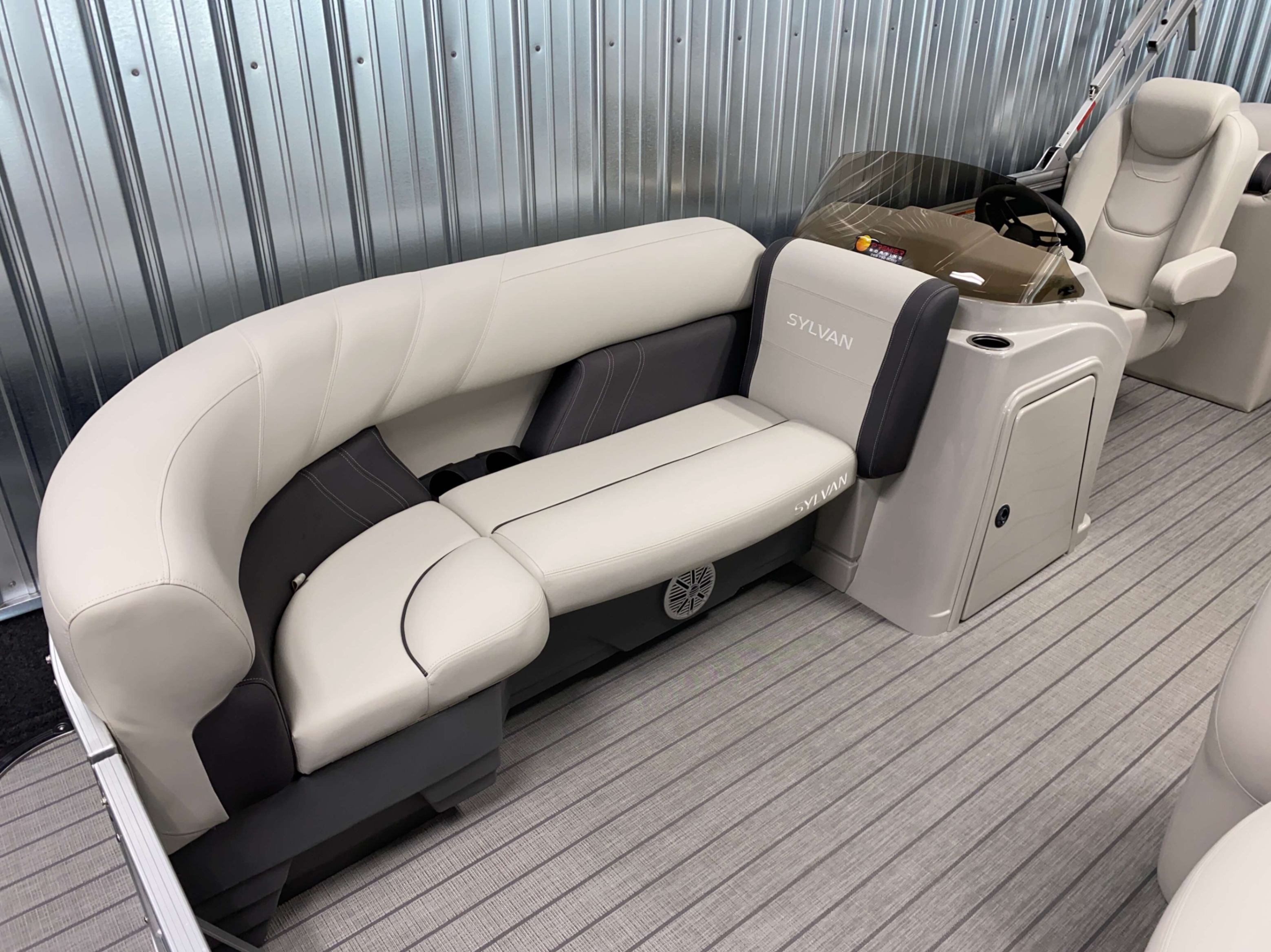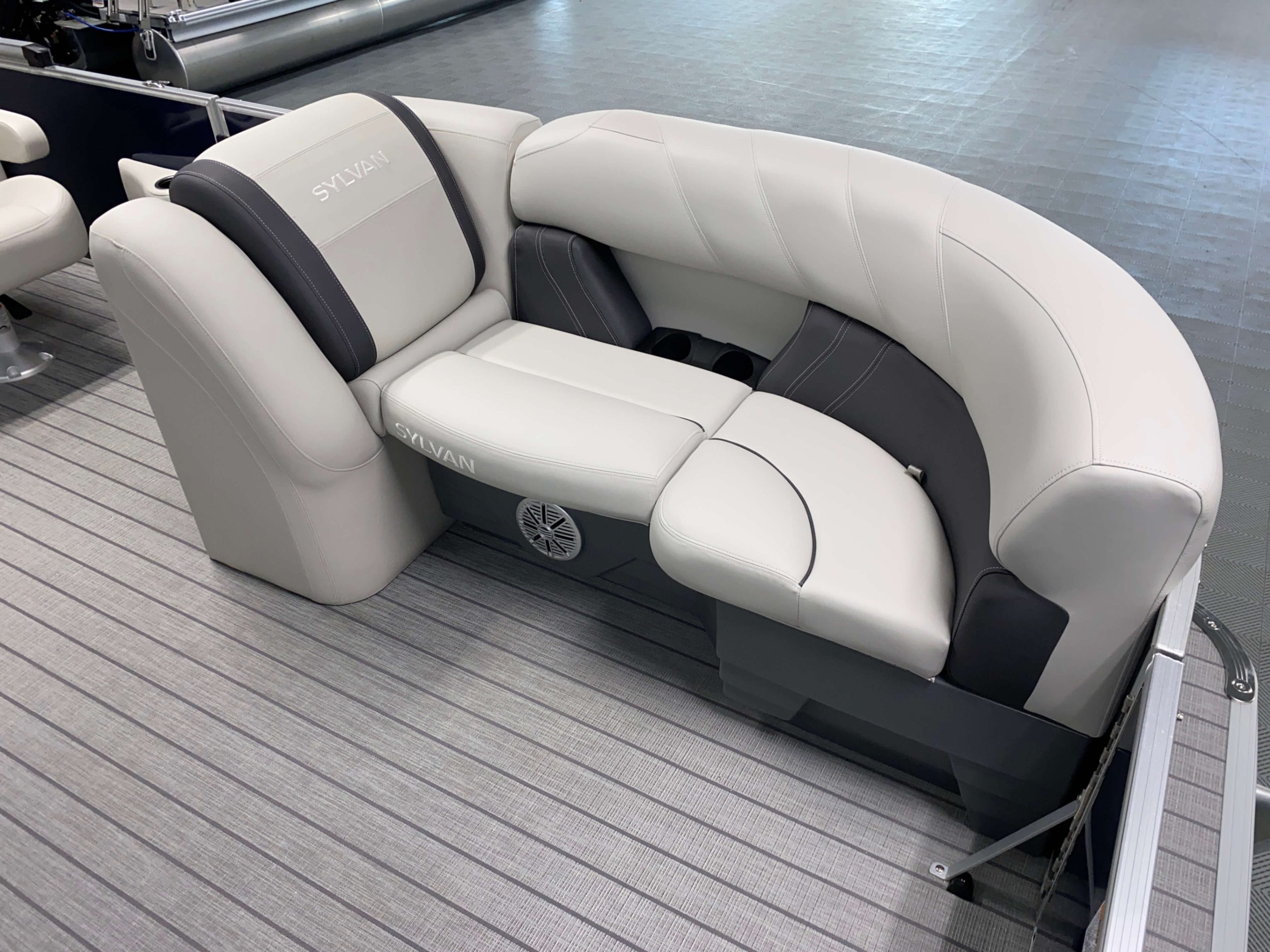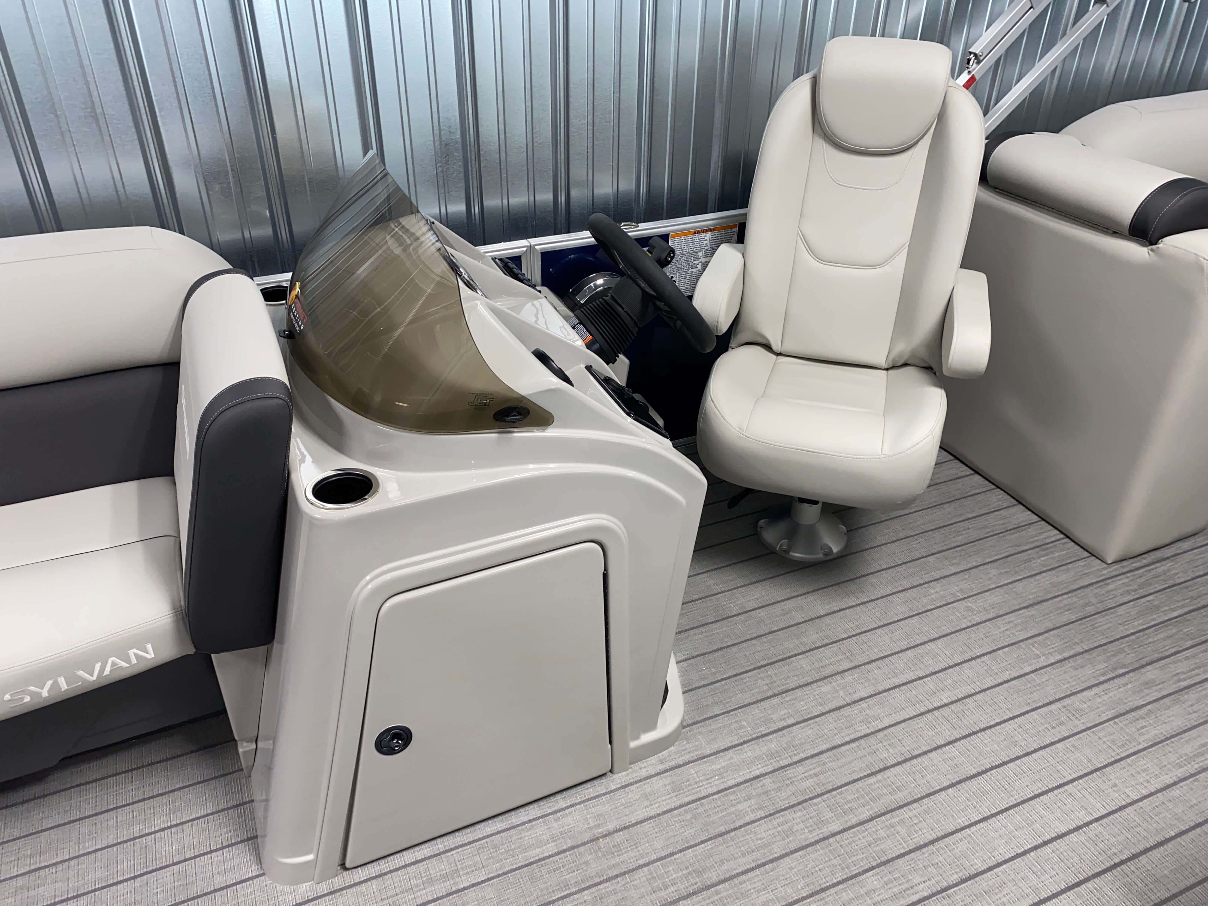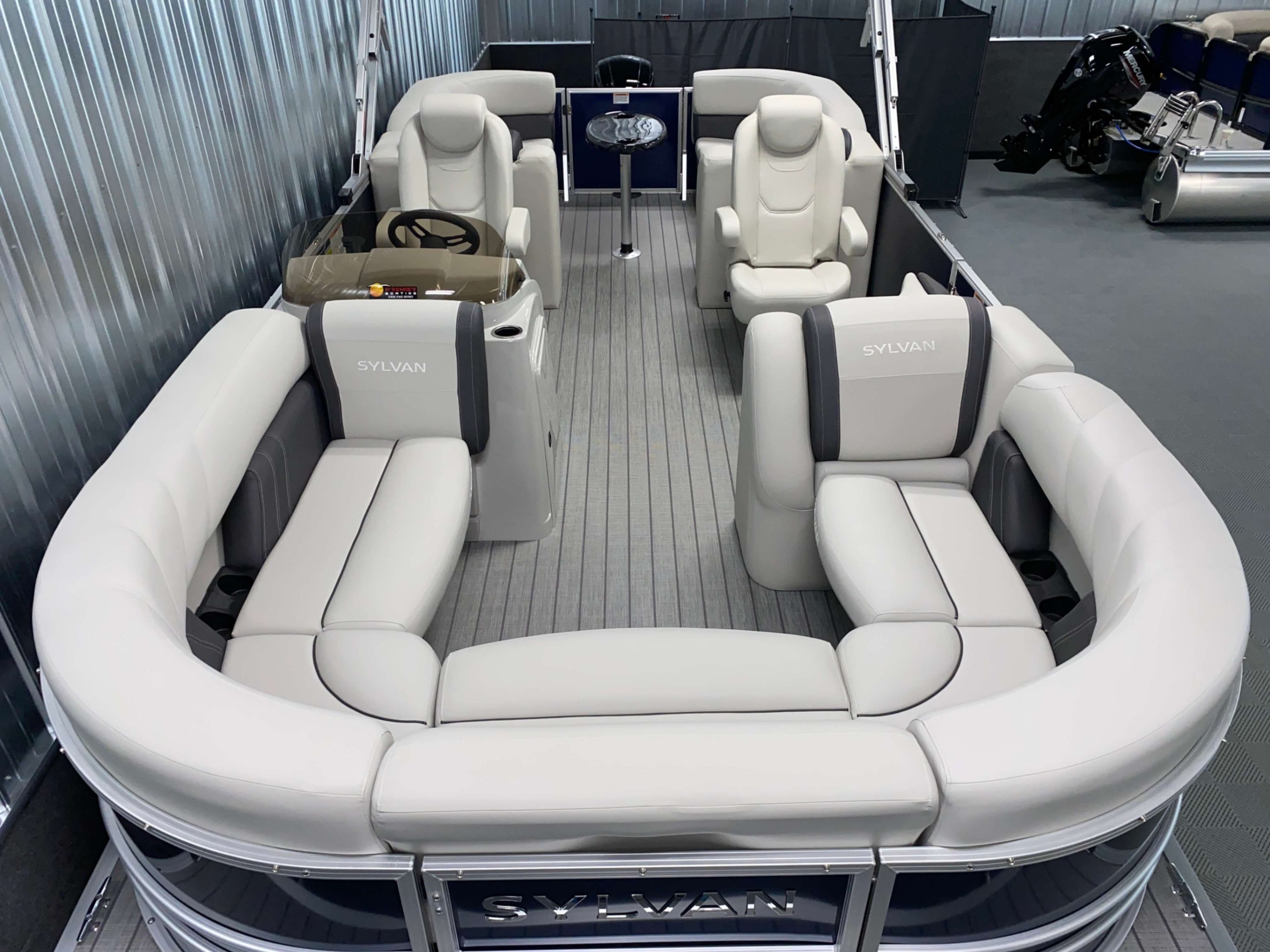 ***Pictured with optional portable gate seat.*** The Sylvan Mirage 8522 LZ pontoon is designed to optimize seating capacity and enhance family outings on the water. With four wrap-around couches, this pontoon provides ample seating for everyone onboard, ensuring comfort and enjoyment throughout the journey. The inclusion of a power bimini top allows passengers to easily adjust for shade or sunshine, catering to varying weather conditions. Additionally, the pontoon features a full fiberglass console equipped with a spacious storage area, offering convenient storage for all essentials. Family-friendly amenities such as a changing room and a four-step ladder further enhance the pontoon's appeal, providing added convenience and versatility for all members of the family. Whether you're cruising, fishing, or simply enjoying a day on the water, the Sylvan Mirage 8522 LZ pontoon ensures a memorable and comfortable experience for everyone aboard.