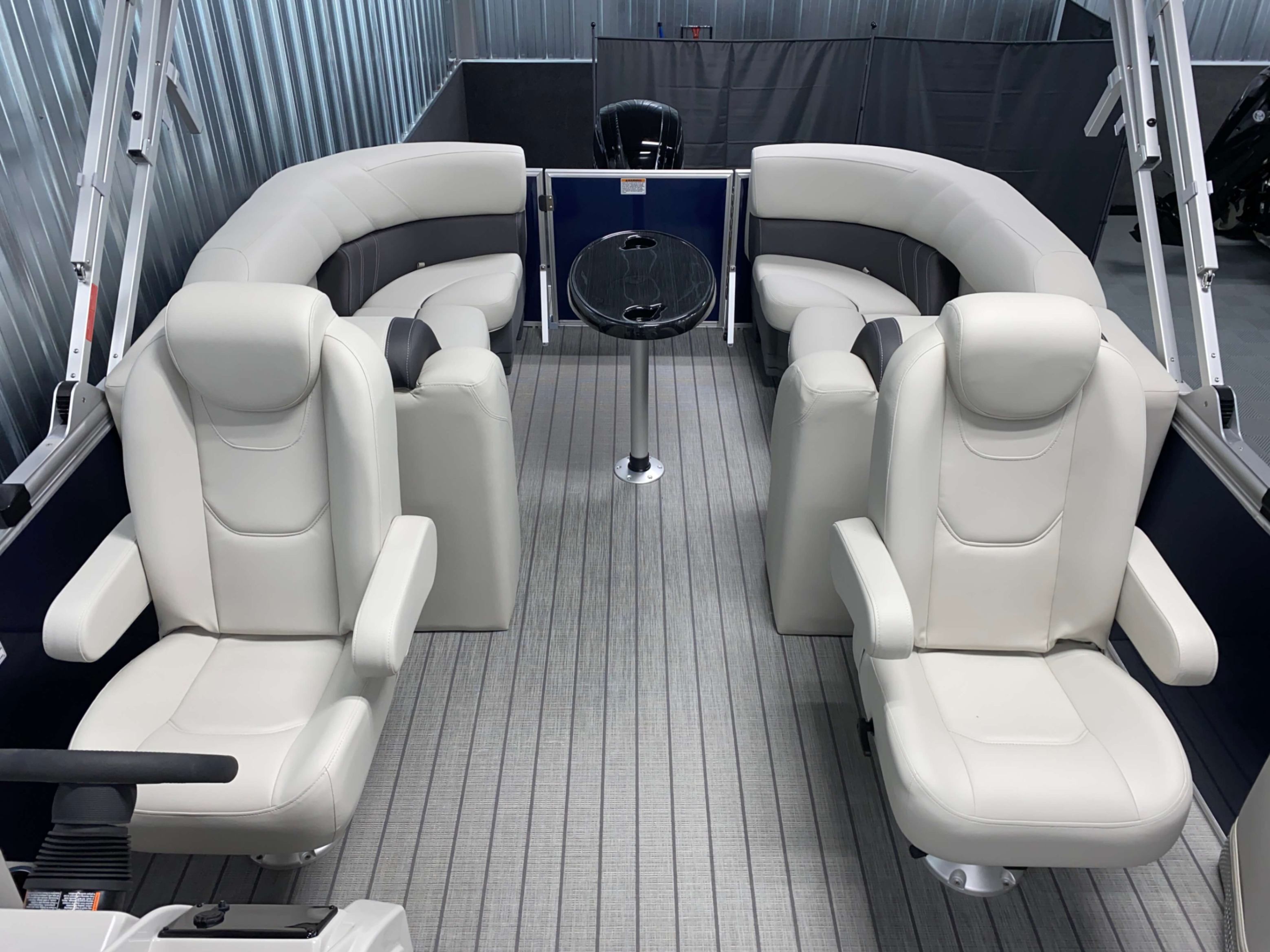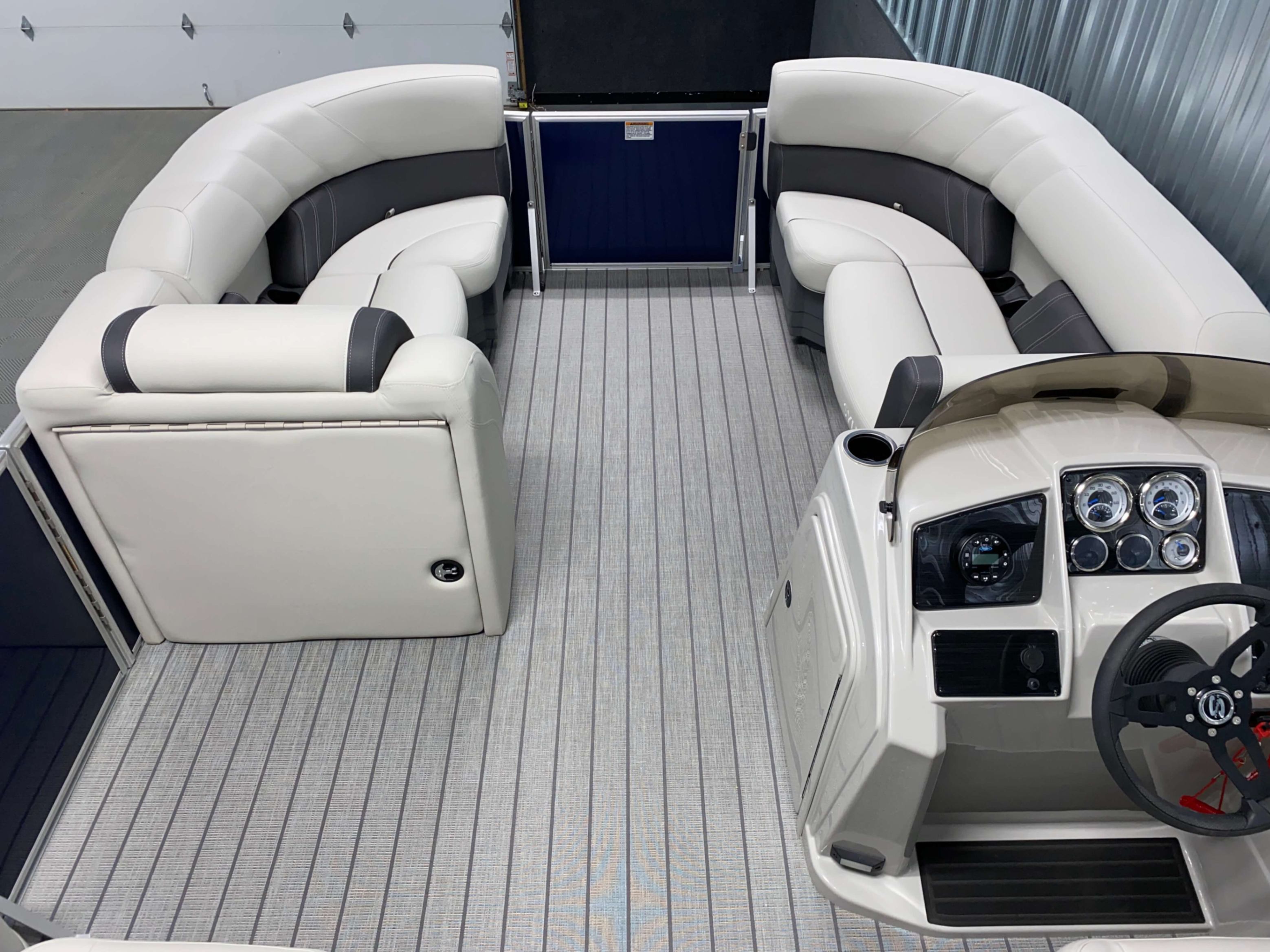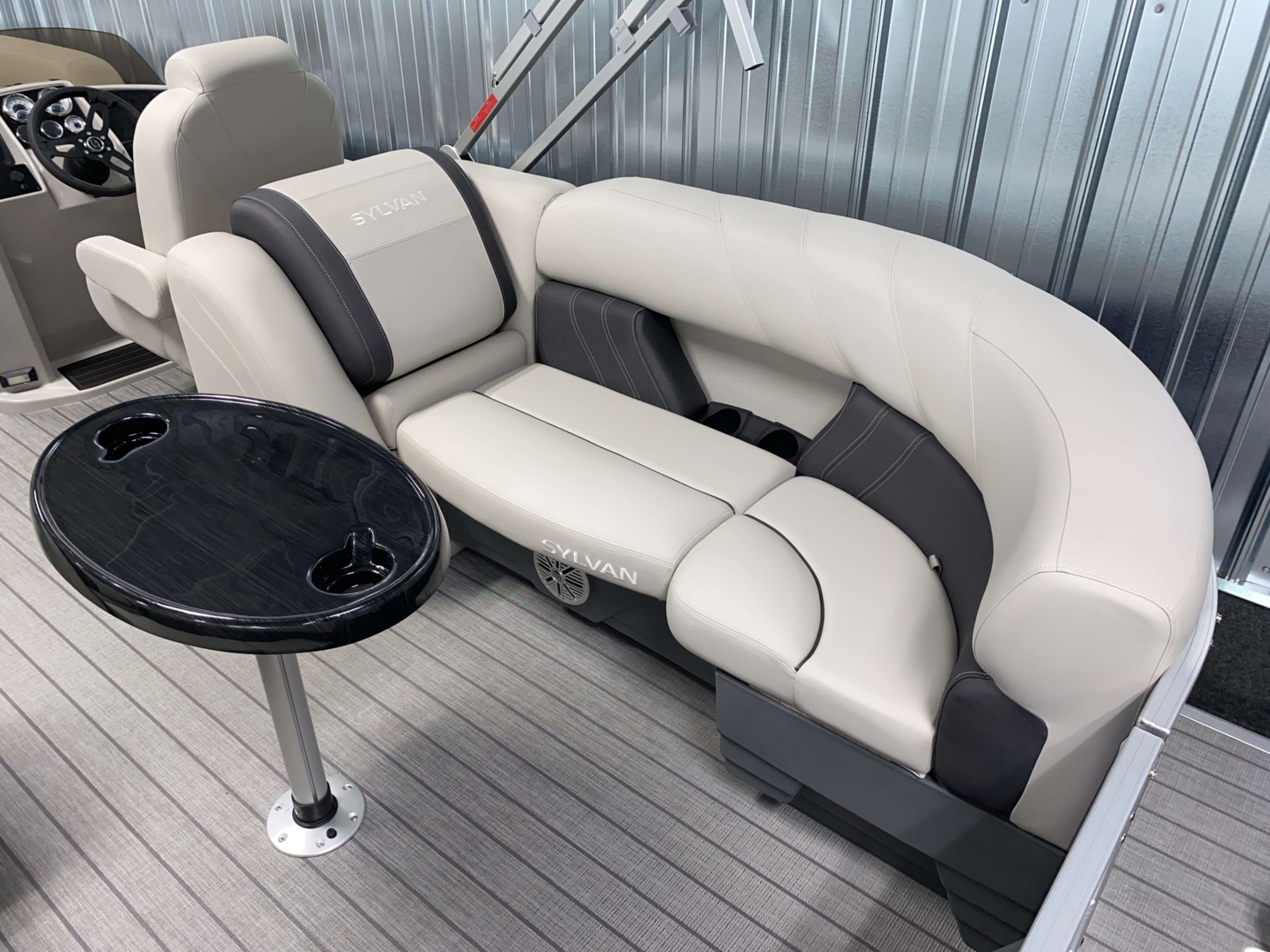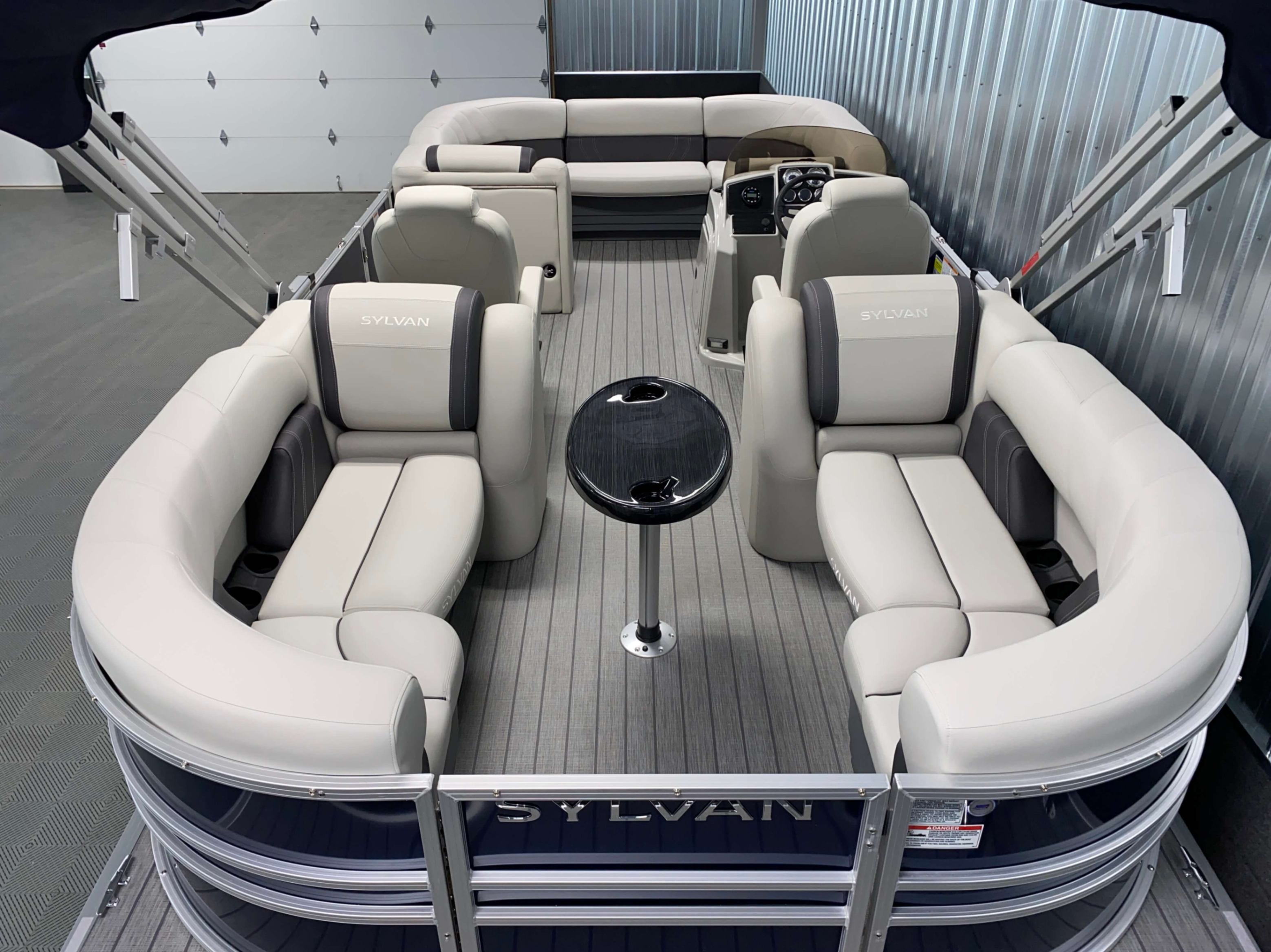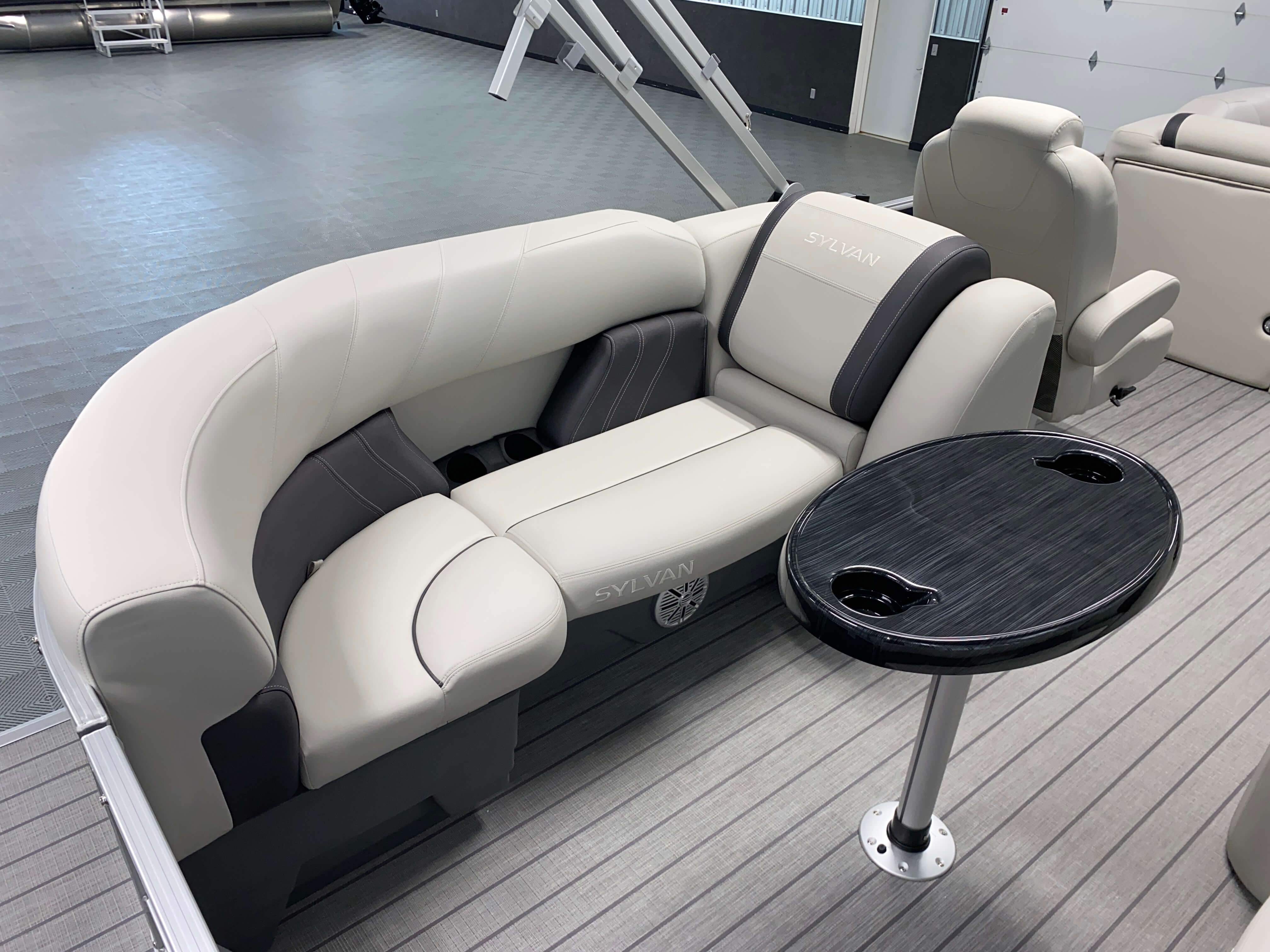 ***Pictured with optional portable gate seat.*** The Sylvan Mirage 8522 LZ pontoon is designed to optimize seating capacity and enhance family outings on the water. With four wrap-around couches, this pontoon provides ample seating for everyone onboard, ensuring comfort and enjoyment throughout the journey. The inclusion of a power bimini top allows passengers to easily adjust for shade or sunshine, catering to varying weather conditions. Additionally, the pontoon features a full fiberglass console equipped with a spacious storage area, offering convenient storage for all essentials. Family-friendly amenities such as a changing room and a four-step ladder further enhance the pontoon's appeal, providing added convenience and versatility for all members of the family. Whether you're cruising, fishing, or simply enjoying a day on the water, the Sylvan Mirage 8522 LZ pontoon ensures a memorable and comfortable experience for everyone aboard.