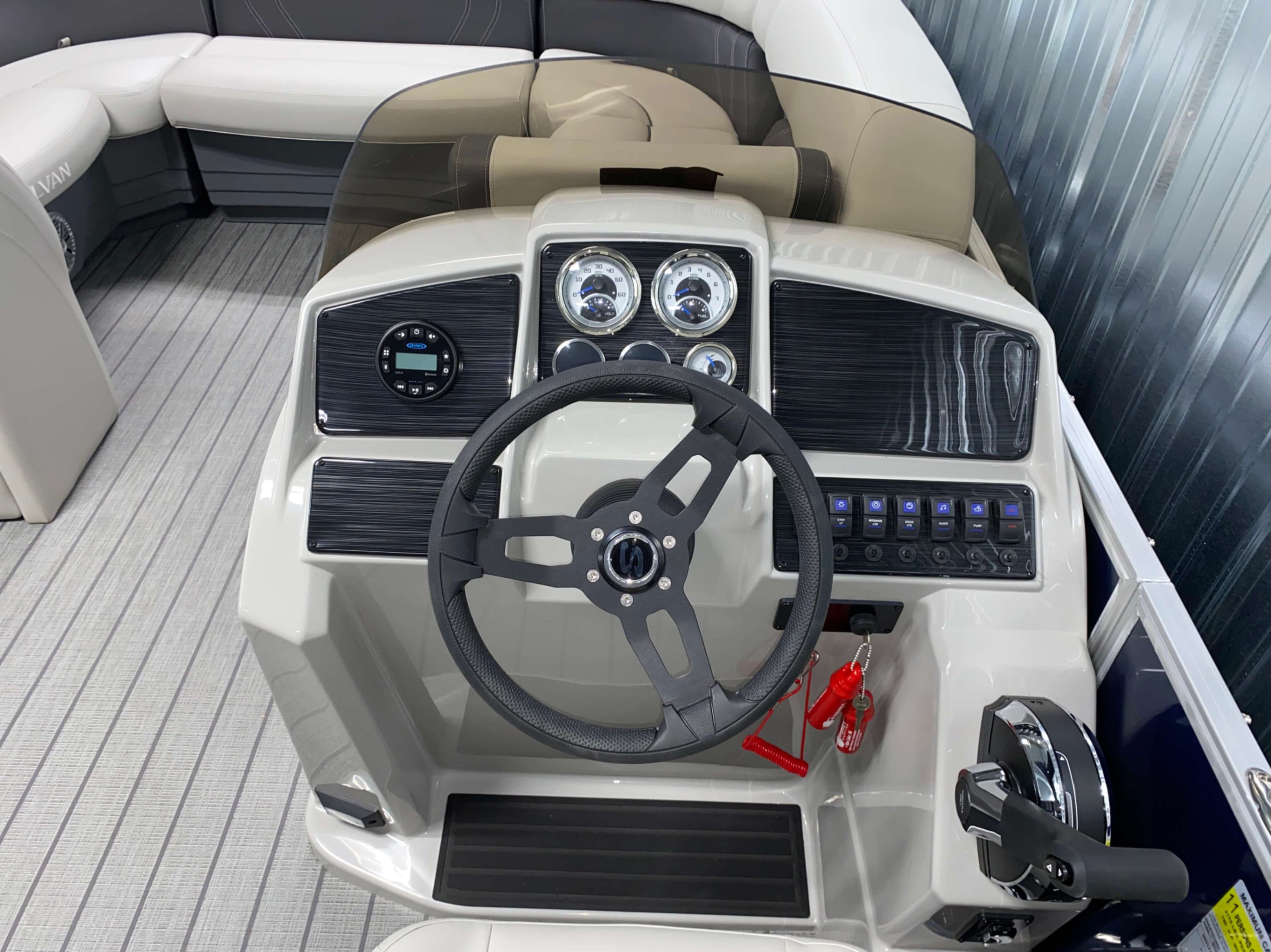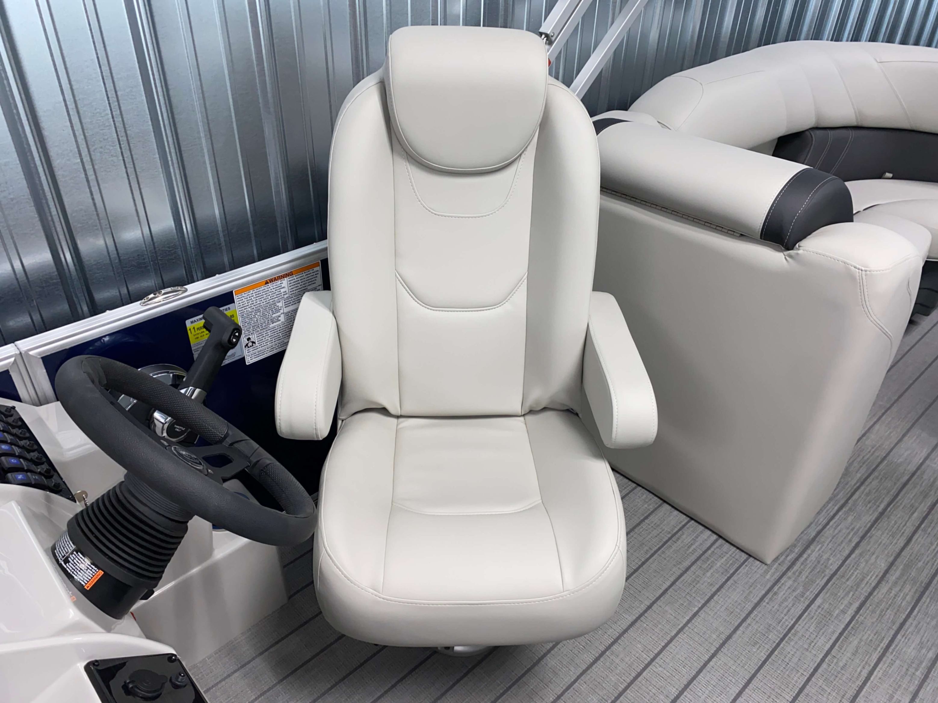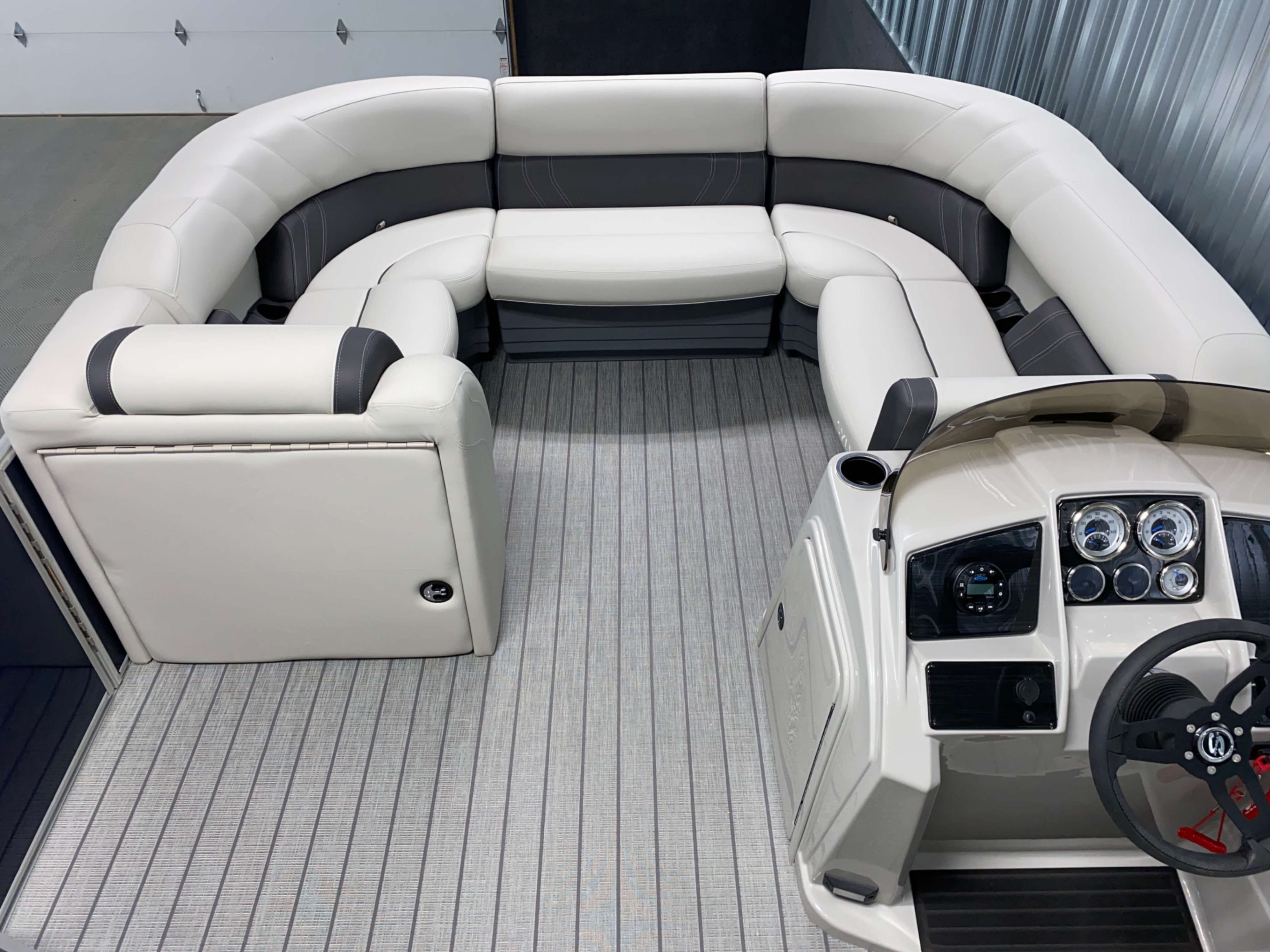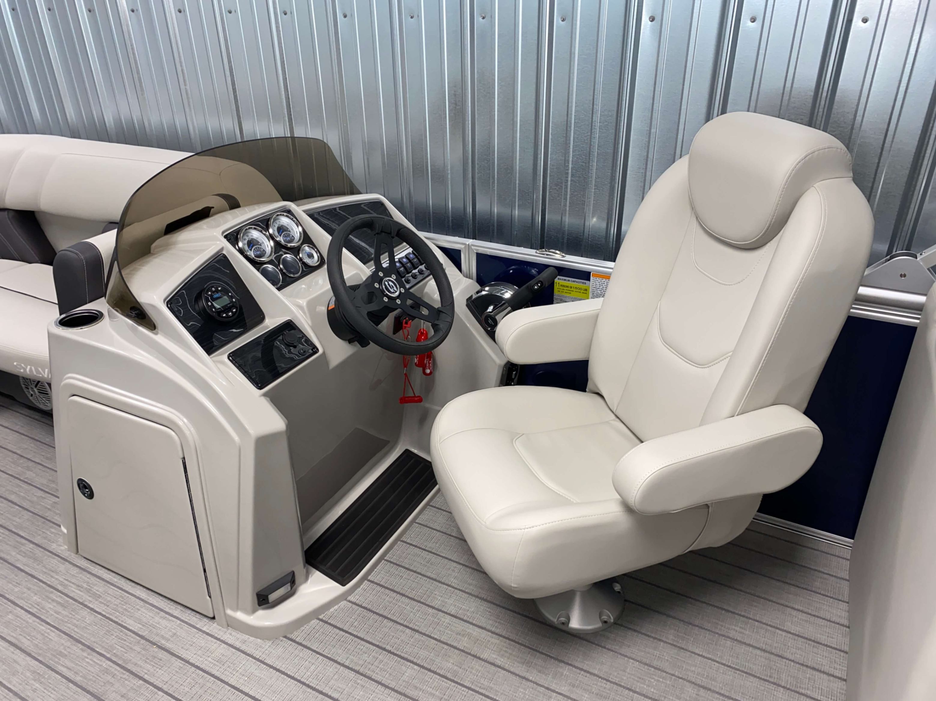 ***Pictured with optional portable gate seat.*** The Sylvan Mirage 8522 LZ pontoon is designed to optimize seating capacity and enhance family outings on the water. With four wrap-around couches, this pontoon provides ample seating for everyone onboard, ensuring comfort and enjoyment throughout the journey. The inclusion of a power bimini top allows passengers to easily adjust for shade or sunshine, catering to varying weather conditions. Additionally, the pontoon features a full fiberglass console equipped with a spacious storage area, offering convenient storage for all essentials. Family-friendly amenities such as a changing room and a four-step ladder further enhance the pontoon's appeal, providing added convenience and versatility for all members of the family. Whether you're cruising, fishing, or simply enjoying a day on the water, the Sylvan Mirage 8522 LZ pontoon ensures a memorable and comfortable experience for everyone aboard.