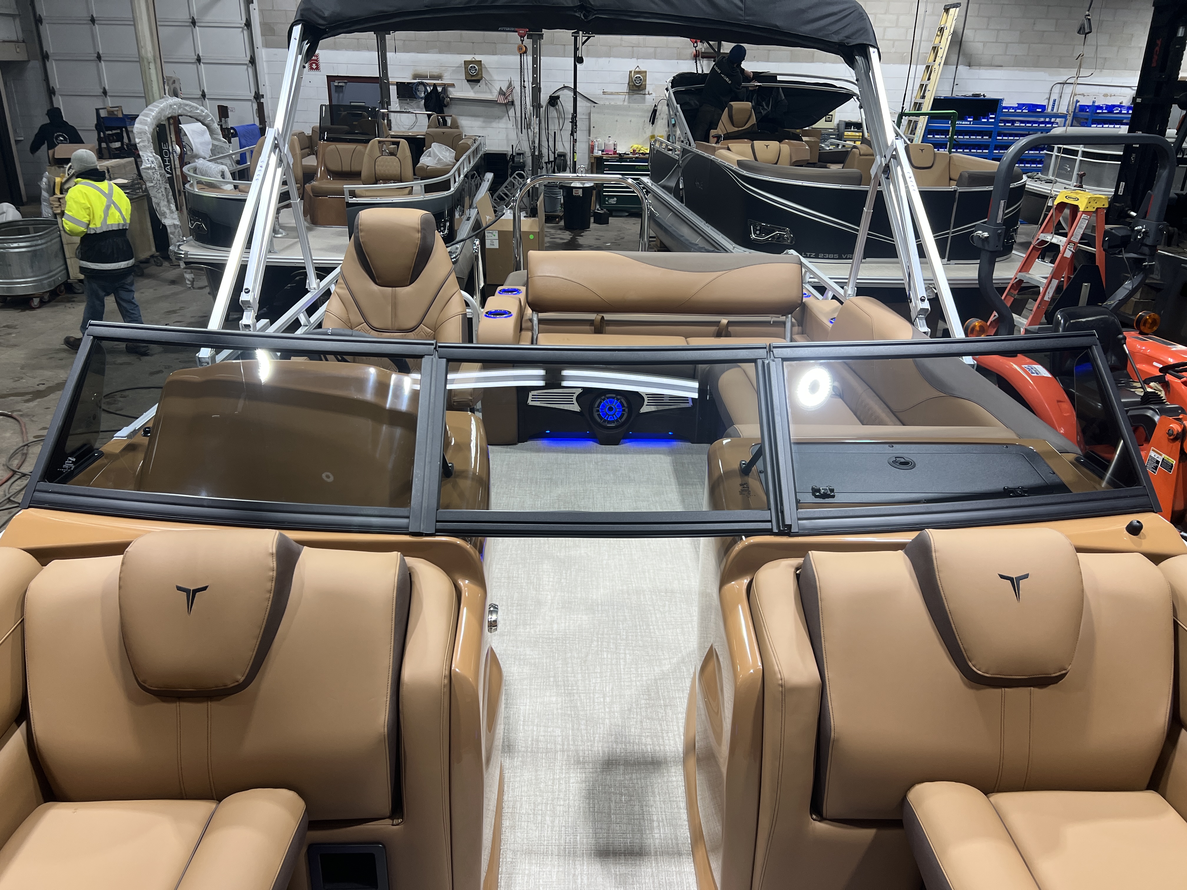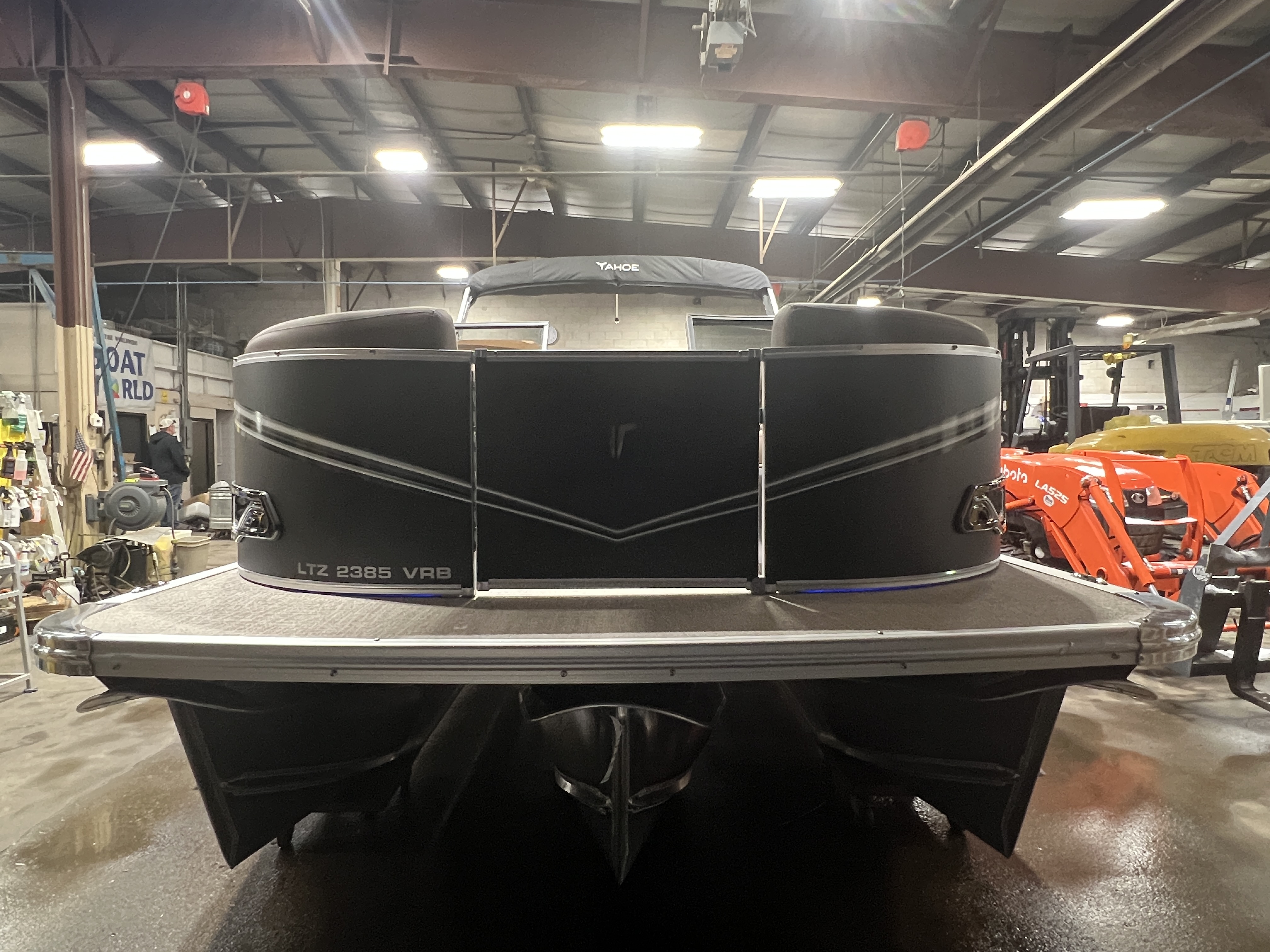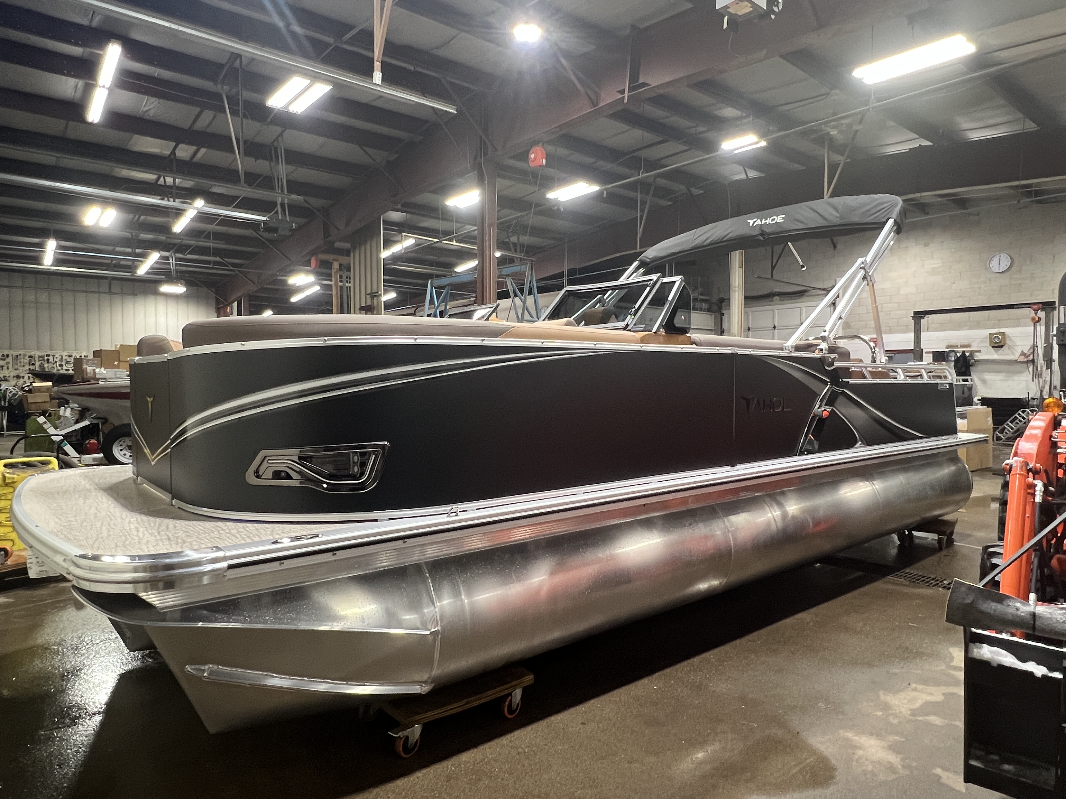 Arriving This Spring. 2026 Tahoe LTZ 2385 VRB Windshield Swingback Tritoon Pontoon & 300HP Honda Mclaren Performance Edition 4-Stroke EFI. **Boat Pictured is stock photo. Actual Boat also will include a Power Bimini Top, Black Out Exterior Package, In-Floor Storage, 27" Waveglider Performance Package, plus these features: