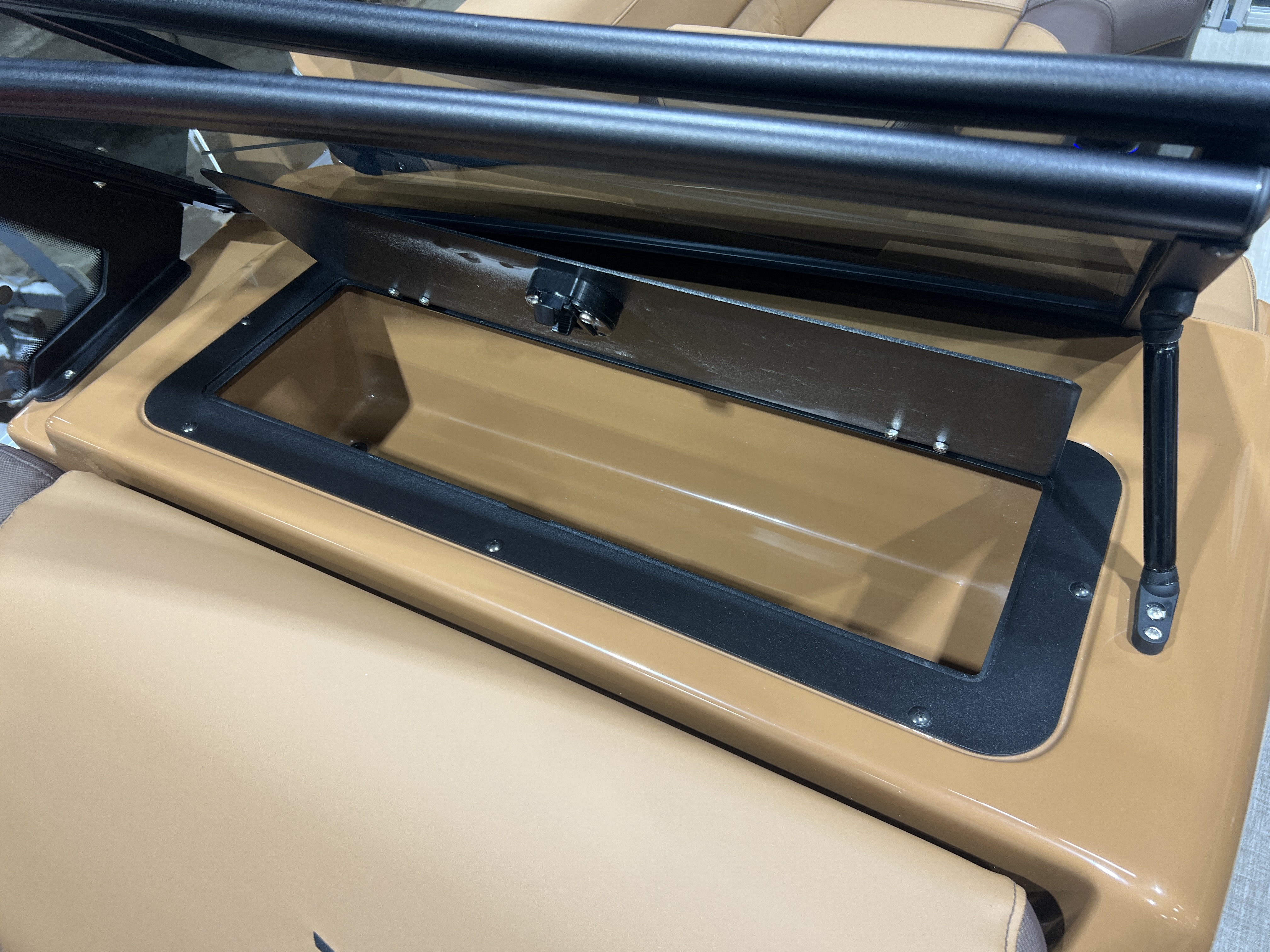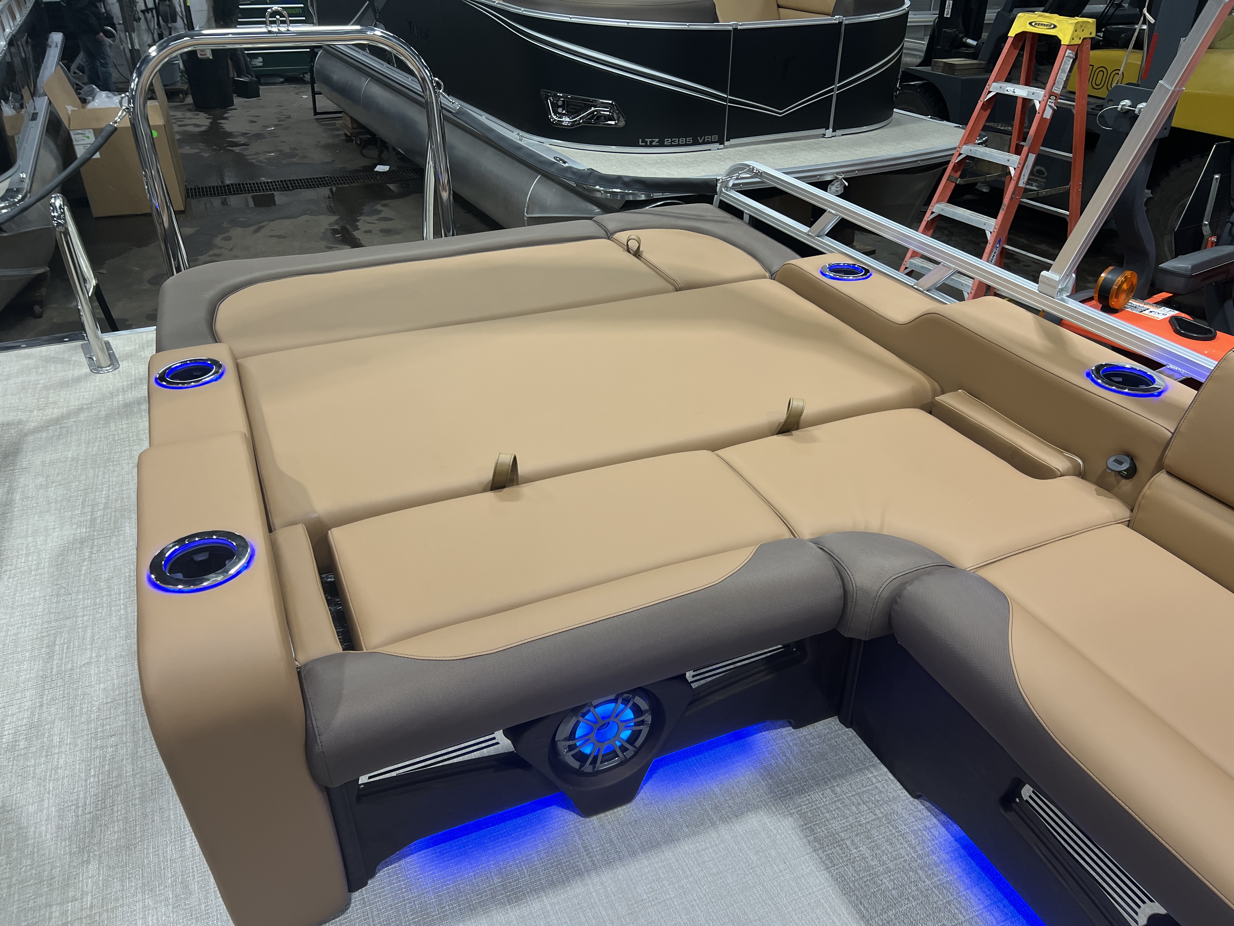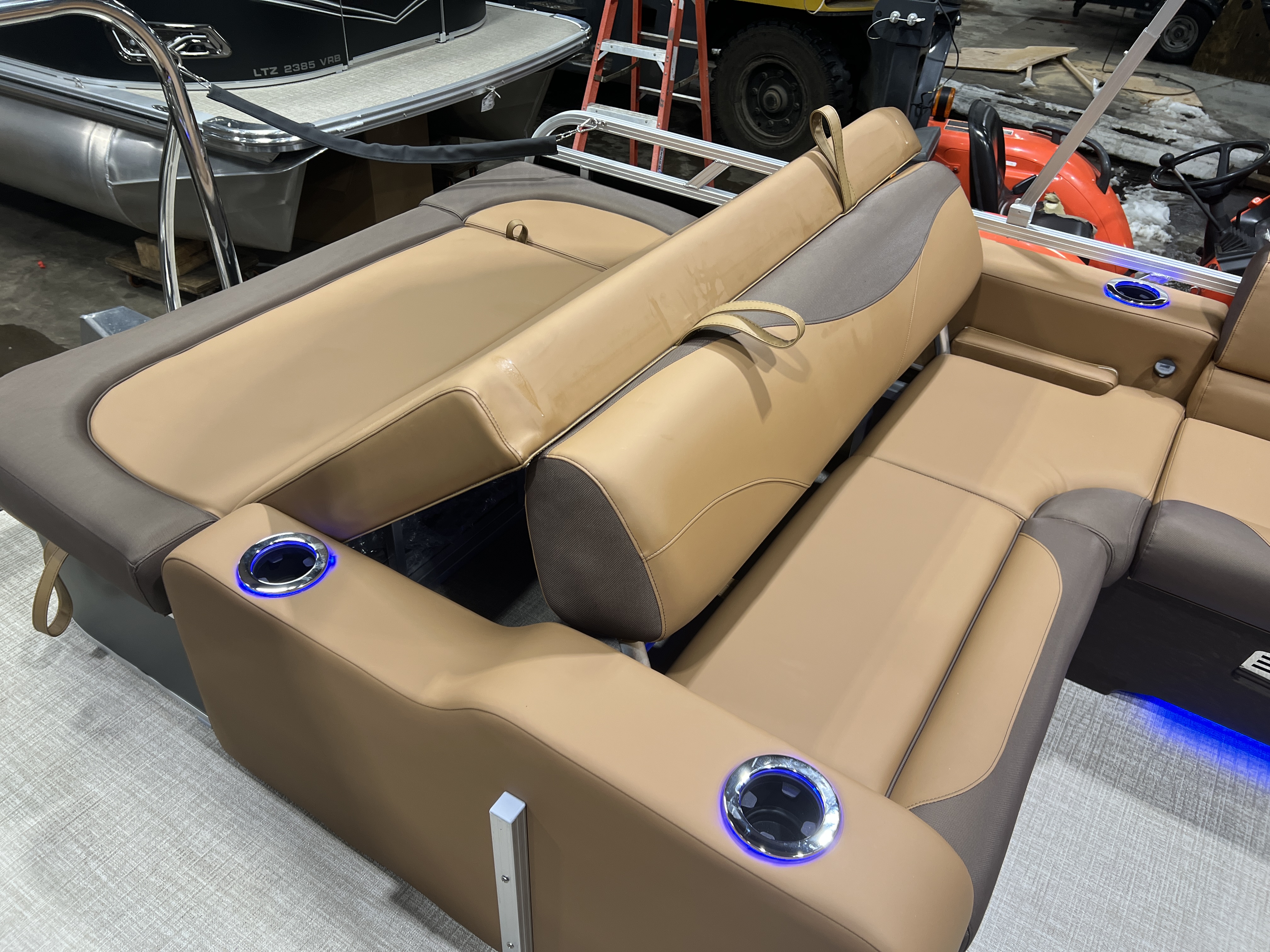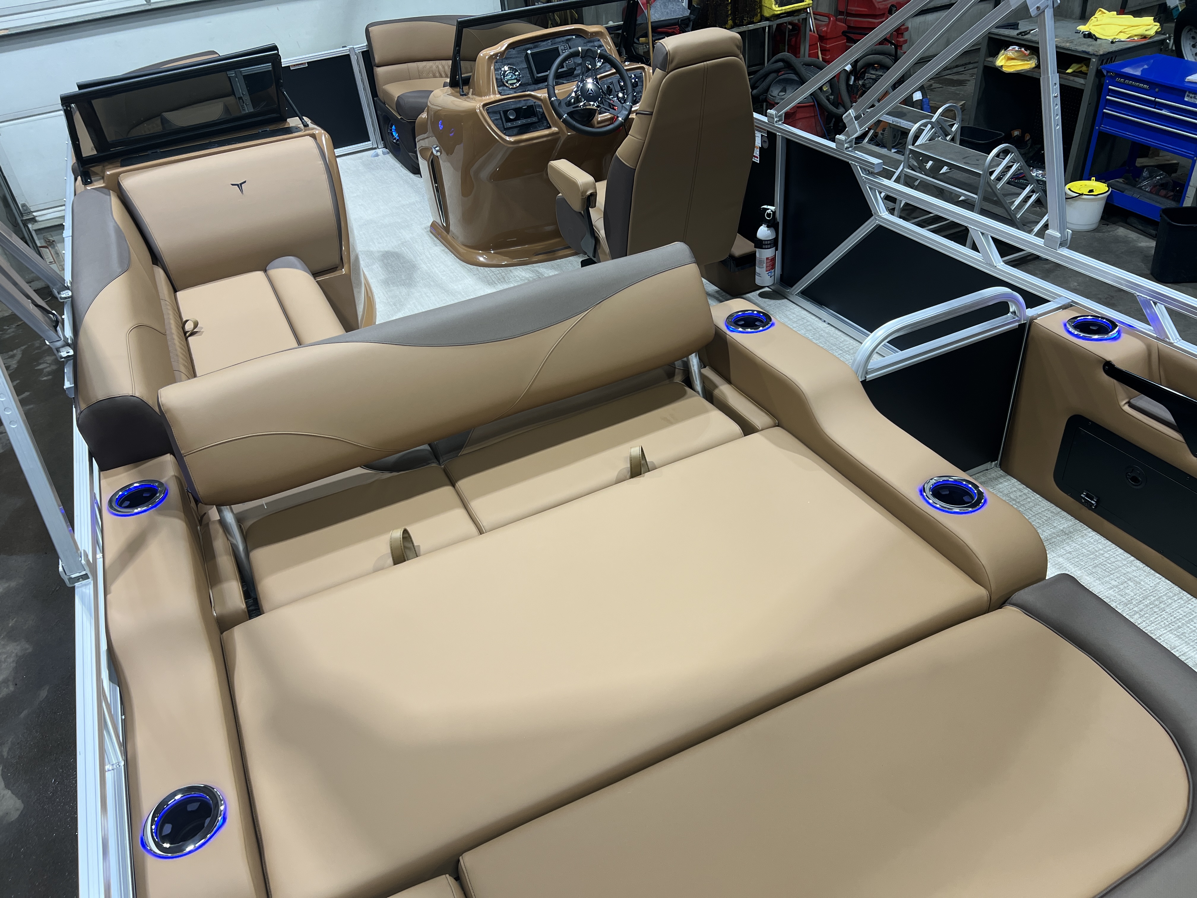 Matte Black Walls 23' Tri-Toon Has Front Lounge Seating With Storage, Admiral Reclining Captain's Chair, Versatile Rear Bench Seating With Storage, Gated Aft, Riptide Shadow Vinyl Flooring, Graphite Interior Package w/Koolfab Black & Koolfab Charcoal Accent, Platinum Package (Upgraded Ultra-Fine Vinyl Seats, LED Chrome Smoked Docklights, Polished Corner Caps, Garmin 52CV GPS Depth Finder, Pull Up Cleats, Vent Covers For Cladding, Platinum Edition Special Badging), Gauge Package w/Hour Meter, 10' Bimini Top, New Battery, Side Storage Behind Captain's Chair, Built-In 58 Gallon Gas Tank, Hydraulic Tilt Steering, Lifting Strakes, Underneath Aluminum Sheeting, Upgraded Greywood Rectangle Table, Blue Ice Package (Lighted Cup Holders, Speakers & Mood Lighting), Ski Tow Bar, Aft Chains, Multiple Cup Holders, Helm Side Storage, Mooring Cover, Fusion Bluetooth Radio w/6 Speakers & Amp, Lillipad Easy Step Ladder, Battery On/Off Switch, Tilt Steering, Bow & Aft USB Charging Ports, Nice Front And Rear Deck, New Battery, Charcoal Seat Cladding.