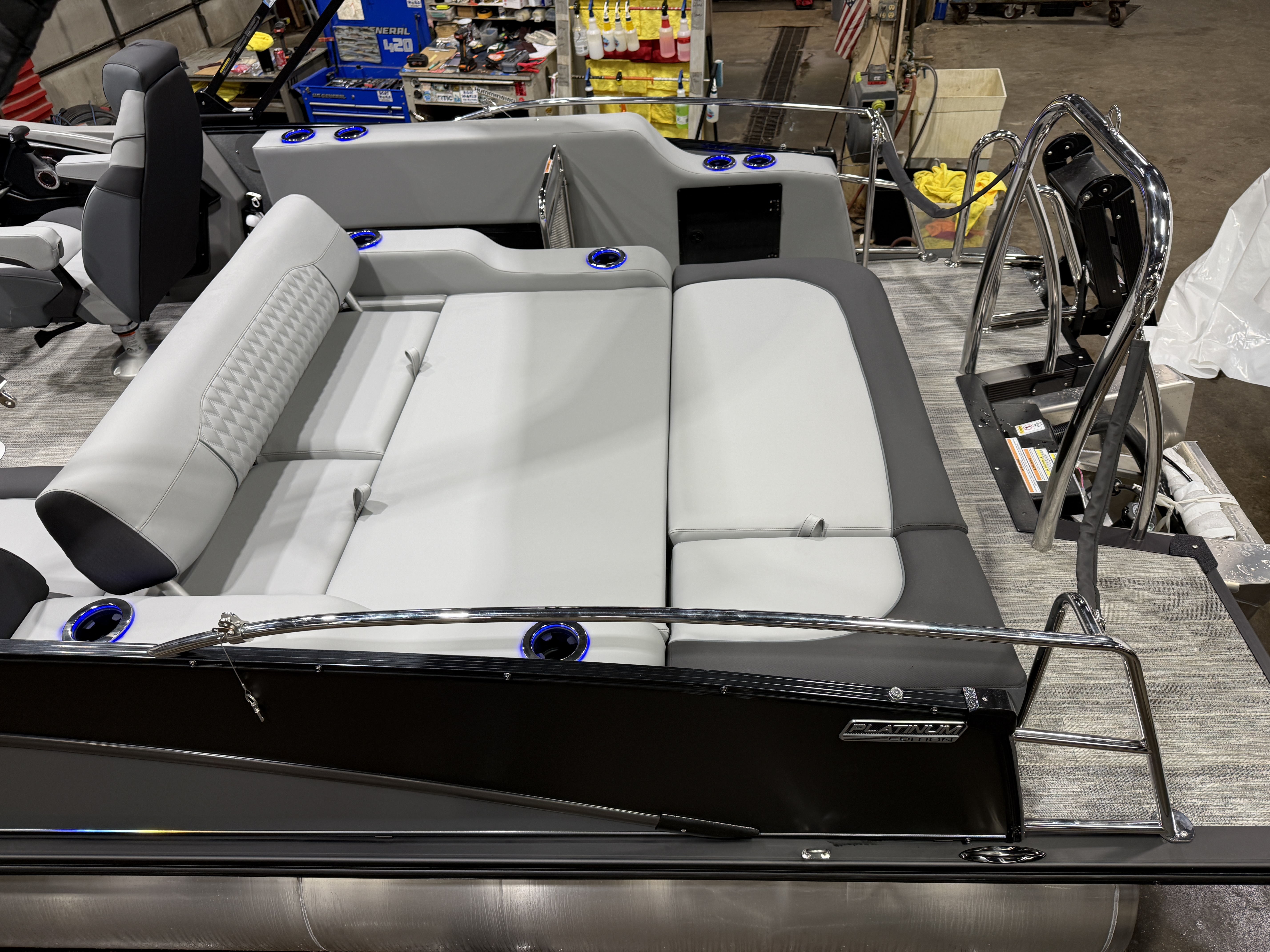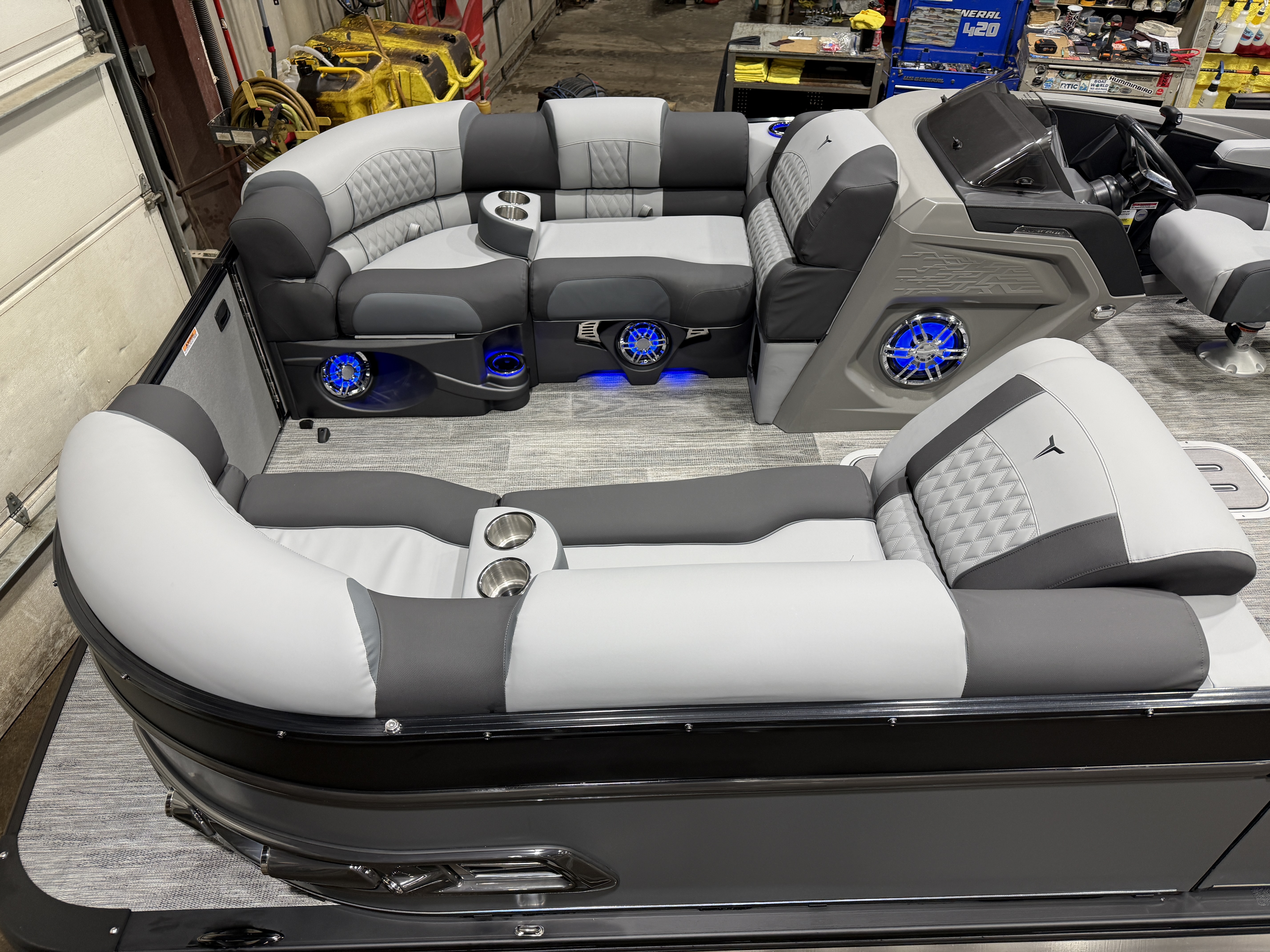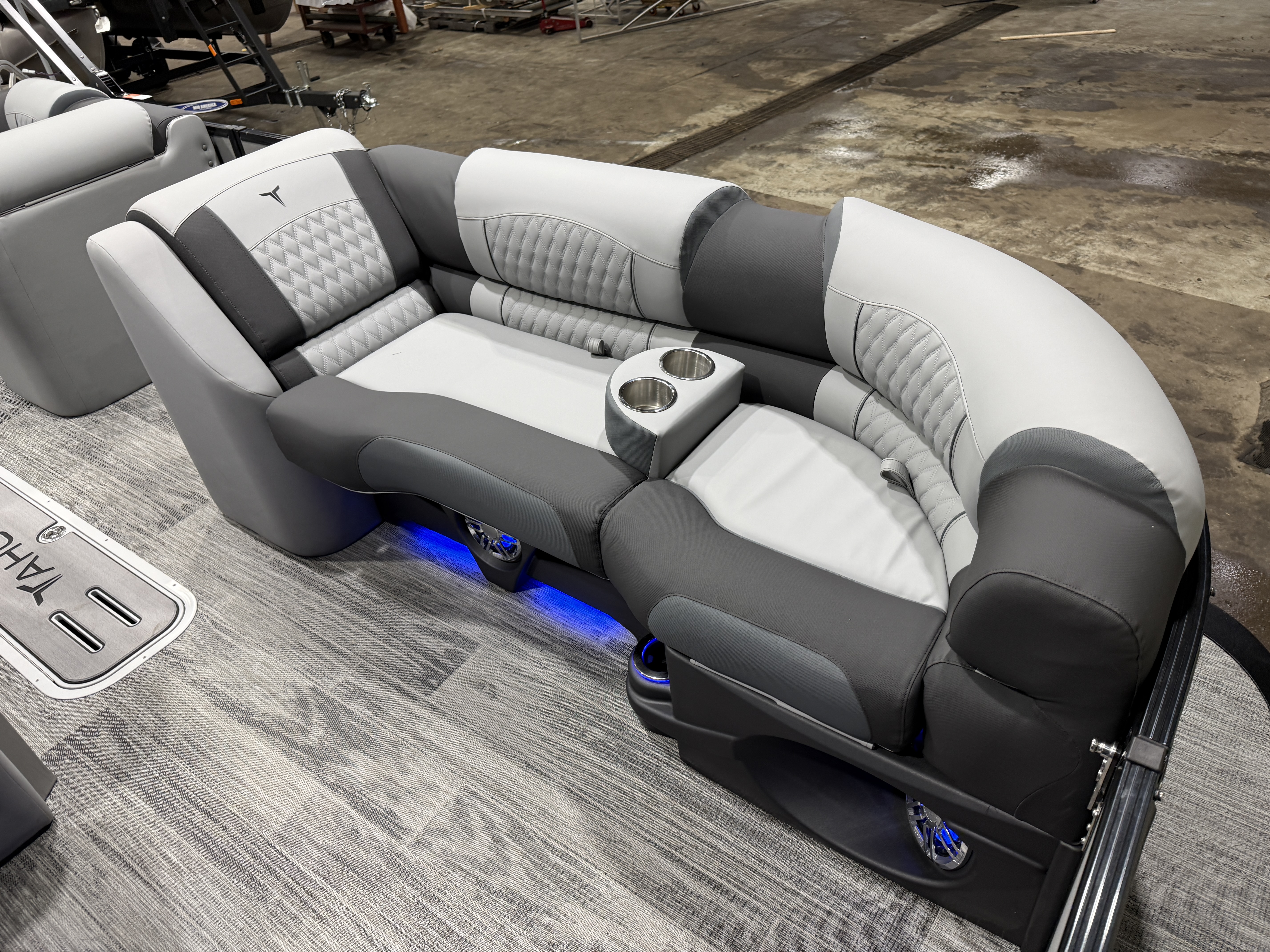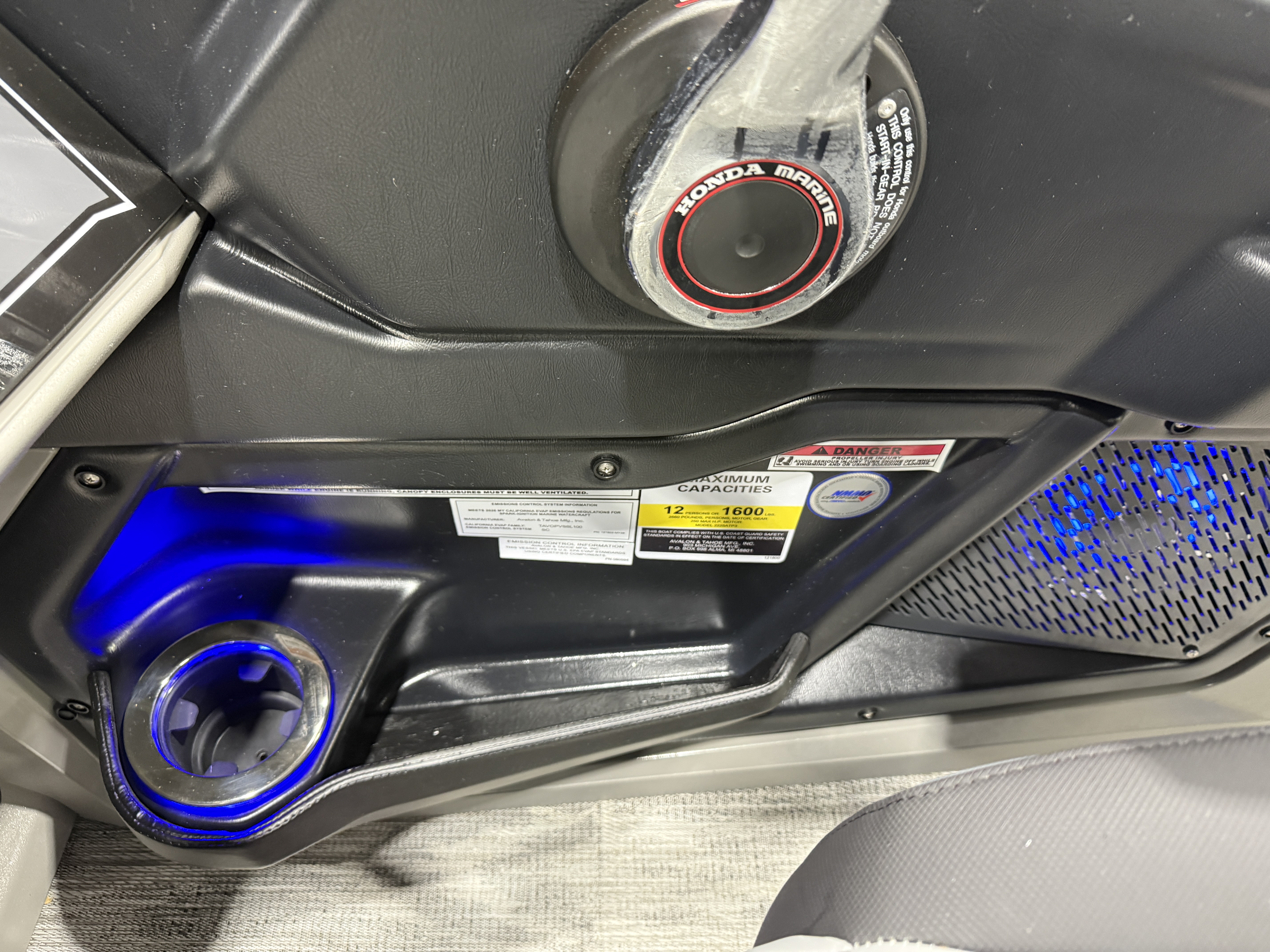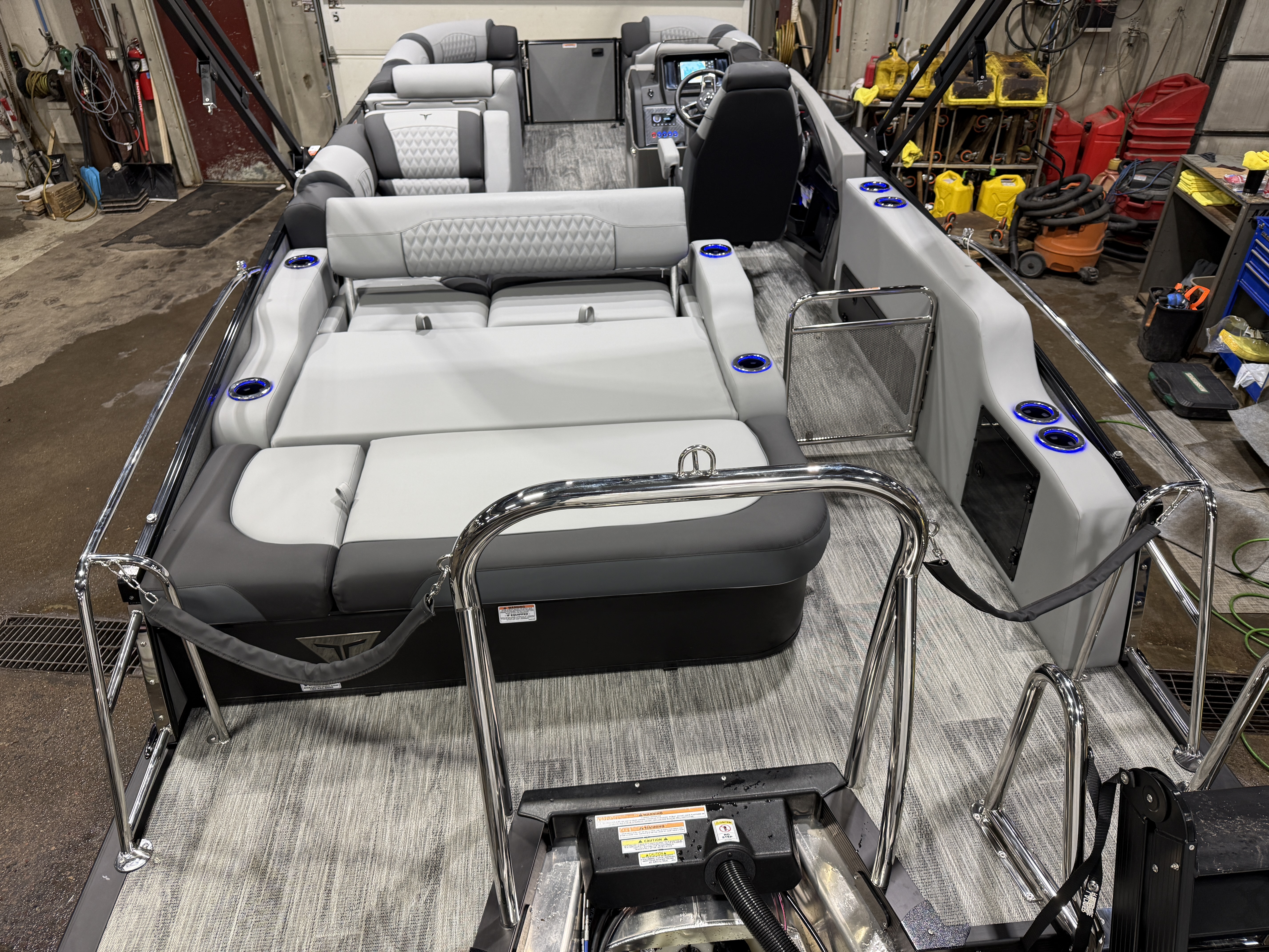 2026 Tahoe Cascade 2385 Versatile Rear Bench (VRB) Swingback Tritoon Pontoon & Honda 4-Stroke EFI. This 23' Matte Charcoal & Black Walls Tri-Toon Has Front Lounge Seating With Storage, Versatile Rear Bench Seating With Storage, Gated Aft, Cascade Platinum Edition (Ultra Fine Touch Vinyl Upgrade, Admiral High Back Reclining Captain's Chair w/Slider, Smoked Chrome Pull-Up Cleats, Blue Ice Package (Interior Mood Lighting, Lighted Cup Holders & Speakers), DECO LED Docking Lights, SST Vent Covers, Platinum Edition Special Badging), Upgraded Boardwalk Vinyl Flooring, Furniture Series Upgrade, Graphite Interior Package w/Kool Fab Black Vinyl, Blackout Package (Black Bimini, Black Corner Caps, Black Rub Rail, Black Powder Coated Rails), Composite Wall Panels, LED NAV Lights, Simrad NSX 9 & Simrad NSX 7 (Touch Screen Gauges, GPS & Depth Finder), Mooring Cover, Electric Bimini Top, Sport Performance Package, Hydraulic Steering, Lifting Strakes, Underneath Sheeting, New Battery, Side Storage Behind Captain's, Built-In 38 Gallon Gas Tank, Multiple Cup Holders, High Performance Sound Package (Fusion Bluetooth Radio w/6 Lighted Speakers, 6 Channel AMP, 10" Sub), Lillipad Easy Step Rear Ladder, Front And Rear Deck, New Battery, Built In Trash Can, Ski Tow Bar w/Chains, Movable Cup Holders, Charcoal Seat Cladding, Bow & Aft USB Charging Ports, Large Smoked Hi-Flex Logos, Privacy Station In Bimini Canvas, 4 Buoy Holders, Greywood Rectangle Table, Battery On/Off Switch, Floor Matting Under Seats, 25" Tubes, Center In Tube Storage, . Rated For 12 People.