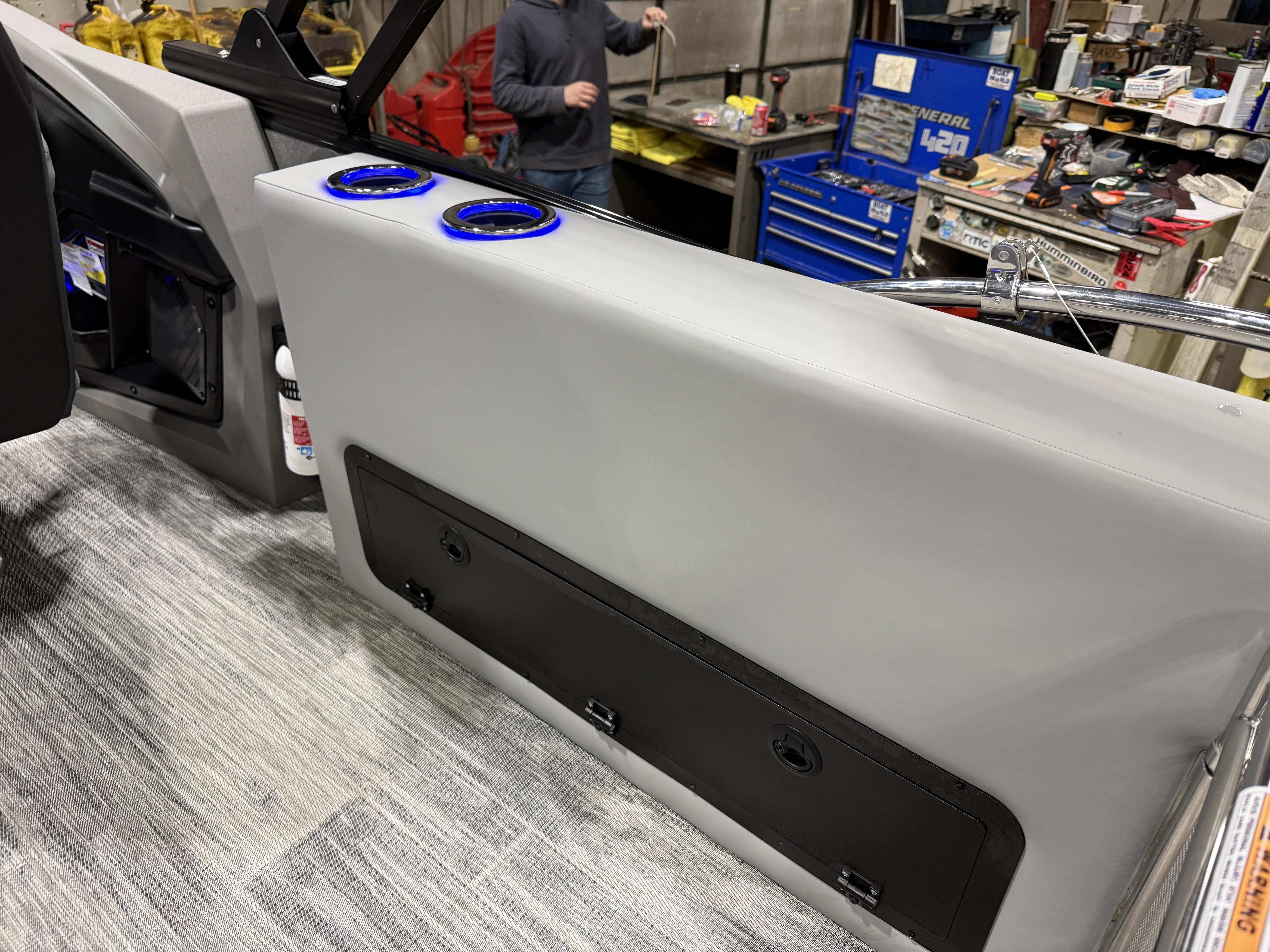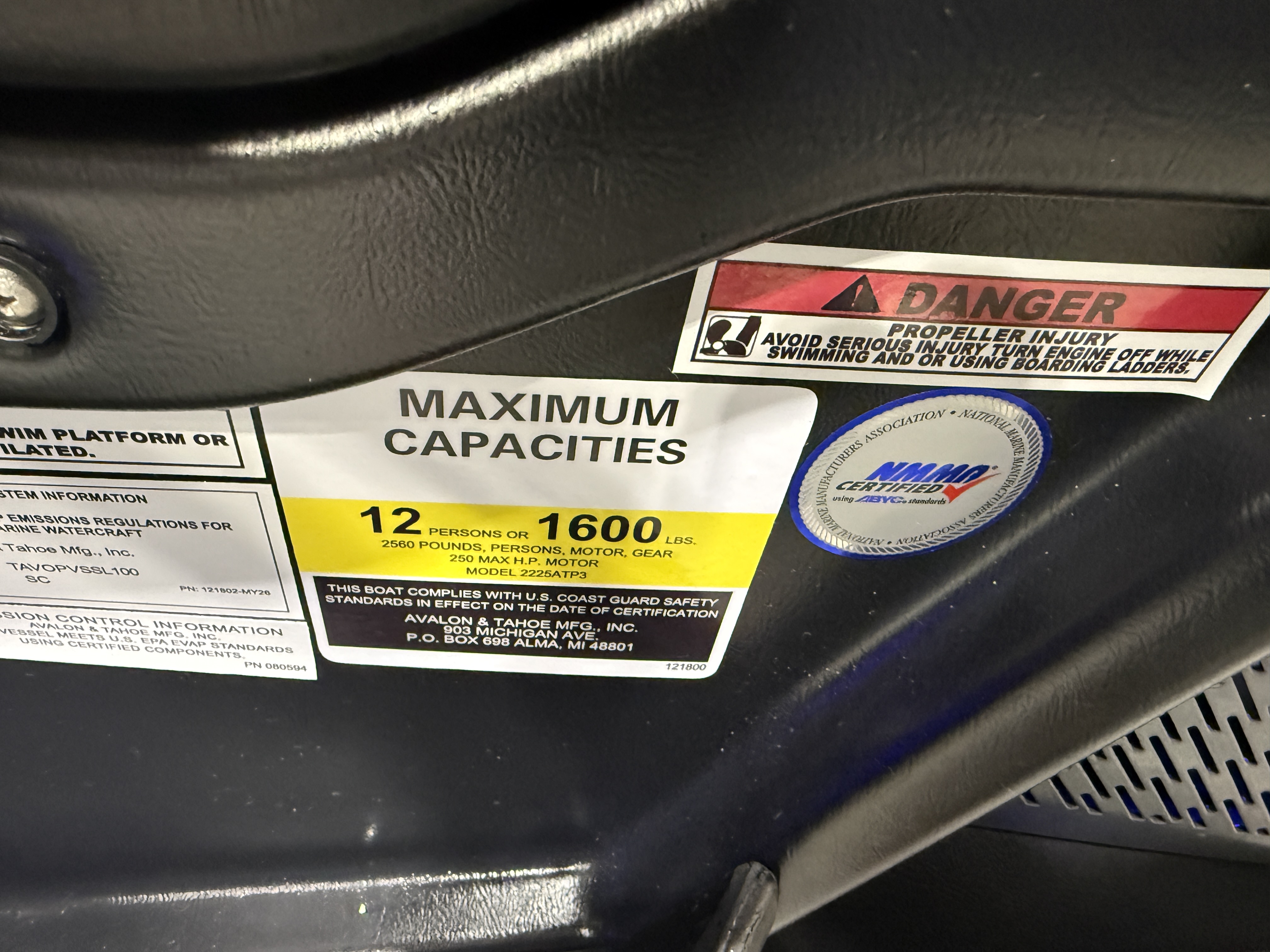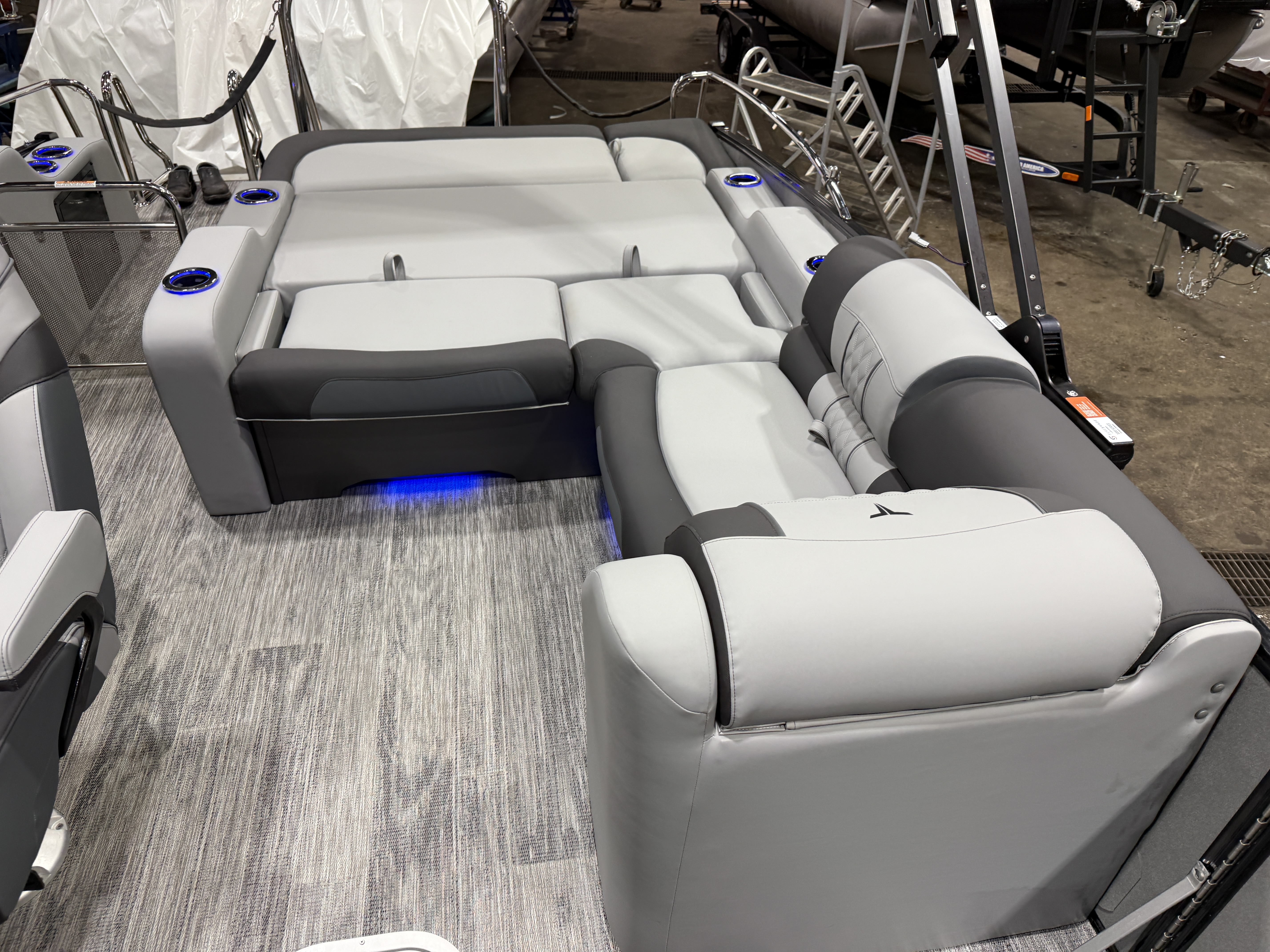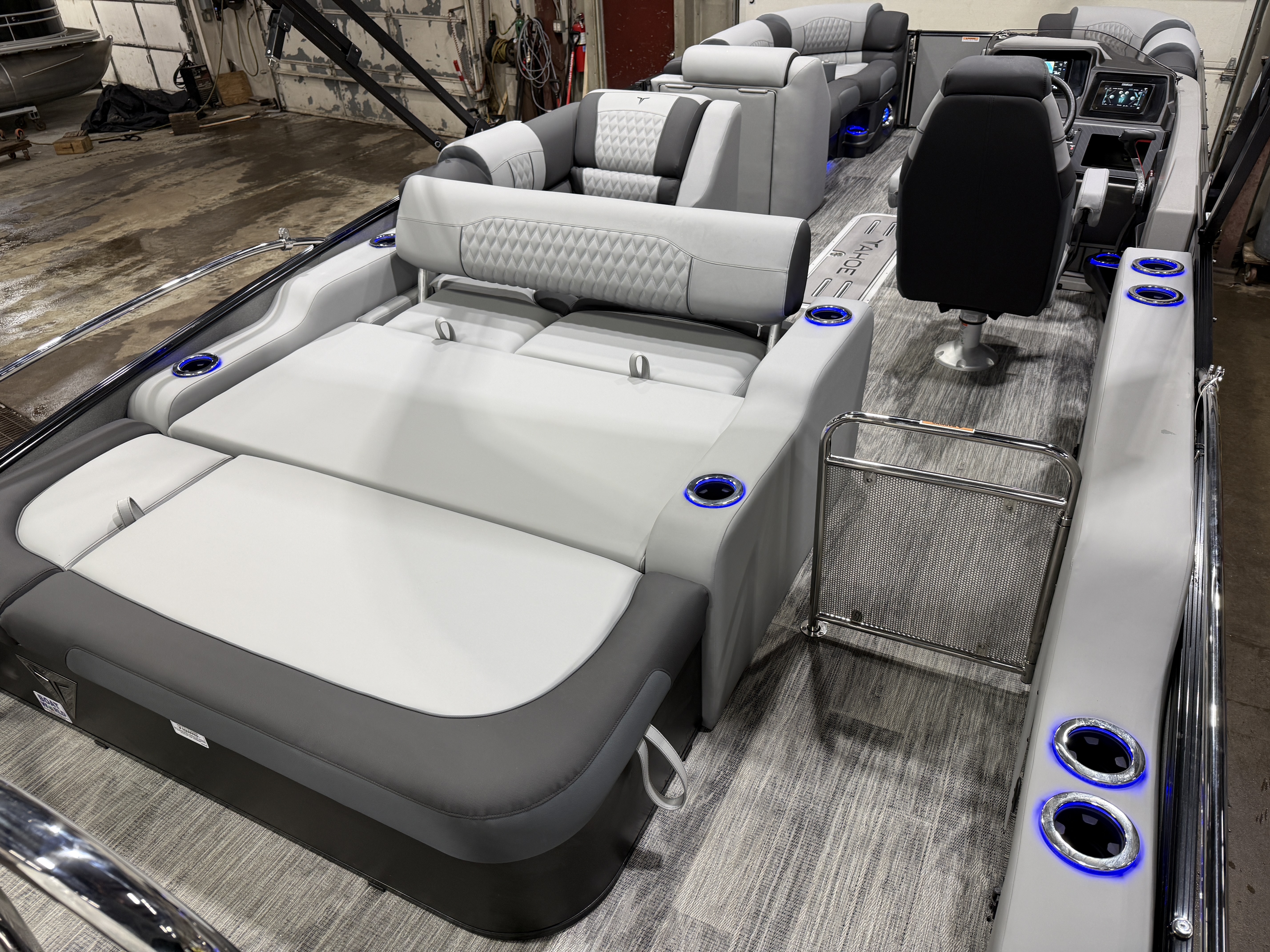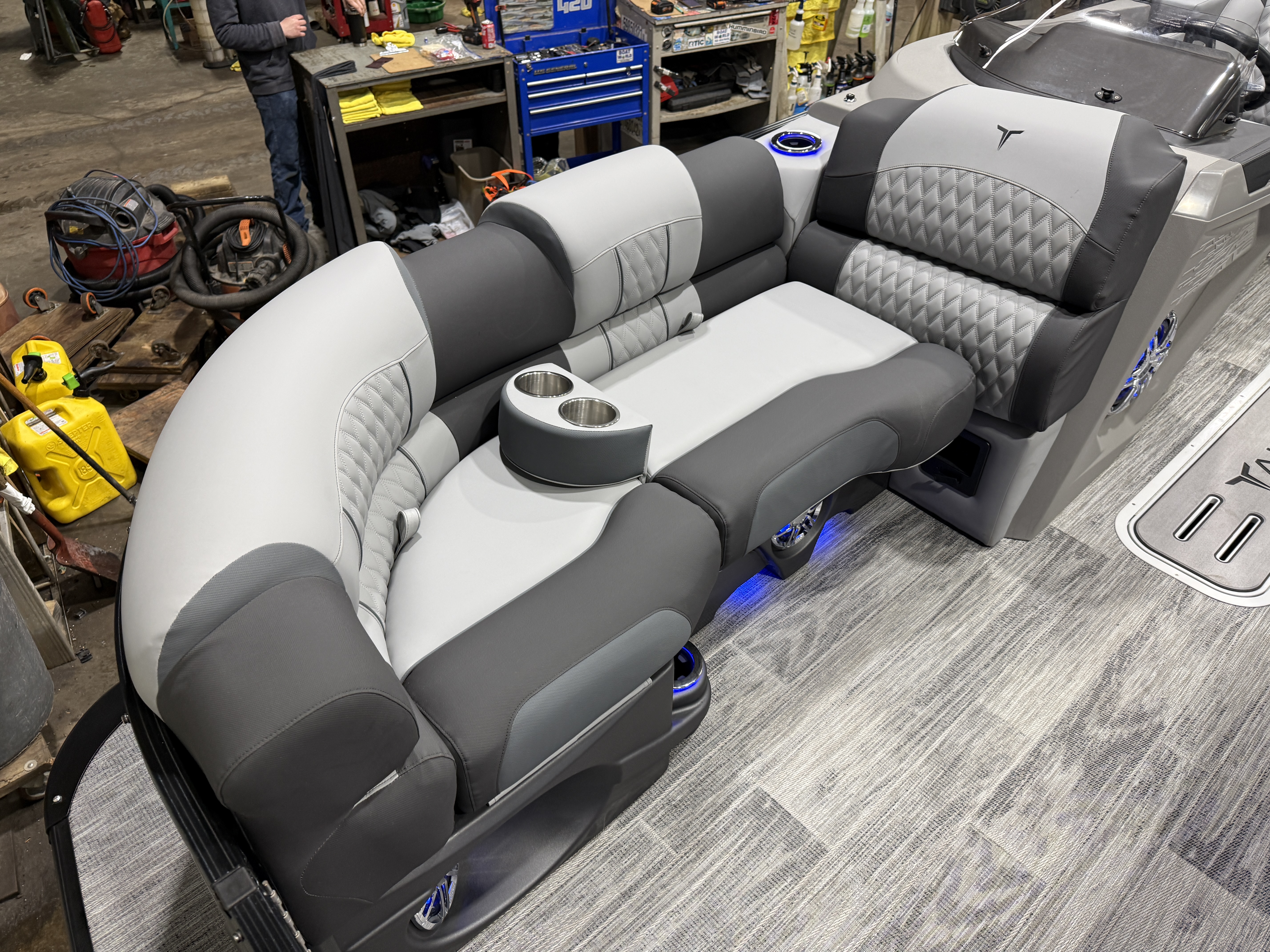 2026 Tahoe Cascade 2385 Versatile Rear Bench (VRB) Swingback Tritoon Pontoon & Honda 4-Stroke EFI. This 23' Matte Charcoal & Black Walls Tri-Toon Has Front Lounge Seating With Storage, Versatile Rear Bench Seating With Storage, Gated Aft, Cascade Platinum Edition (Ultra Fine Touch Vinyl Upgrade, Admiral High Back Reclining Captain's Chair w/Slider, Smoked Chrome Pull-Up Cleats, Blue Ice Package (Interior Mood Lighting, Lighted Cup Holders & Speakers), DECO LED Docking Lights, SST Vent Covers, Platinum Edition Special Badging), Upgraded Boardwalk Vinyl Flooring, Furniture Series Upgrade, Graphite Interior Package w/Kool Fab Black Vinyl, Blackout Package (Black Bimini, Black Corner Caps, Black Rub Rail, Black Powder Coated Rails), Composite Wall Panels, LED NAV Lights, Simrad NSX 9 & Simrad NSX 7 (Touch Screen Gauges, GPS & Depth Finder), Mooring Cover, Electric Bimini Top, Sport Performance Package, Hydraulic Steering, Lifting Strakes, Underneath Sheeting, New Battery, Side Storage Behind Captain's, Built-In 38 Gallon Gas Tank, Multiple Cup Holders, High Performance Sound Package (Fusion Bluetooth Radio w/6 Lighted Speakers, 6 Channel AMP, 10" Sub), Lillipad Easy Step Rear Ladder, Front And Rear Deck, New Battery, Built In Trash Can, Ski Tow Bar w/Chains, Movable Cup Holders, Charcoal Seat Cladding, Bow & Aft USB Charging Ports, Large Smoked Hi-Flex Logos, Privacy Station In Bimini Canvas, 4 Buoy Holders, Greywood Rectangle Table, Battery On/Off Switch, Floor Matting Under Seats, 25" Tubes, Center In Tube Storage, . Rated For 12 People.
