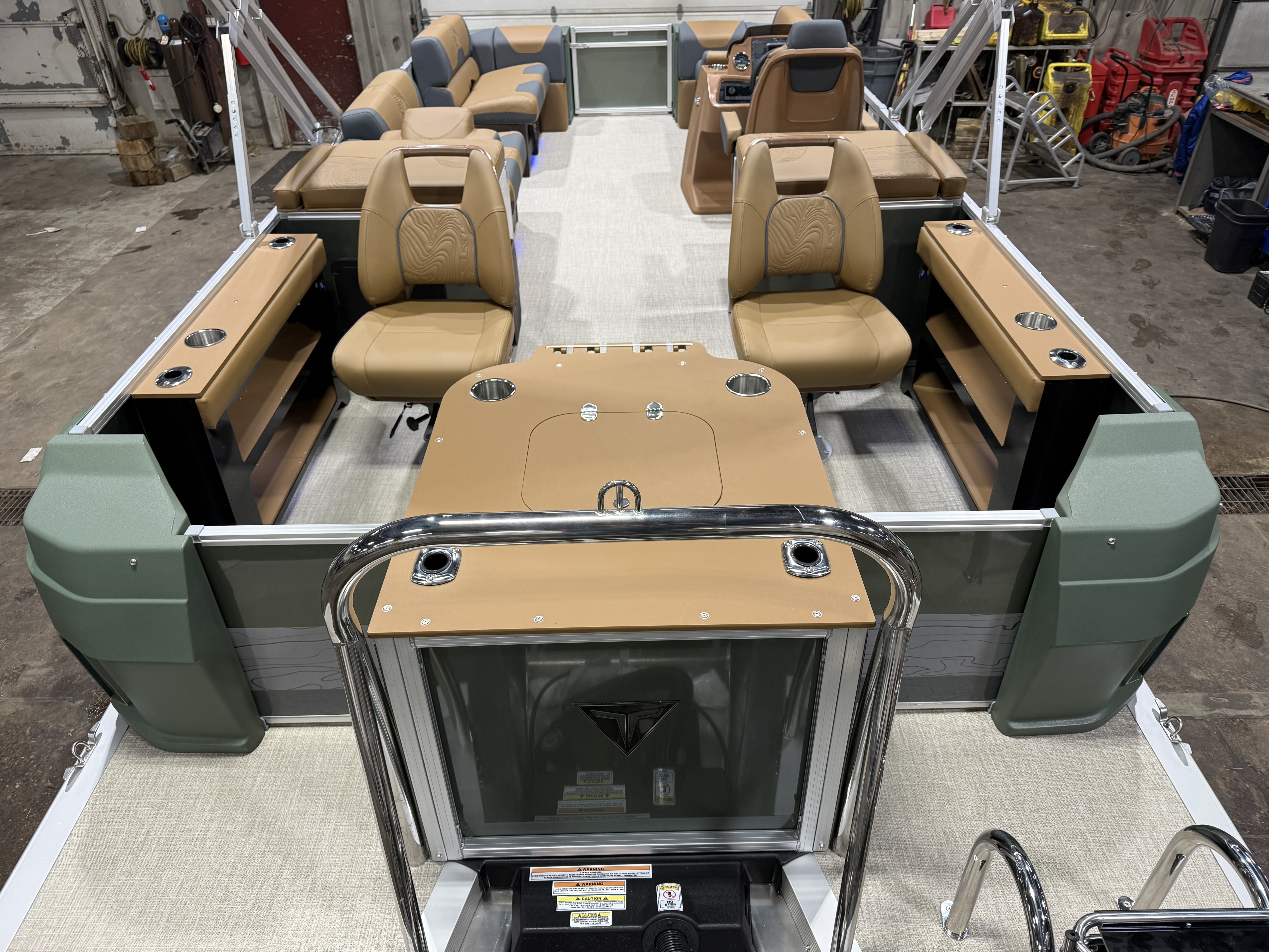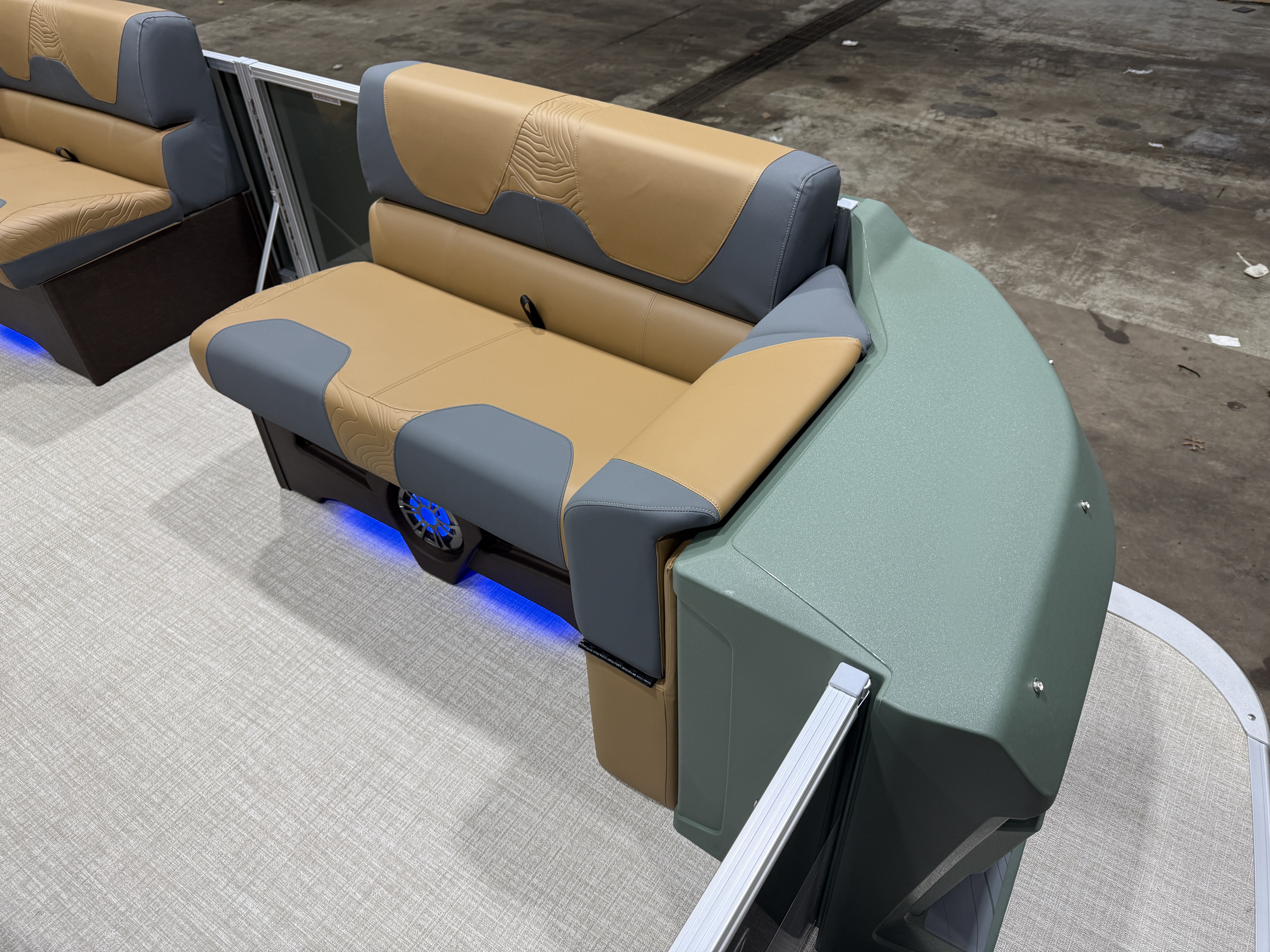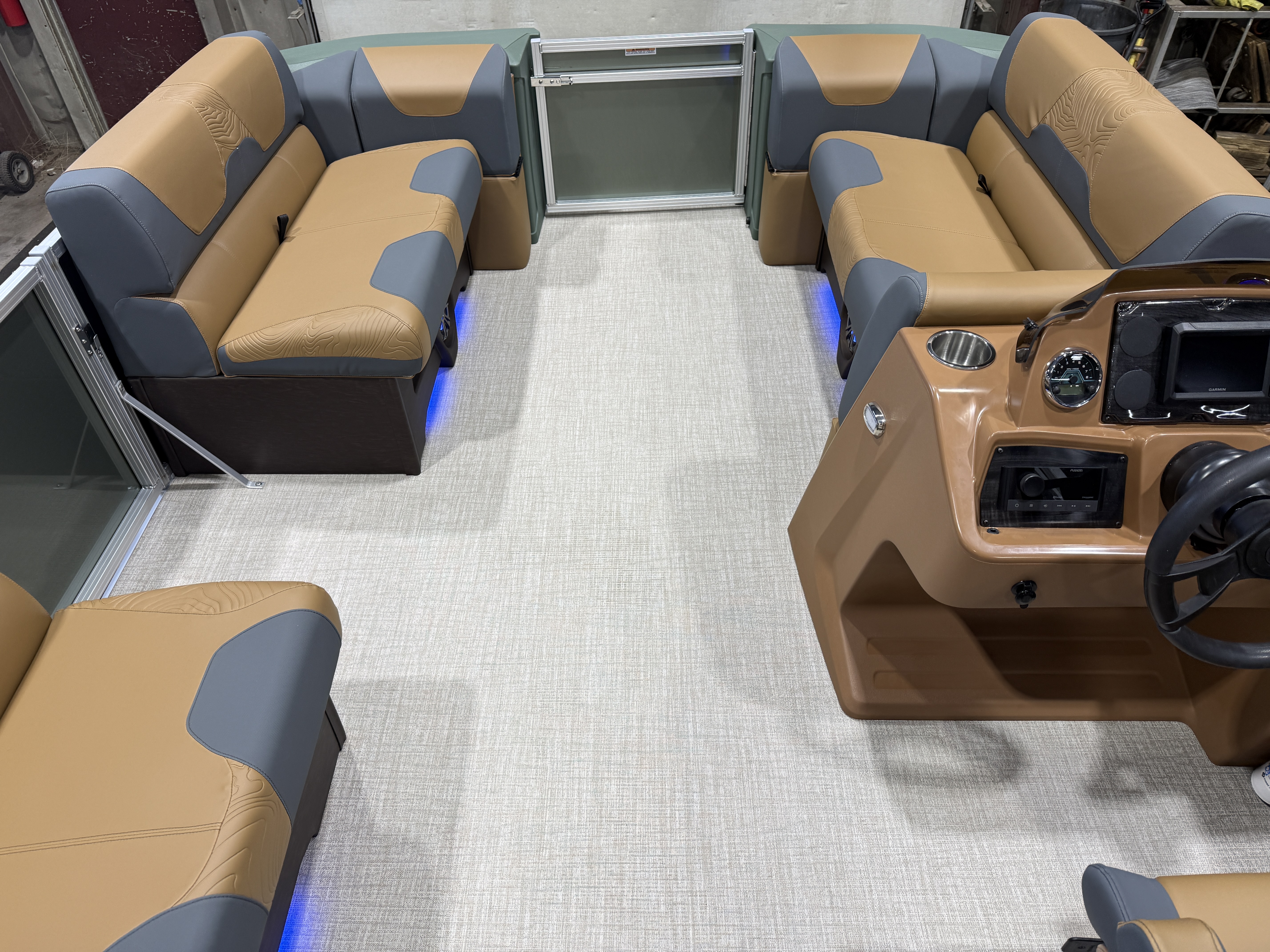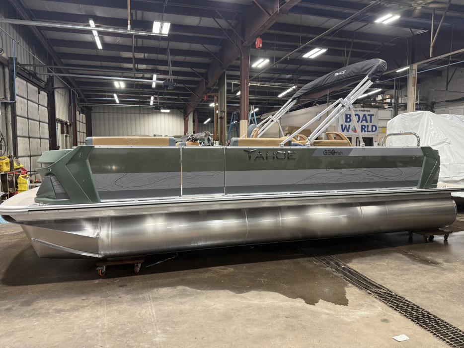 2026 Tahoe GEOfish 2385 Rear Fish Tritoon Pontoon & Honda 4-Stroke EFI. This 23' Sage Green Tri-Toon Has Front Bench Seating w/Storage (1 Chaise Lounge), Portside Chaise Lounge Seat w/Storage, Sport High Back Reclining Captain's Seat, 2 Sport Low Back Fishing Seats In Aft, Built-In Sink, Huge Rear Livewell, Starboard & Portside Side Storage w/Rod Holders, Built-In Tackle Storage, Mooring Cover, Bluetooth Fusion Radio w/4 Speakers, Garmin 52SV GPS Depth Finder, USB Input w/AUX, Manual Dual Battery Selector, Cognac Interior Package w/Koolfab Charcoal Accent, Sport Performance Package, Hydraulic Tilt Steering, Aluminum Undersheeting, Lifting Strakes, Riptide Vinyl Flooring, Bow USB Charging Port, Brushed Bronze Cladding, Blue Ice Package (Interior Mood Lighting, Lighted Speakers & Cup Holders), Rear Stainless Steel Ladder, 25" Tubes, 38 Gallon Gas Tank, 10' Bimini, GEOfish Docklights, Slate Graphics, Sage Corner Modules, Ski Tow Bar, Multiple Cup Holders, NAV Lights. Rated For 12 People. Great Space In This Fish/Cruise Pontoon.