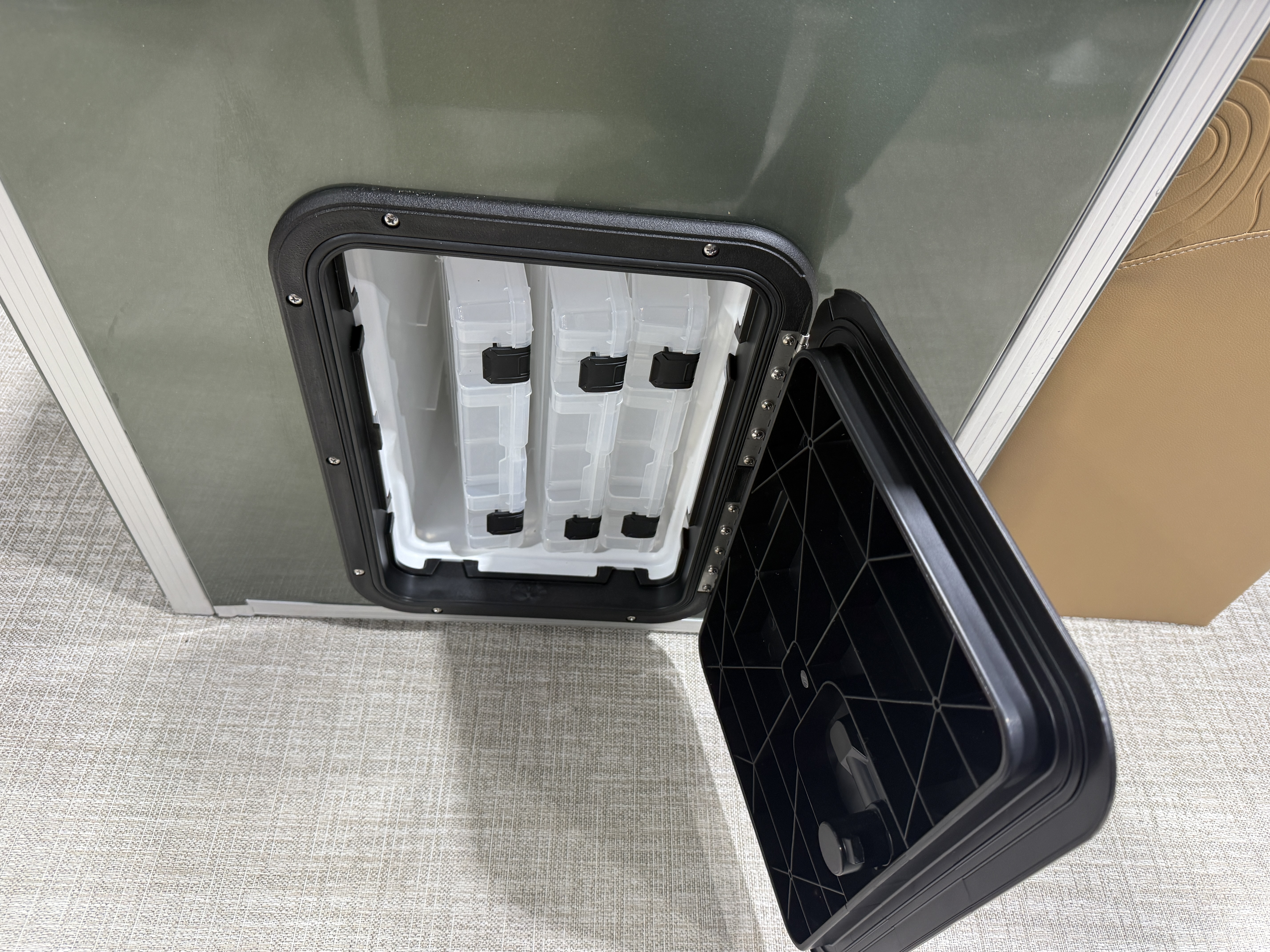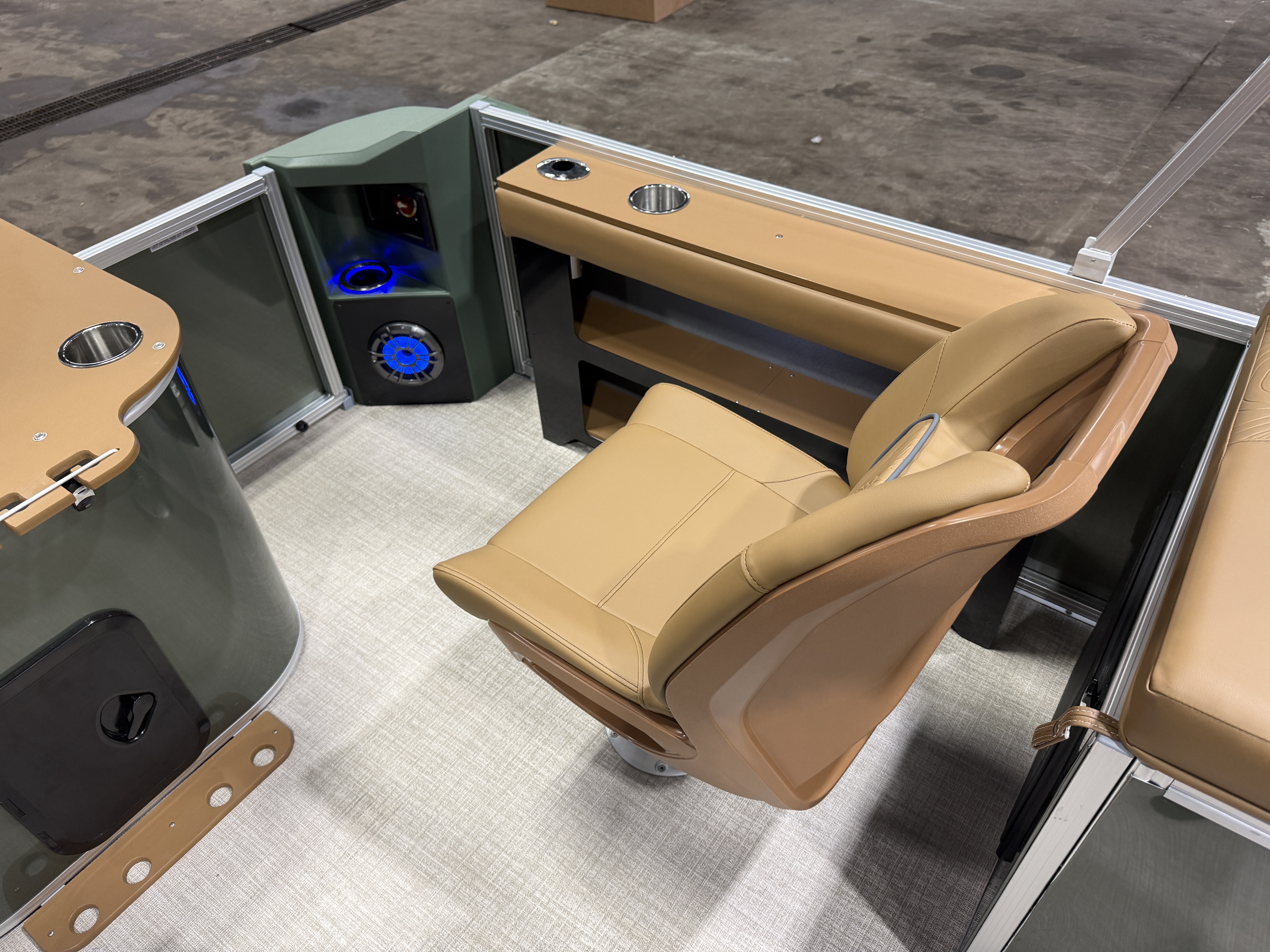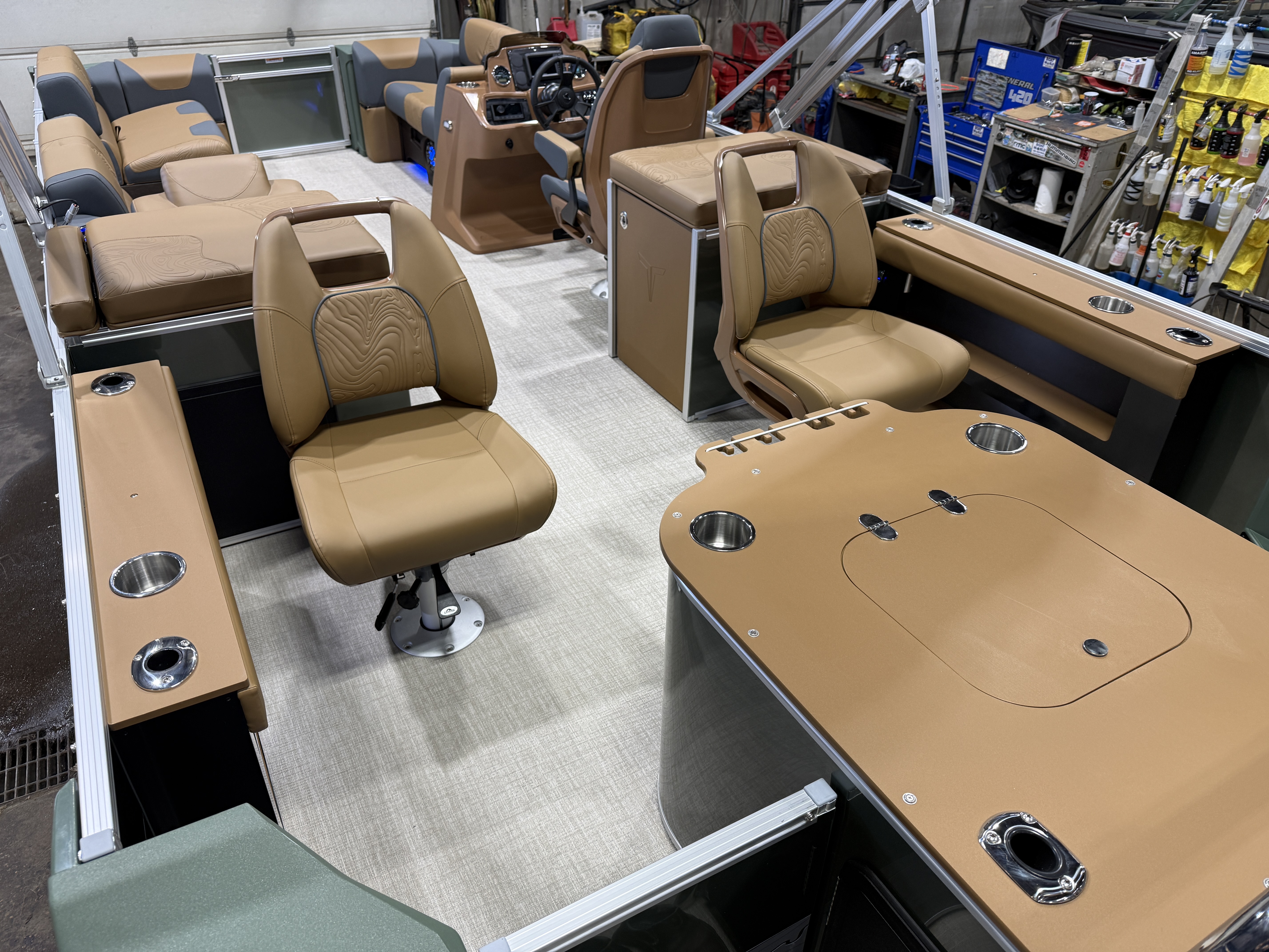 2026 Tahoe GEOfish 2385 Rear Fish Tritoon Pontoon & Honda 4-Stroke EFI. This 23' Sage Green Tri-Toon Has Front Bench Seating w/Storage (1 Chaise Lounge), Portside Chaise Lounge Seat w/Storage, Sport High Back Reclining Captain's Seat, 2 Sport Low Back Fishing Seats In Aft, Built-In Sink, Huge Rear Livewell, Starboard & Portside Side Storage w/Rod Holders, Built-In Tackle Storage, Mooring Cover, Bluetooth Fusion Radio w/4 Speakers, Garmin 52SV GPS Depth Finder, USB Input w/AUX, Manual Dual Battery Selector, Cognac Interior Package w/Koolfab Charcoal Accent, Sport Performance Package, Hydraulic Tilt Steering, Aluminum Undersheeting, Lifting Strakes, Riptide Vinyl Flooring, Bow USB Charging Port, Brushed Bronze Cladding, Blue Ice Package (Interior Mood Lighting, Lighted Speakers & Cup Holders), Rear Stainless Steel Ladder, 25" Tubes, 38 Gallon Gas Tank, 10' Bimini, GEOfish Docklights, Slate Graphics, Sage Corner Modules, Ski Tow Bar, Multiple Cup Holders, NAV Lights. Rated For 12 People. Great Space In This Fish/Cruise Pontoon.