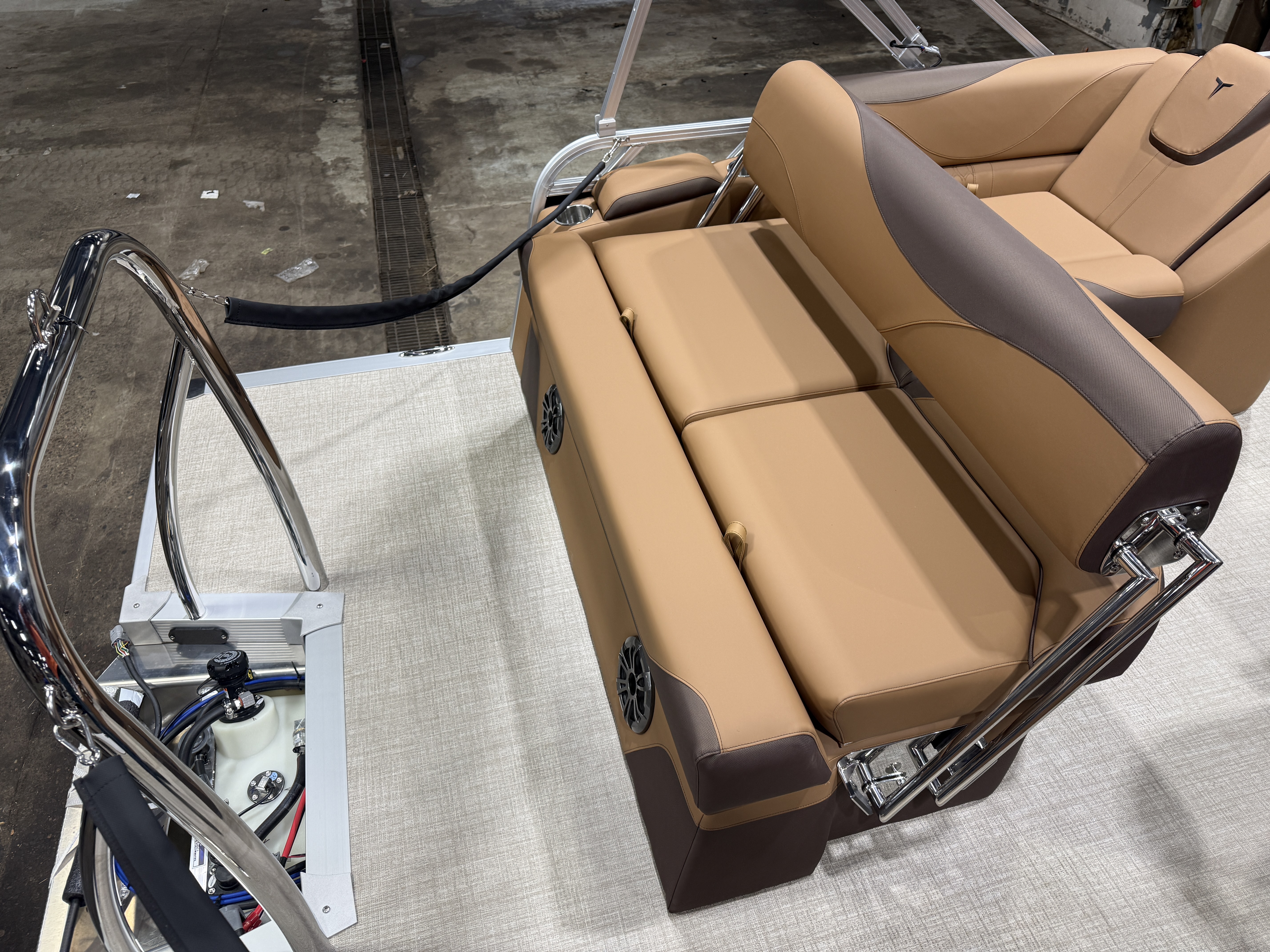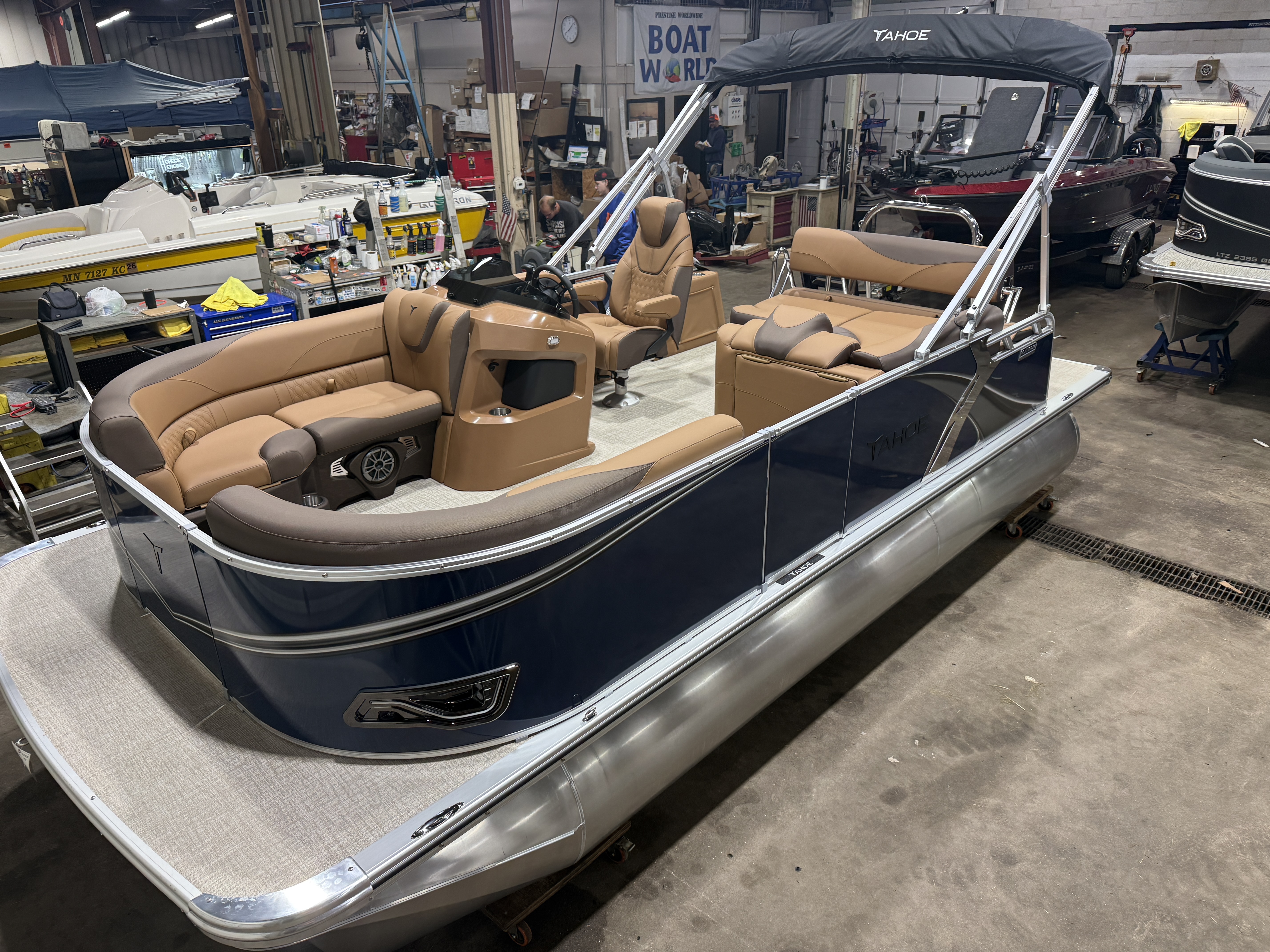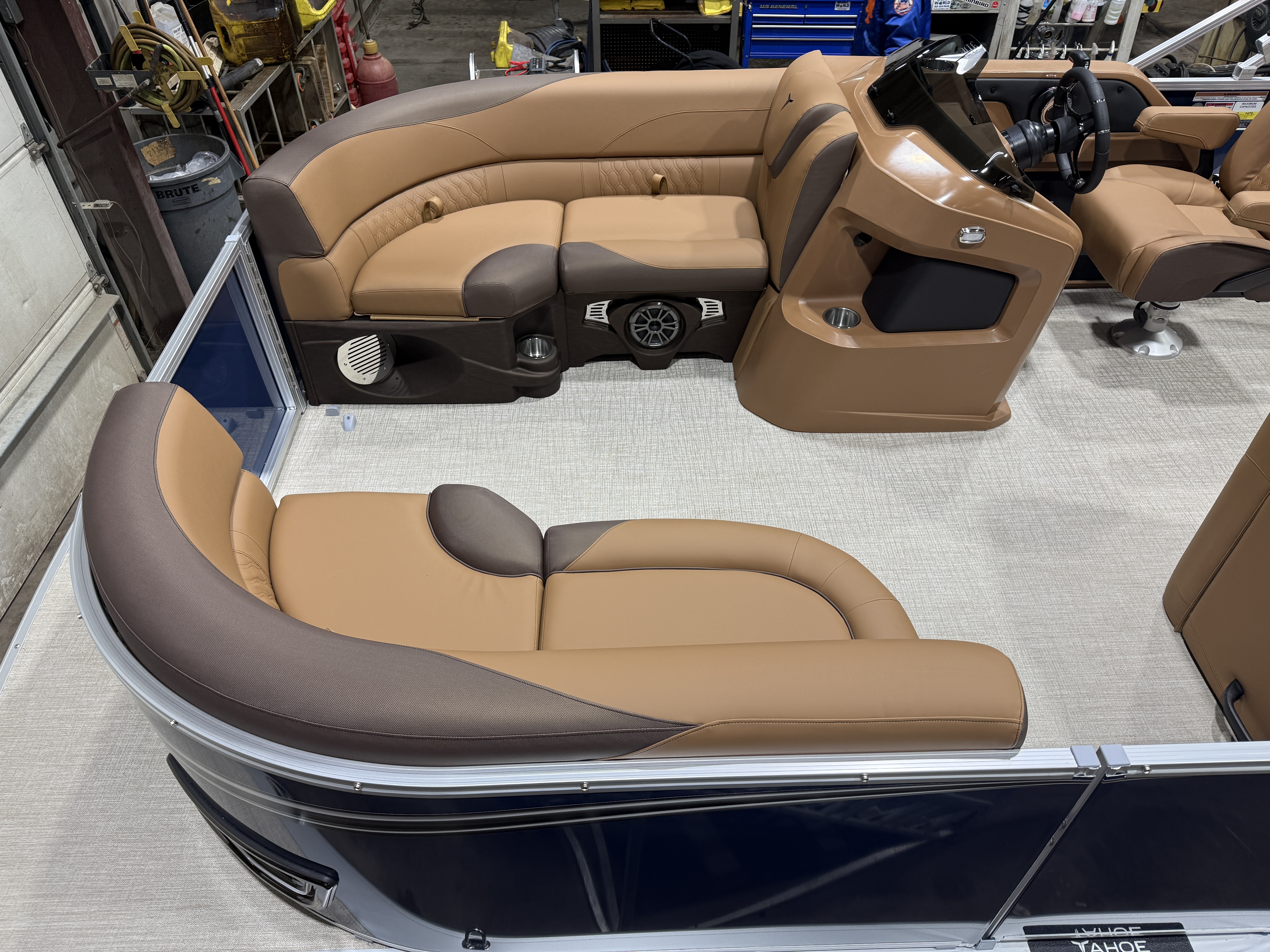 2026 Tahoe LTZ 1985 Cruise Rear Bench Pontoon & Honda 4-Stroke EFI. This Pontoon Has Bench Seating Up Front With Storage (1 Chaise Lounge), Wrap Around Chaise Lounge Seating With Storage, High Back Reclining Admiral Captain's Chair, Cognac Interior Package w/Expresso Accent, Rear Facing Swingback Bench Seat w/Chained Aft, Ski Tow Bar, Fusion Bluetooth Radio w/6 Speakers & Amp, Built In 25 Gallon Gas Tank, Table, Multiple Cup Holders, Adjustable 10' Bimini Top, LTZ Platinum Package (Ultra Fine Vinyl Upgrade, Garmin 52CV GPS Depth Finder, SST Pull-Up Cleats, LED Smoked Chrome Docklights, Polished Corner Caps, Platinum Edition Special Badging), Starboard Aft Storage & Cup Holders, SST Vent Covers, Lillipad Easy Step Ladder, Brushed Bronze Cladding, New Battery And Prop, On/Off Battery Switch, Mooring Cover, Riptide Vinyl Floor, Front And Rear Deck, 25" Tubes, LED NAV Lights, Smoked Chrome Logos, Tilt Steering, Bow USB Charging Port, Gauge Package w/Hour Meter. Rated For 10 People.