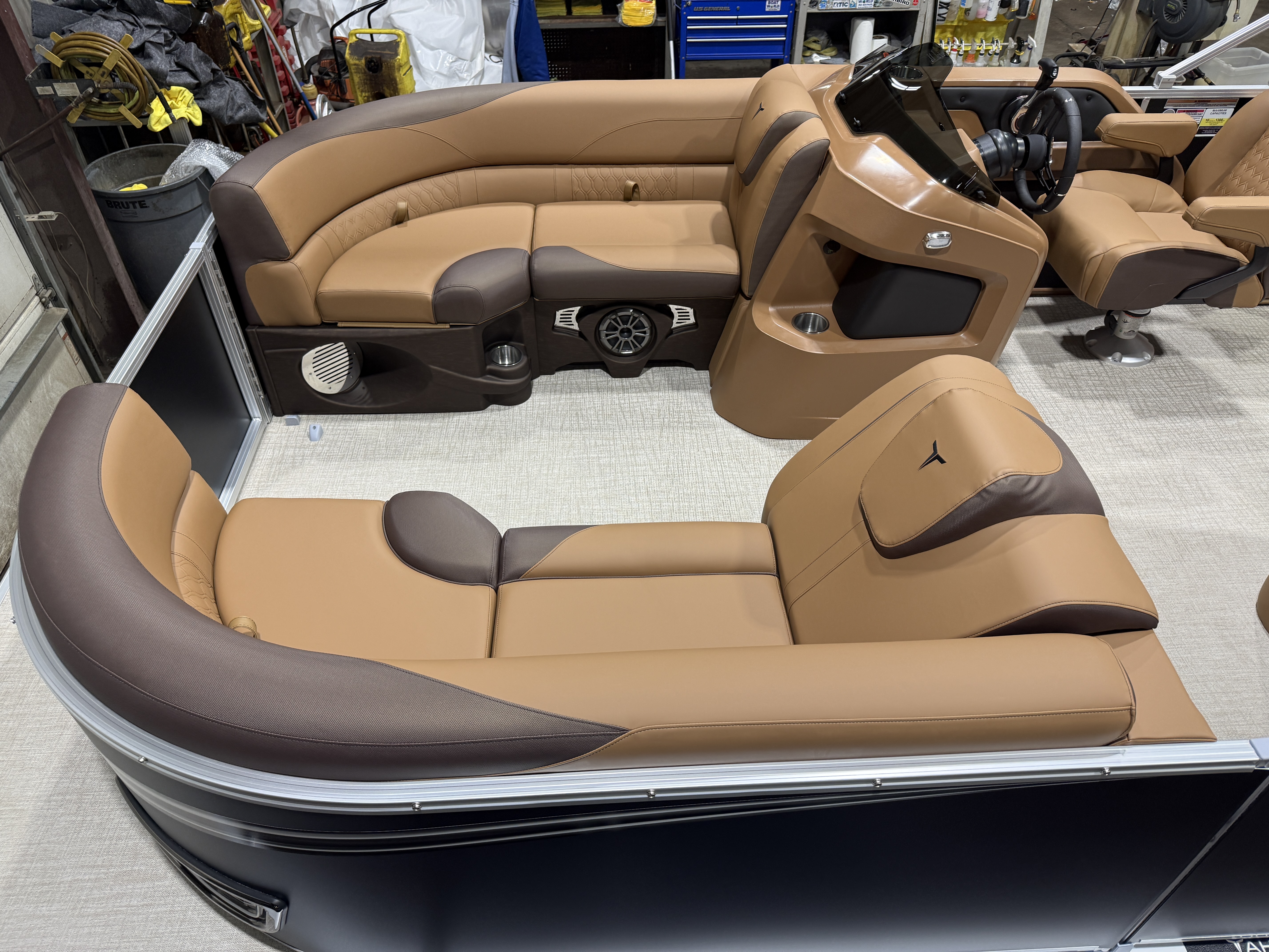 2026 Tahoe LTZ 2185 Cruise Rear Bench Pontoon & Honda 4-Stroke EFI. This Matte Black Walls Pontoon Has Chaise Lounge Bench Seating Up Front With Storage, Wrap Around Chaise Lounge Seating With Storage, High Back Reclining Admiral Captain's Chair, Cognac Interior Package w/Expresso Accent, Rear Facing Swingback Bench Seat w/Chained Aft, Ski Tow Bar, Fusion Bluetooth Radio w/6 Speakers & Amp, Built In 25 Gallon Gas Tank, Table, Multiple Cup Holders, Adjustable 10' Bimini Top, LTZ Platinum Package (Ultra Fine Vinyl Upgrade, Garmin 52CV GPS Depth Finder, SST Pull-Up Cleats, LED Smoked Chrome Docklights, Polished Corner Caps, Platinum Edition Special Badging), Starboard Aft Storage & Cup Holders, SST Vent Covers, Lillipad Easy Step Ladder, Brushed Bronze Cladding, New Battery And Prop, On/Off Battery Switch, Mooring Cover, Starboard Aft Support Box w/Built-In Trash Can, Riptide Vinyl Floor, Front And Rear Deck, 25" Tubes, LED NAV Lights, Smoked Chrome Logos, Tilt Steering, Bow USB Charging Port, Gauge Package w/Hour Meter. Rated For 10 People.