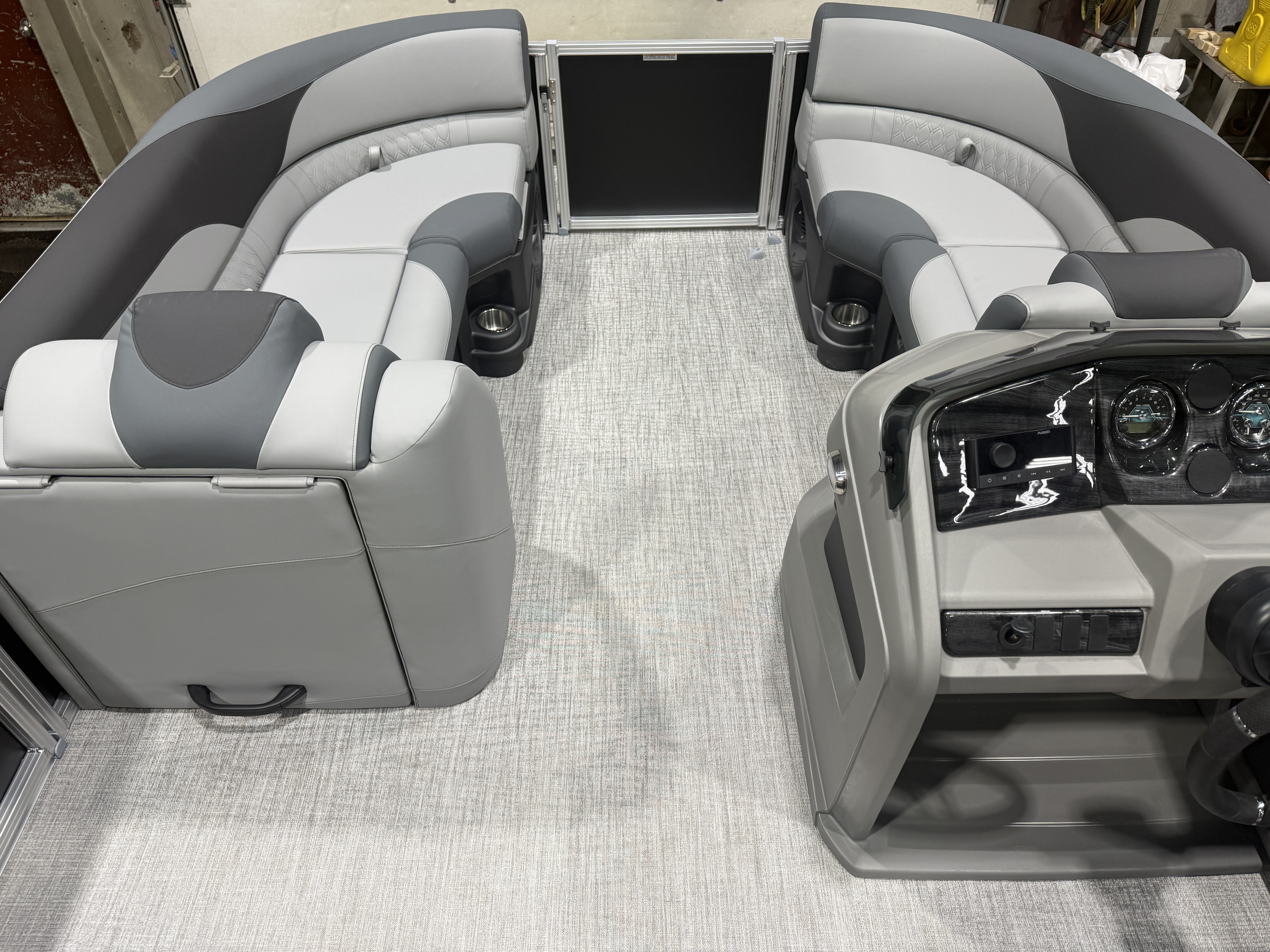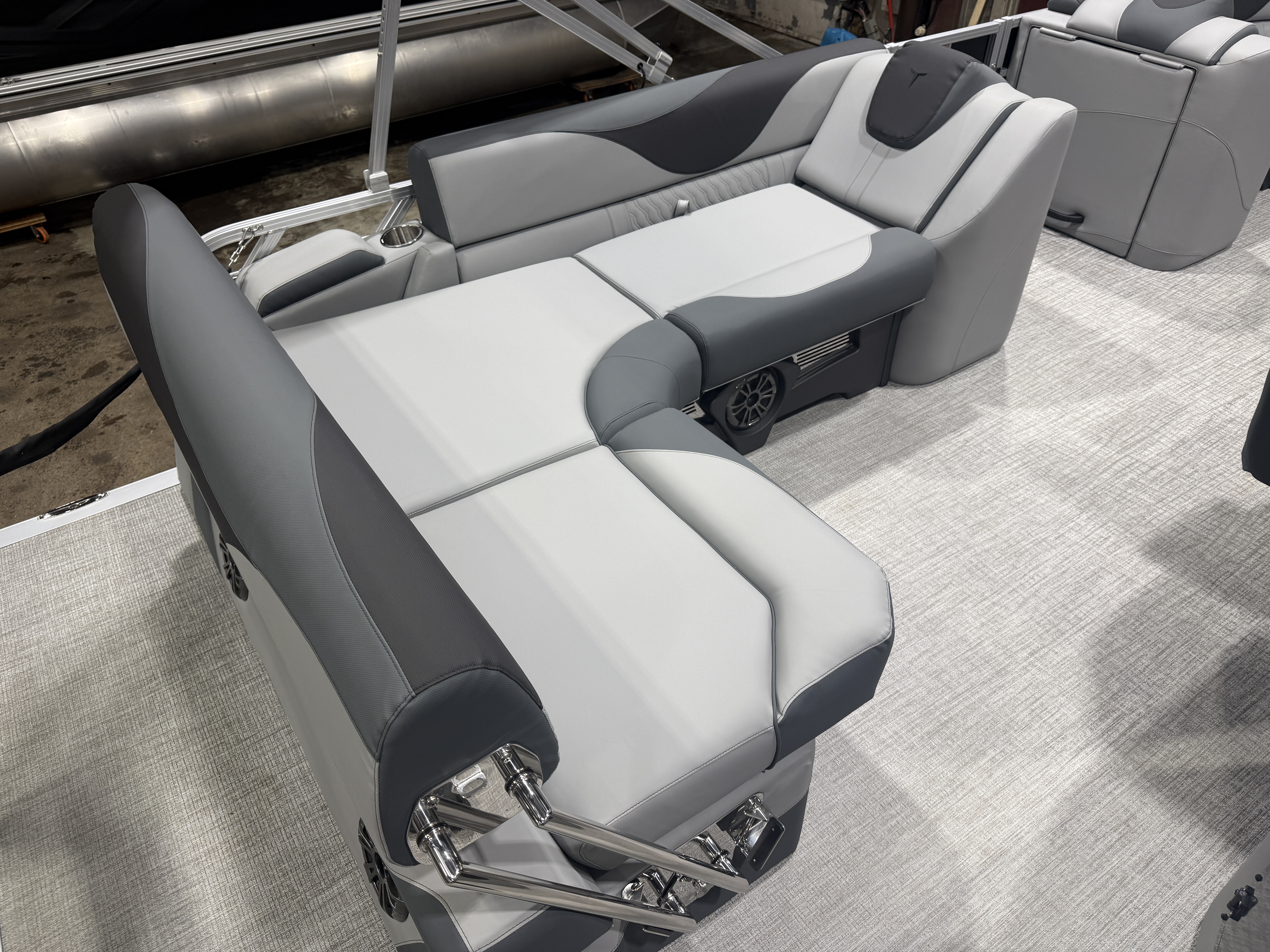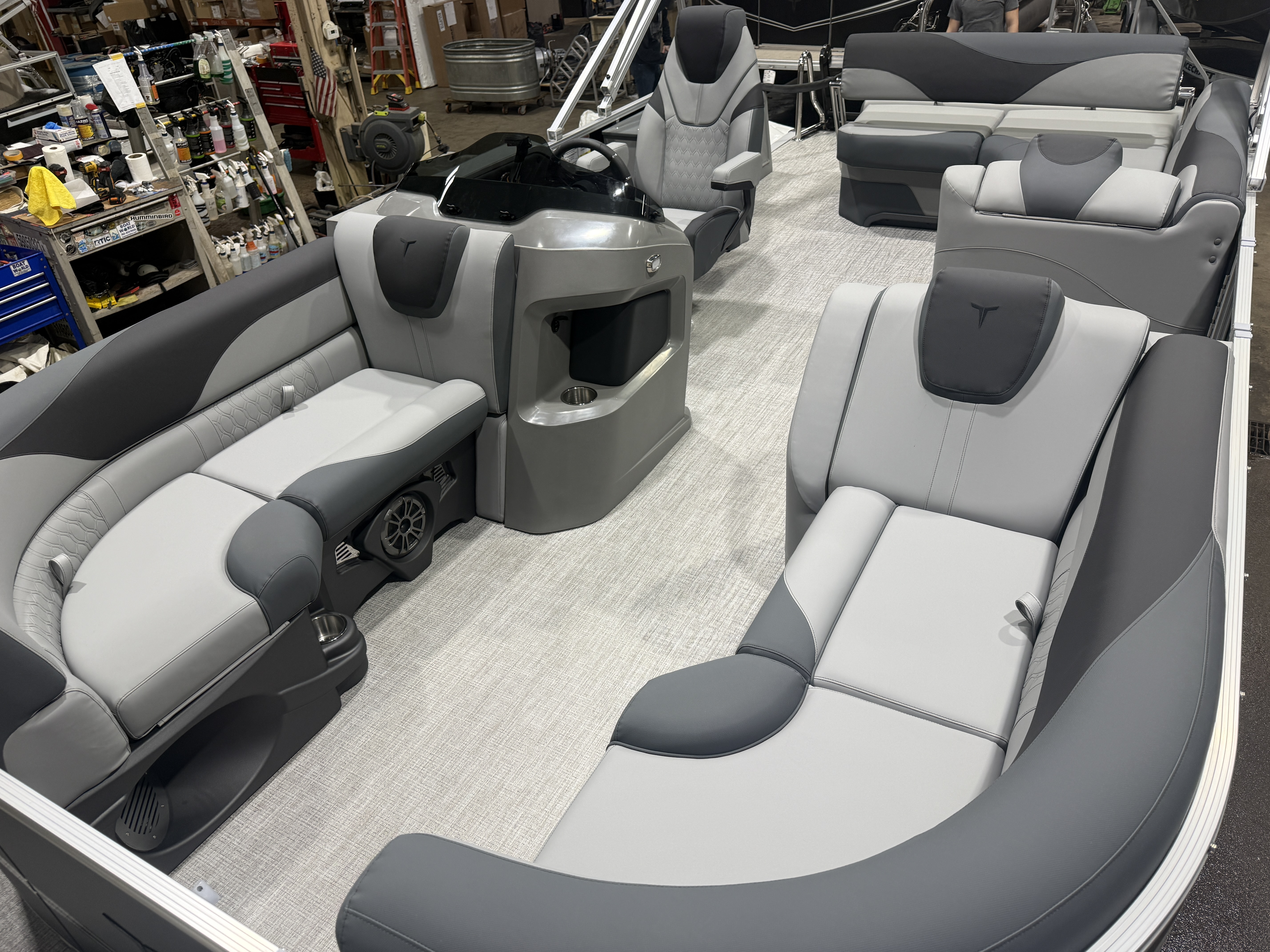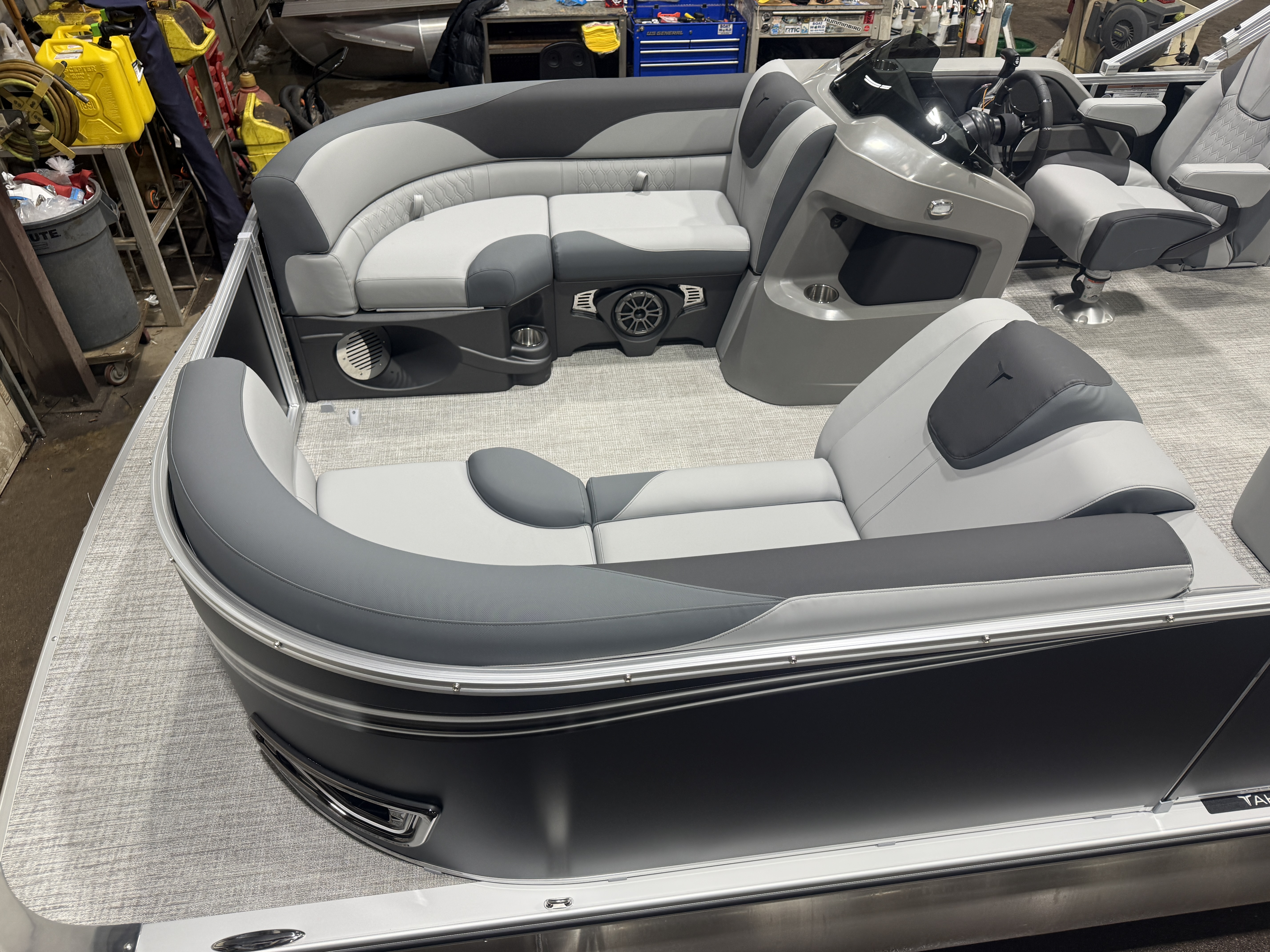 2026 Tahoe LTZ 2185 Cruise Rear Bench Pontoon & Honda 4-Stroke EFI. This Matte Black Walls Pontoon Has Chaise Lounge Bench Seating Up Front With Storage, Wrap Around Chaise Lounge Seating With Storage, High Back Reclining Admiral Captain's Chair, Graphite Interior Package w/Charcoal Accent, Rear Facing Swingback Bench Seat w/Chained Aft, Ski Tow Bar, Fusion Bluetooth Radio w/6 Speakers & Amp, Built In 25 Gallon Gas Tank, Table, Multiple Cup Holders, Adjustable 10' Bimini Top, LTZ Platinum Package (Ultra Fine Vinyl Upgrade, Garmin 52CV GPS Depth Finder, SST Pull-Up Cleats, LED Smoked Chrome Docklights, Polished Corner Caps, Platinum Edition Special Badging), Starboard Aft Storage & Cup Holders, SST Vent Covers, Lillipad Easy Step Ladder, Charcoal Cladding, New Battery And Prop, On/Off Battery Switch, Mooring Cover, Starboard Aft Support Box w/Built-In Trash Can, Riptide Vinyl Floor, Front And Rear Deck, 25" Tubes, LED NAV Lights, Smoked Chrome Logos, Tilt Steering, Bow USB Charging Port, Gauge Package w/Hour Meter. Rated For 10 People.
