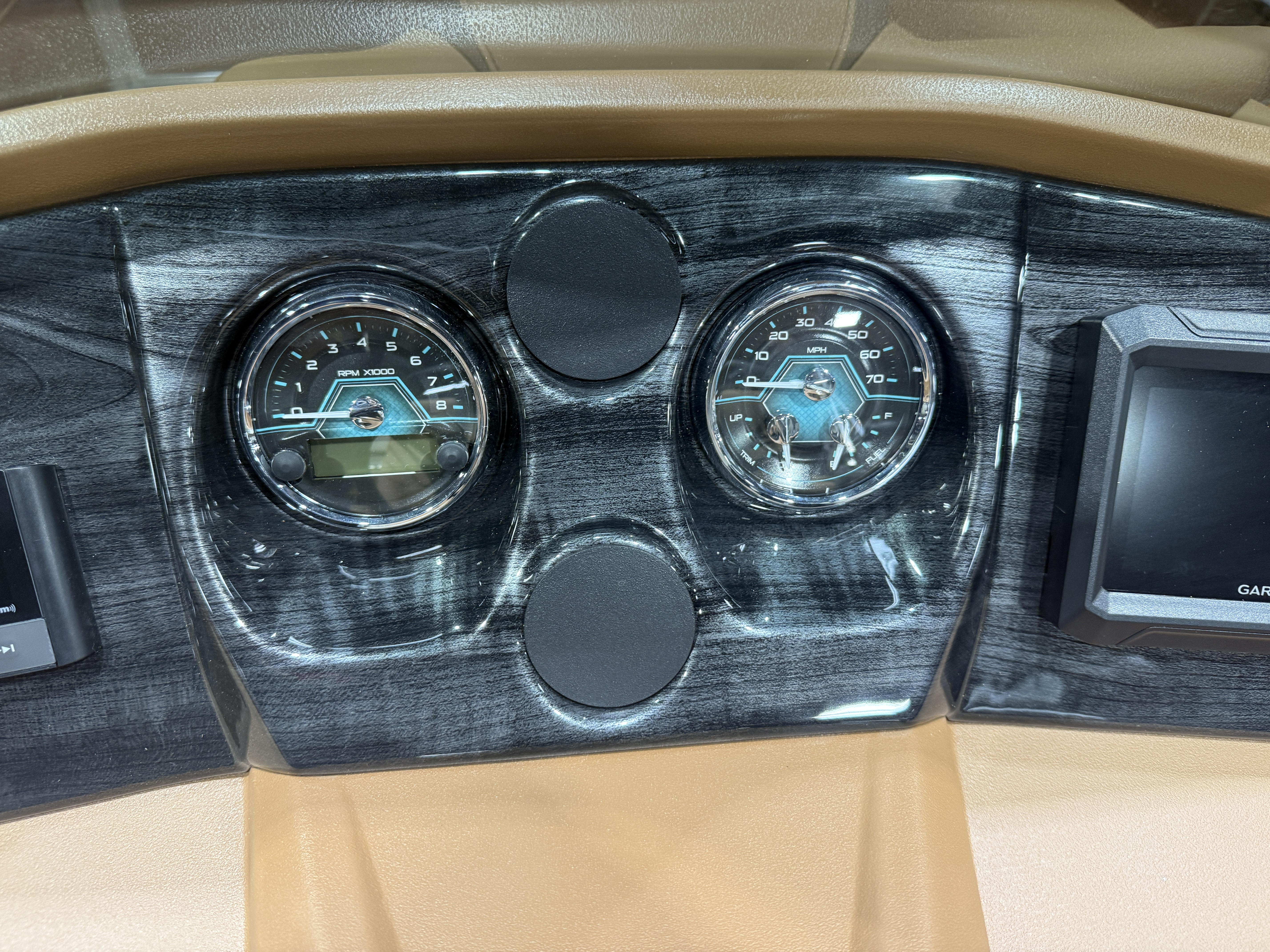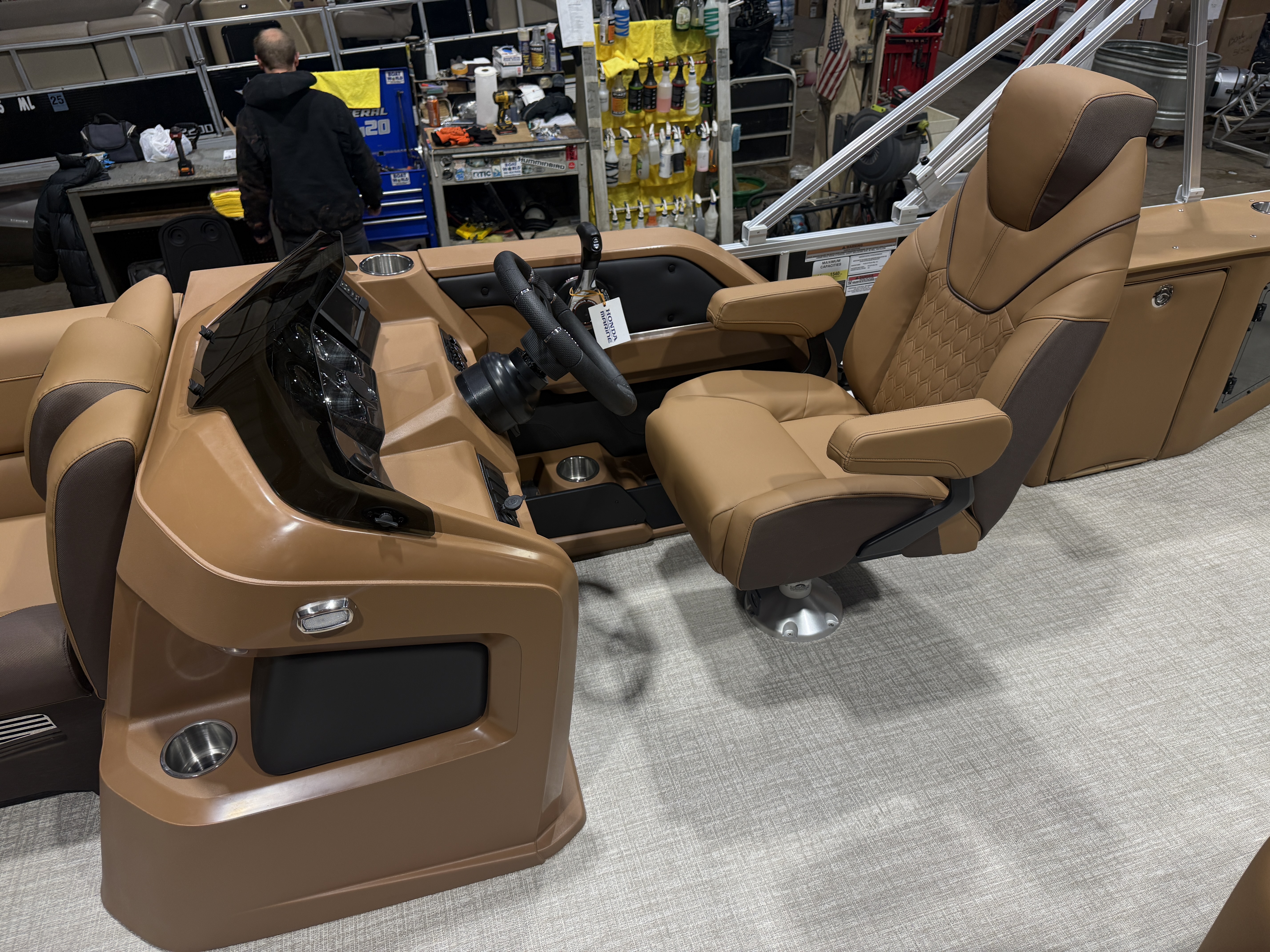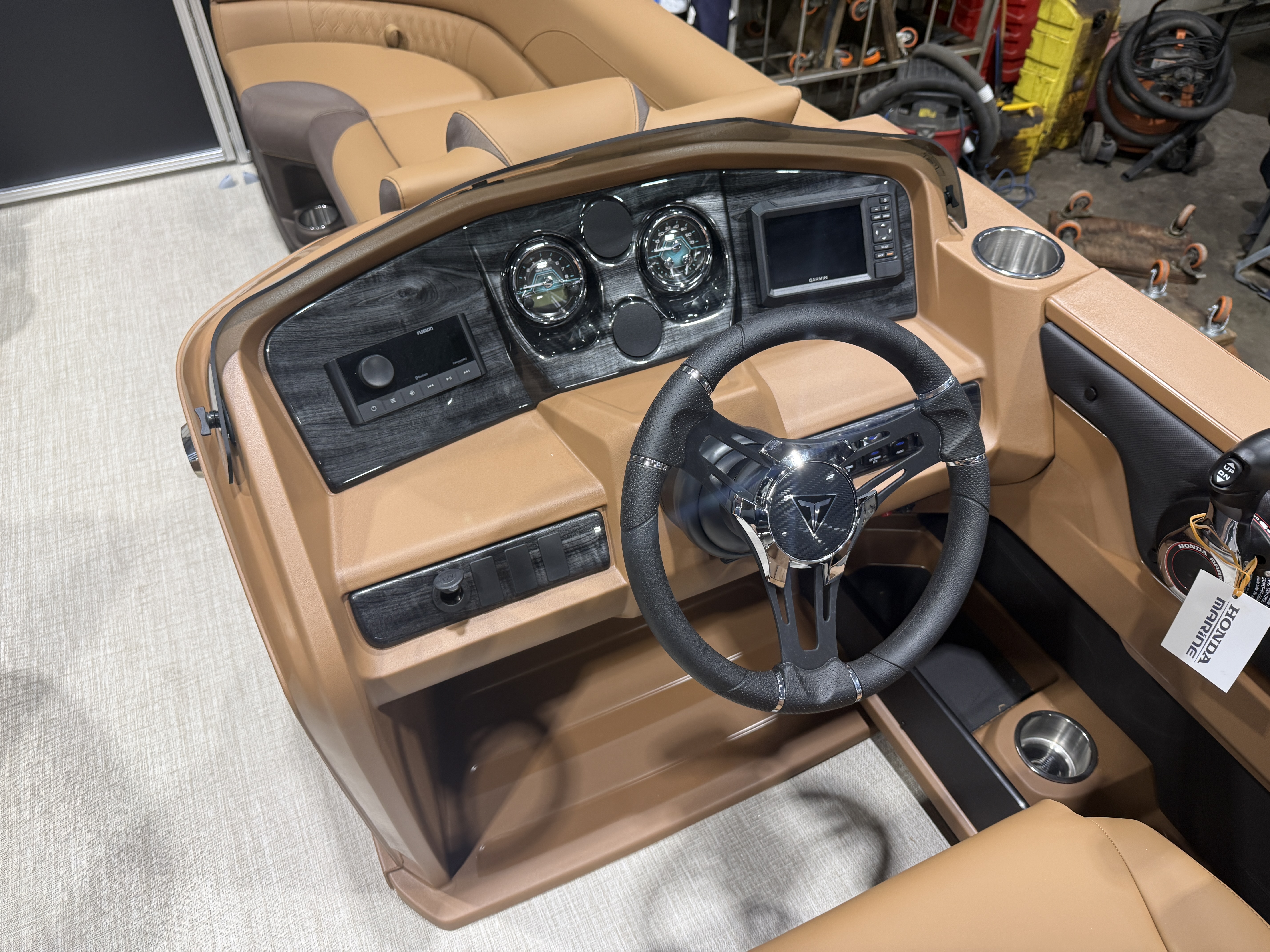 2026 Tahoe LTZ 2385 Cruise Rear Bench Pontoon & Honda 4-Stroke EFI. This Matte Black Walls Pontoon Has Chaise Lounge Bench Seating Up Front With Storage, Huge Wrap Around Chaise Lounge Seating With Storage, High Back Reclining Admiral Captain's Chair, Cognac Interior Package w/Expresso Accent, Rear Facing Swingback Bench Seat w/Chained Aft, Ski Tow Bar, Fusion Bluetooth Radio w/6 Speakers & Amp, Built In 25 Gallon Gas Tank, Table, Multiple Cup Holders, Adjustable 10' Bimini Top, LTZ Platinum Package (Ultra Fine Vinyl Upgrade, Garmin 52CV GPS Depth Finder, SST Pull-Up Cleats, LED Smoked Chrome Docklights, Polished Corner Caps, Platinum Edition Special Badging), Starboard Aft Storage Center w/Garbage Can & Cup Holders, SST Vent Covers, Lillipad Easy Step Ladder, Brushed Bronze Cladding, New Battery And Prop, On/Off Battery Switch, Mooring Cover, Riptide Vinyl Floor, Front And Rear Deck, 25" Tubes, LED NAV Lights, Smoked Chrome Logos, Tilt Steering, Bow USB Charging Port, Gauge Package w/Hour Meter. Rated For 11 People.