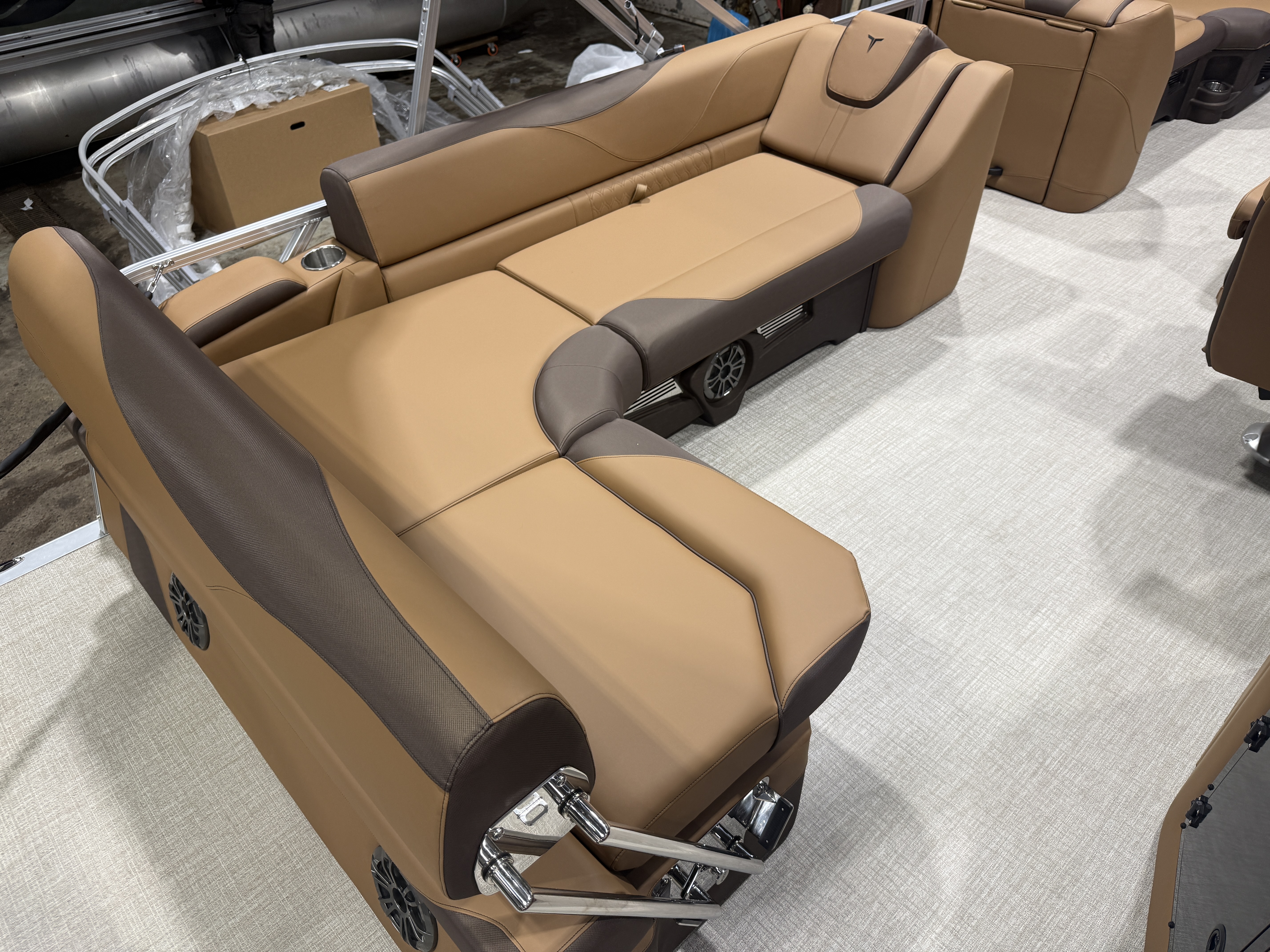 The 2026 Tahoe Pontoons LTZ 2385 Cruise Rear Bench (CRB) combines luxury and functionality, making it an ideal choice for leisurely days on the water. This pontoon features a spacious layout with chaise lounge bench seating both at the front and in a wrap-around design for ample storage. The high-back reclining admiral captain's chair ensures comfort, and the Cognac interior with Espresso accents adds a touch of elegance. Notable features include a rear-facing swingback bench seat, a ski tow bar, a Fusion Bluetooth radio with six speakers, and a hydro-dynamic, brushed bronze cladding. Equipped with a 25-gallon built-in gas tank and a spacious 23' 3" aluminum hull design, the pontoon accommodates up to 11 people. Add-ons include a 10' bimini top, Garmin GPS depth finder, and a range of power options from a Honda 40HP to a 115HP 4-Stroke EFI engine. The LTZ Platinum Package offers upgrades like ultra-fine vinyl, SST pull-up cleats, and LED chrome docklights. Safety and convenience are highlighted with a Lillipad easy step ladder, mooring cover, and LED NAV lights. The pontoon is available with pricing inclusive of freight, rigging, battery, and prop. A 10-year warranty from Tahoe and a 5-year non-declining warranty from Honda underscore its reliability. Financing is available upon approval of credit, and all factory rebates are included in the sale price. For those interested in trailers, they are available for separate purchase.