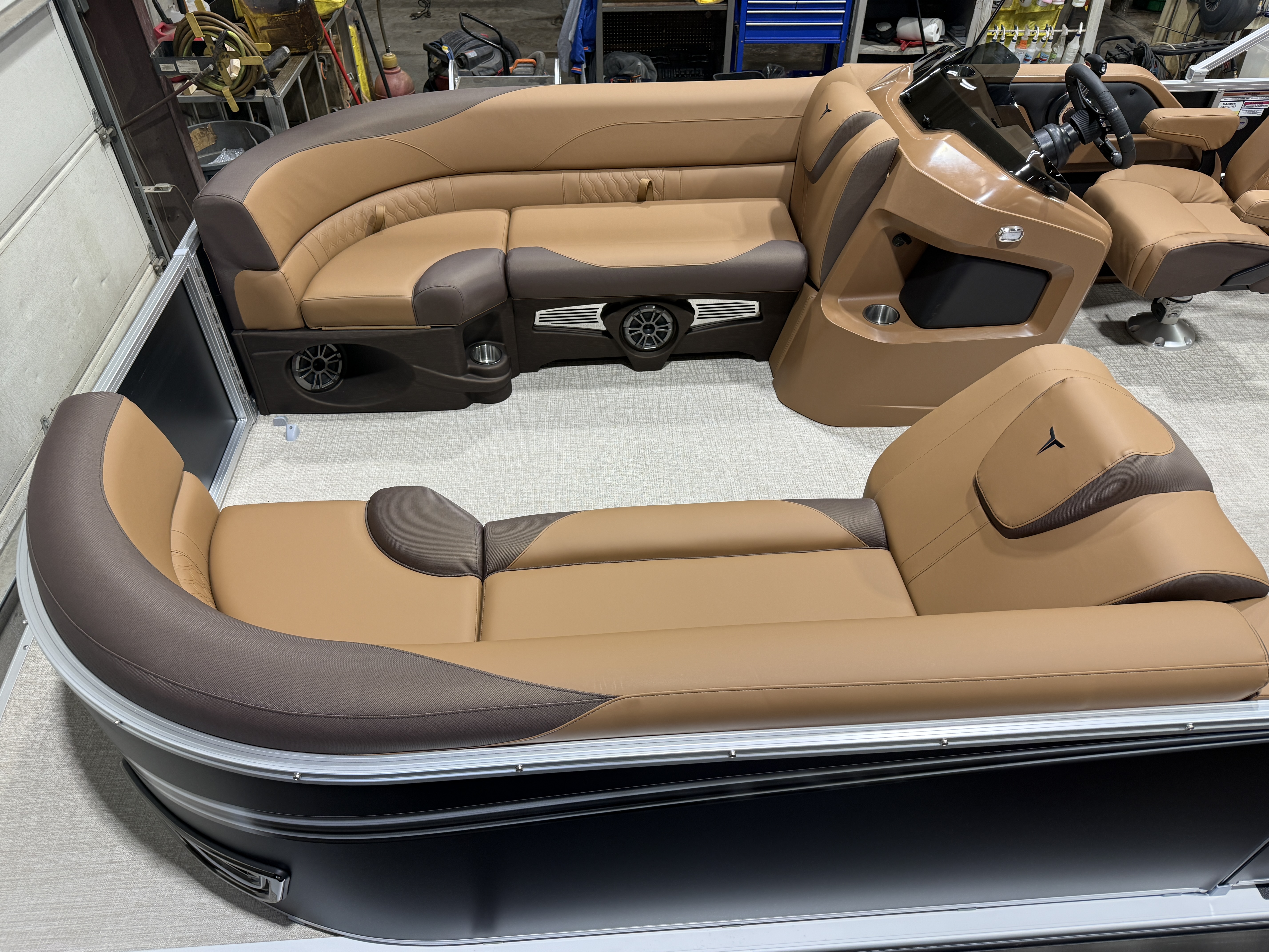 2026 Tahoe LTZ 2385 Elite Cruise Pontoon & Honda 4-Stroke EFI. This 23' Matte Black Walls Cruise Pontoon Has 2 Lounge Bench Seating Up Front With Storage, Side Chaise Lounge Seating With Storage (Great Spot For The Spotter), Rear Wrap Around Lounge Seating, Riptide Vinyl Floor, Built-In 25 Gallon Gas Tank, LTZ Platinum Package (Admiral Reclining Captain's Chair, Ultrafine Touch Vinyl Upgrade, Garmin 52CV GPS Depth Finder, SST Pull-Up Cleats, LED Smoked Docking Lights, SST Vent Covers, Polished Corner Caps, Platinum Edition Special Badging), Mooring Cover, Cognac Vinyl Package w/Expresso Accent, LED Nav Lights, Gauge Package With Hour Meter, Bluetooth Fusion Radio With 6 Speakers & Amp, Tilt Steering, Lillipad Easy Step Ladder, Greywood Rectangle Table, Lifetime Aluminum Seat Frames, Adjustable 10' Bimini Top, 25" Tubes, Multiple Cup Holders, Battery Switch, Bow USB Charging Port, Smoked Chrome Logos, New Battery, Front And Rear Swim Deck. Rated For 11 People.