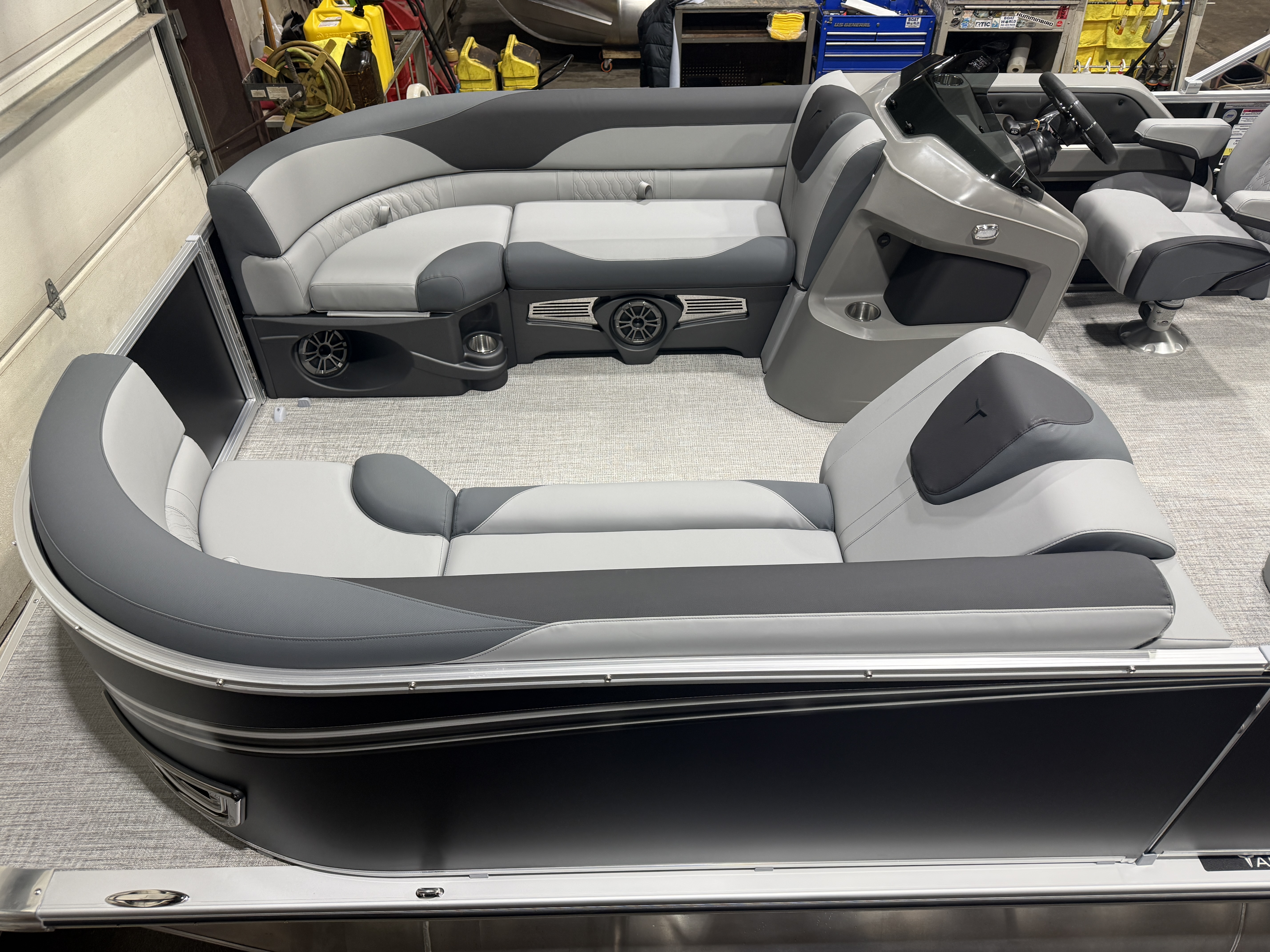 2026 Tahoe LTZ 2385 Elite Cruise Pontoon & Honda 4-Stroke EFI. This 23' Matte Black Walls Cruise Pontoon Has 2 Lounge Bench Seating Up Front With Storage, Side Chaise Lounge Seating With Storage (Great Spot For The Spotter), Rear Wrap Around Lounge Seating, Riptide Vinyl Floor, Built-In 25 Gallon Gas Tank, LTZ Platinum Package (Admiral Reclining Captain's Chair, Ultrafine Touch Vinyl Upgrade, Garmin 52CV GPS Depth Finder, SST Pull-Up Cleats, LED Smoked Docking Lights, SST Vent Covers, Polished Corner Caps, Platinum Edition Special Badging), Mooring Cover, Graphite Vinyl Package w/Charcoal Accent, LED Nav Lights, Gauge Package With Hour Meter, Bluetooth Fusion Radio With 6 Speakers & Amp, Tilt Steering, Lillipad Easy Step Ladder, Greywood Rectangle Table, Lifetime Aluminum Seat Frames, Adjustable 10' Bimini Top, 25" Tubes, Multiple Cup Holders, Battery Switch, Bow USB Charging Port, Smoked Chrome Logos, New Battery, Front And Rear Swim Deck. Rated For 11 People.