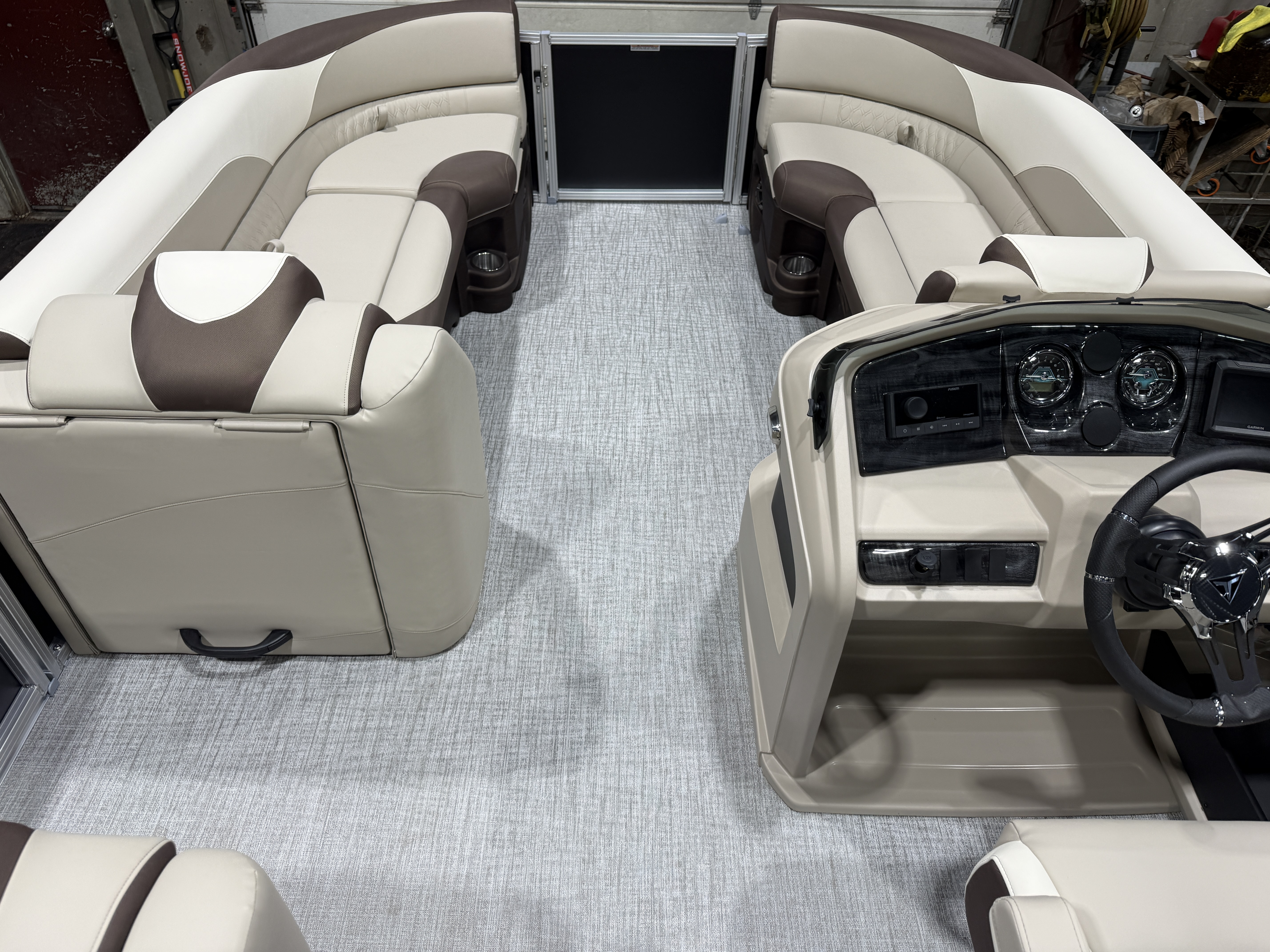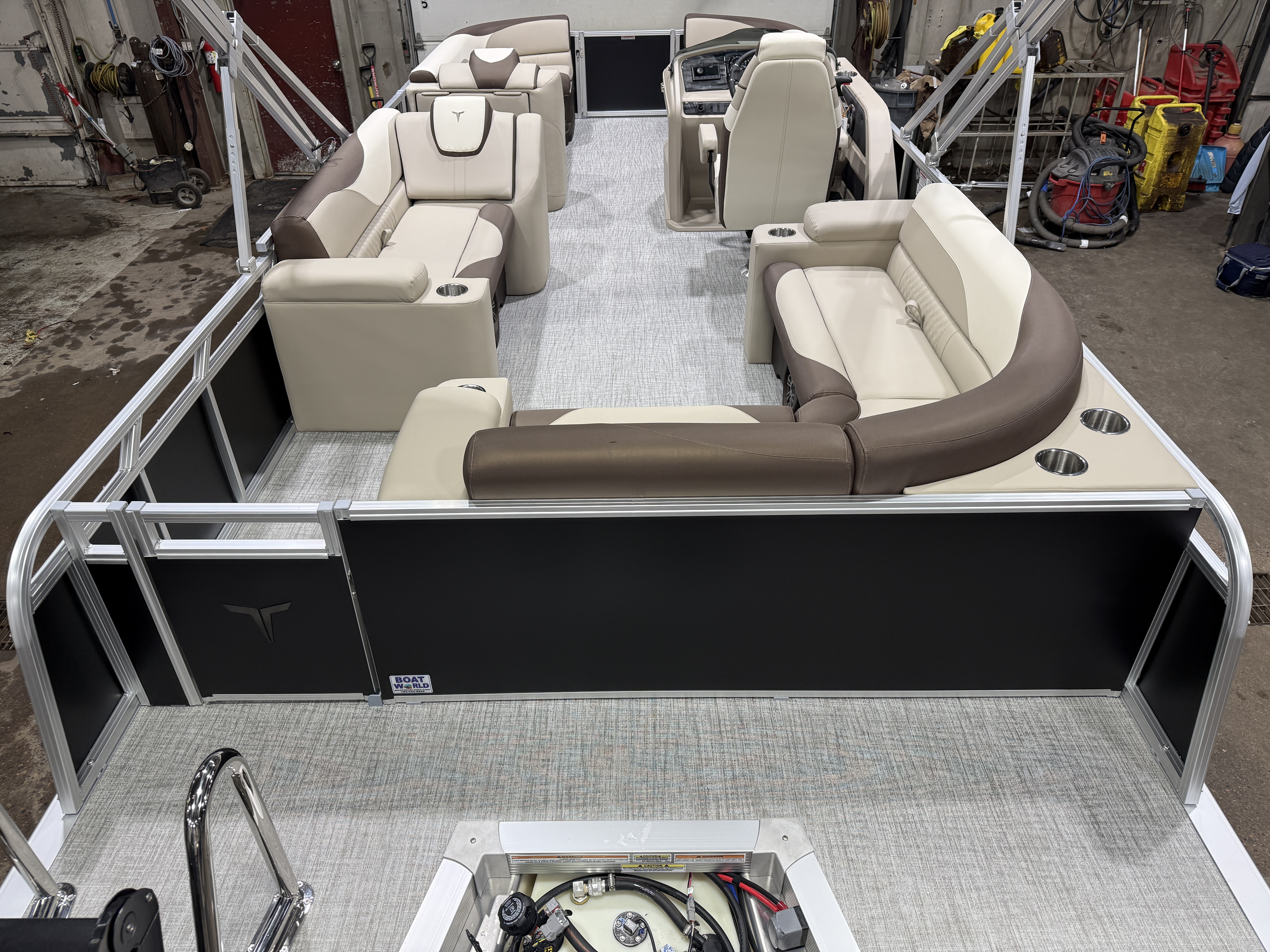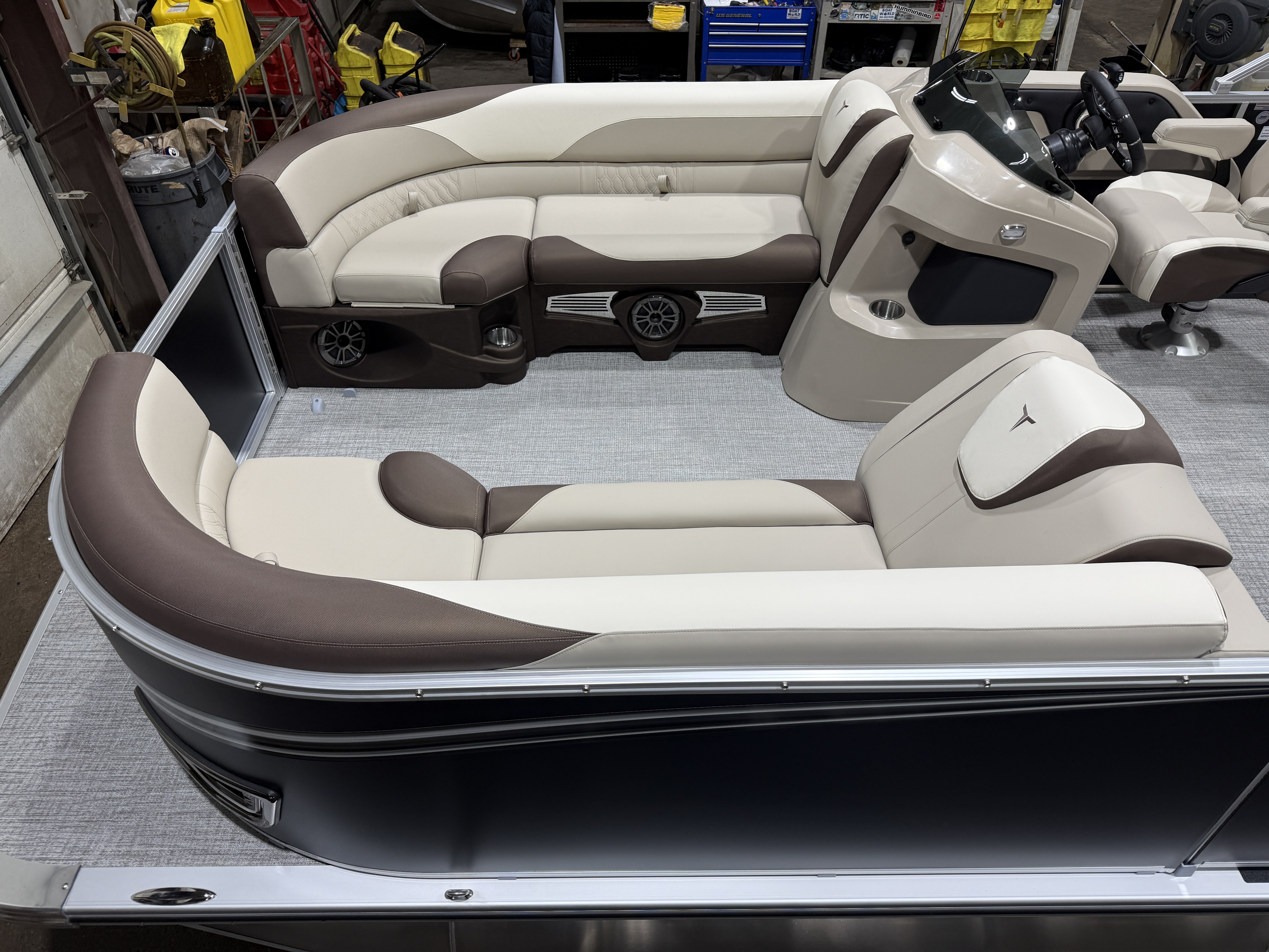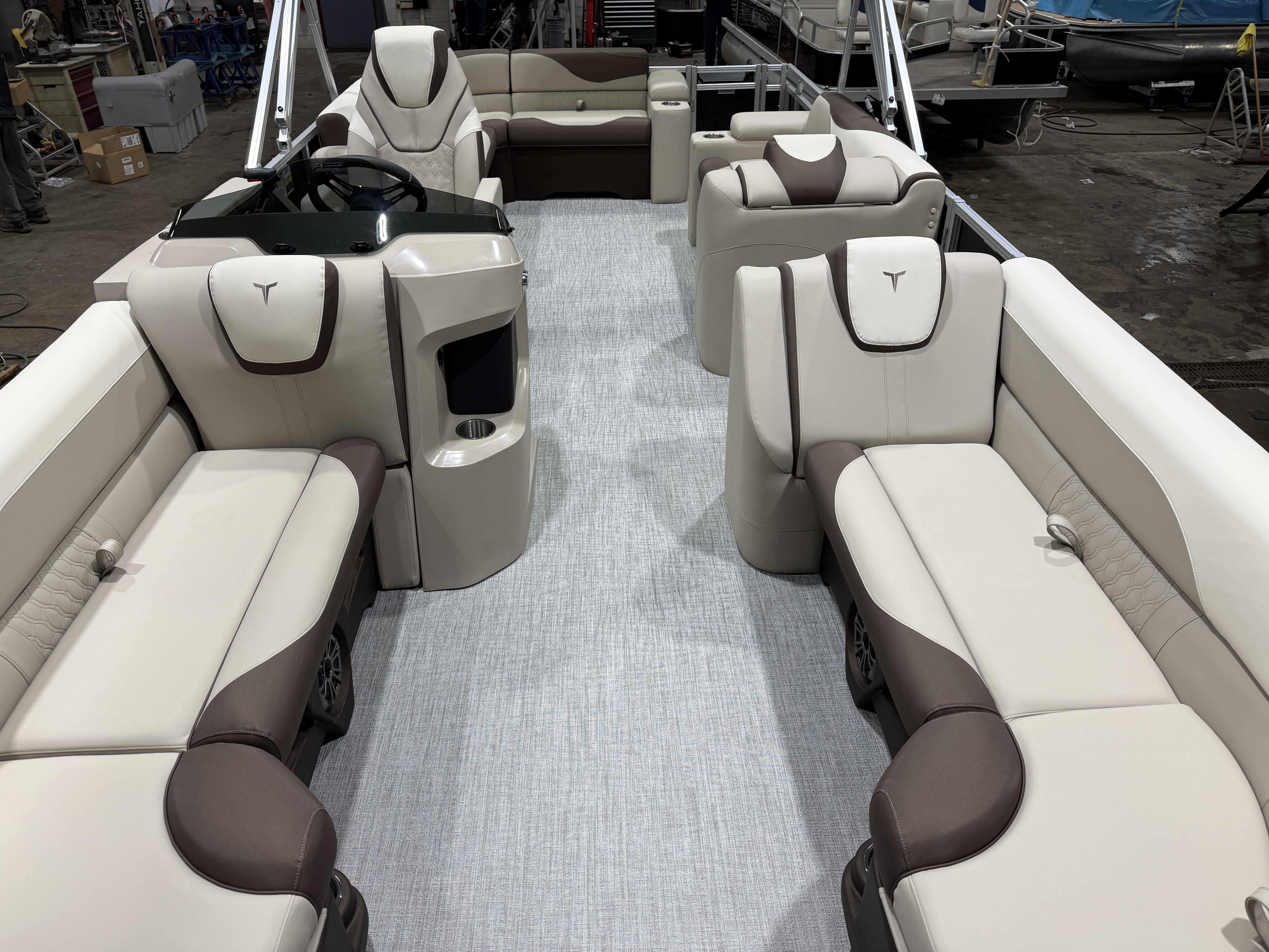 2026 Tahoe LTZ 2385 Elite Cruise Pontoon & Honda 4-Stroke EFI. This 23' Matte Black Walls Cruise Pontoon Has 2 Lounge Bench Seating Up Front With Storage, Side Chaise Lounge Seating With Storage (Great Spot For The Spotter), Rear Wrap Around Lounge Seating, Riptide Vinyl Floor, Built-In 25 Gallon Gas Tank, LTZ Platinum Package (Admiral Reclining Captain's Chair, Ultrafine Touch Vinyl Upgrade, Garmin 52CV GPS Depth Finder, SST Pull-Up Cleats, LED Smoked Docking Lights, SST Vent Covers, Polished Corner Caps, Platinum Edition Special Badging), Mooring Cover, Buckskin Vinyl Package w/Expresso Accent, LED Nav Lights, Gauge Package With Hour Meter, Bluetooth Fusion Radio With 6 Speakers & Amp, Tilt Steering, Lillipad Easy Step Ladder, Greywood Rectangle Table, Lifetime Aluminum Seat Frames, Adjustable 10' Bimini Top, 25" Tubes, Multiple Cup Holders, Battery Switch, Bow USB Charging Port, Smoked Chrome Logos, New Battery, Front And Rear Swim Deck. Rated For 11 People.