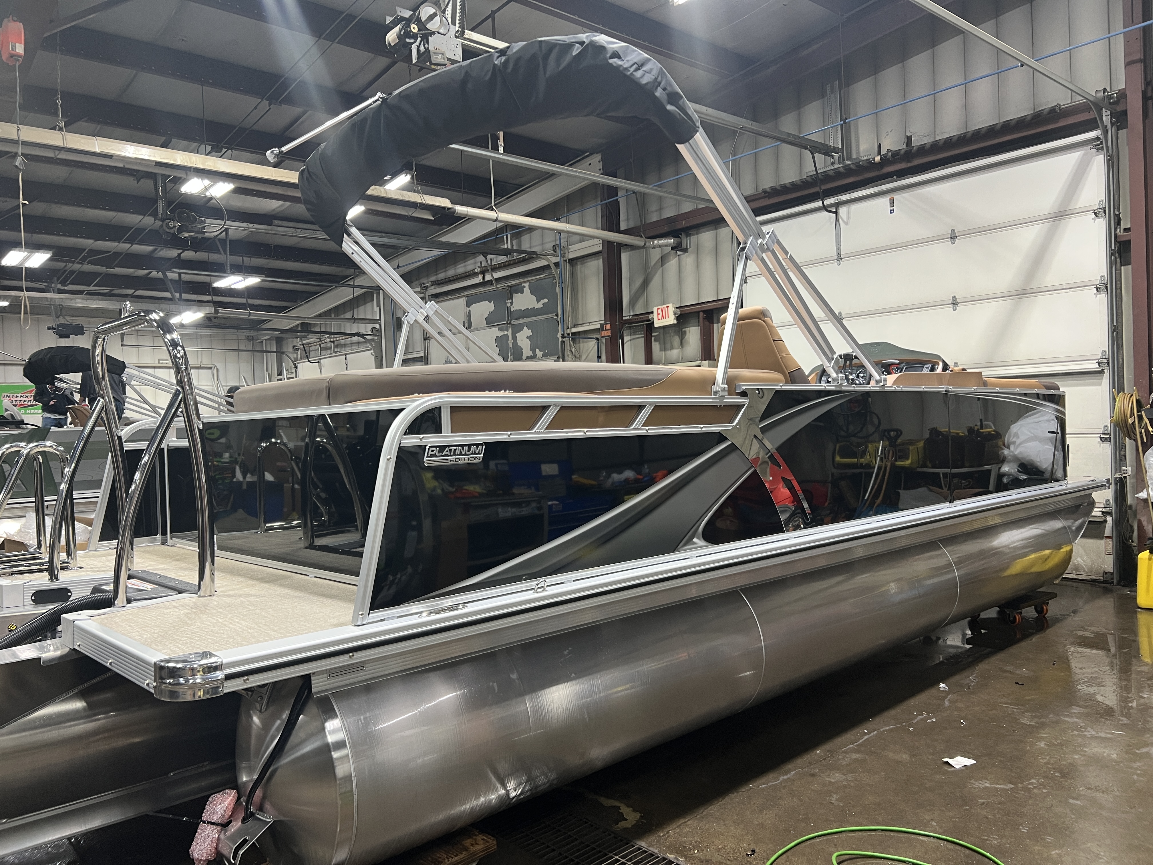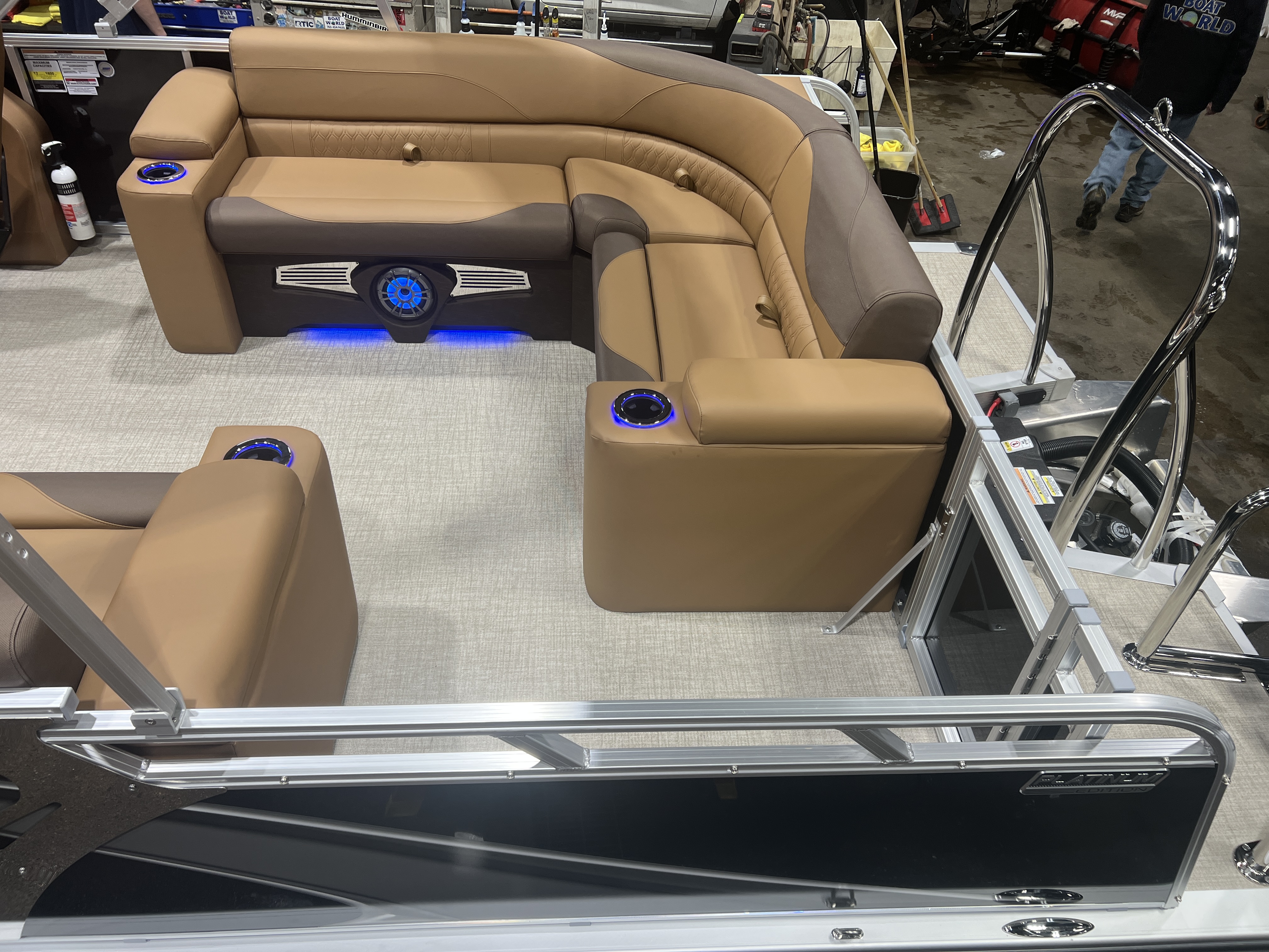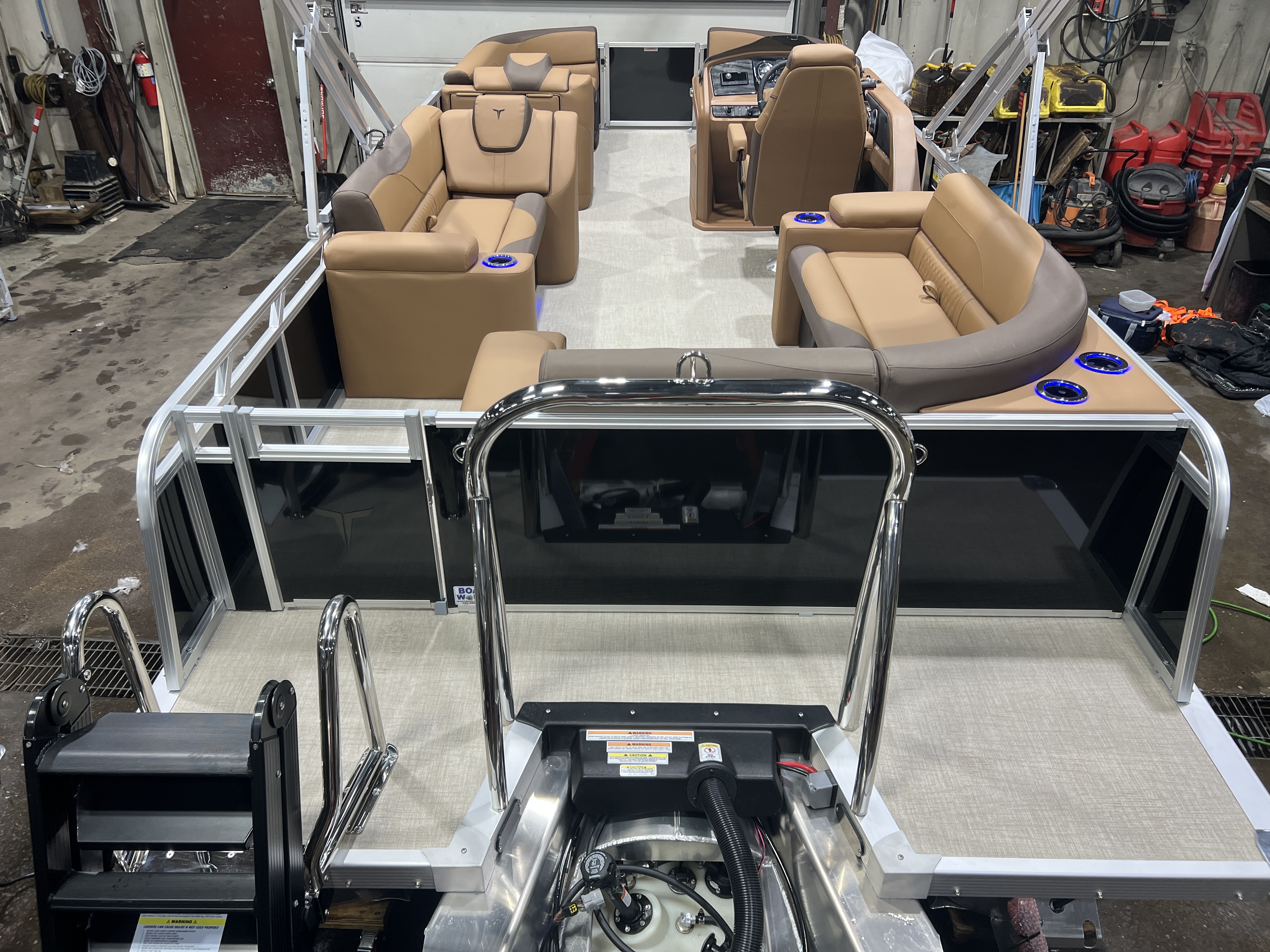 2026 Tahoe LTZ 2385 Elite Cruise Tritoon Pontoon & Honda 4-Stroke EFI. This Cruise Tri-Toon Pontoon Has 2 Lounge Bench Seating Up Front With Storage, Side Lounge Seating With Storage, Admiral High Back Captain's Chair, Rear Wrap Around Lounge Seating, Riptide Vinyl Floor, Built-In 38 Gallon Gas Tank, Cognac Vinyl Package w/Expresso Accent, Brushed Bronze Seat Cladding, LTZ Platinum Edition (Ultra Fine Vinyl Upgrade, Garmin 52CV GPS Depth Finder, SST Pull-Up Cleats, LED Smoked Chrome Docklights, Polished Corner Caps, SST Vent Covers, Platinum Edition Special Badging), Mooring Cover, LED Nav Lights, Gauge Package With Hour Meter, Bluetooth Fusion Radio With 6 Speakers, Tilt Hydraulic Steering, Dimmable Blue Ice Package (Lighted Cup Holders, Speakers & Mood Lighting), Sport Performance Package, Ski Tow Bar, Lillipad EZ Step Ladder, Bow USB Charging Port, Greywood Rectangle Table, Lifetime Aluminum Seat Frames, Lifting Strakes, Underneath Sheeting, Adjustable 10' Bimini Top, 25" Tubes, Multiple Cup Holders, Smoked Chrome Logos, Dual Battery On/Off Switch, New Battery, Front And Rear Swim Deck. Rated For 12 People.