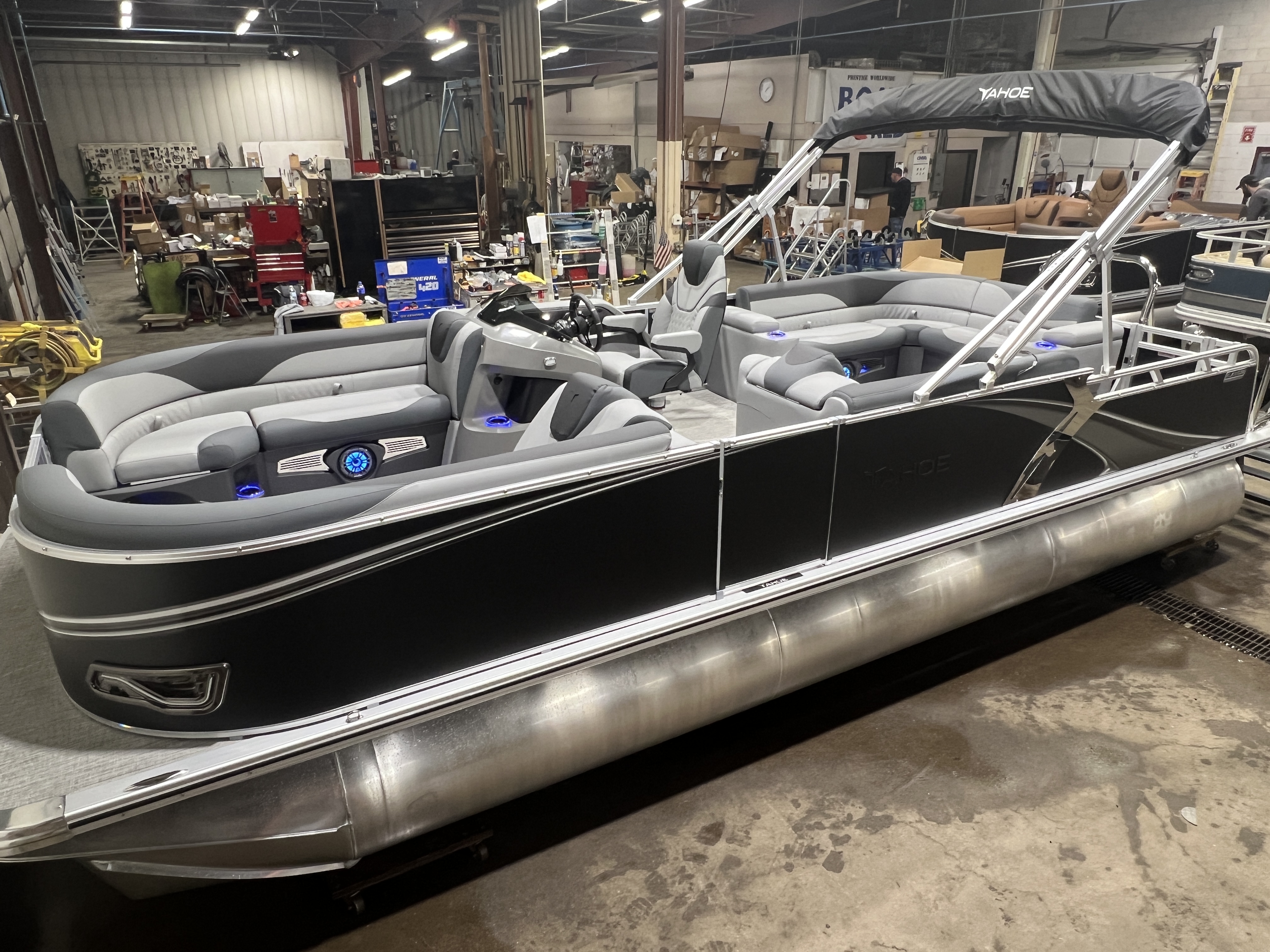 2026 Tahoe LTZ 2385 Elite Cruise Tritoon Pontoon & Honda 4-Stroke EFI. This Sage Green Cruise Tri-Toon Pontoon Has 2 Lounge Bench Seating Up Front With Storage, Side Lounge Seating With Storage, Admiral High Back Captain's Chair, Rear Wrap Around Lounge Seating, Riptide Vinyl Floor, Built-In 38 Gallon Gas Tank, Graphite Vinyl Package w/Charcoal Accent, Charcoal Seat Cladding, LTZ Platinum Edition (Ultra Fine Vinyl Upgrade, Garmin 52CV GPS Depth Finder, SST Pull-Up Cleats, LED Smoked Chrome Docklights, Polished Corner Caps, SST Vent Covers, Platinum Edition Special Badging), Mooring Cover, LED Nav Lights, Gauge Package With Hour Meter, Bluetooth Fusion Radio With 6 Speakers, Tilt Hydraulic Steering, Dimmable Blue Ice Package (Lighted Cup Holders, Speakers & Mood Lighting), Sport Performance Package, Ski Tow Bar, Lillipad EZ Step Ladder, Bow USB Charging Port, Greywood Rectangle Table, Lifetime Aluminum Seat Frames, Lifting Strakes, Underneath Sheeting, Adjustable 10' Bimini Top, 25" Tubes, Multiple Cup Holders, Smoked Chrome Logos, Dual Battery On/Off Switch, New Battery, Front And Rear Swim Deck. Rated For 12 People.