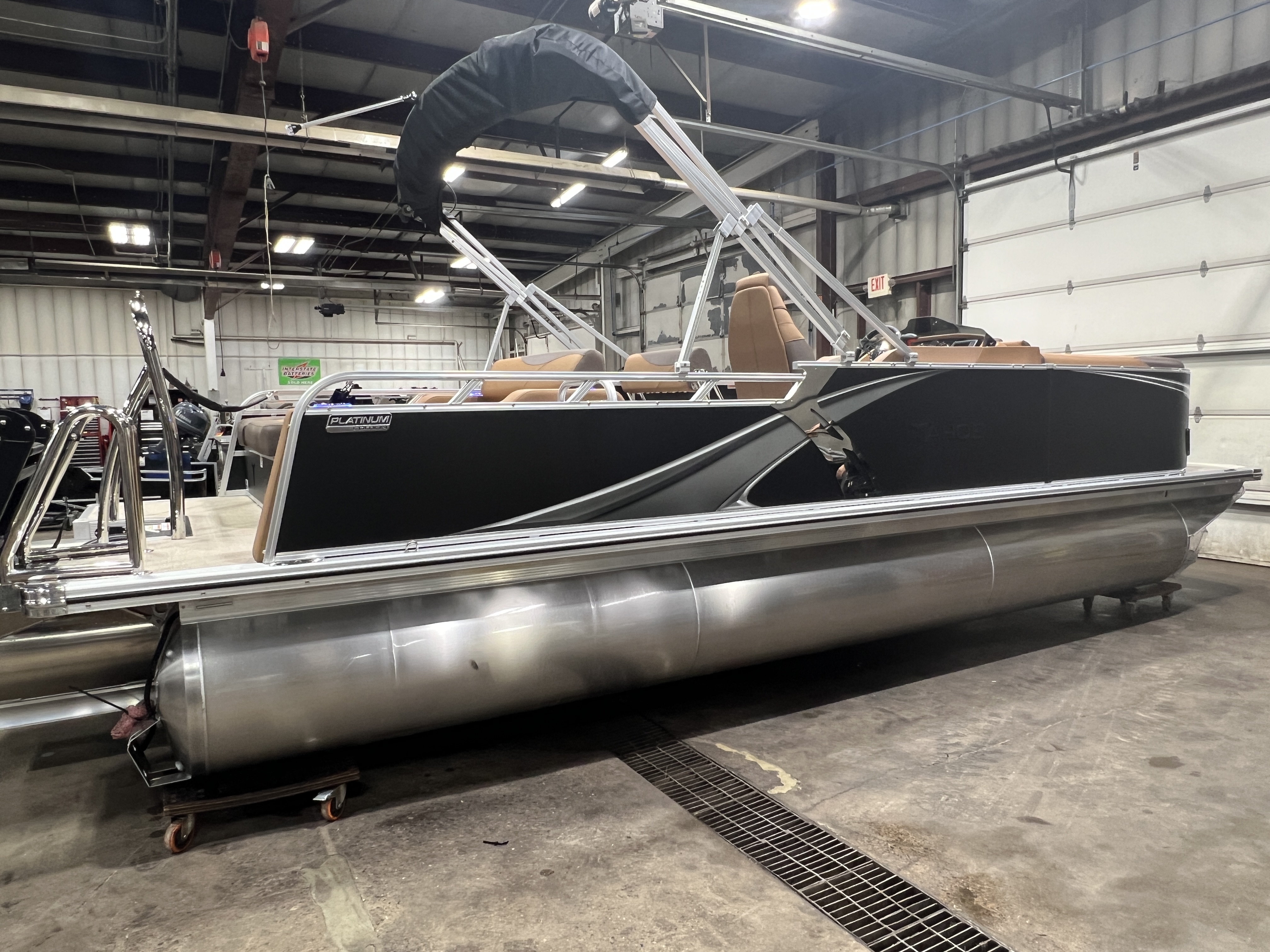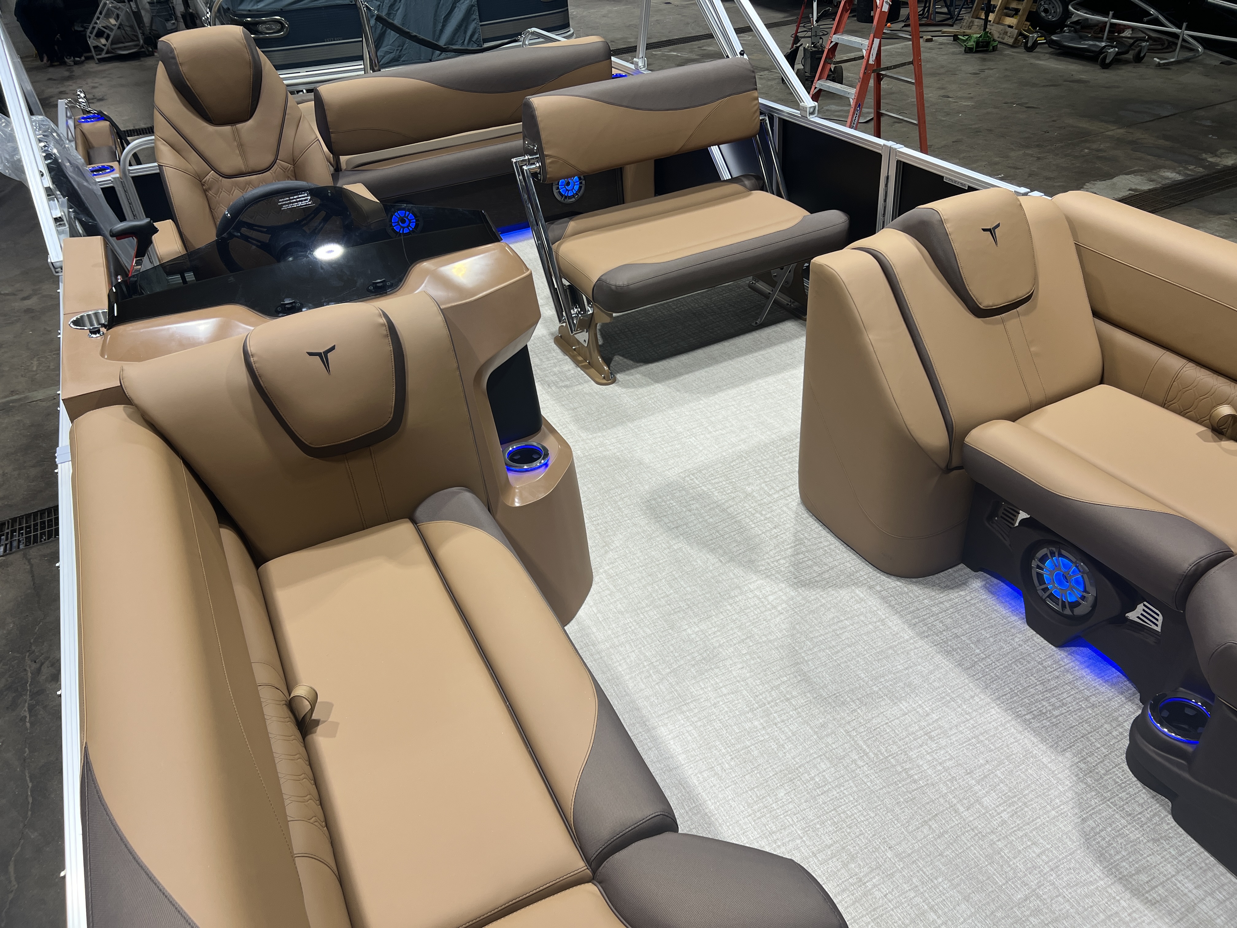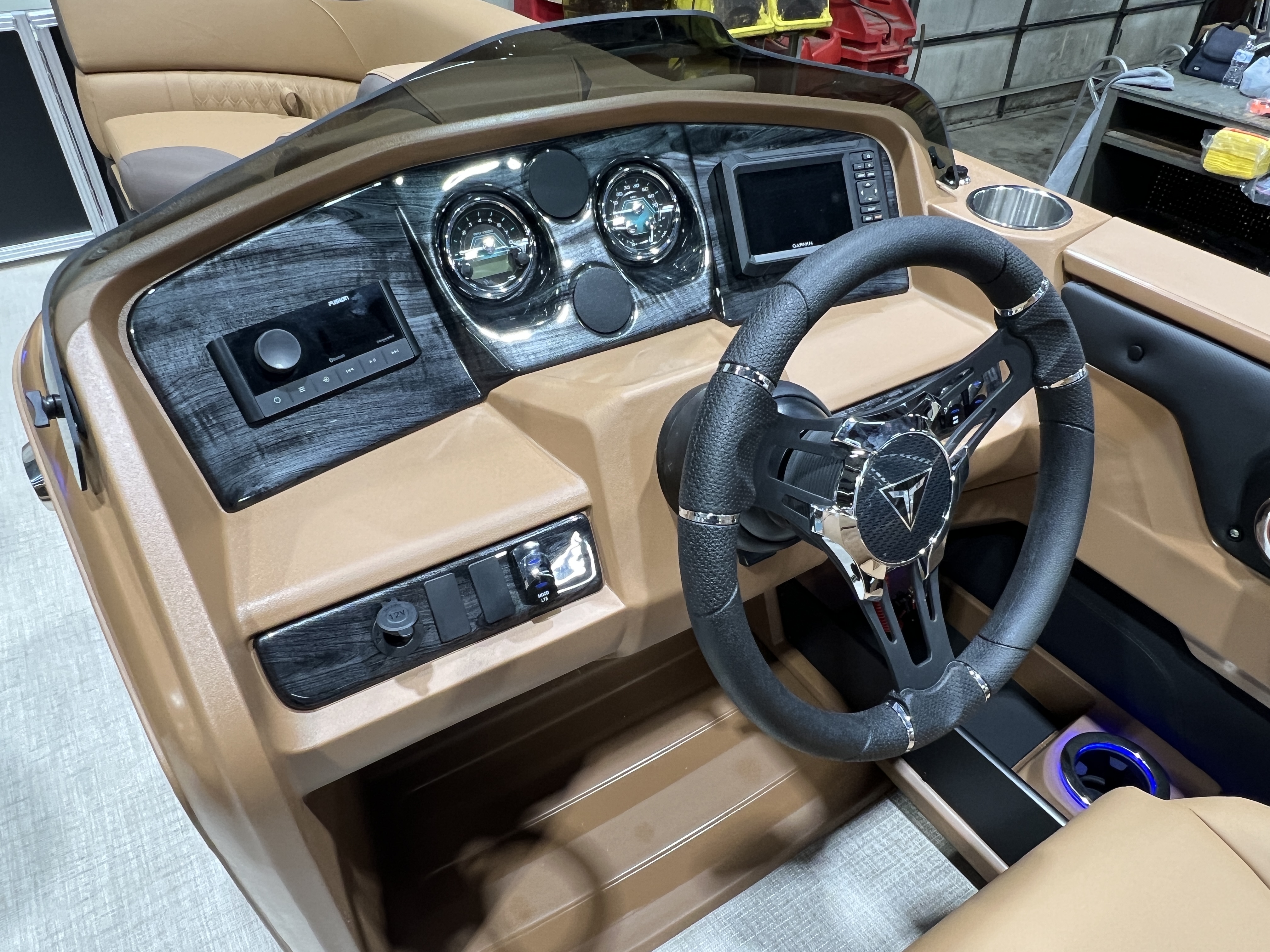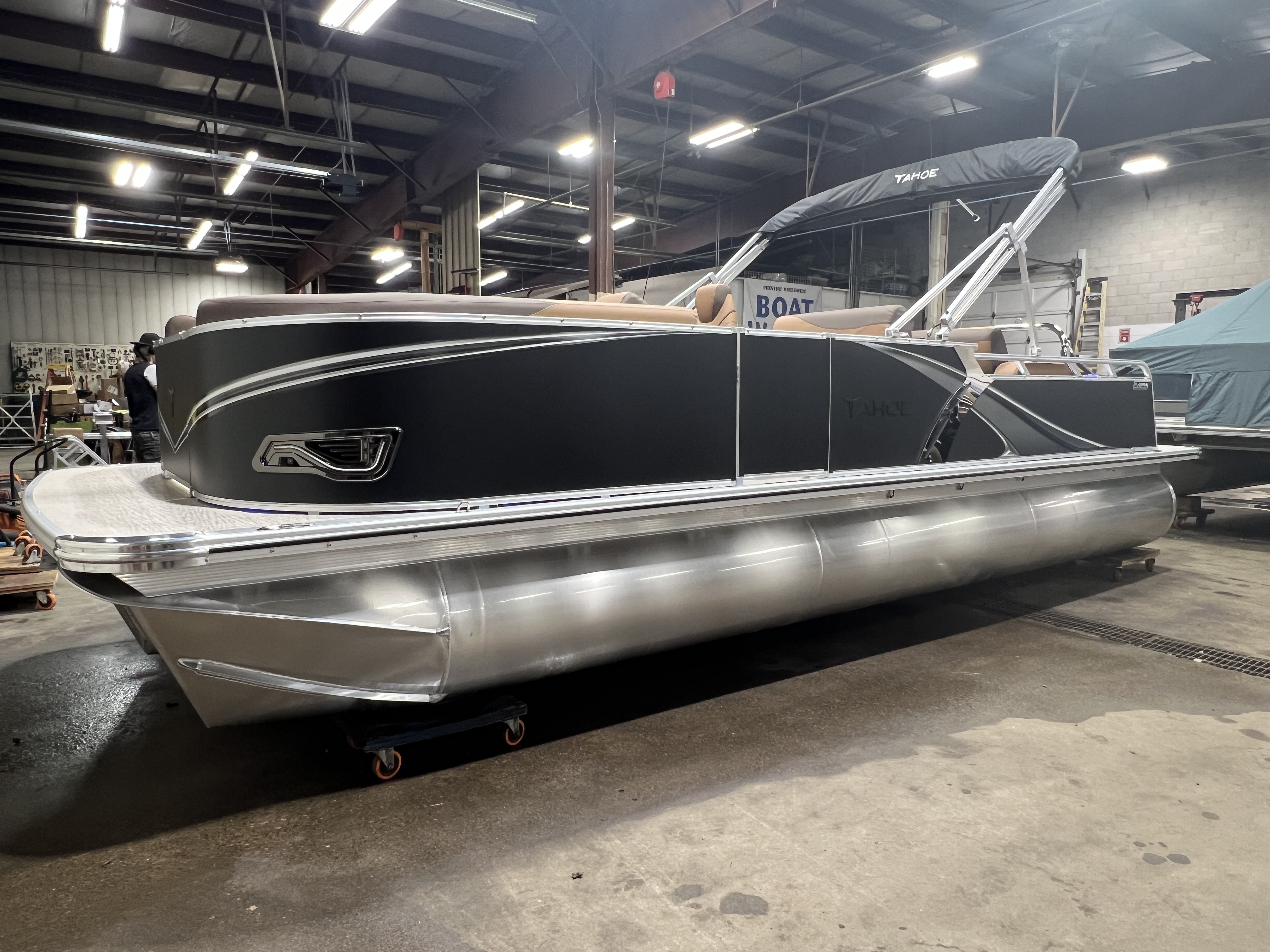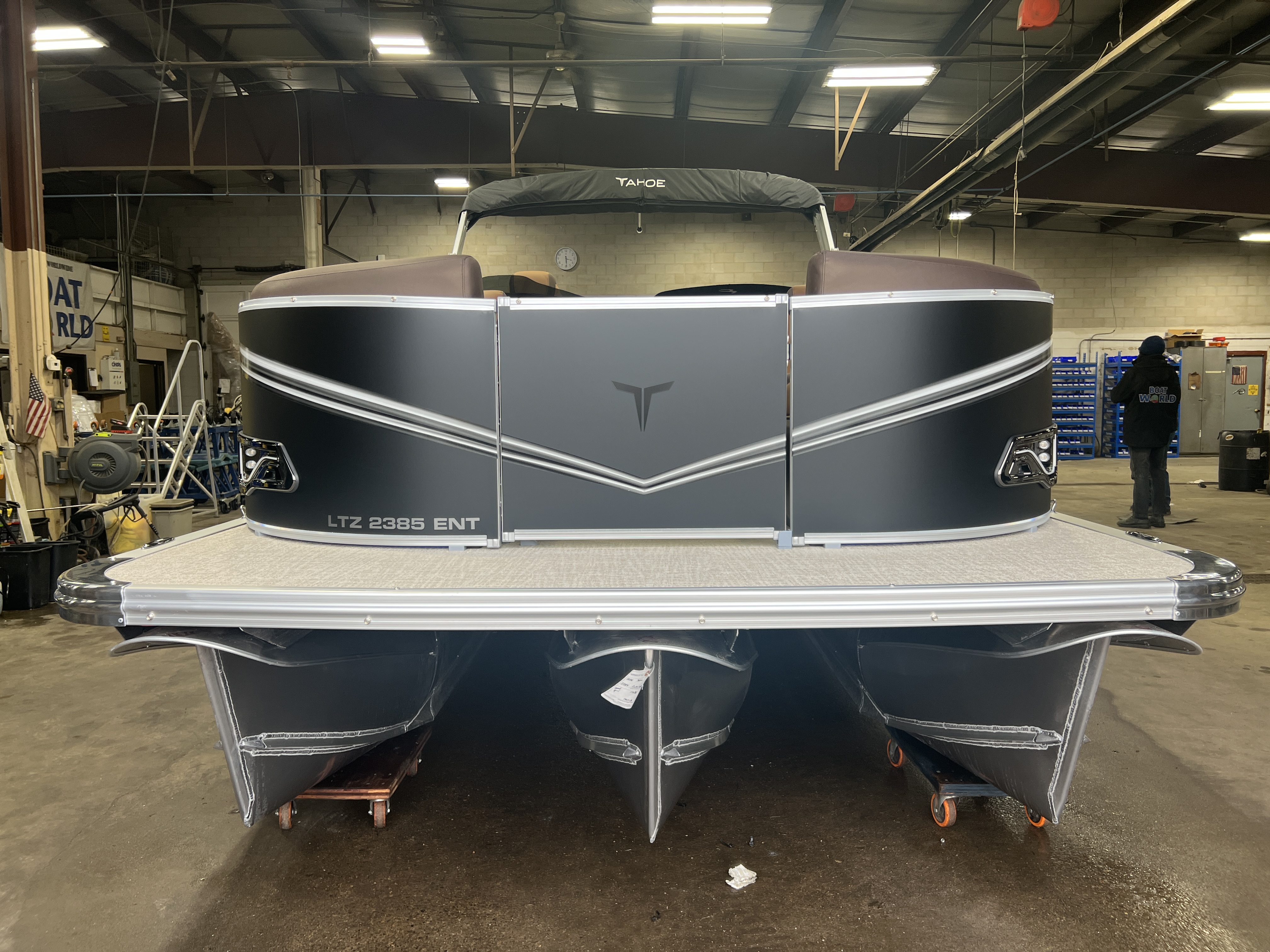 2026 Tahoe LTZ 2385 Entertainer Swingback Tritoon & Honda 4-Stroke EFI. This 23' Matte Black Walls Pontoon Has Front Chaise Lounge Seating With Storage, Admiral High Back Reclining Captain's Chair, Flip Flop Seat w/Table, Seating That Turns Into A Bed Or Front/Rear Facing Bench Seating, Rear Swim Deck, Cognac Vinyl Interior Package w/Brushed Bronze Cladding, Riptide Vinyl Flooring, LTZ Platinum Package (Ultra Fine Vinyl Upgrade, Garmin 52CV GPS Depth Finder, Stainless Steel Pull-Up Cleats, LED Smoked Chrome Docking Lights, Polished Corner Caps, Vent Covers For Cladding, Platinum Edition Special Badging) Fusion Bluetooth Radio w/6 Speakers, Blue Ice Package (Interior Mood Lighting, Lighted Cup Holders & Speakers), Hydraulic Steering, Underneath Sheeting, Lifting Strakes, 38 Gallon Gas Tank, Multiple Cup Holders, 25" Tubes, Ski Tow Bar w/Chains, 10' Bimini Top, Gated Aft, Cognac Interior Package, Bow & Aft USB Charging Ports, Lillipad Easy Step Ladder, Side Storage Behind Captain's Seat, Front Deck, Mooring Cover. Rated For 12 People.