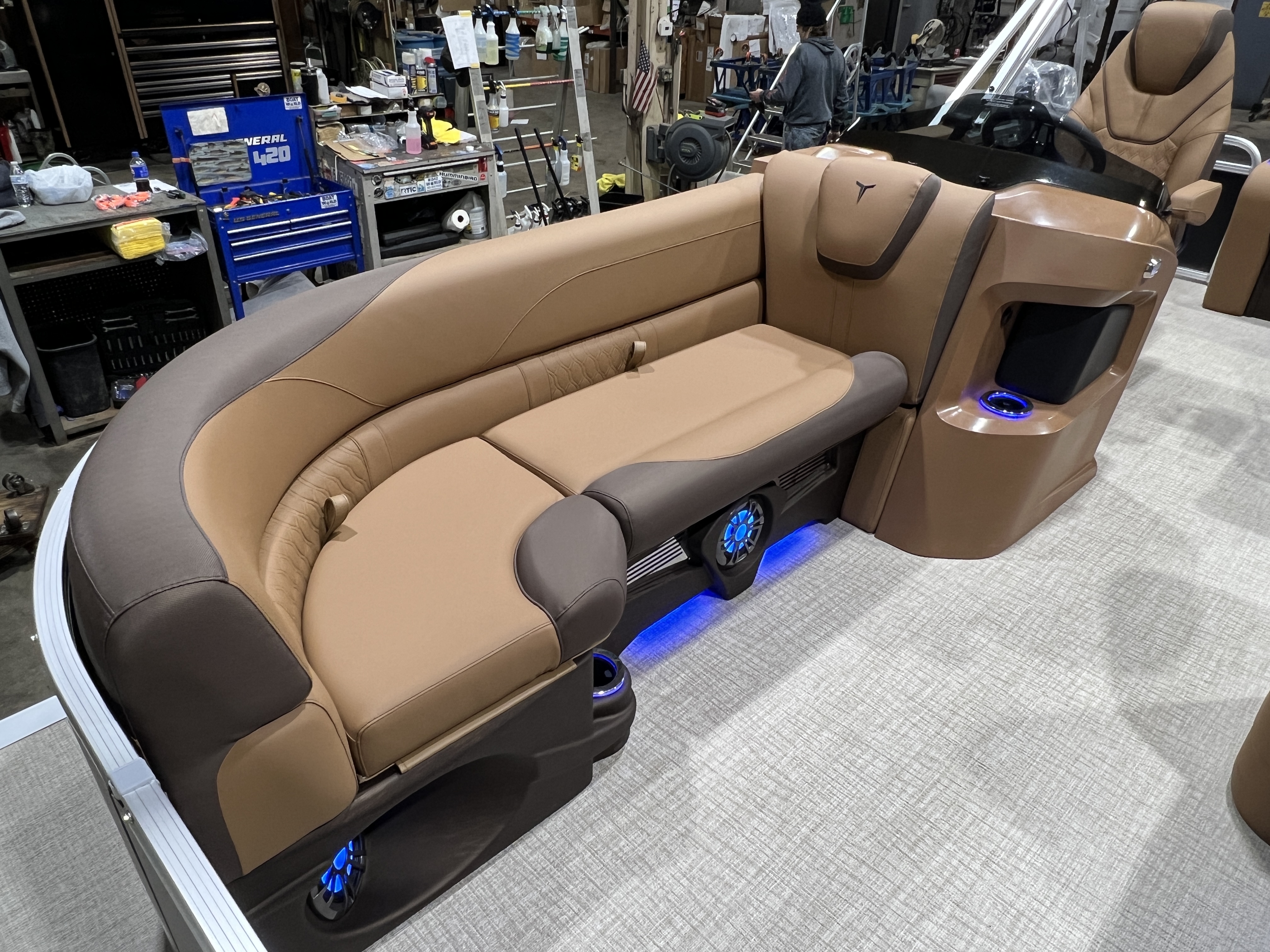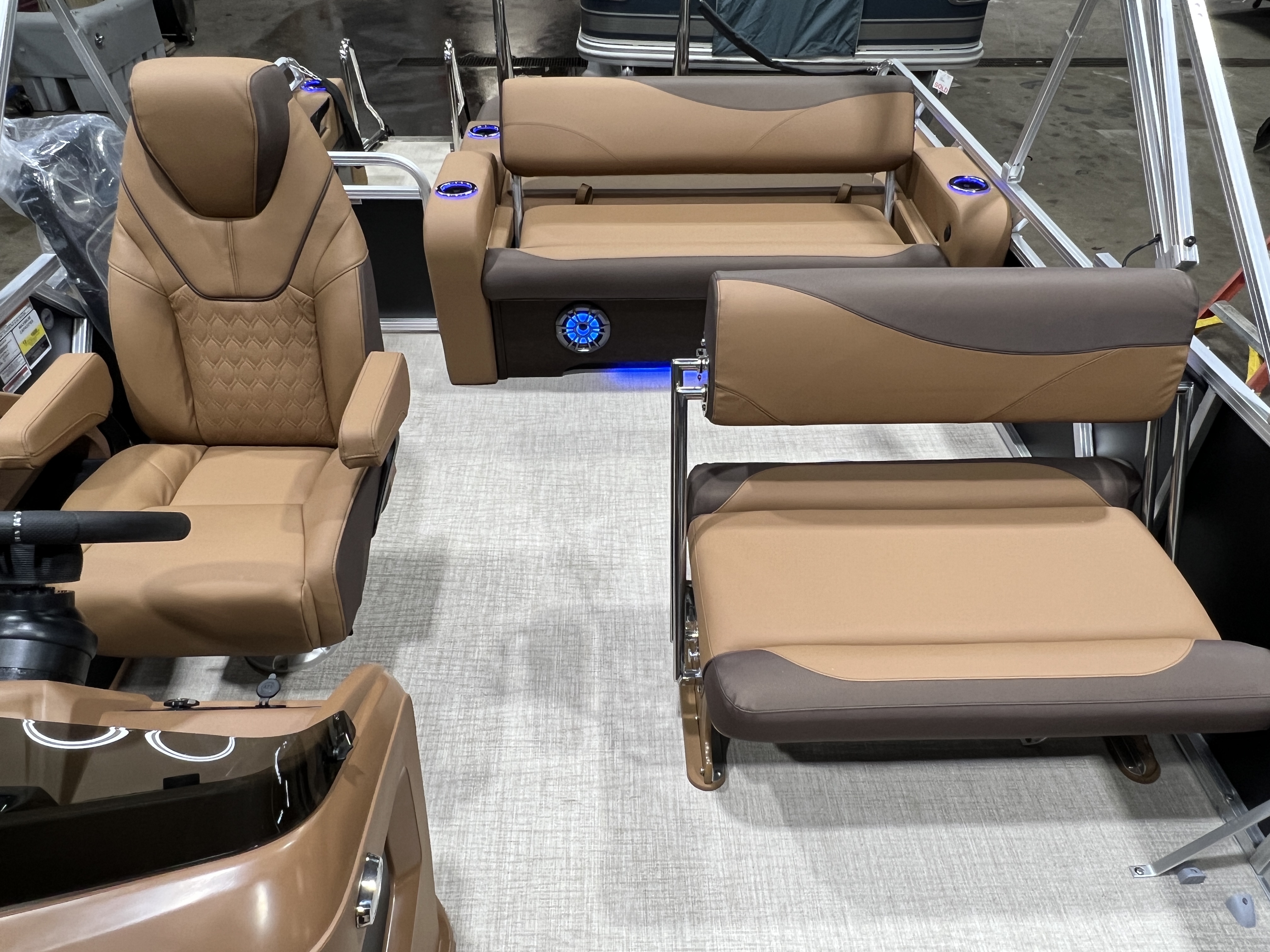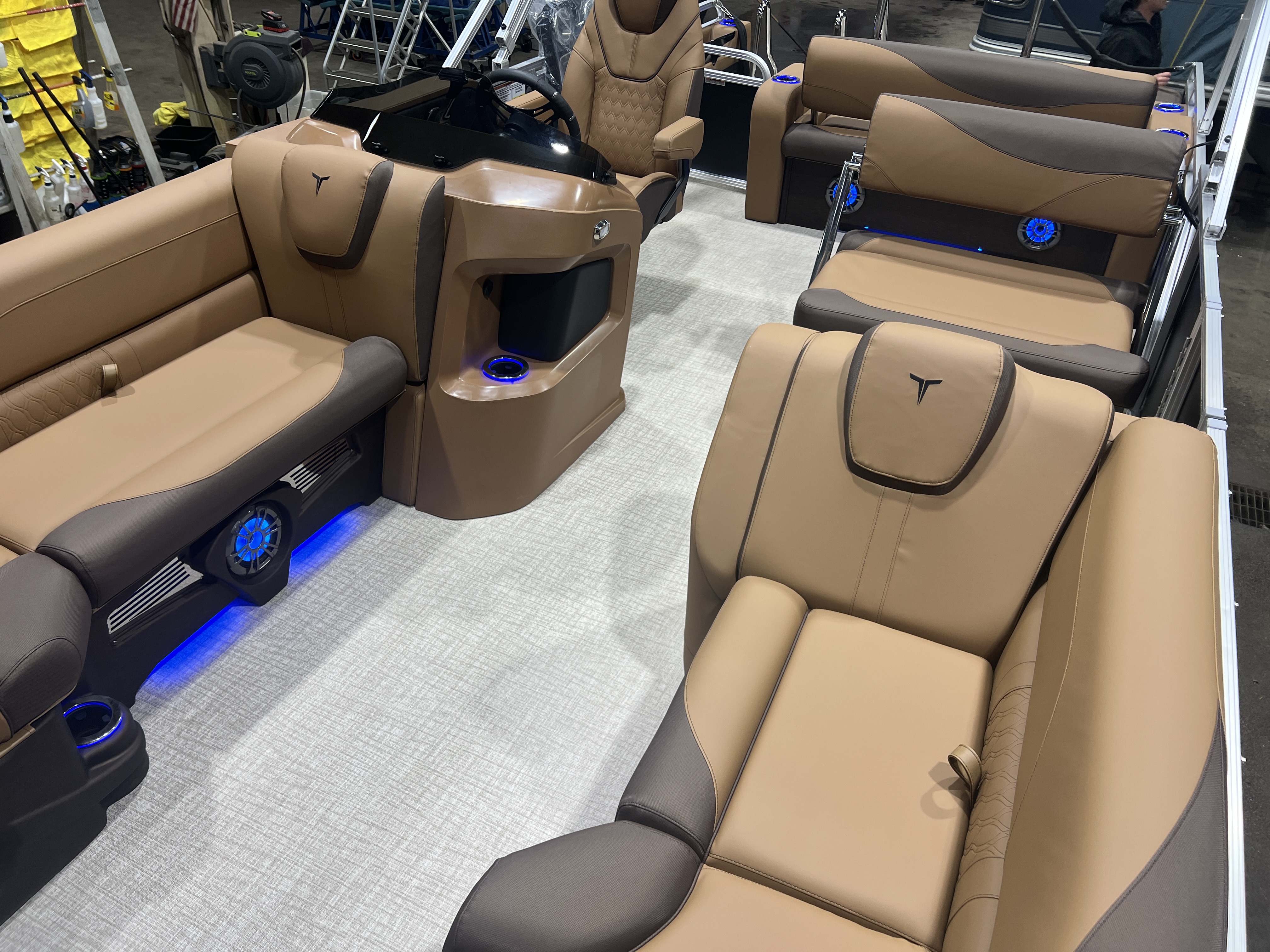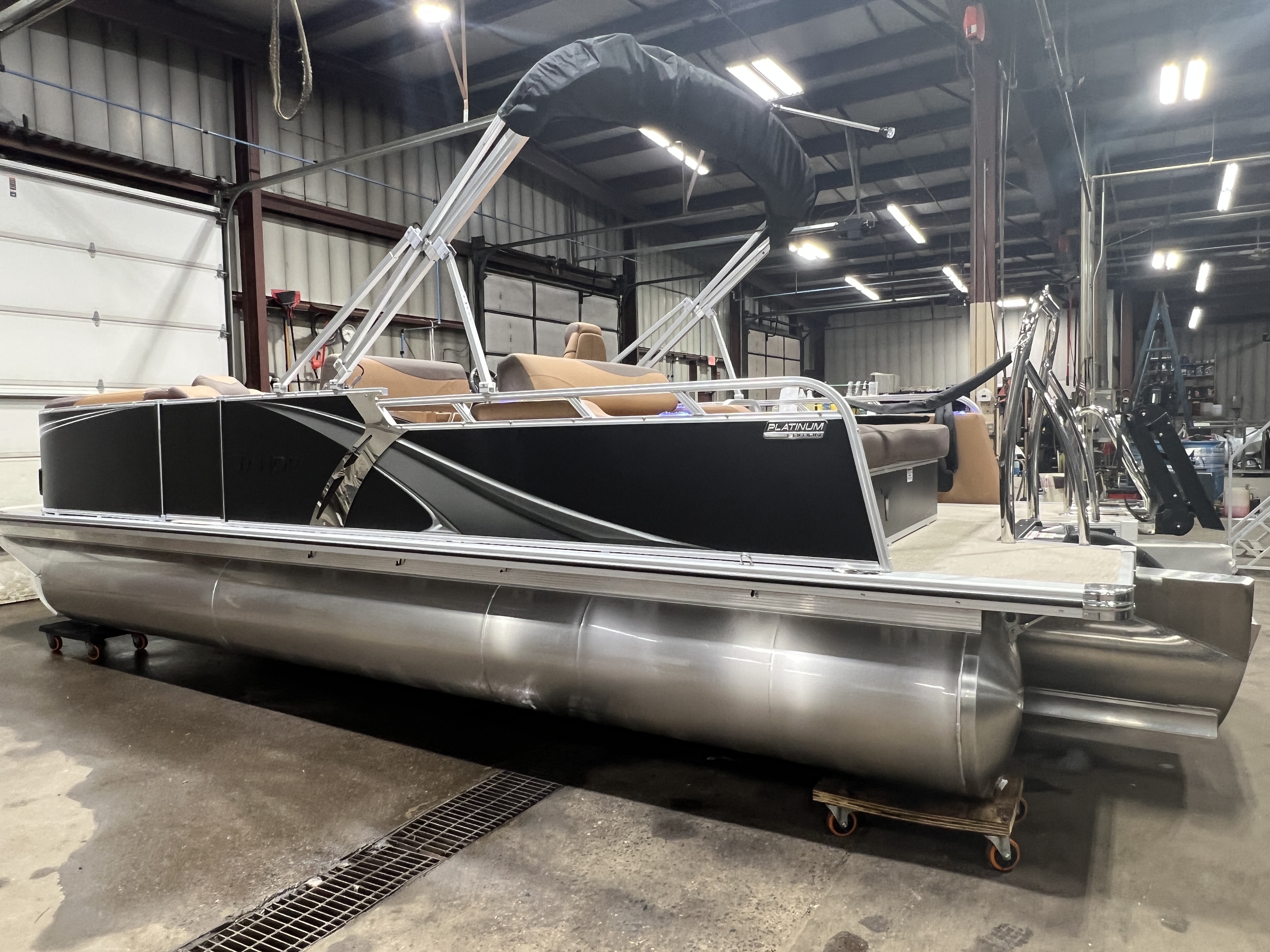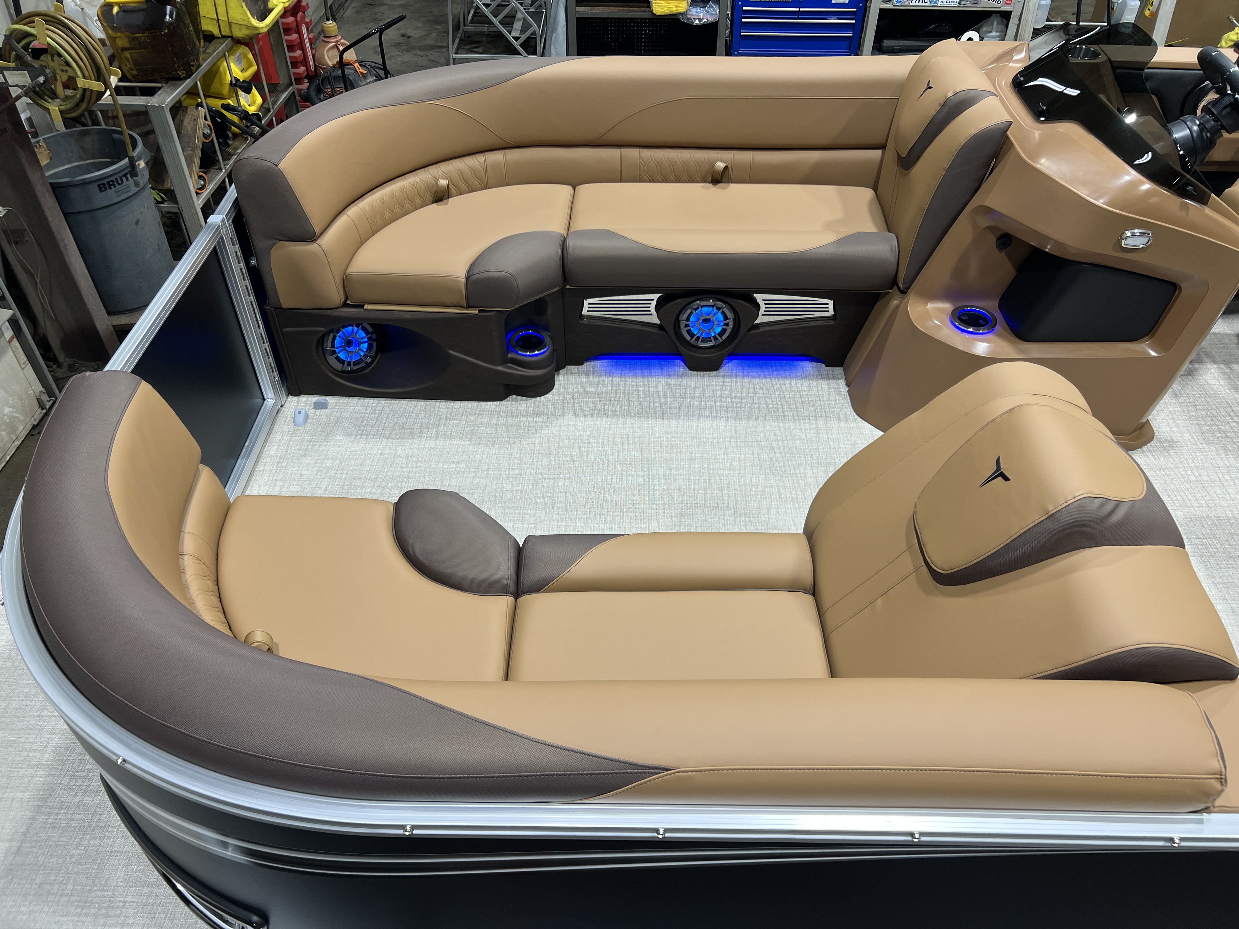 2026 Tahoe LTZ 2385 Entertainer Swingback Tritoon & Honda 4-Stroke EFI. This 23' Matte Black Walls Pontoon Has Front Chaise Lounge Seating With Storage, Admiral High Back Reclining Captain's Chair, Flip Flop Seat w/Table, Seating That Turns Into A Bed Or Front/Rear Facing Bench Seating, Rear Swim Deck, Cognac Vinyl Interior Package w/Brushed Bronze Cladding, Riptide Vinyl Flooring, LTZ Platinum Package (Ultra Fine Vinyl Upgrade, Garmin 52CV GPS Depth Finder, Stainless Steel Pull-Up Cleats, LED Smoked Chrome Docking Lights, Polished Corner Caps, Vent Covers For Cladding, Platinum Edition Special Badging) Fusion Bluetooth Radio w/6 Speakers, Blue Ice Package (Interior Mood Lighting, Lighted Cup Holders & Speakers), Hydraulic Steering, Underneath Sheeting, Lifting Strakes, 38 Gallon Gas Tank, Multiple Cup Holders, 25" Tubes, Ski Tow Bar w/Chains, 10' Bimini Top, Gated Aft, Cognac Interior Package, Bow & Aft USB Charging Ports, Lillipad Easy Step Ladder, Side Storage Behind Captain's Seat, Front Deck, Mooring Cover. Rated For 12 People.