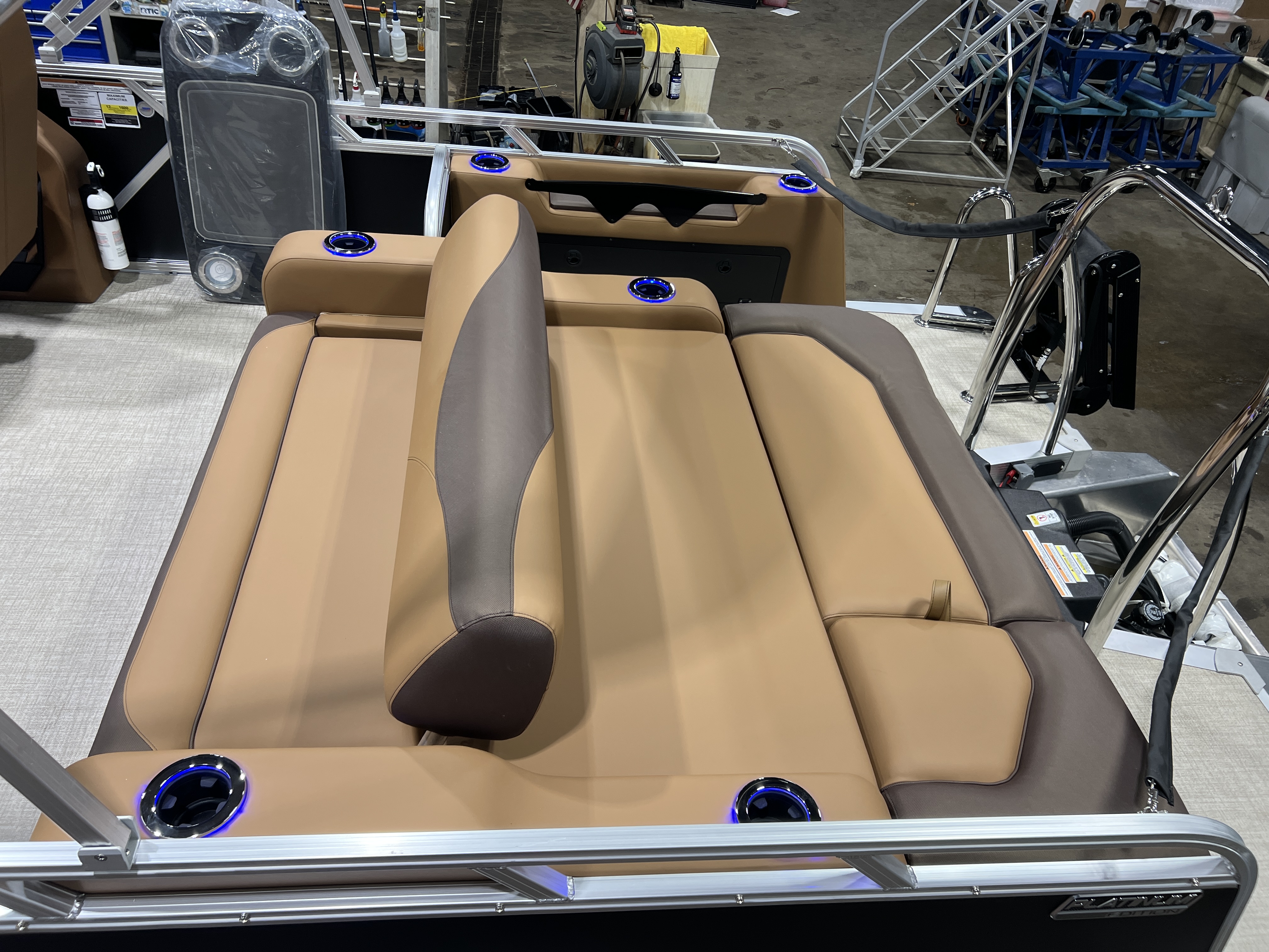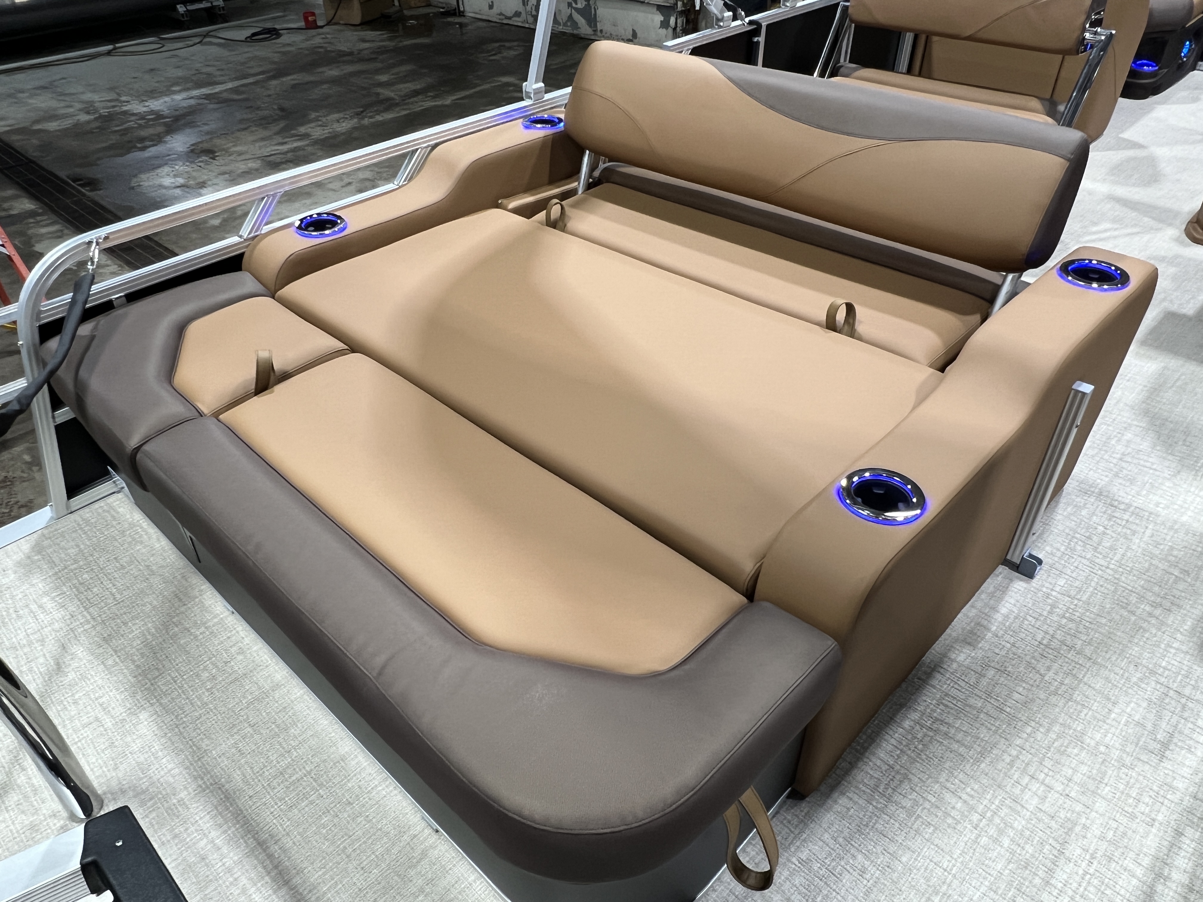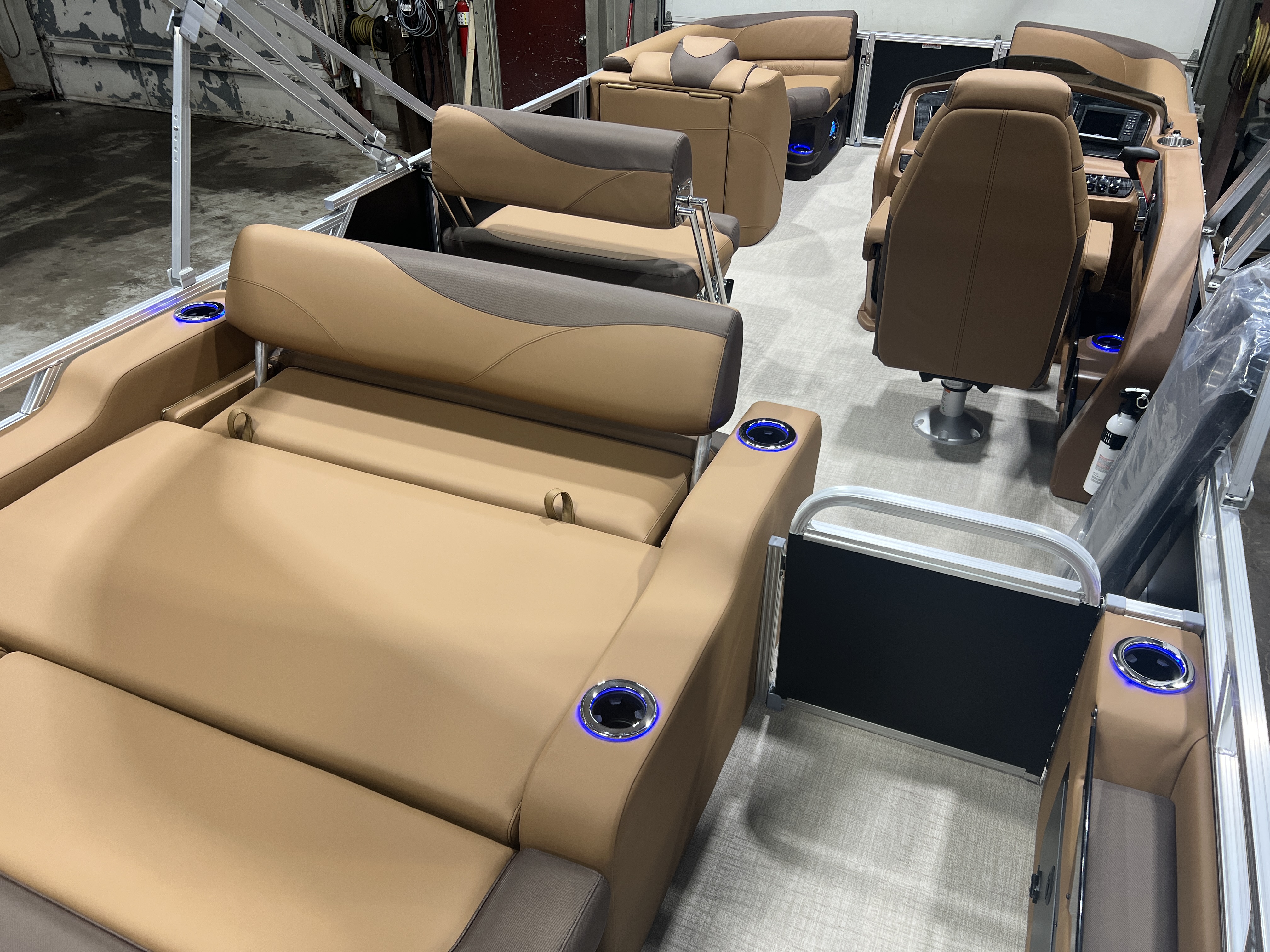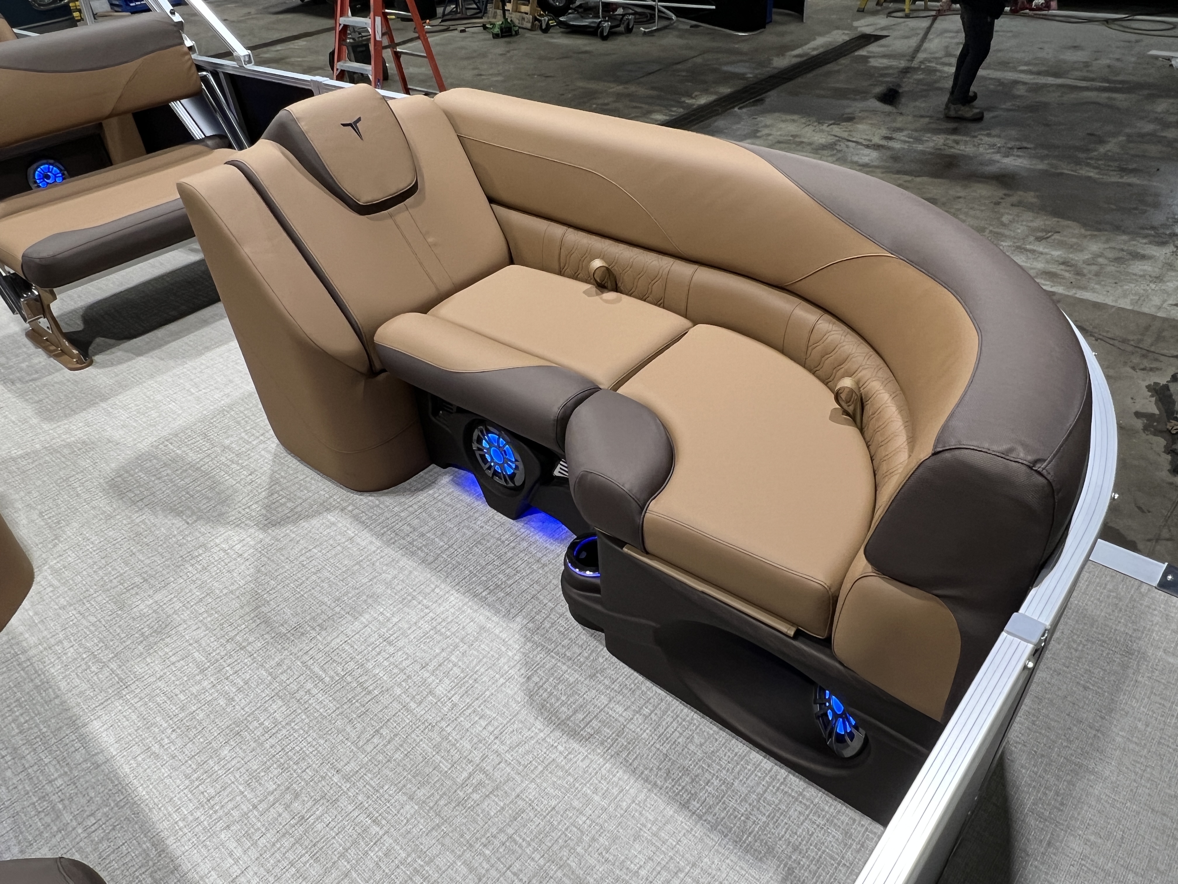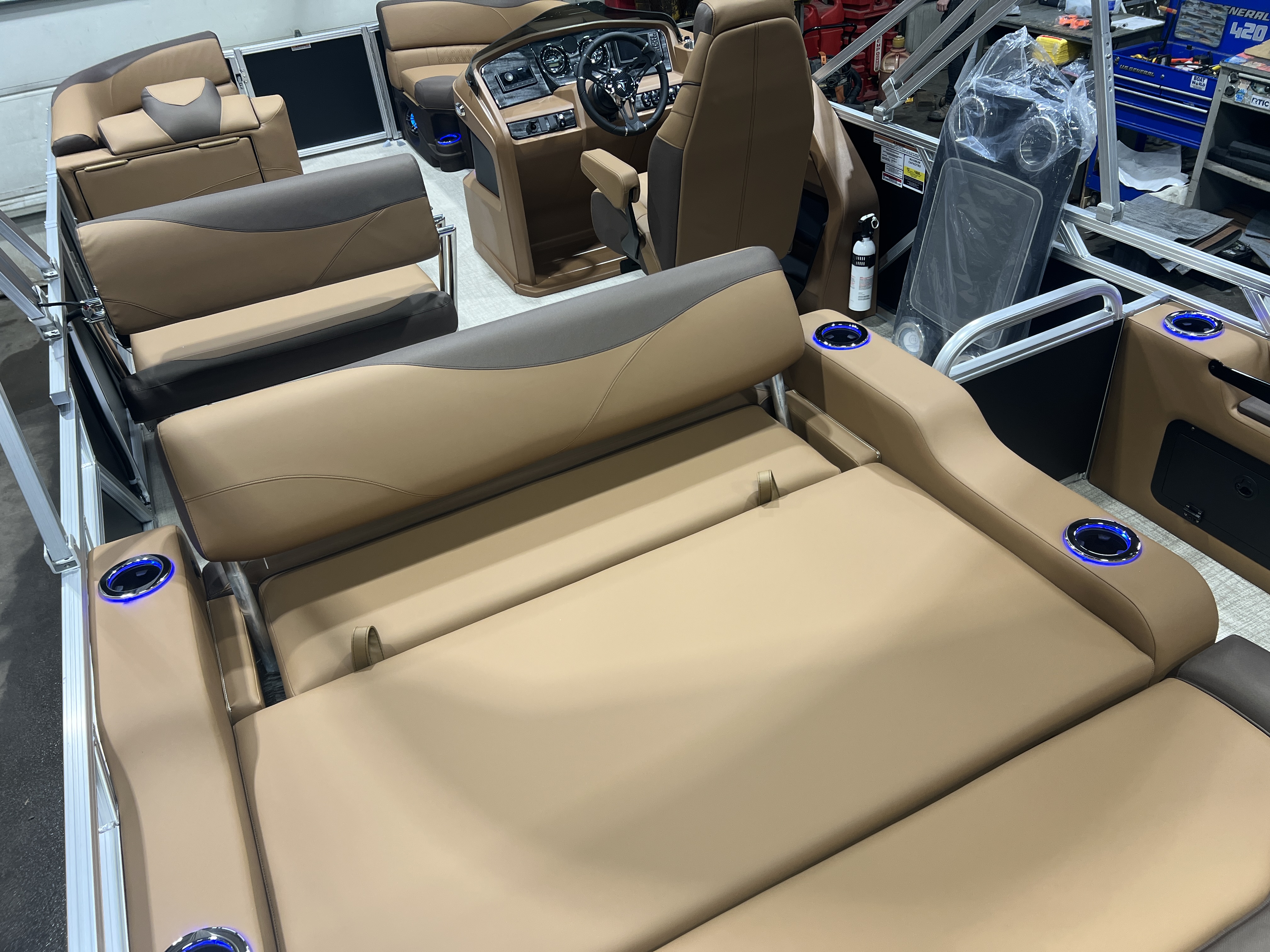 2026 Tahoe LTZ 2385 Entertainer Swingback Tritoon & Honda 4-Stroke EFI. This 23' Matte Black Walls Pontoon Has Front Chaise Lounge Seating With Storage, Admiral High Back Reclining Captain's Chair, Flip Flop Seat w/Table, Seating That Turns Into A Bed Or Front/Rear Facing Bench Seating, Rear Swim Deck, Cognac Vinyl Interior Package w/Brushed Bronze Cladding, Riptide Vinyl Flooring, LTZ Platinum Package (Ultra Fine Vinyl Upgrade, Garmin 52CV GPS Depth Finder, Stainless Steel Pull-Up Cleats, LED Smoked Chrome Docking Lights, Polished Corner Caps, Vent Covers For Cladding, Platinum Edition Special Badging) Fusion Bluetooth Radio w/6 Speakers, Blue Ice Package (Interior Mood Lighting, Lighted Cup Holders & Speakers), Hydraulic Steering, Underneath Sheeting, Lifting Strakes, 38 Gallon Gas Tank, Multiple Cup Holders, 25" Tubes, Ski Tow Bar w/Chains, 10' Bimini Top, Gated Aft, Cognac Interior Package, Bow & Aft USB Charging Ports, Lillipad Easy Step Ladder, Side Storage Behind Captain's Seat, Front Deck, Mooring Cover. Rated For 12 People.