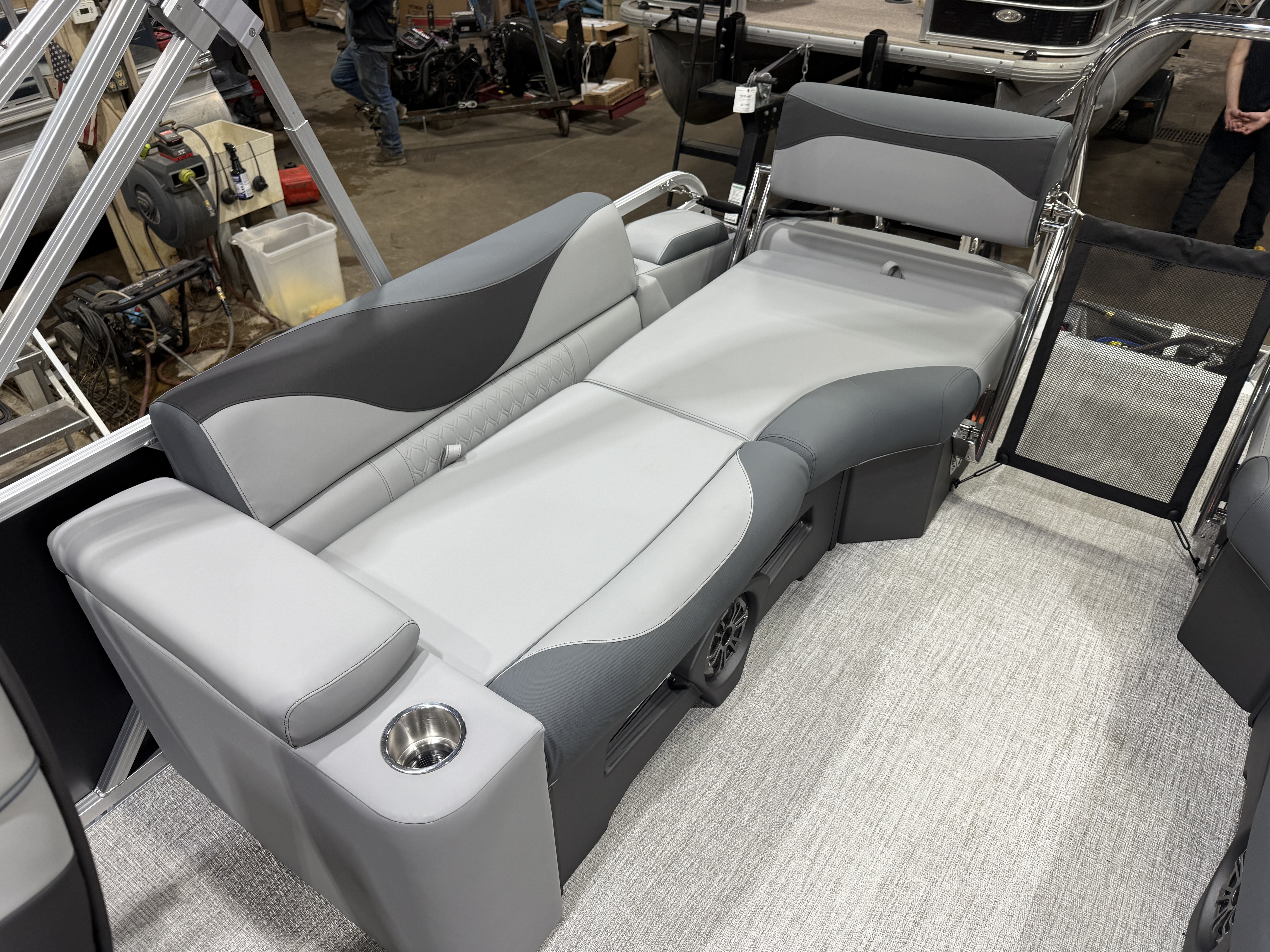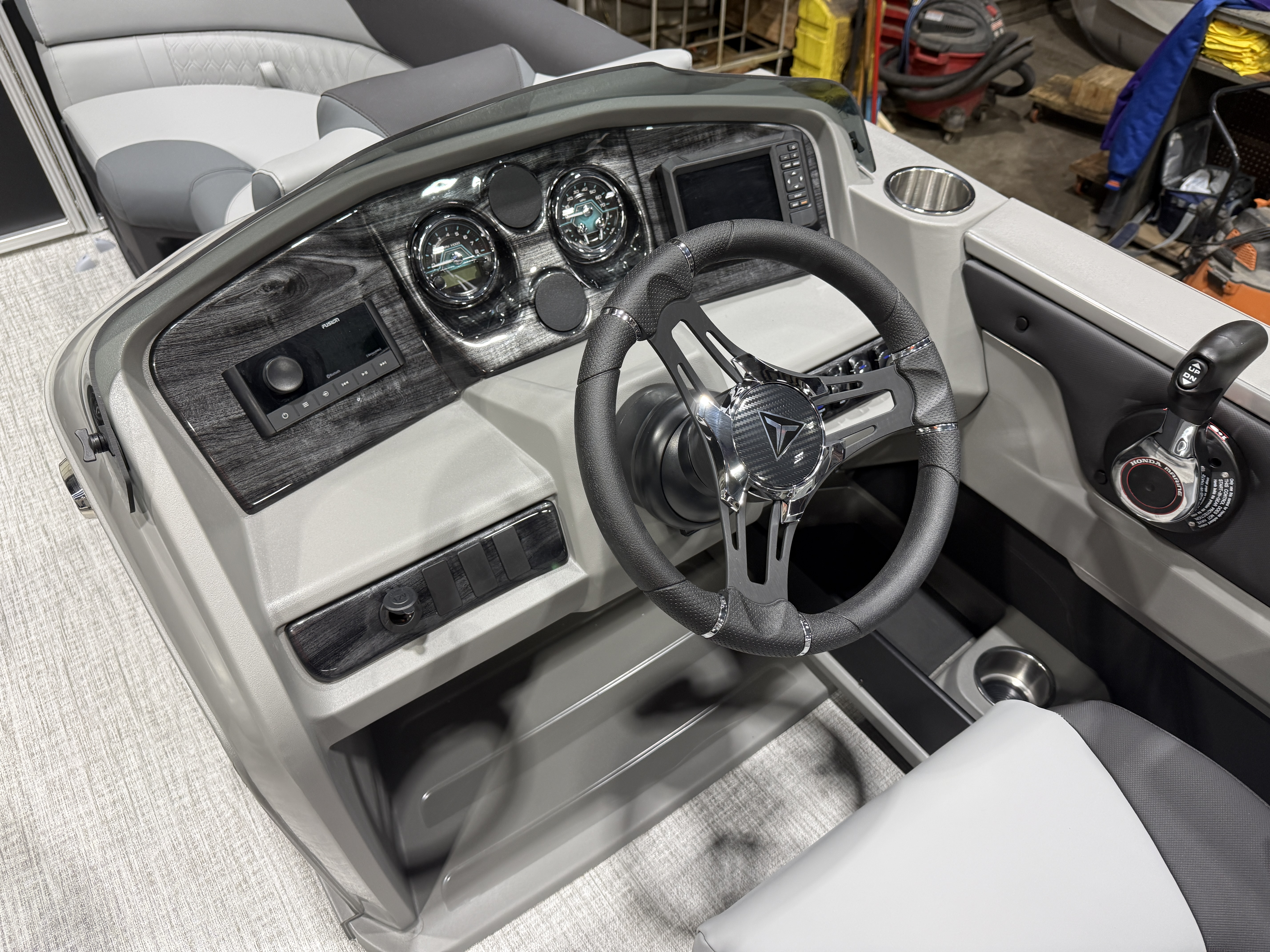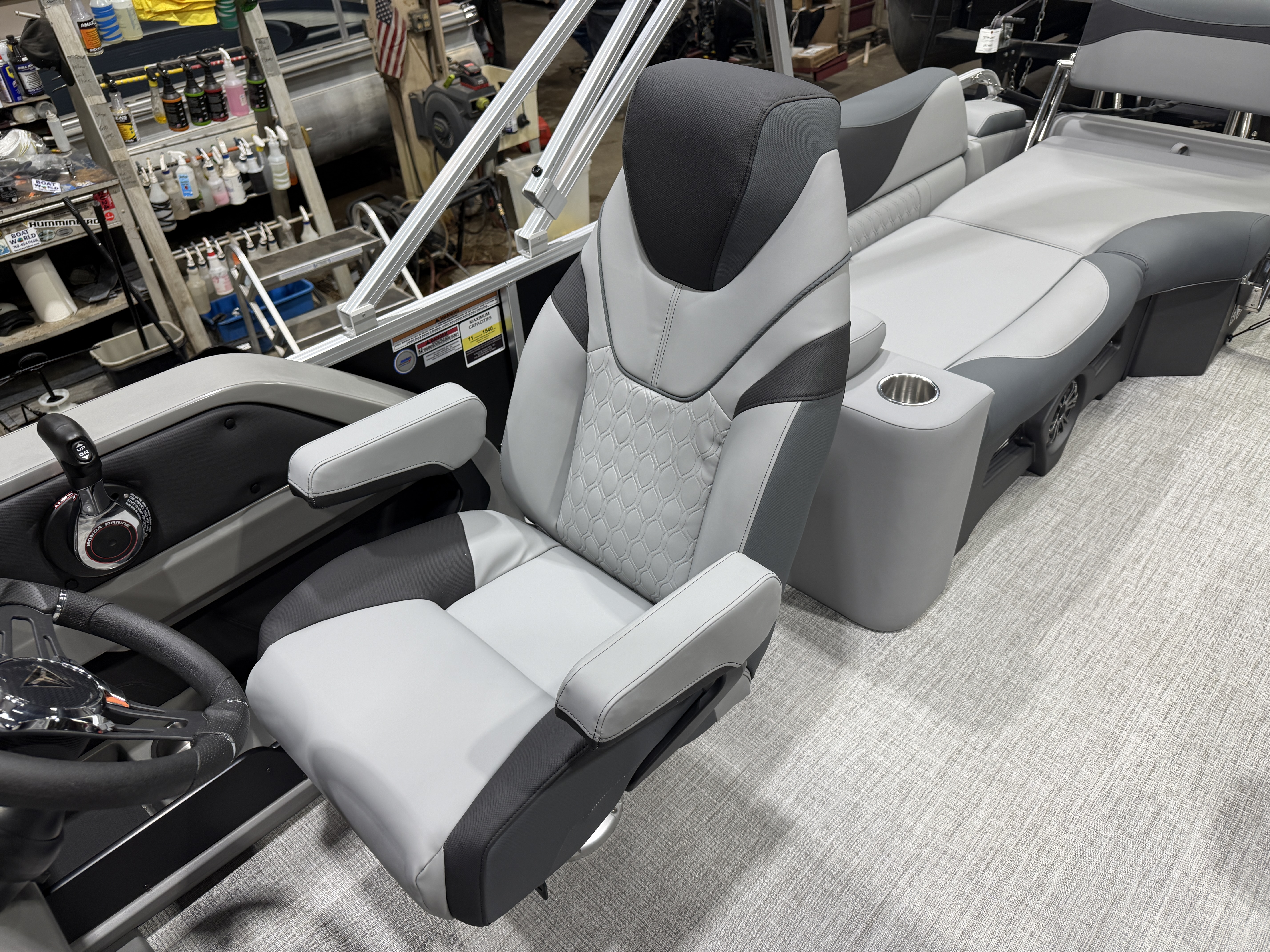 2026 Tahoe LTZ 2385 Quad Lounge Shift SS Pontoon & Honda 4-Stroke EFI. This Luxury Matte Black Walls Quad Lounger Pontoon Has 2 Chaise Lounge Seating Up Front With Storage, Side By Side Admiral High Back Reclining Captain's Chairs, Rear Facing Flip Bench Seating With Storage, Riptide Vinyl Floor, Tilt Steering, Built-In 25 Gallon Gas Tank, LTZ Platinum Package (Ultra Fine Touch Vinyl Upgrade, Garmin 52CV GPS Depth Finder, Pull-Up Cleats, LED Smoked Chrome Docking Lights, Polished Corner Caps, Vent Covers For Cladding, Platinum Edition Special Badging), LED Nav Lights, Gauge Package With Hour Meter, Bluetooth Fusion Radio With 6 Speakers & Amp, Bow USB Charging Port, Lillipad Easy Step Ladder, Table, Lifetime Aluminum Seat Frames, Mooring Cover, Multiple Cup Holders, Ski Tow Bar w/Safety Chains, Mesh Rear Gate, Graphite Interior Package w/Kool Fab Black Vinyl & Charcoal Accent, Battery On/Off Switch, Adjustable 10' Bimini Top, 25" Tubes, Smoked Chrome Logos, New Battery, Front And Rear Sun Deck. Rated For 11 People.