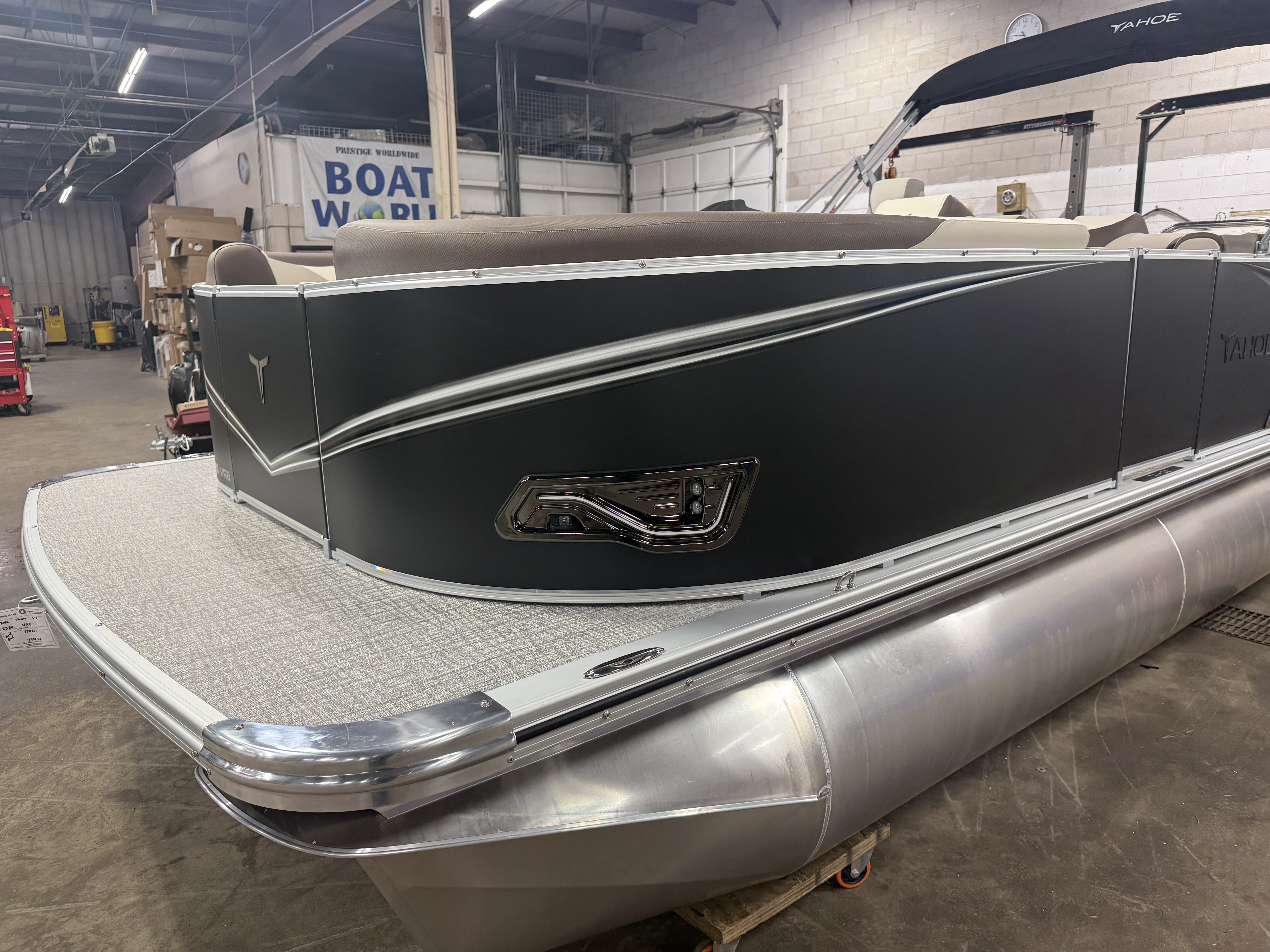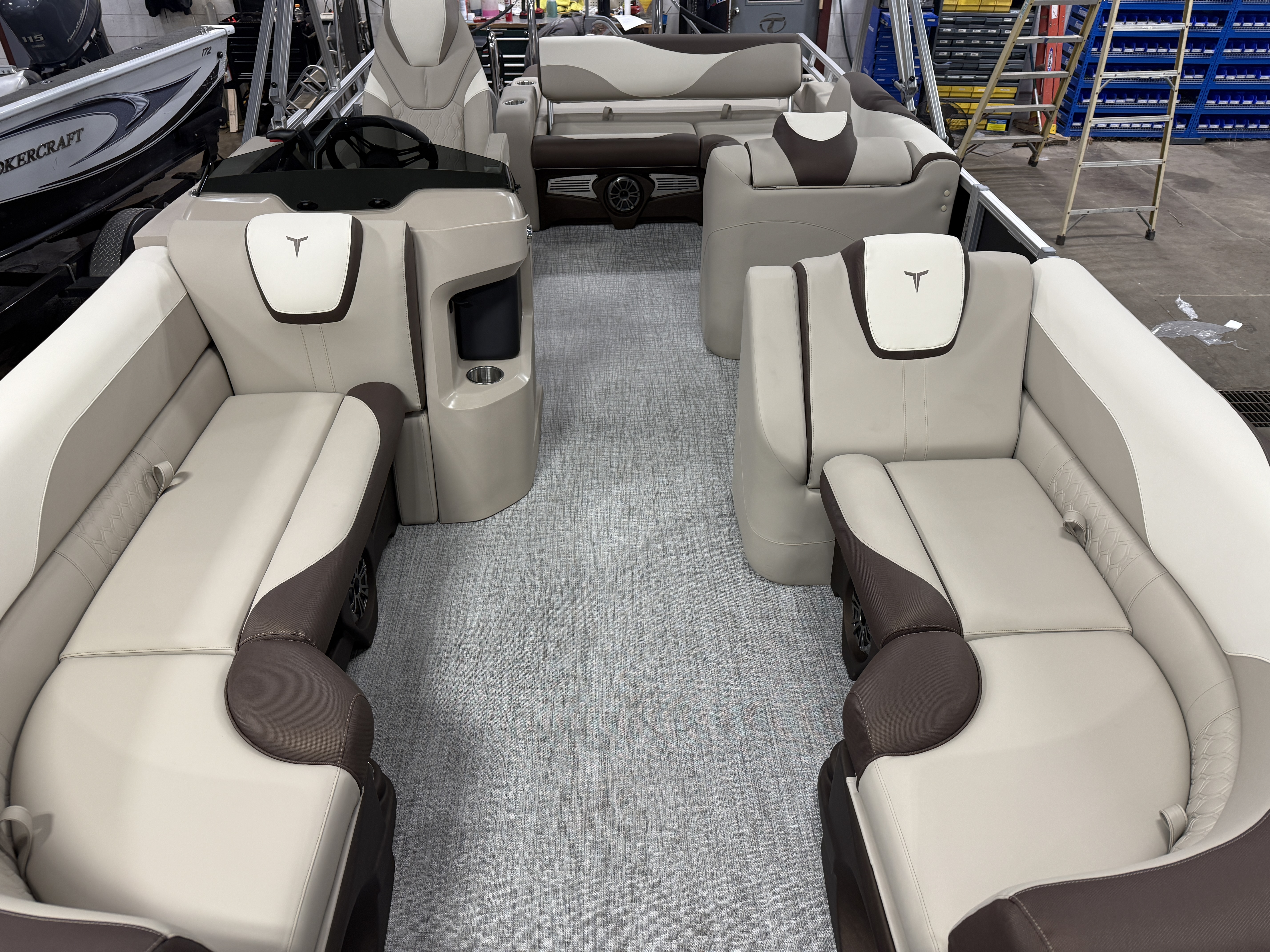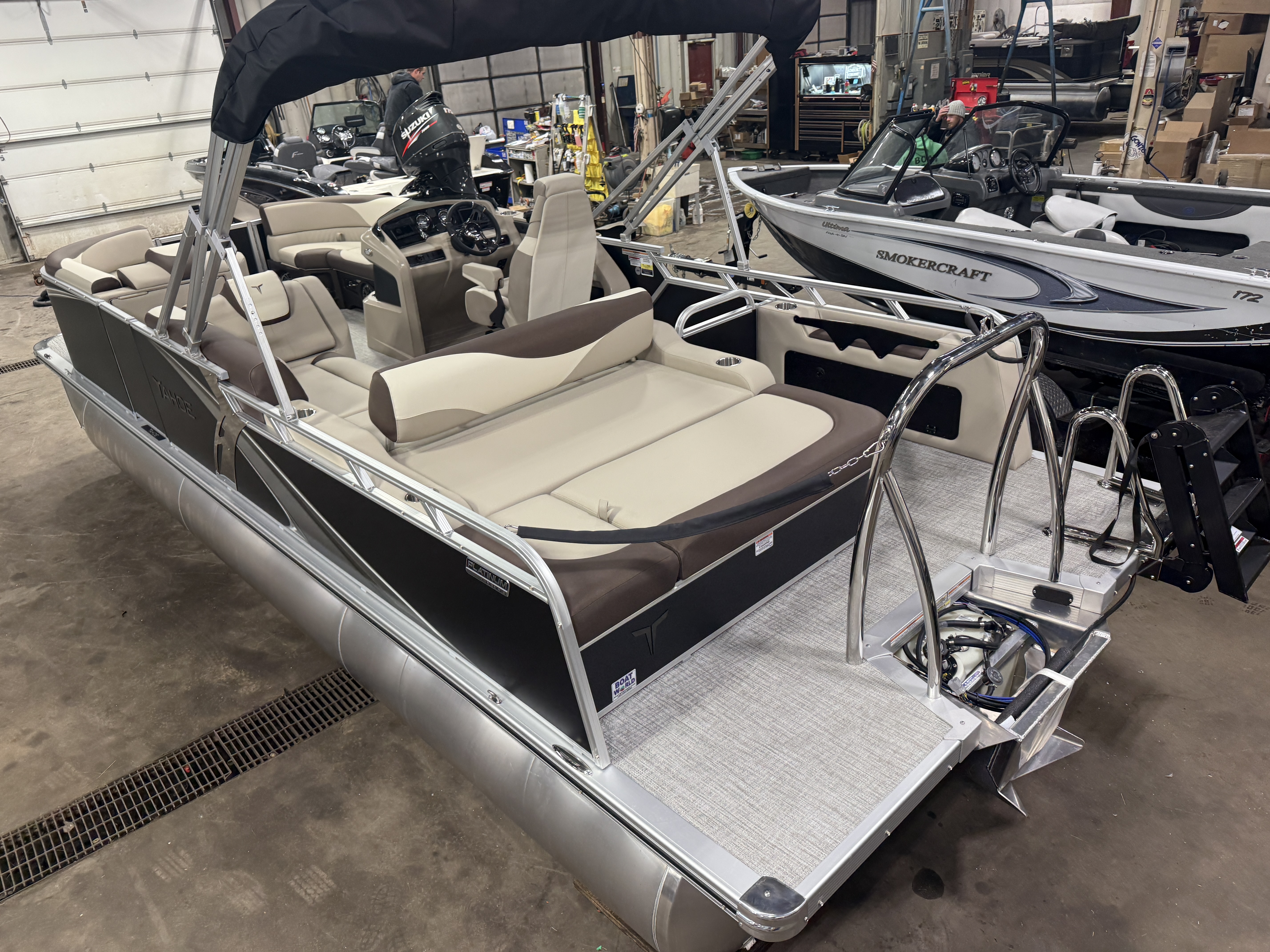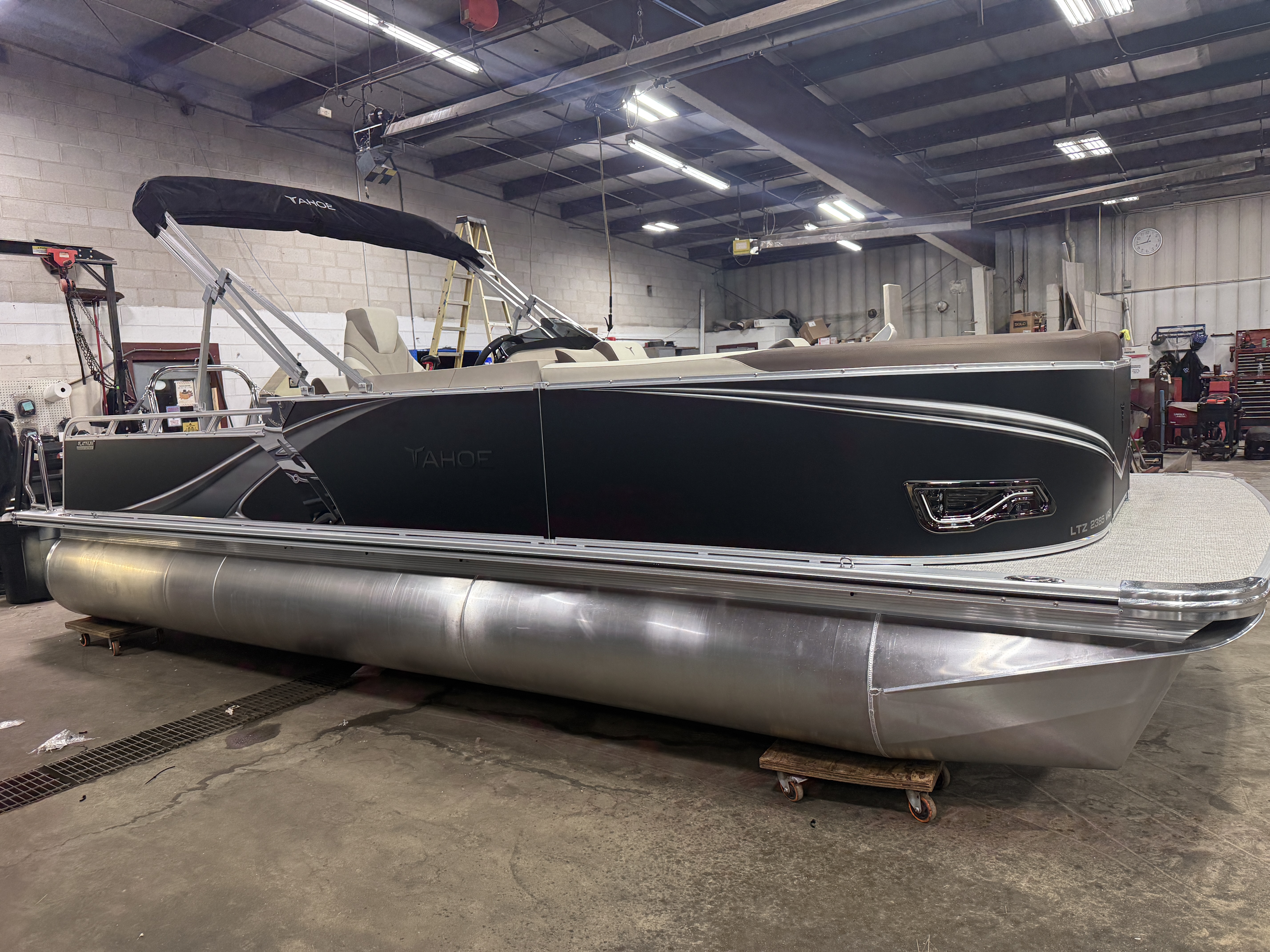 2026 Tahoe LTZ 2385 Versatile Rear Bench (VRB) Swingback Pontoon & Honda 4-Stroke EFI. This 23' Steel Blue Walls Pontoon Has Front Chaise Lounge Seating With Storage, Wrap Around Seating With Storage, Admiral Reclining Captain's Chair, Seating That Turns Into A Bed Or Rear Facing Bench Seating, Rear Swim Deck, Riptide Vinyl Flooring, LTZ Platinum Package (Ultrafine Touch Vinyl Upgrade, Garmin 52CV GPS Depth Finder, Pull-Up Cleats, LED Smoked Chrome Docking Lights, Vent Covers For Cladding, Platinum Edition Special Badging) Table, Bluetooth Radio w/6 Speakers, Multiple Cup Holders, 25" Tubes, 10' Bimini Top, Gated Aft, Buckskin Interior Package w/Expresso Accent, Brushed Bronze Seat Cladding, Built In 25 Gallon Gas Tank, LED NAV Lights, Ski Tow Bar w/Chains, Smoked Chrome Logos, Mooring Cover, Bow & Aft USB Charging Ports, Lillipad Easy Step Ladder, Side Storage Behind Captain's Seat, On/Off Battery Switch, Front Deck. Rated For 11 People.