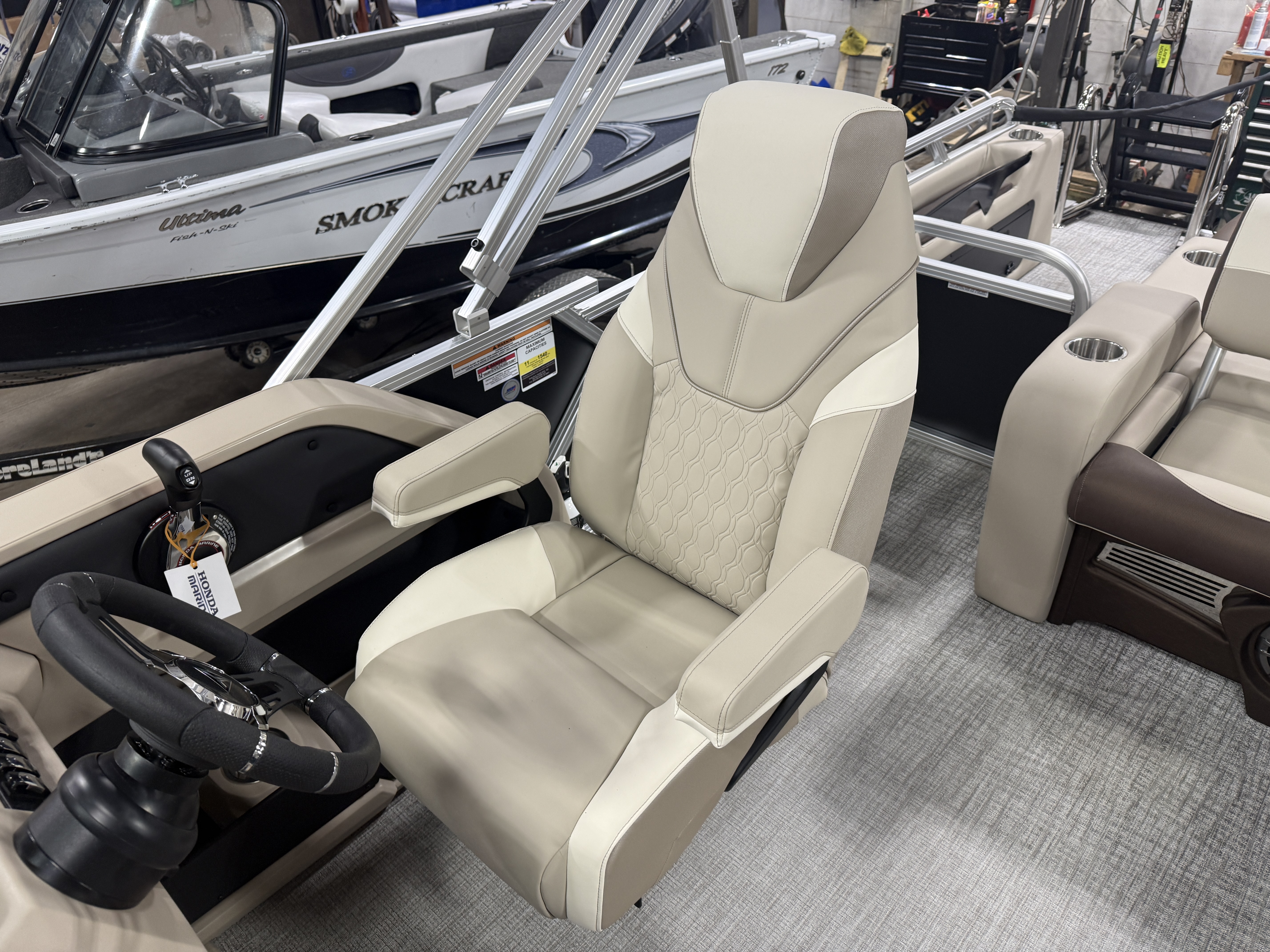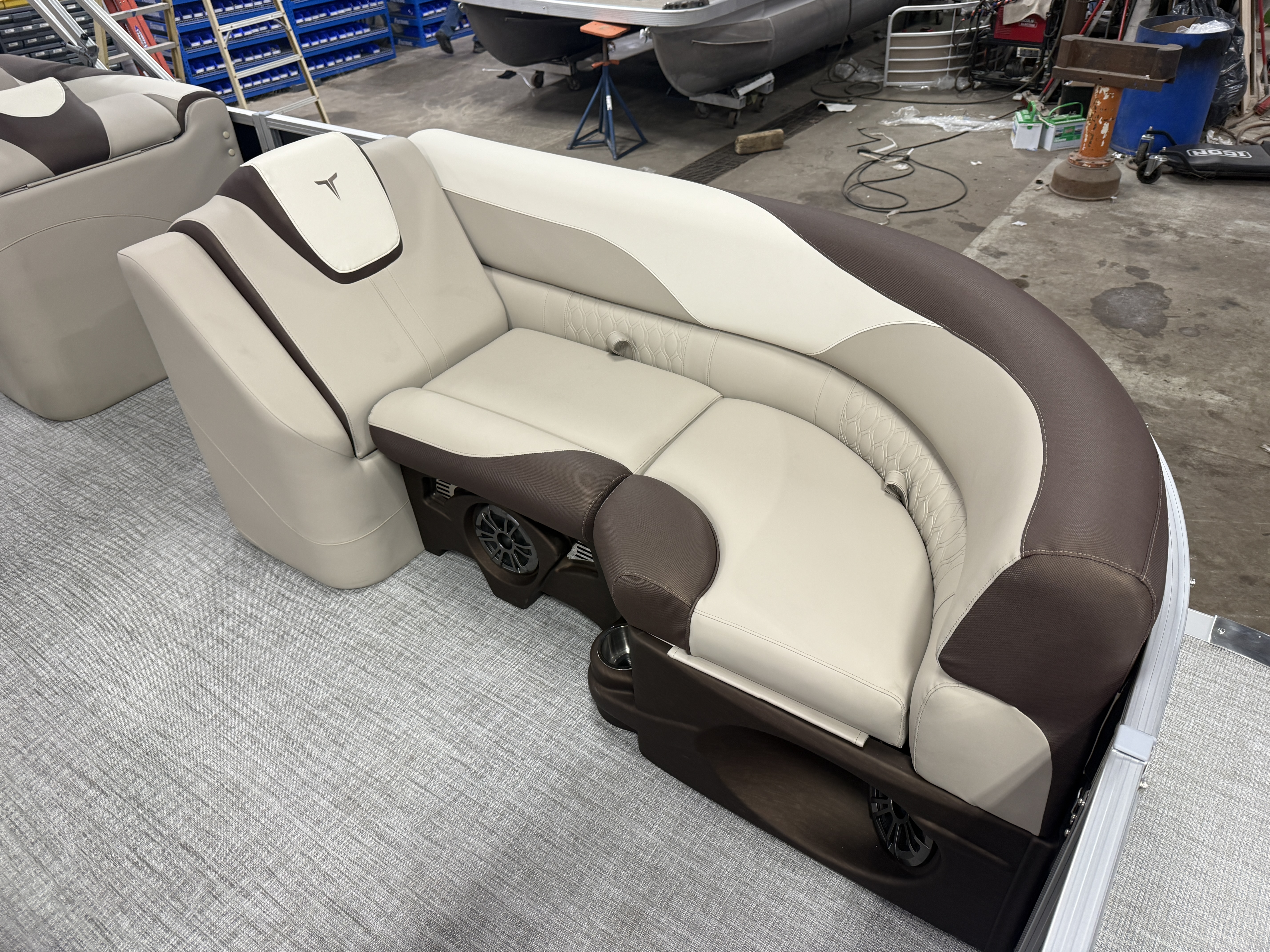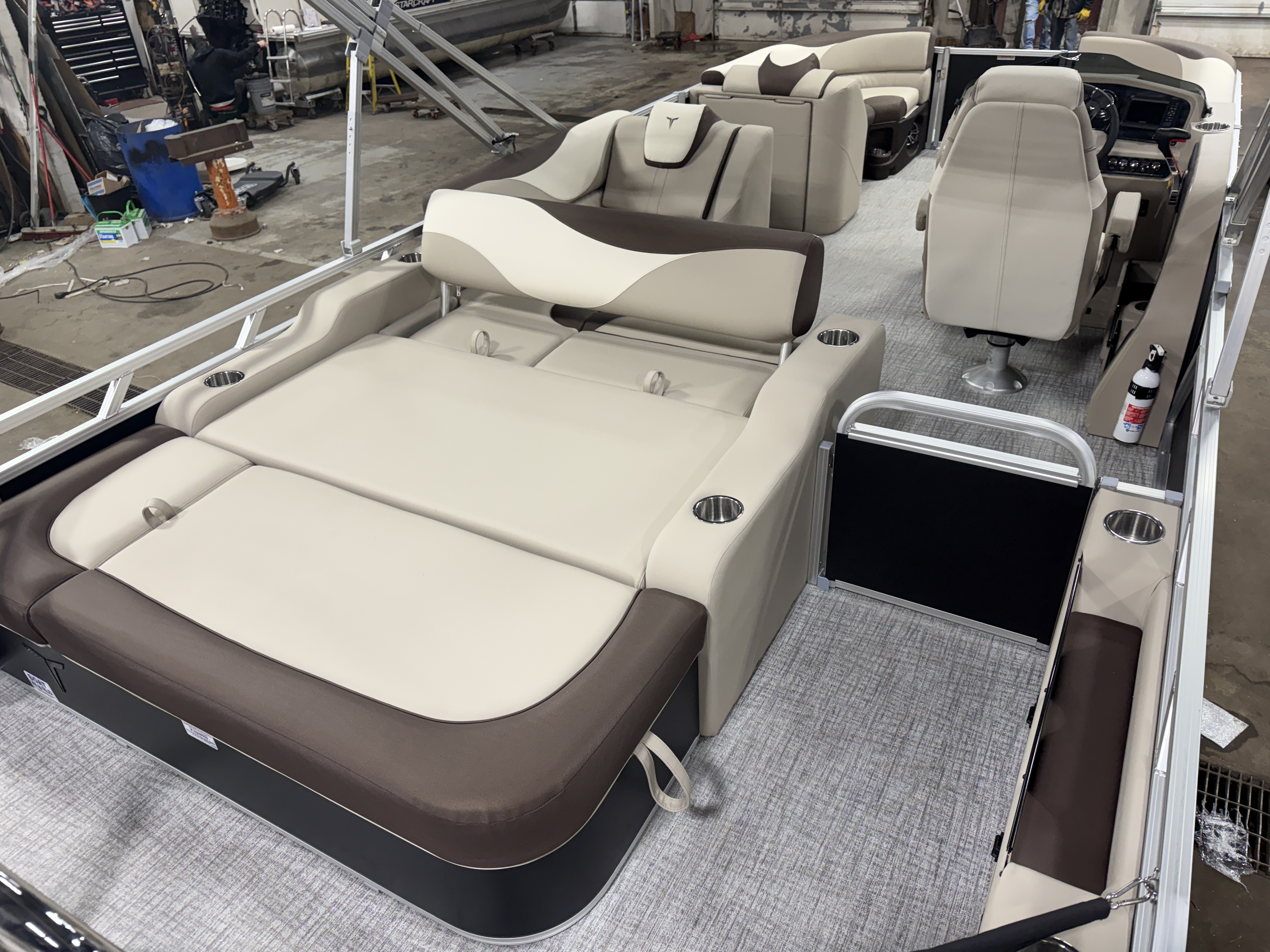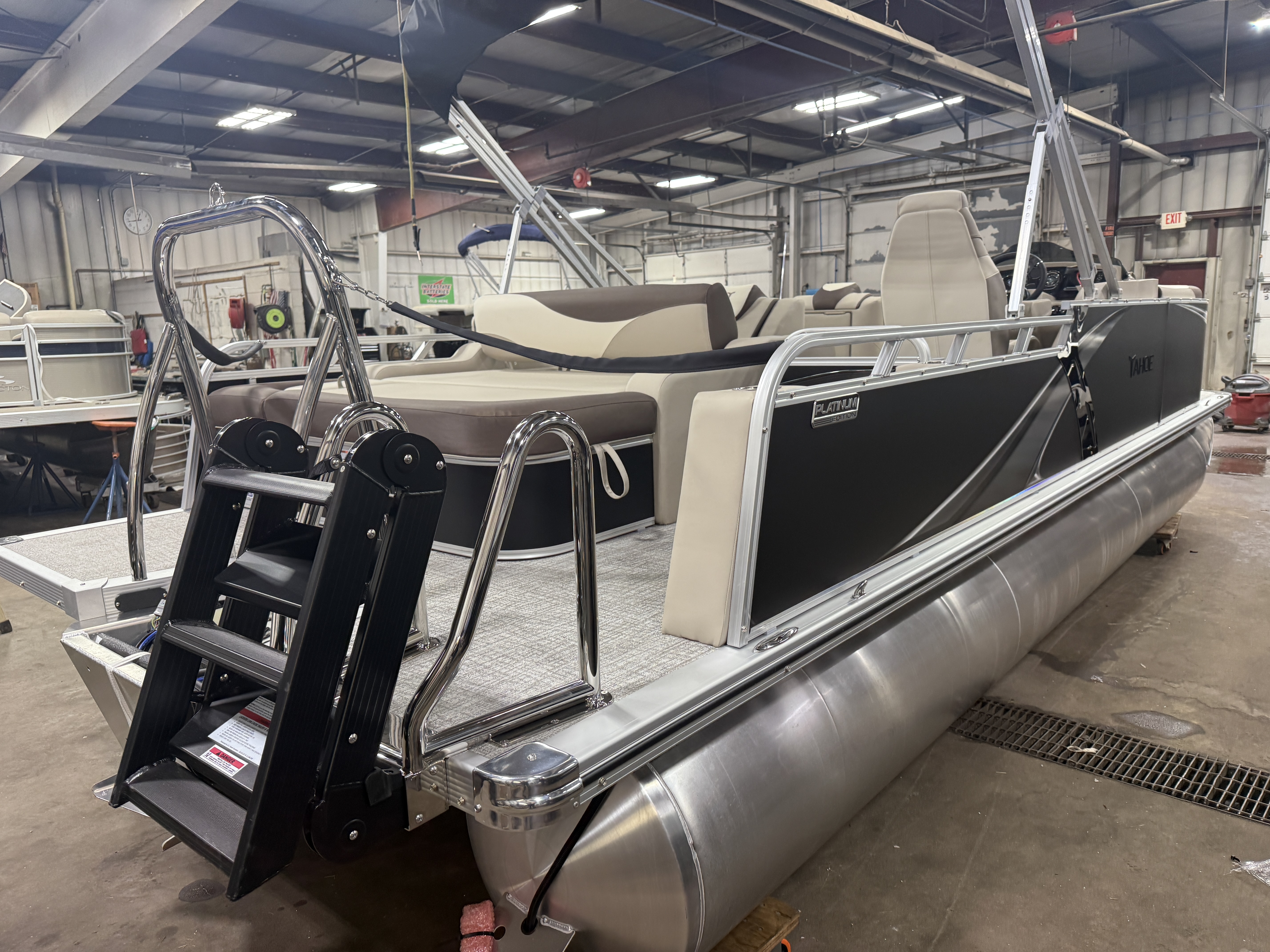 2026 Tahoe LTZ 2385 Versatile Rear Bench (VRB) Swingback Pontoon & Honda 4-Stroke EFI. This 23' Steel Blue Walls Pontoon Has Front Chaise Lounge Seating With Storage, Wrap Around Seating With Storage, Admiral Reclining Captain's Chair, Seating That Turns Into A Bed Or Rear Facing Bench Seating, Rear Swim Deck, Riptide Vinyl Flooring, LTZ Platinum Package (Ultrafine Touch Vinyl Upgrade, Garmin 52CV GPS Depth Finder, Pull-Up Cleats, LED Smoked Chrome Docking Lights, Vent Covers For Cladding, Platinum Edition Special Badging) Table, Bluetooth Radio w/6 Speakers, Multiple Cup Holders, 25" Tubes, 10' Bimini Top, Gated Aft, Buckskin Interior Package w/Expresso Accent, Brushed Bronze Seat Cladding, Built In 25 Gallon Gas Tank, LED NAV Lights, Ski Tow Bar w/Chains, Smoked Chrome Logos, Mooring Cover, Bow & Aft USB Charging Ports, Lillipad Easy Step Ladder, Side Storage Behind Captain's Seat, On/Off Battery Switch, Front Deck. Rated For 11 People.