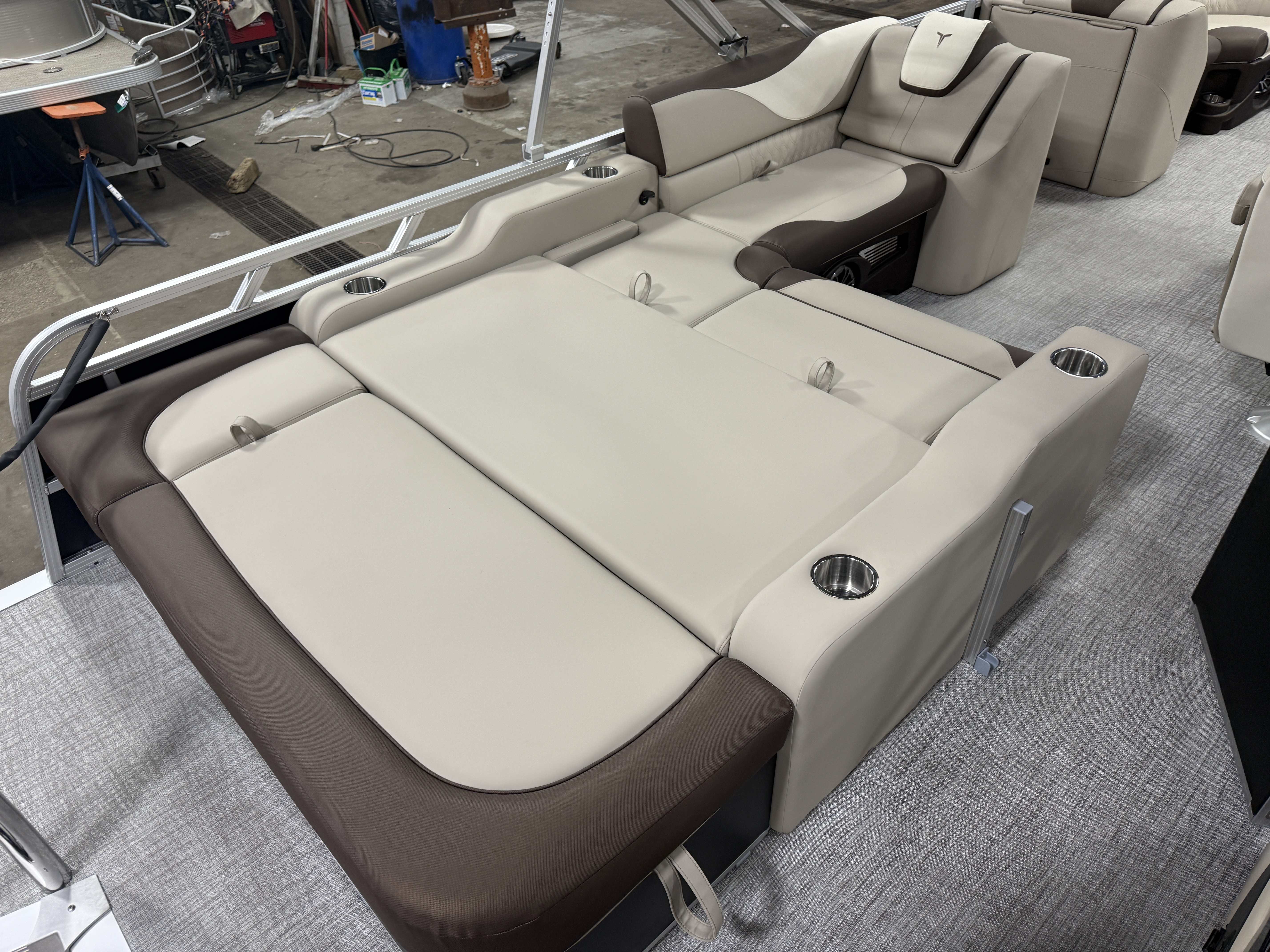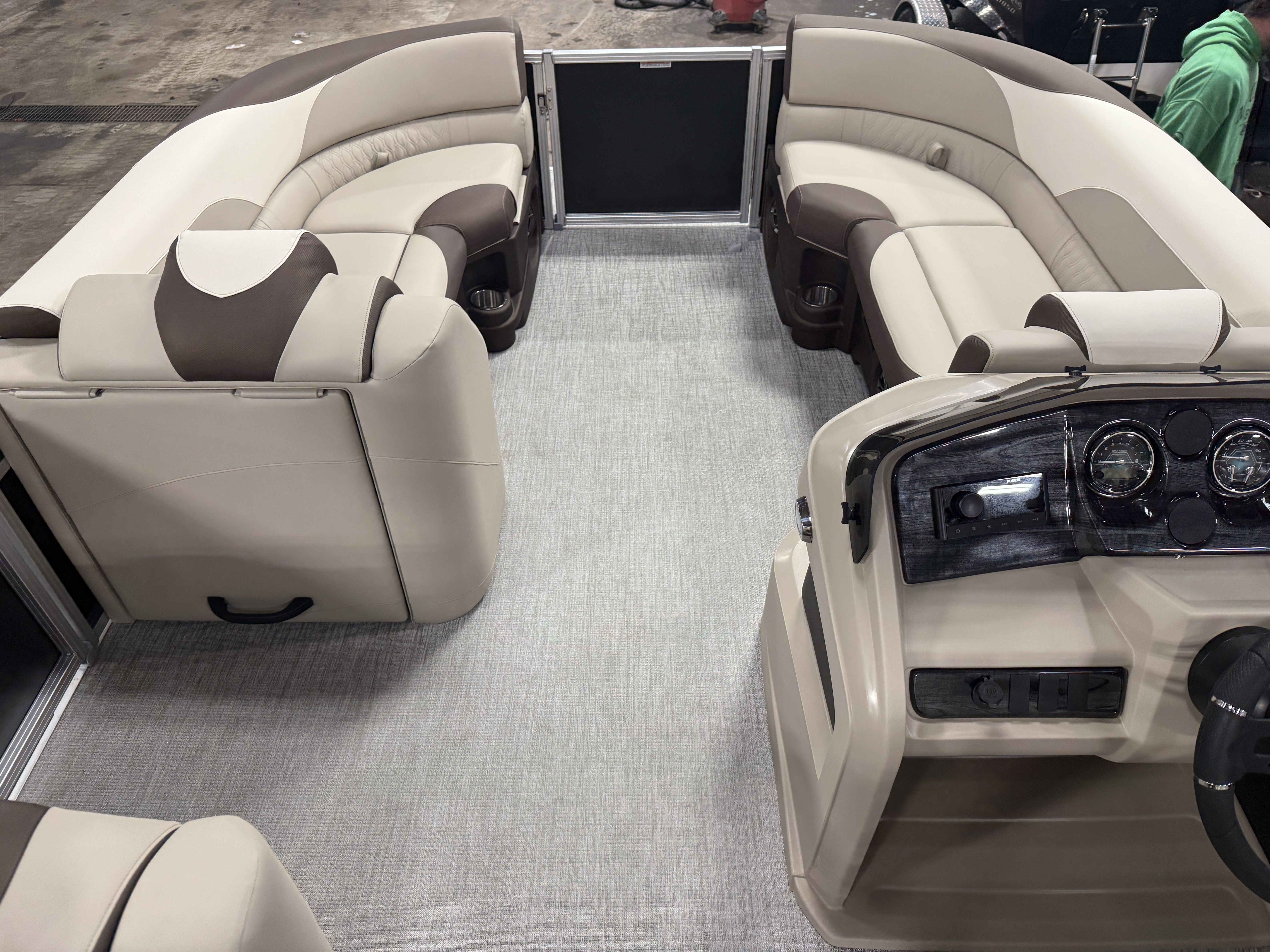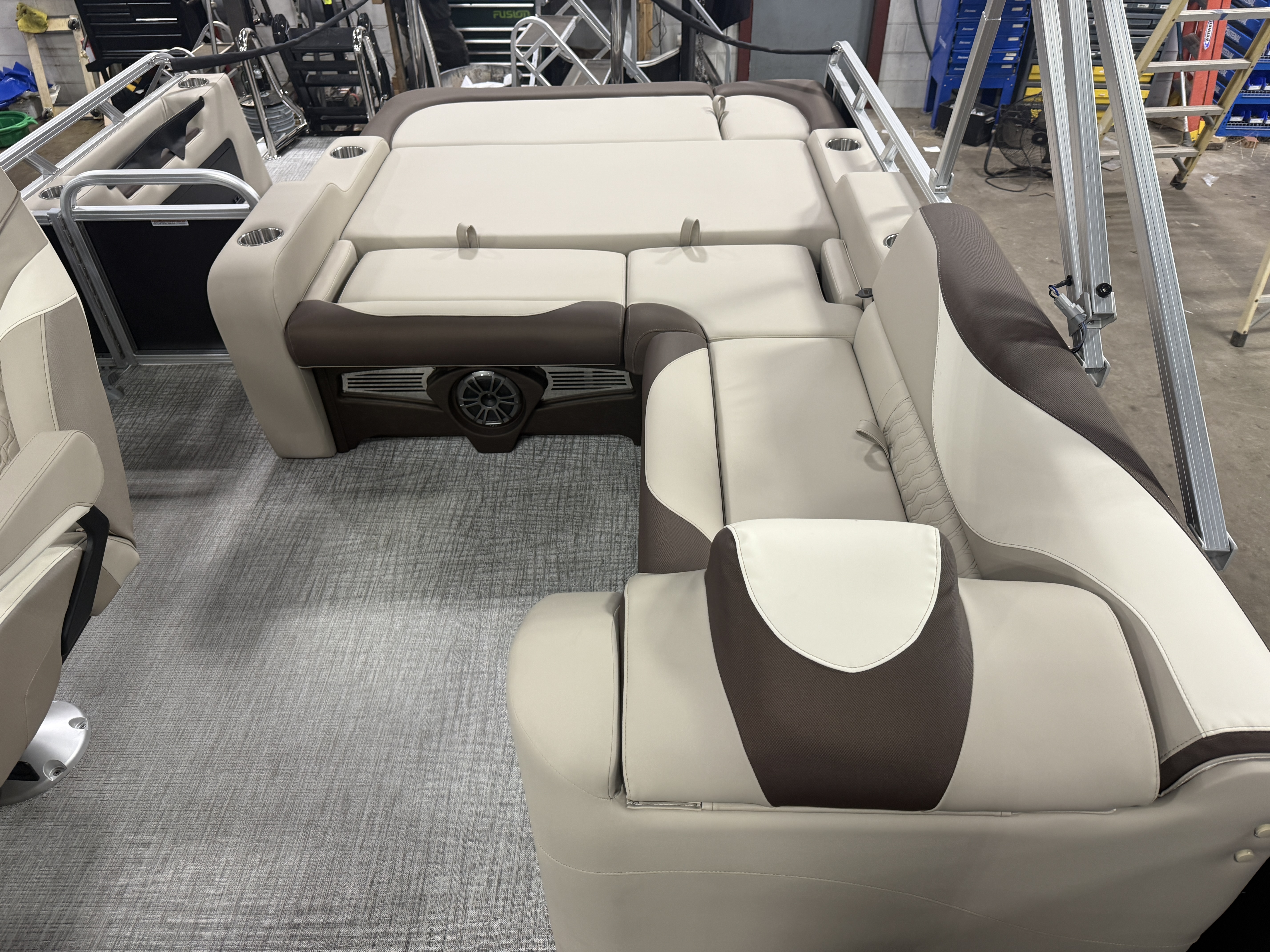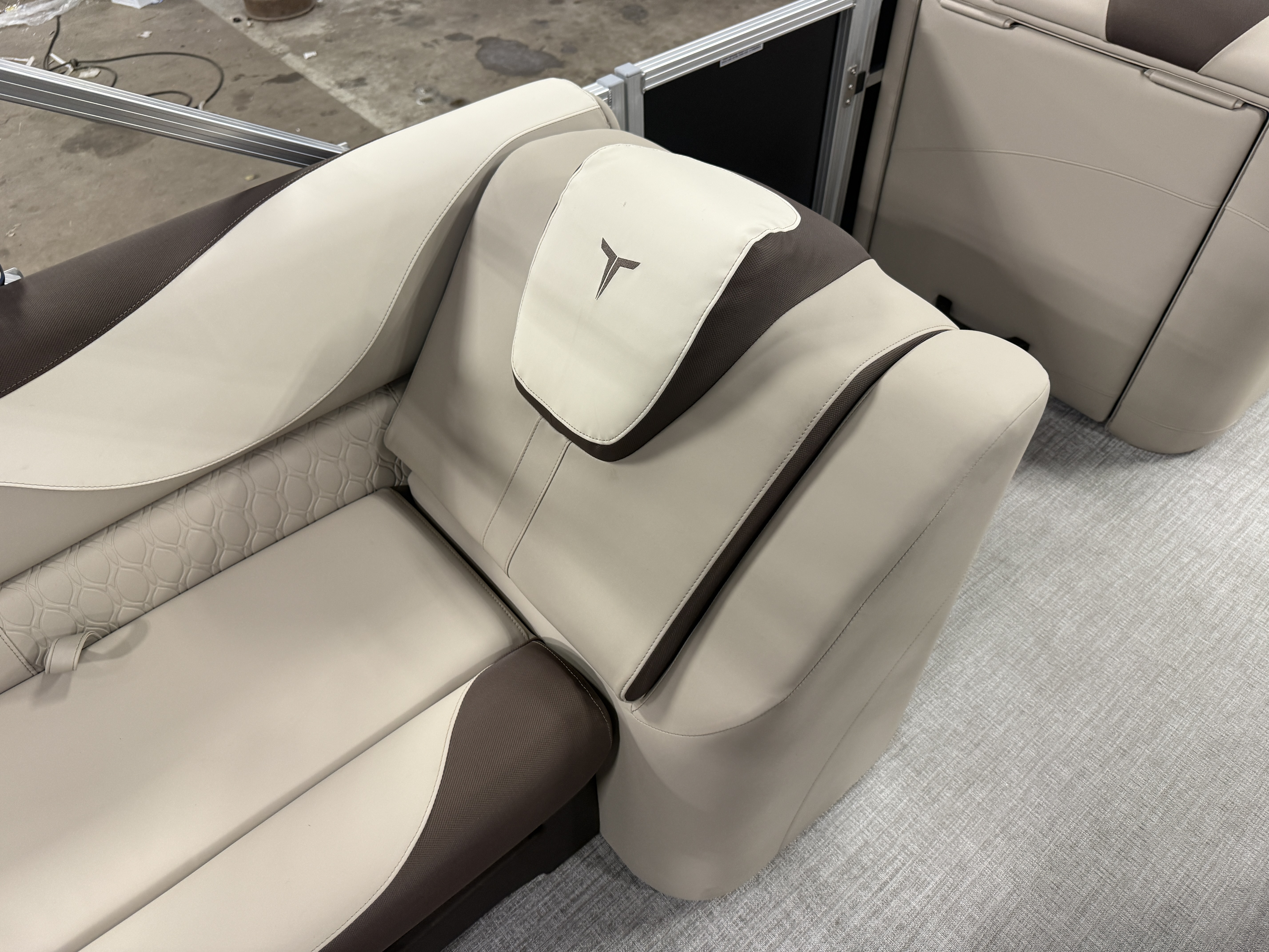2026 Tahoe LTZ 2385 Versatile Rear Bench (VRB) Swingback Pontoon & Honda 4-Stroke EFI. This 23' Steel Blue Walls Pontoon Has Front Chaise Lounge Seating With Storage, Wrap Around Seating With Storage, Admiral Reclining Captain's Chair, Seating That Turns Into A Bed Or Rear Facing Bench Seating, Rear Swim Deck, Riptide Vinyl Flooring, LTZ Platinum Package (Ultrafine Touch Vinyl Upgrade, Garmin 52CV GPS Depth Finder, Pull-Up Cleats, LED Smoked Chrome Docking Lights, Vent Covers For Cladding, Platinum Edition Special Badging) Table, Bluetooth Radio w/6 Speakers, Multiple Cup Holders, 25" Tubes, 10' Bimini Top, Gated Aft, Buckskin Interior Package w/Expresso Accent, Brushed Bronze Seat Cladding, Built In 25 Gallon Gas Tank, LED NAV Lights, Ski Tow Bar w/Chains, Smoked Chrome Logos, Mooring Cover, Bow & Aft USB Charging Ports, Lillipad Easy Step Ladder, Side Storage Behind Captain's Seat, On/Off Battery Switch, Front Deck. Rated For 11 People.