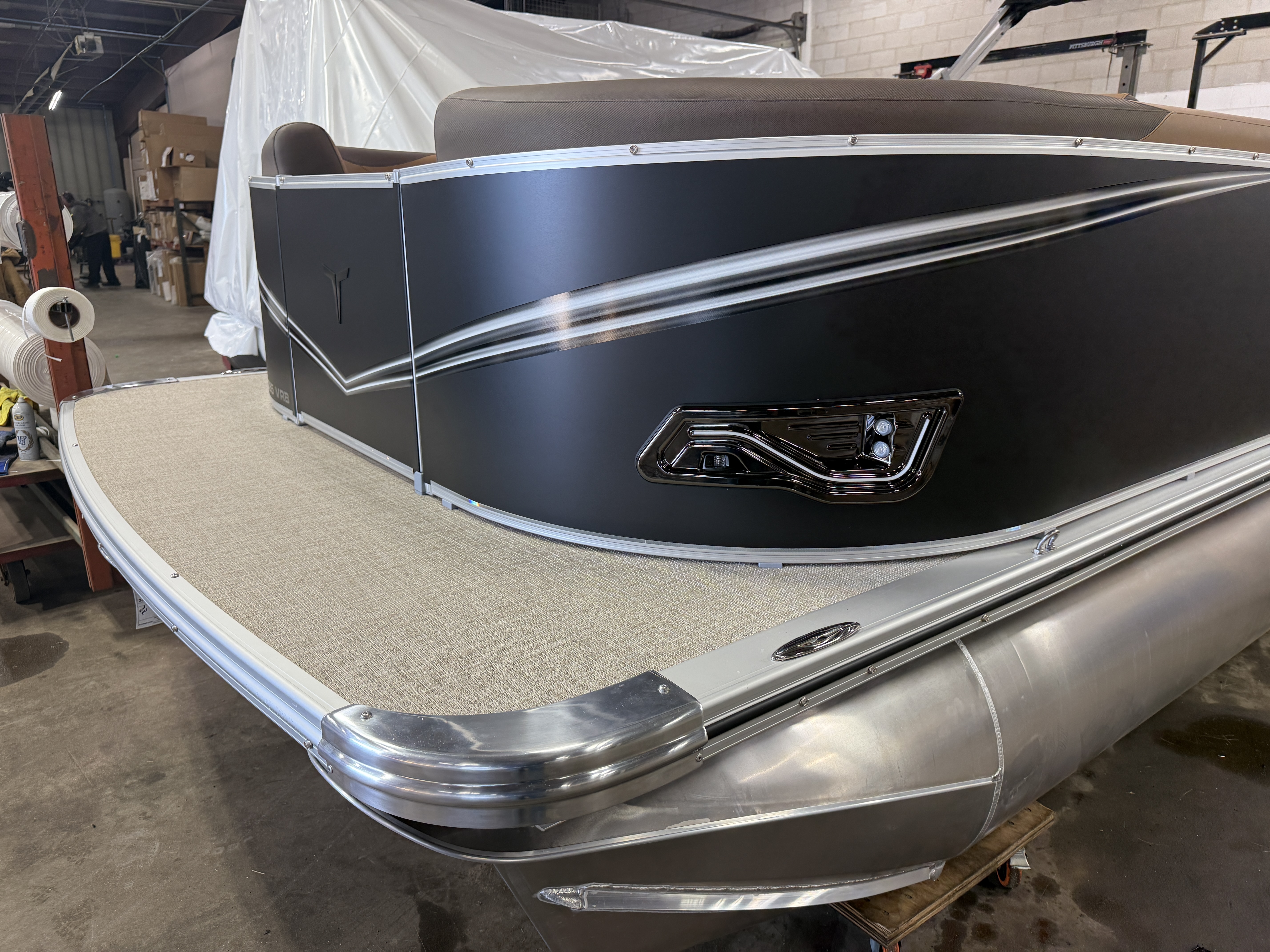 This 23' Matte Black Walls Tri-Toon Has Front Lounge Seating With Storage,
