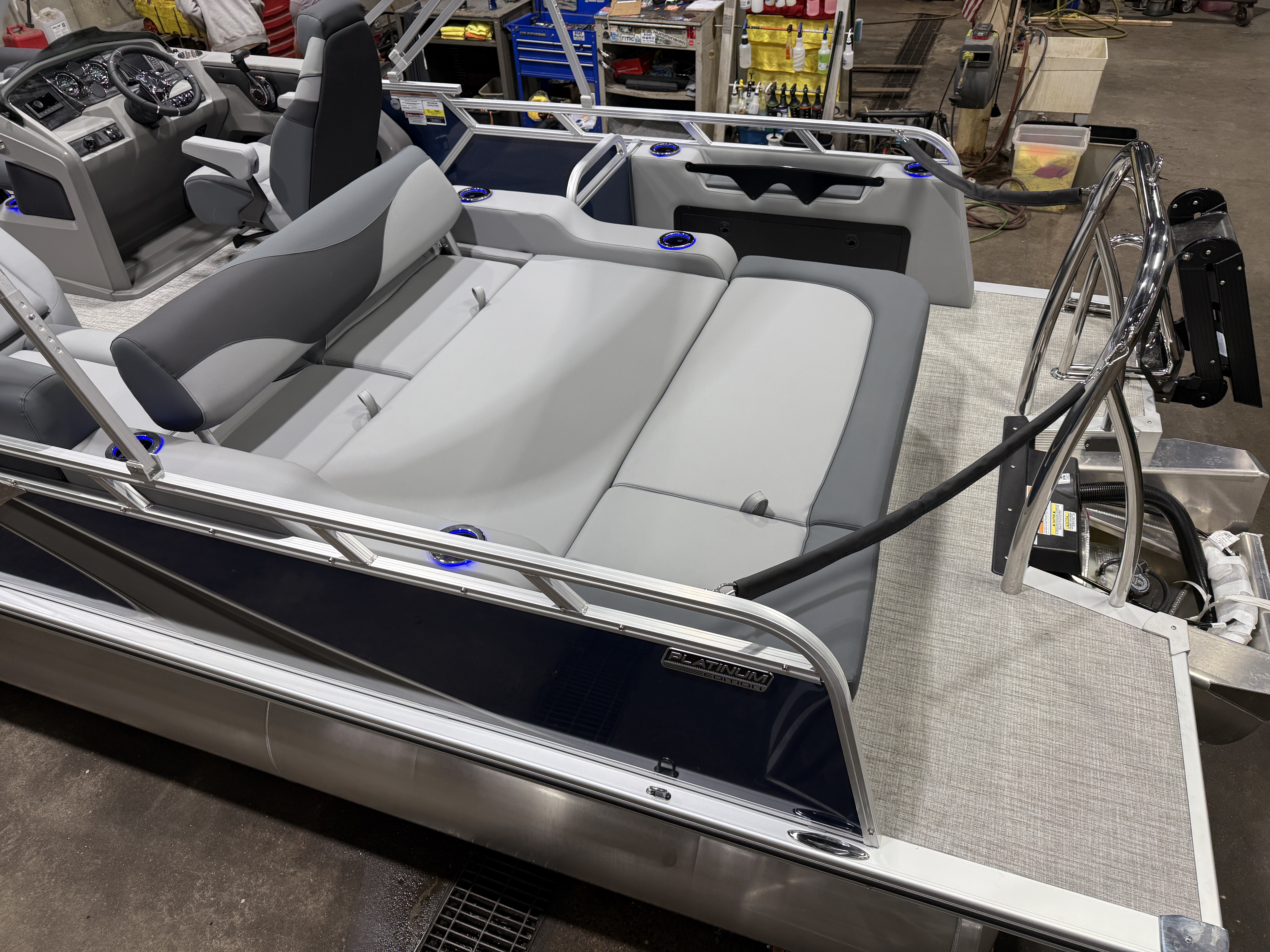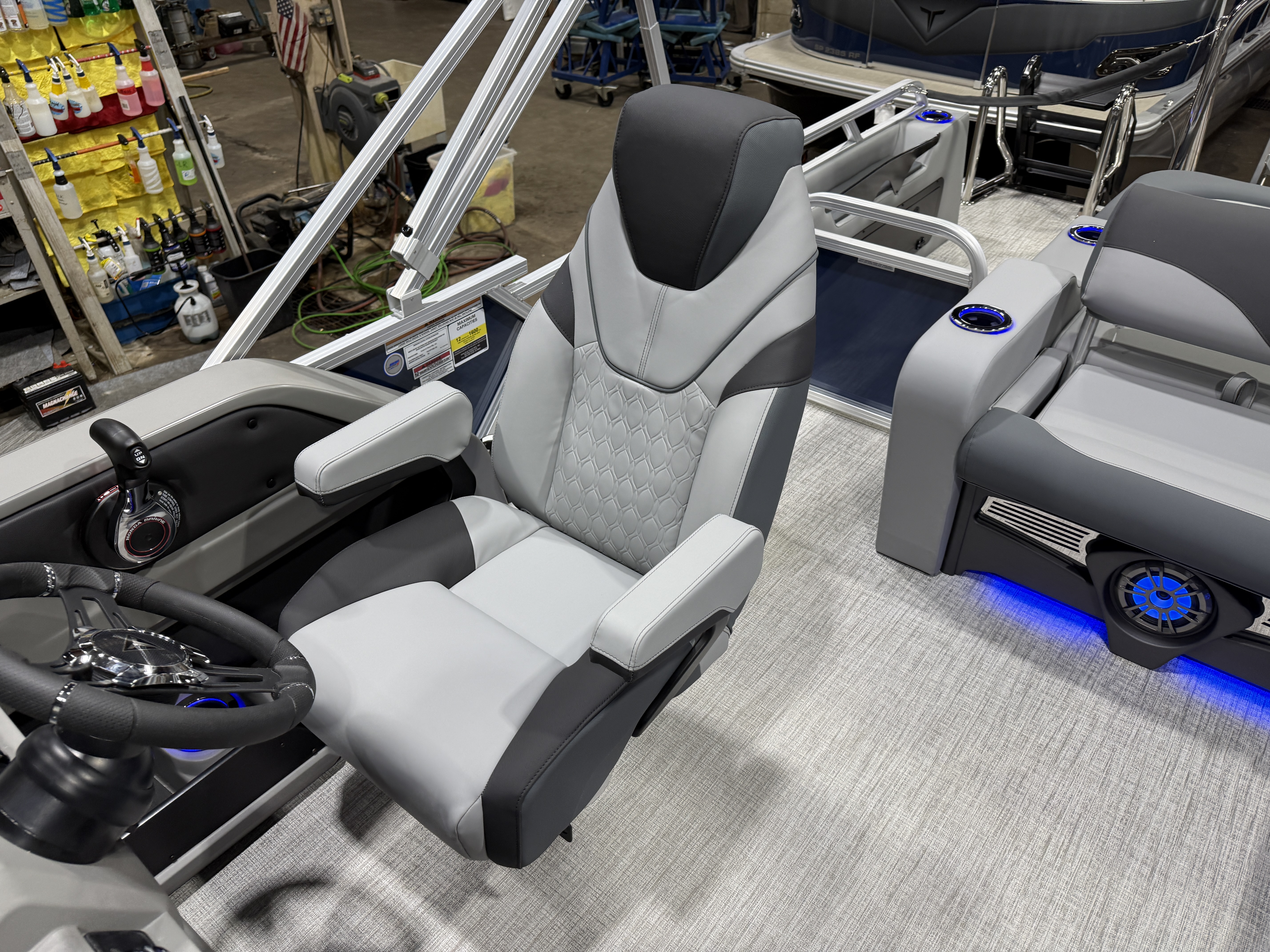 2026 Tahoe LTZ 2385 Versatile Rear Bench (VRB) Swingback Tritoon Pontoon Powered By Honda. This Matte Black Walls 23' Tri-Toon Has Front Lounge Seating With Storage, Admiral Reclining Captain's Chair, Versatile Rear Bench Seating With Storage, Gated Aft, Riptide Shadow Vinyl Flooring, Graphite Interior Package w/Koolfab Black & Koolfab Charcoal Accent, Platinum Package (Upgraded Ultra-Fine Vinyl Seats, LED Chrome Smoked Docklights, Polished Corner Caps, Garmin 52CV GPS Depth Finder, Pull Up Cleats, Vent Covers For Cladding, Platinum Edition Special Badging), Gauge Package w/Hour Meter, 10' Bimini Top, New Battery, Side Storage Behind Captain's Chair, Built-In 38 Gallon Gas Tank, Hydraulic Tilt Steering, Lifting Strakes, Underneath Aluminum Sheeting, Upgraded Greywood Rectangle Table, Blue Ice Package (Lighted Cup Holders, Speakers & Mood Lighting), Ski Tow Bar, Aft Chains, Multiple Cup Holders, Helm Side Storage, Mooring Cover, Fusion Bluetooth Radio w/6 Speakers & Amp, Lillipad Easy Step Ladder, Battery On/Off Switch, Tilt Steering, Bow & Aft USB Charging Ports, Nice Front And Rear Deck, New Battery, Charcoal Seat Cladding. Rated For 12 People.