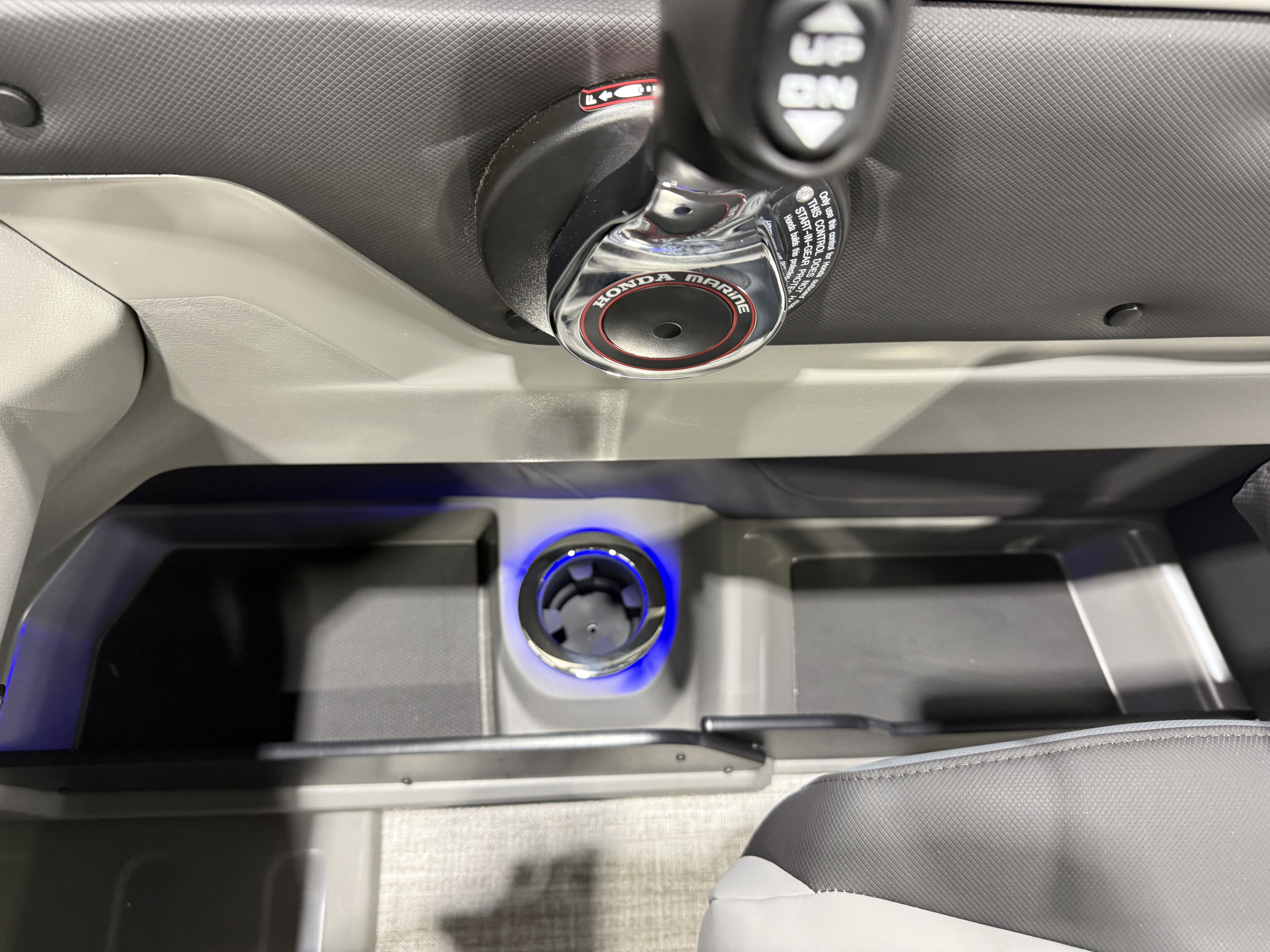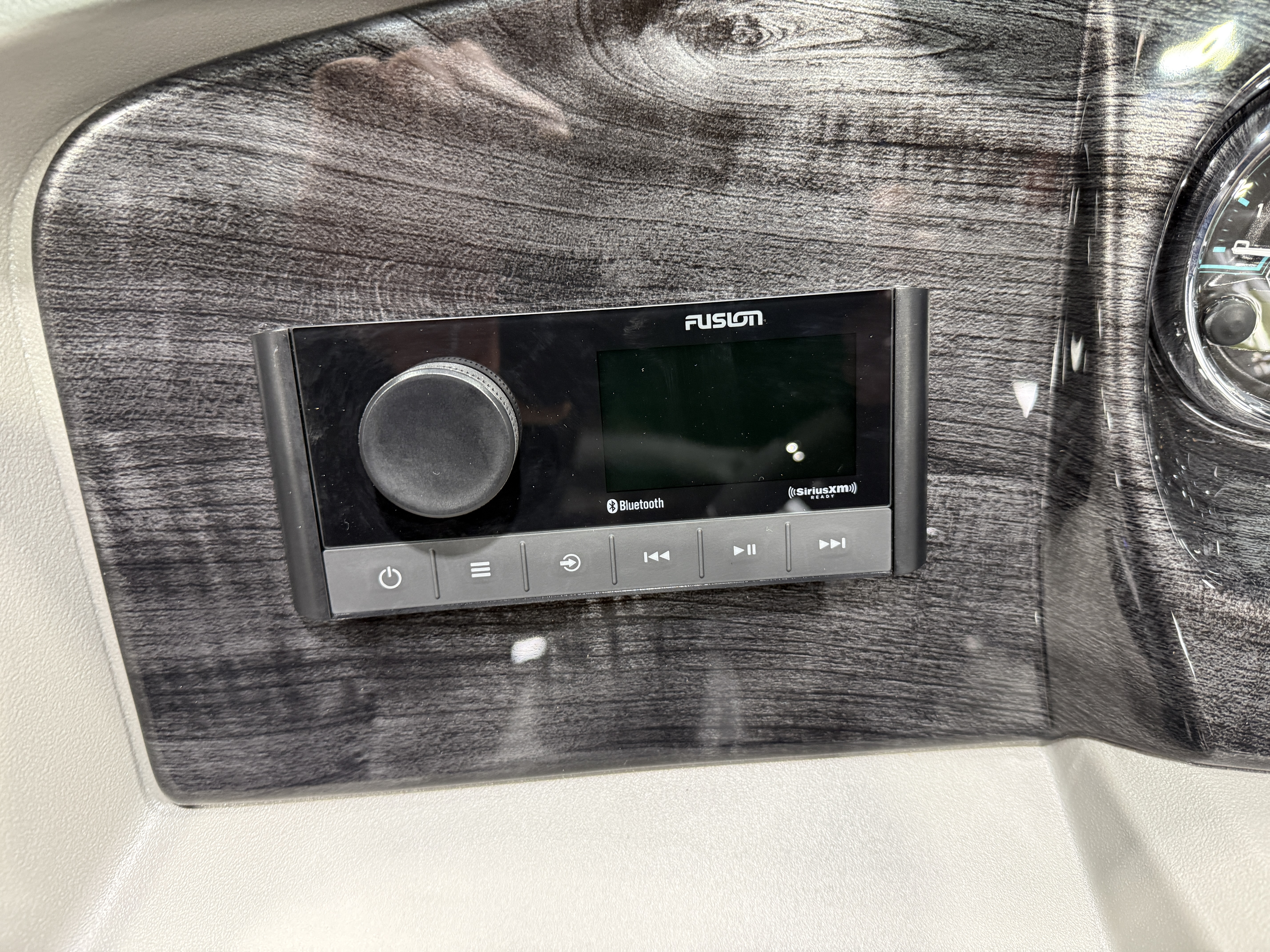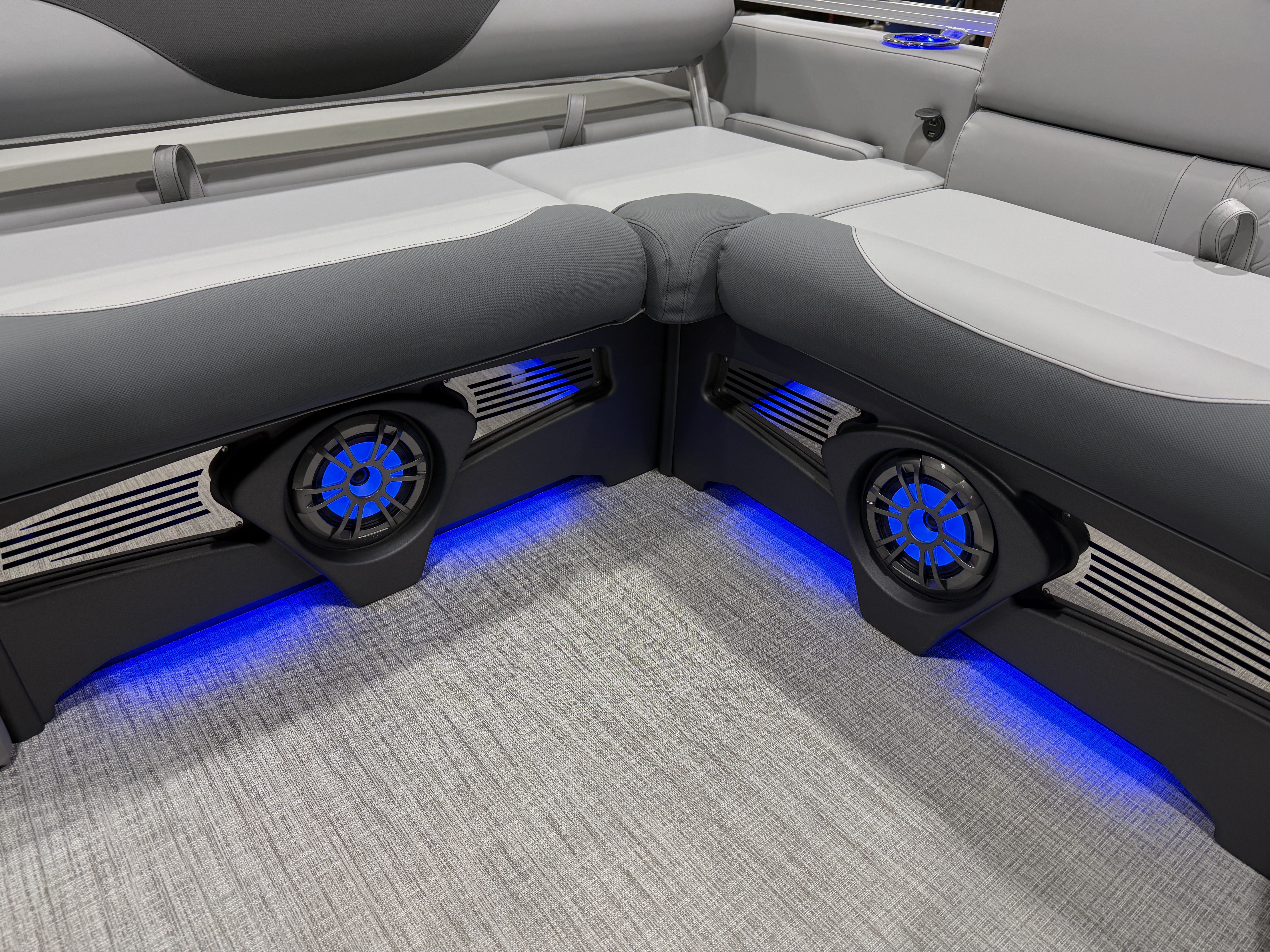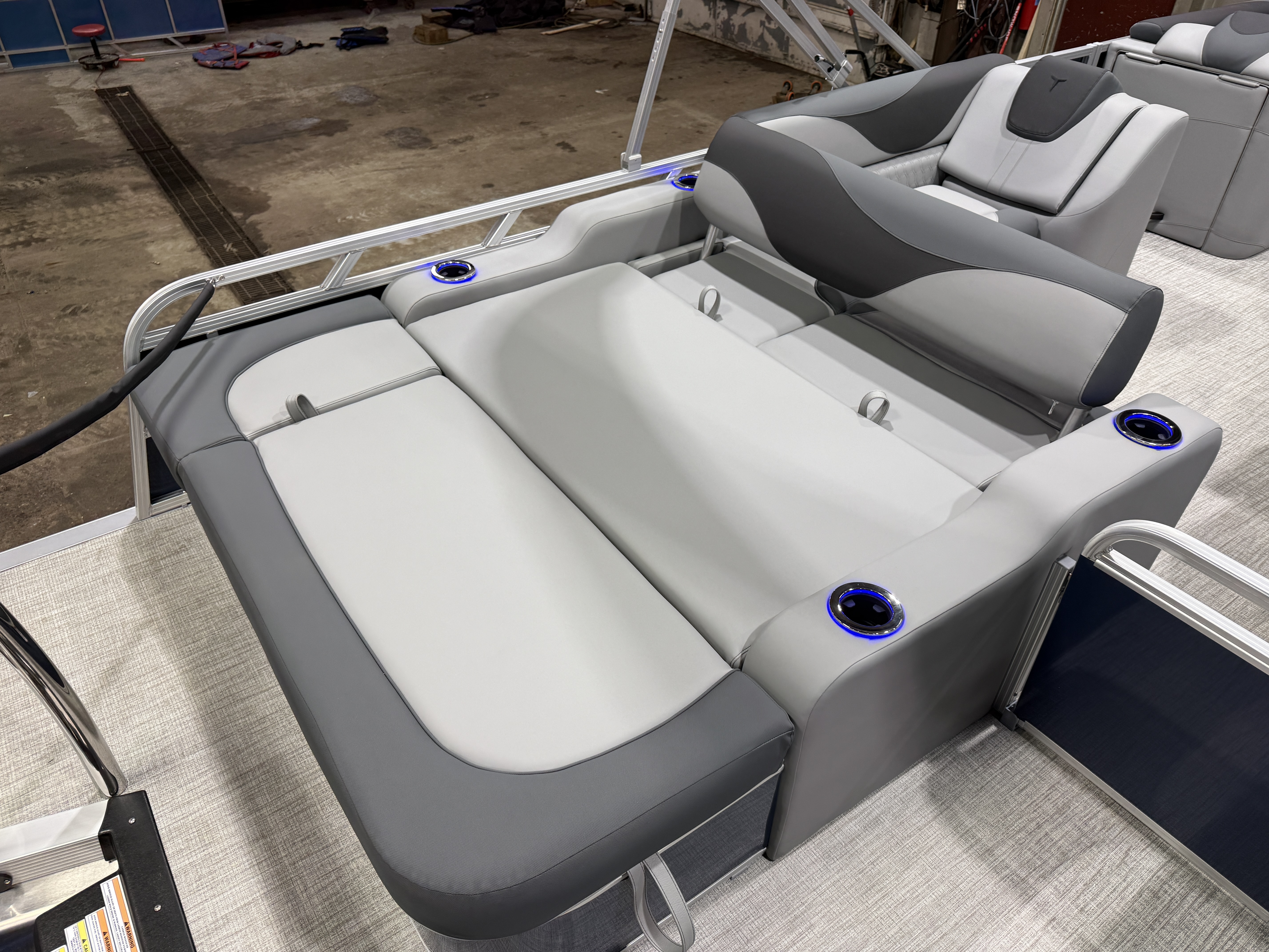 The 2026 Tahoe Pontoons LTZ 2385 Swingback (VRB) Tritoon is a new model featuring matte black walls and a versatile rear bench design. This 23-foot tritoon offers ample seating and storage, including a front lounge and a rear bench with multiple storage options. The interior boasts a Graphite package with Koolfab accents, enhancing aesthetics and comfort. Its design includes a 10-foot bimini top, a built-in 38-gallon gas tank, and Riptide Shadow vinyl flooring for practicality and ease of maintenance. For navigation and entertainment, the pontoon is equipped with a Garmin 52CV GPS depth finder, a Fusion Bluetooth radio with six speakers and an amp, and mood lighting elements. The available power options include Honda 4-Stroke EFI engines ranging from 115HP to 250HP, ensuring customizable performance to suit your needs. Additional features include hydraulic tilt steering, lifting strakes, an upgraded greywood rectangle table, and ski tow bar for recreational activities. Offered with an impressive 10-year warranty from Tahoe and a 5-year non-declining warranty from Honda, this pontoon provides reliability and peace of mind. Financing options are available, making it easier to own this well-equipped pontoon. A trailer is not included but can be purchased separately. The Tahoe LTZ 2385 ensures a quality, feature-rich experience, designed for both leisure and functionality on the water.
