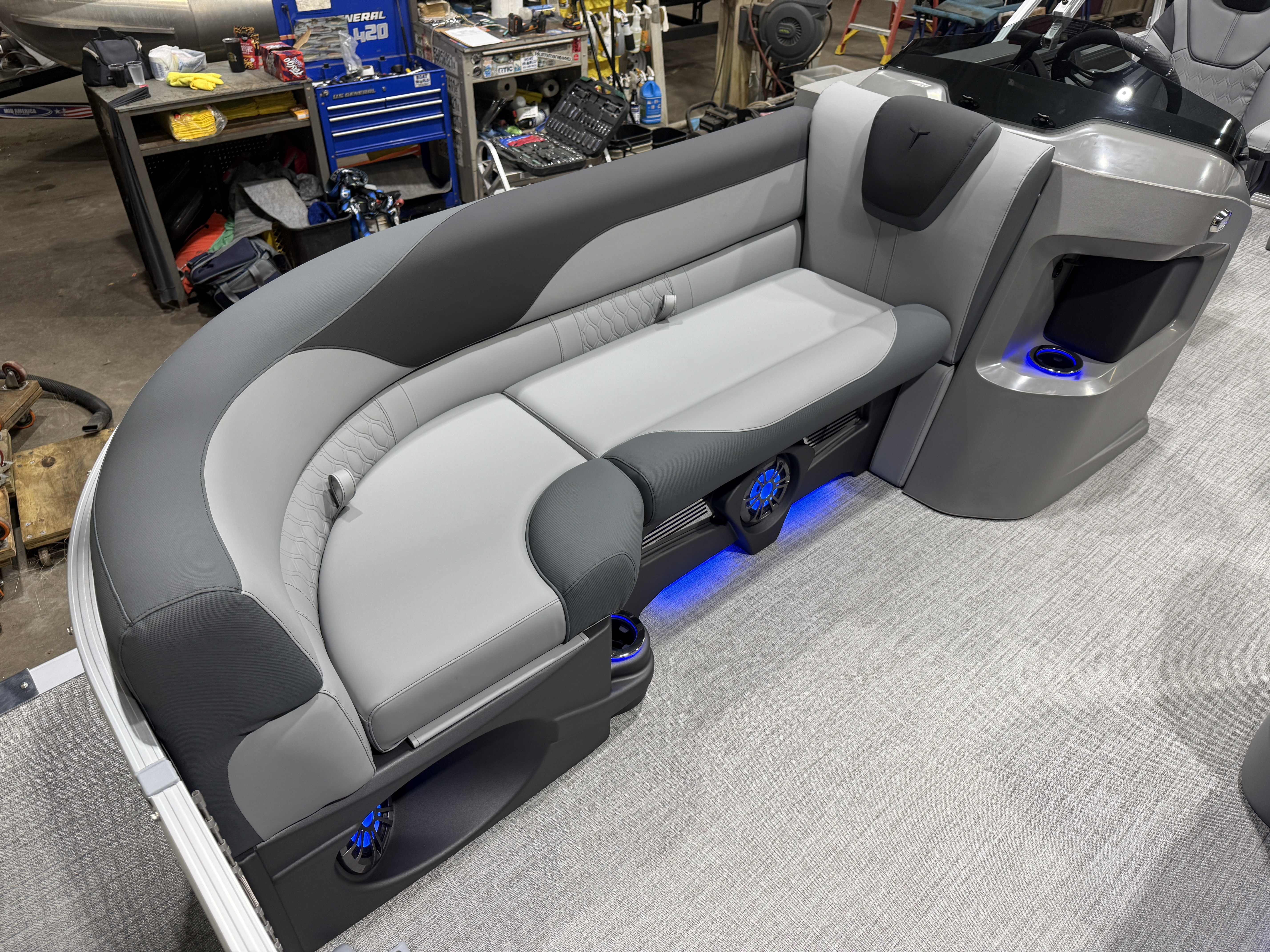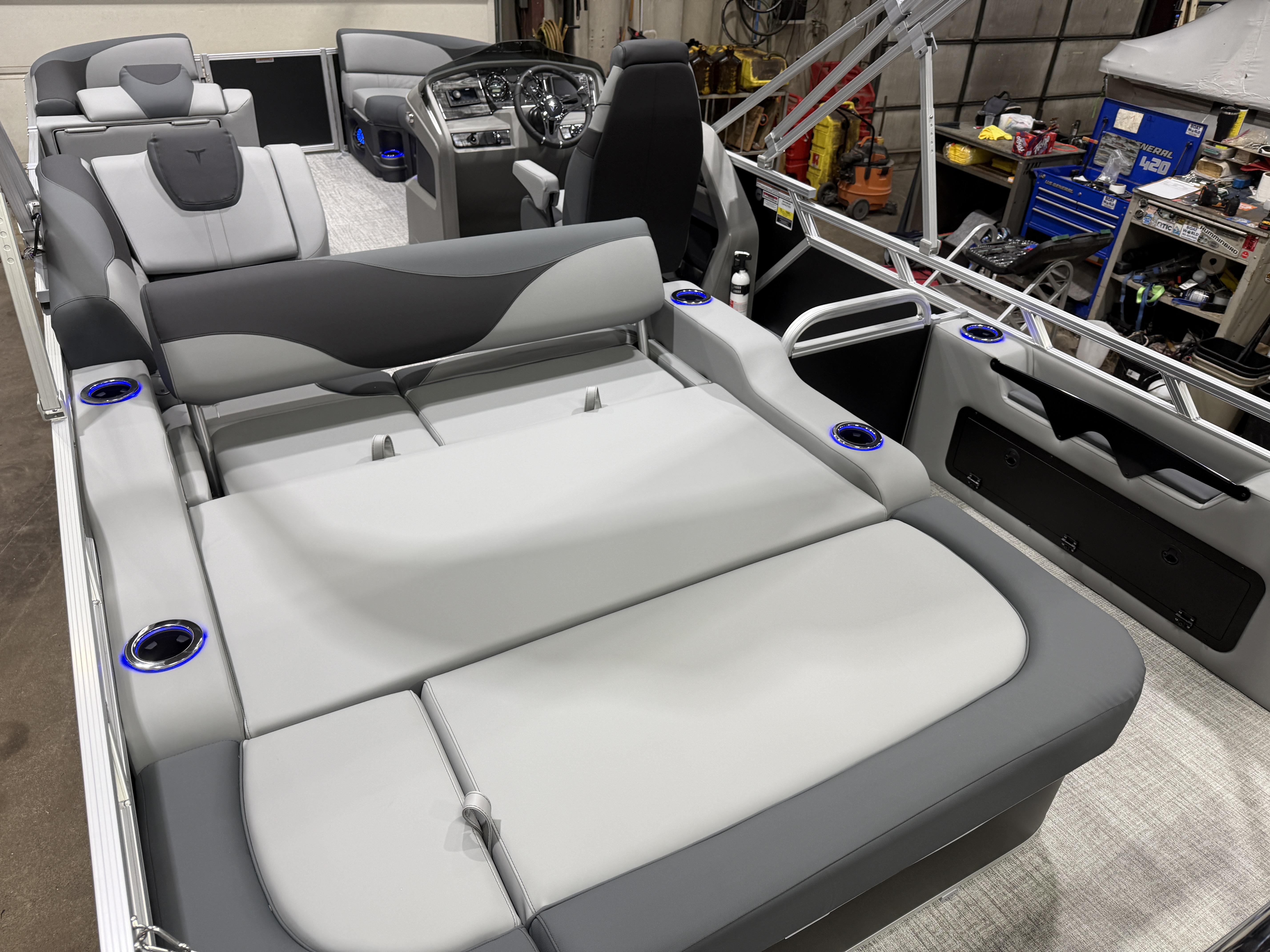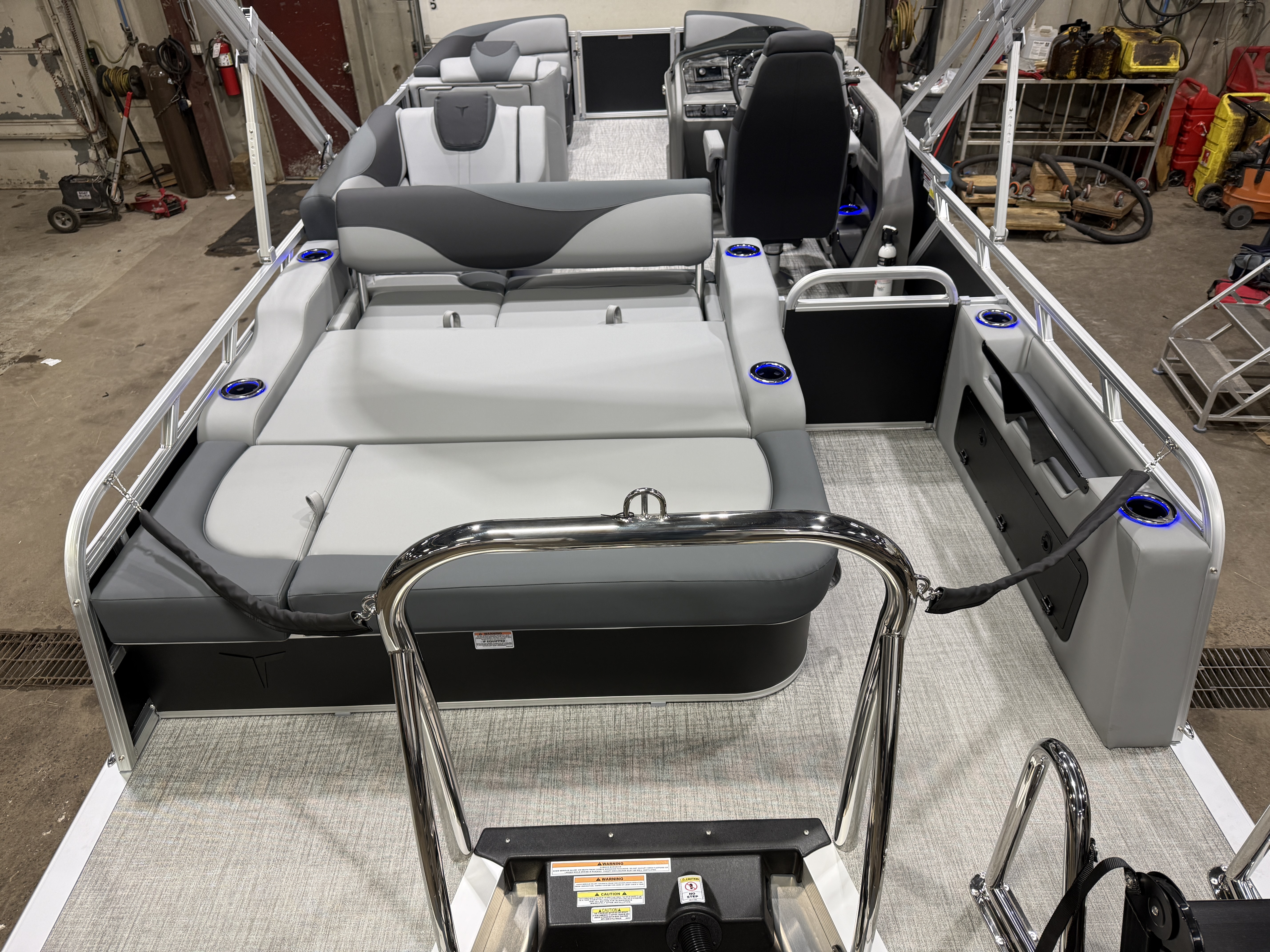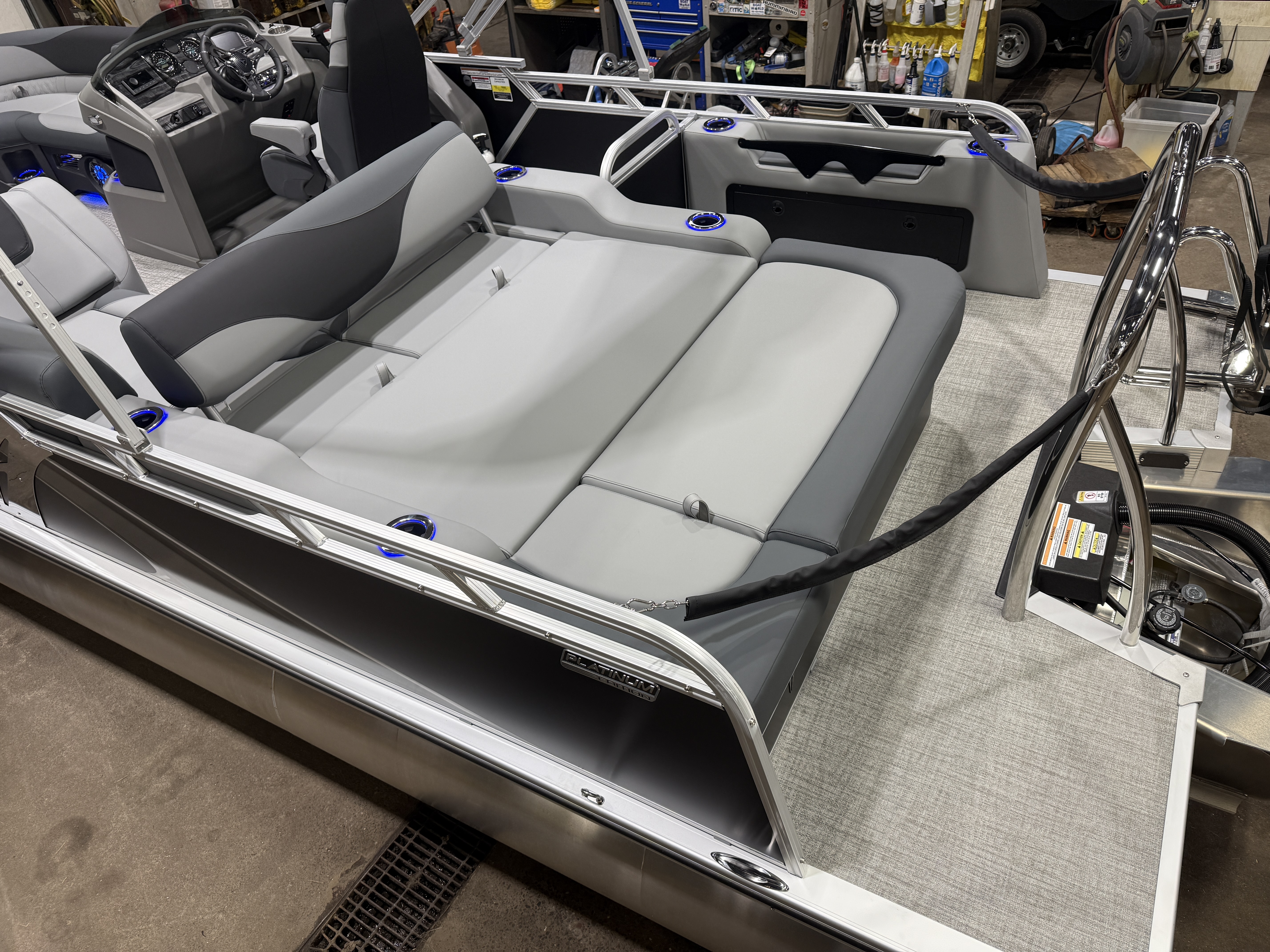 2026 Tahoe LTZ 2385 Versatile Rear Bench (VRB) Swingback Tritoon Pontoon Powered By Honda. This Matte Black Walls 23' Tri-Toon Has Front Lounge Seating With Storage, Admiral Reclining Captain's Chair, Versatile Rear Bench Seating With Storage, Gated Aft, Riptide Shadow Vinyl Flooring, Graphite Interior Package w/Koolfab Black & Koolfab Charcoal Accent, Platinum Package (Upgraded Ultra-Fine Vinyl Seats, LED Chrome Smoked Docklights, Polished Corner Caps, Garmin 52CV GPS Depth Finder, Pull Up Cleats, Vent Covers For Cladding, Platinum Edition Special Badging), Gauge Package w/Hour Meter, 10' Bimini Top, New Battery, Side Storage Behind Captain's Chair, Built-In 38 Gallon Gas Tank, Hydraulic Tilt Steering, Lifting Strakes, Underneath Aluminum Sheeting, Upgraded Greywood Rectangle Table, Blue Ice Package (Lighted Cup Holders, Speakers & Mood Lighting), Ski Tow Bar, Aft Chains, Multiple Cup Holders, Helm Side Storage, Mooring Cover, Fusion Bluetooth Radio w/6 Speakers & Amp, Lillipad Easy Step Ladder, Battery On/Off Switch, Tilt Steering, Bow & Aft USB Charging Ports, Nice Front And Rear Deck, New Battery, Charcoal Seat Cladding. Rated For 12 People.