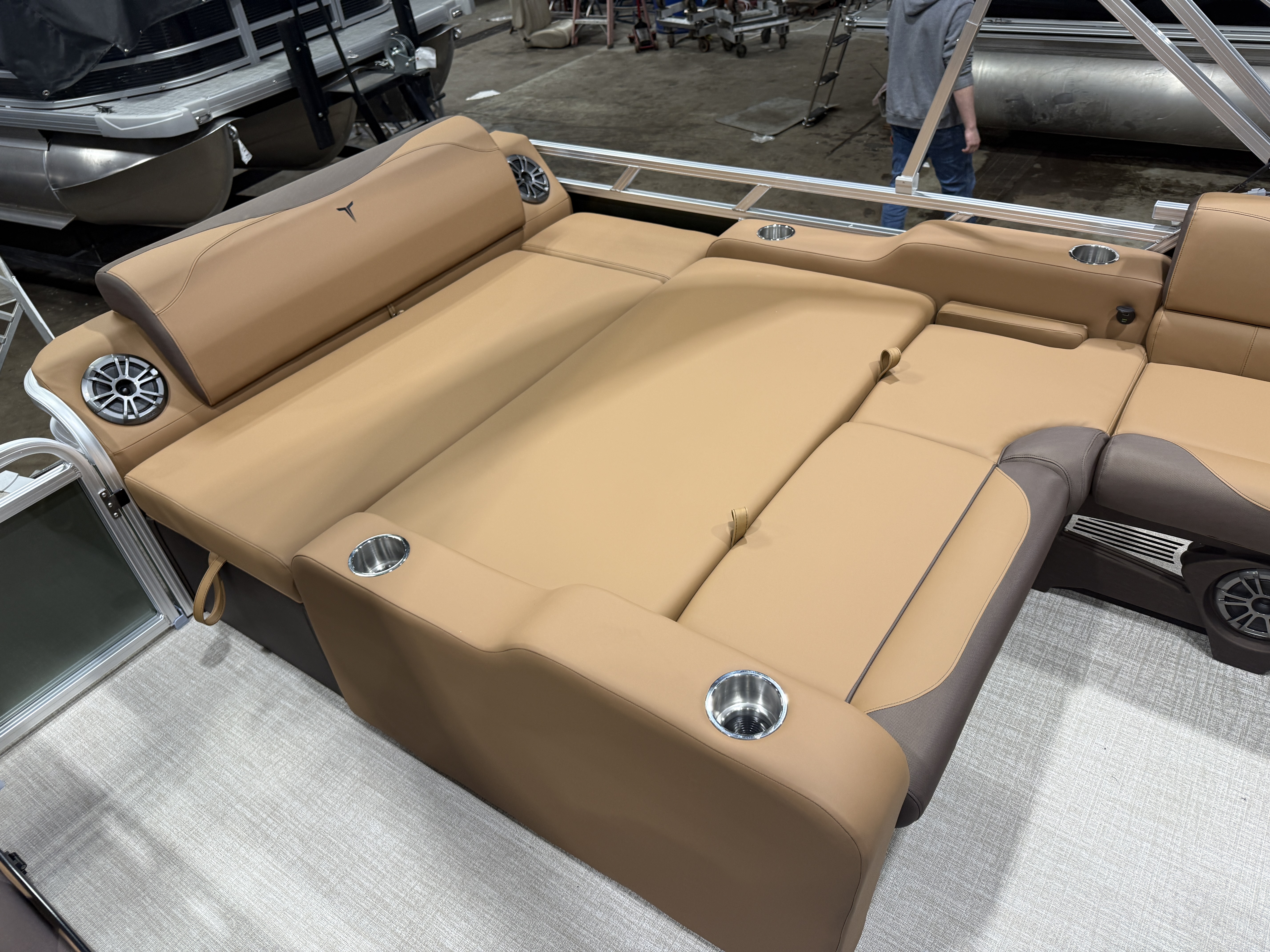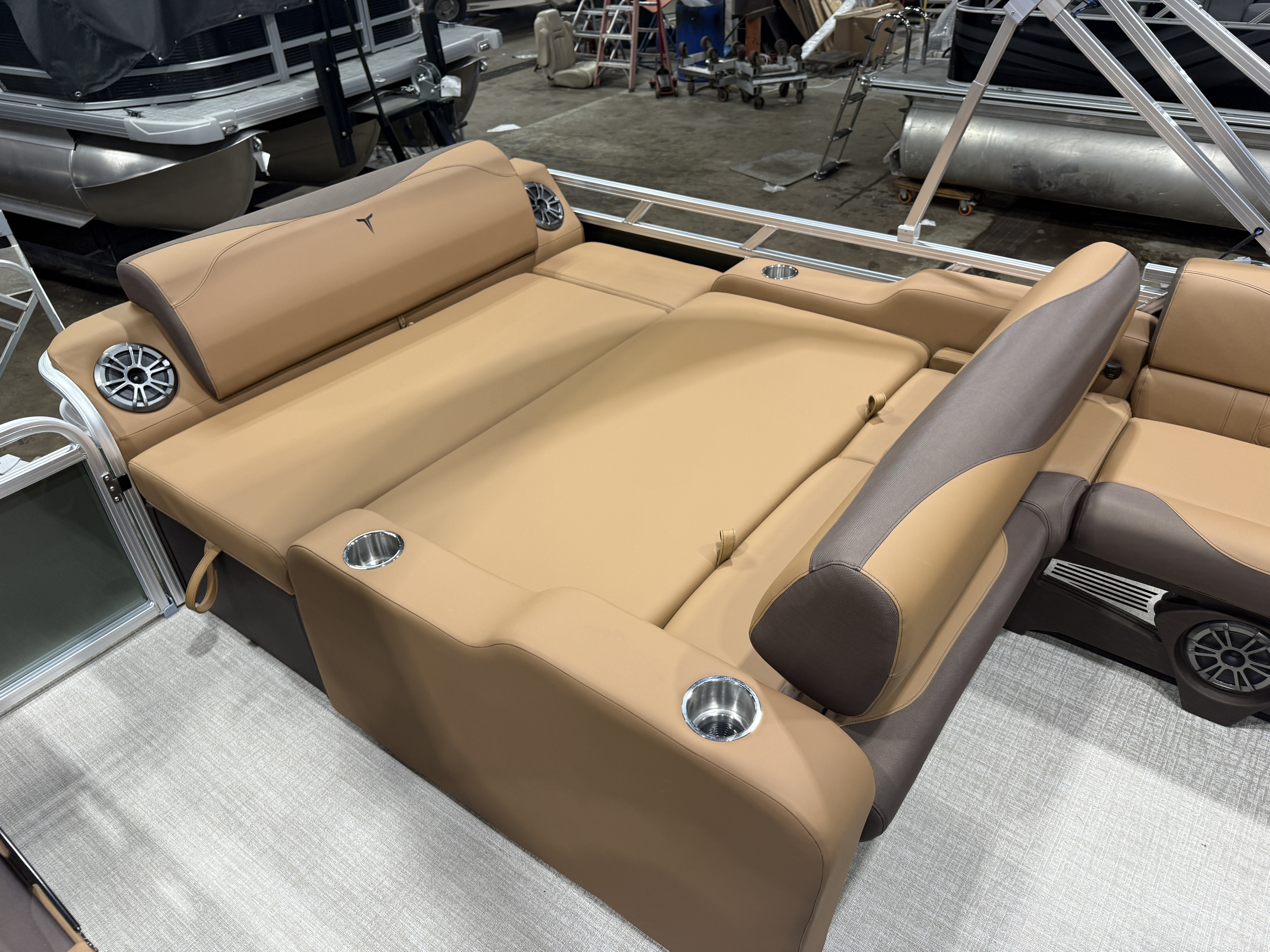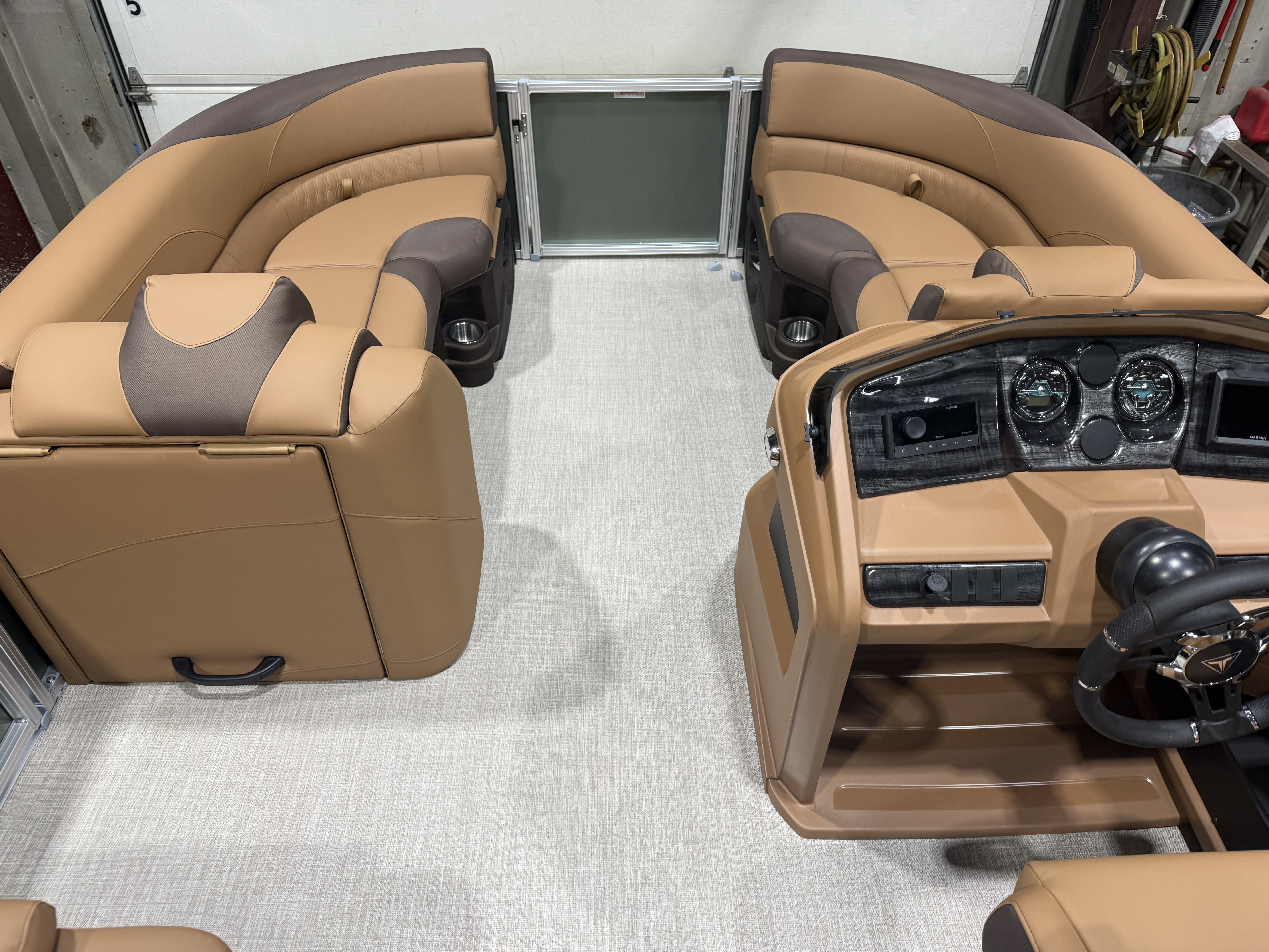2026 Tahoe LTZ 2385 Versatile Rear Lounger (VRL) Pontoon Powered By Honda. This Pontoon Has Front Lounge Seating With Storage, Admiral Reclining Captain's Chair, Versatile Rear Lounge Seating With Storage & Built In Speakers, Gated Aft, Riptide Vinyl Flooring, Cognac Interior Package, LTZ Platinum Package (LED Chrome Smoked Docklights, Polished Corner Caps, Garmin 52CV GPS Depth Finder, Pull Up Cleats, Vent Covers For Cladding, Platinum Edition Badging), Gauge Package w/Hour Meter, Bimini Top, New Battery, Side Storage Behind Captain's Chair, Built-In Gas Tank, Multiple Cup Holders, Helm Side Storage, Mooring Cover, Fusion Bluetooth Radio w/6 Speakers & Amp, Lillipad Easy Step Ladder, Tilt Steering, Bow & Aft USB Charging Ports, Front And Rear Deck, New Battery, On/Off Battery Switch, Brushed Bronze Seat Cladding. Rated For 11 People.