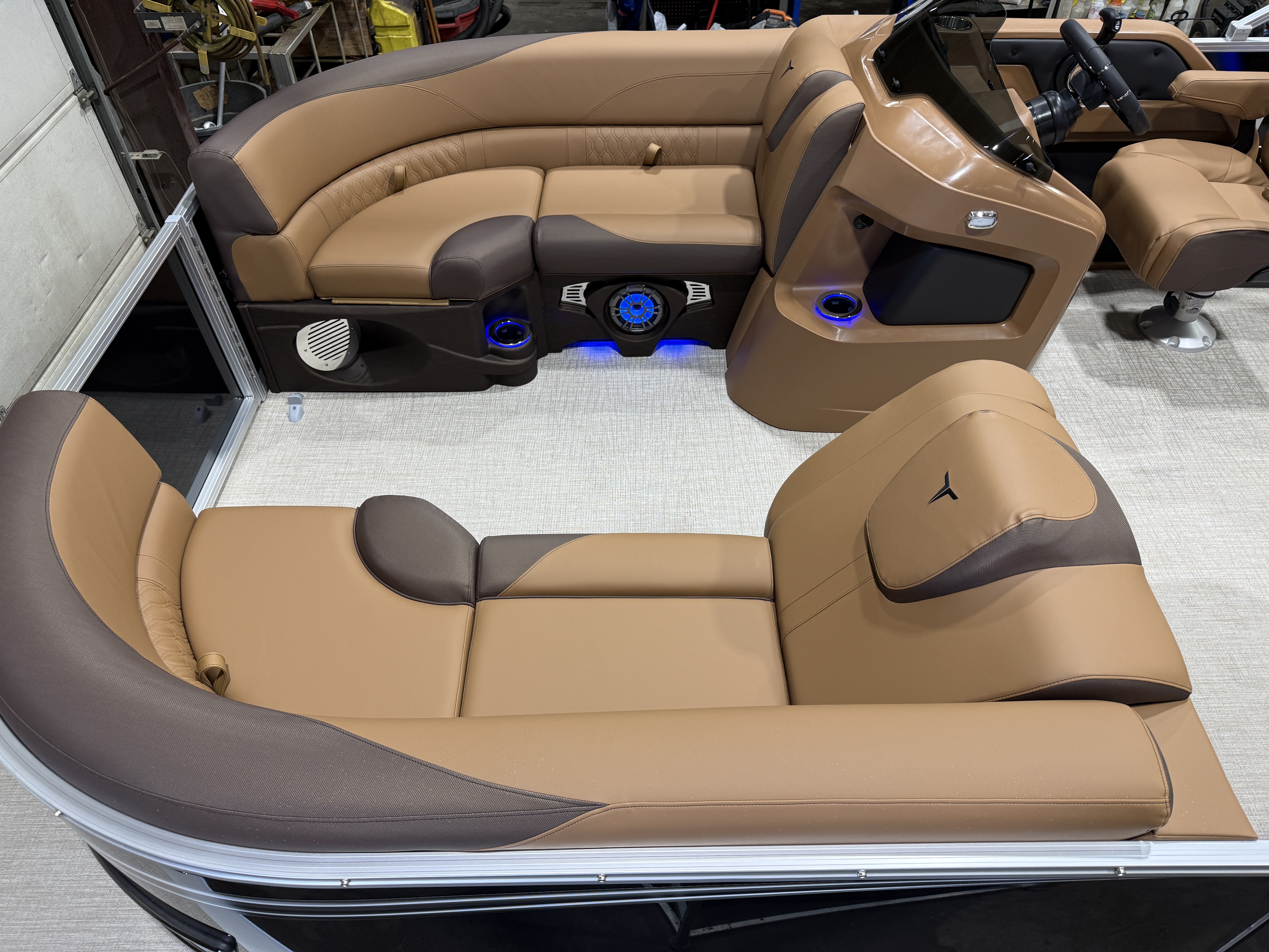 2026 Tahoe LTZ 2385 Versatile Rear Lounger (VRL) Tritoon Pontoon Powered By 200HP Honda. This Tri-Toon Has Front Lounge Seating With Storage, Admiral Reclining Captain's Chair, Versatile Rear Lounge Seating With Storage & Built In Speakers, Gated Aft, Riptide Vinyl Flooring, Cognac Interior Package, Platinum Package (Ultrafine Touch Vinyl Upgrade, LED Chrome Smoked Docklights, Polished Corner Caps, Garmin 52CV GPS Depth Finder, Pull Up Cleats, Vent Covers For Cladding, Platinum Edition Special Badging), Gauge Package w/Hour Meter, Bimini Top, New Battery, Side Storage Behind Captain's Chair, Built-In 38 Gallon Gas Tank, Hydraulic Tilt Steering, Lifting Strakes, Underneath Aluminum Sheeting, Mooring Cover, Blue Ice Package (Lighted Cup Holders, Speakers & Mood Lighting), Ski Tow Bar, Multiple Cup Holders, Side Storage Behind Captain's Seat, Fusion Bluetooth Radio w/6 Speakers & Amp, Lillipad Easy Step Ladder, Tilt Steering, Bow & Aft USB Charging Ports, On/Off Battery Switch, Smoked Chrome Logos, Nice Front And Rear Deck, New Battery, Brushed Bronze Seat Cladding. Rated For 12 People.