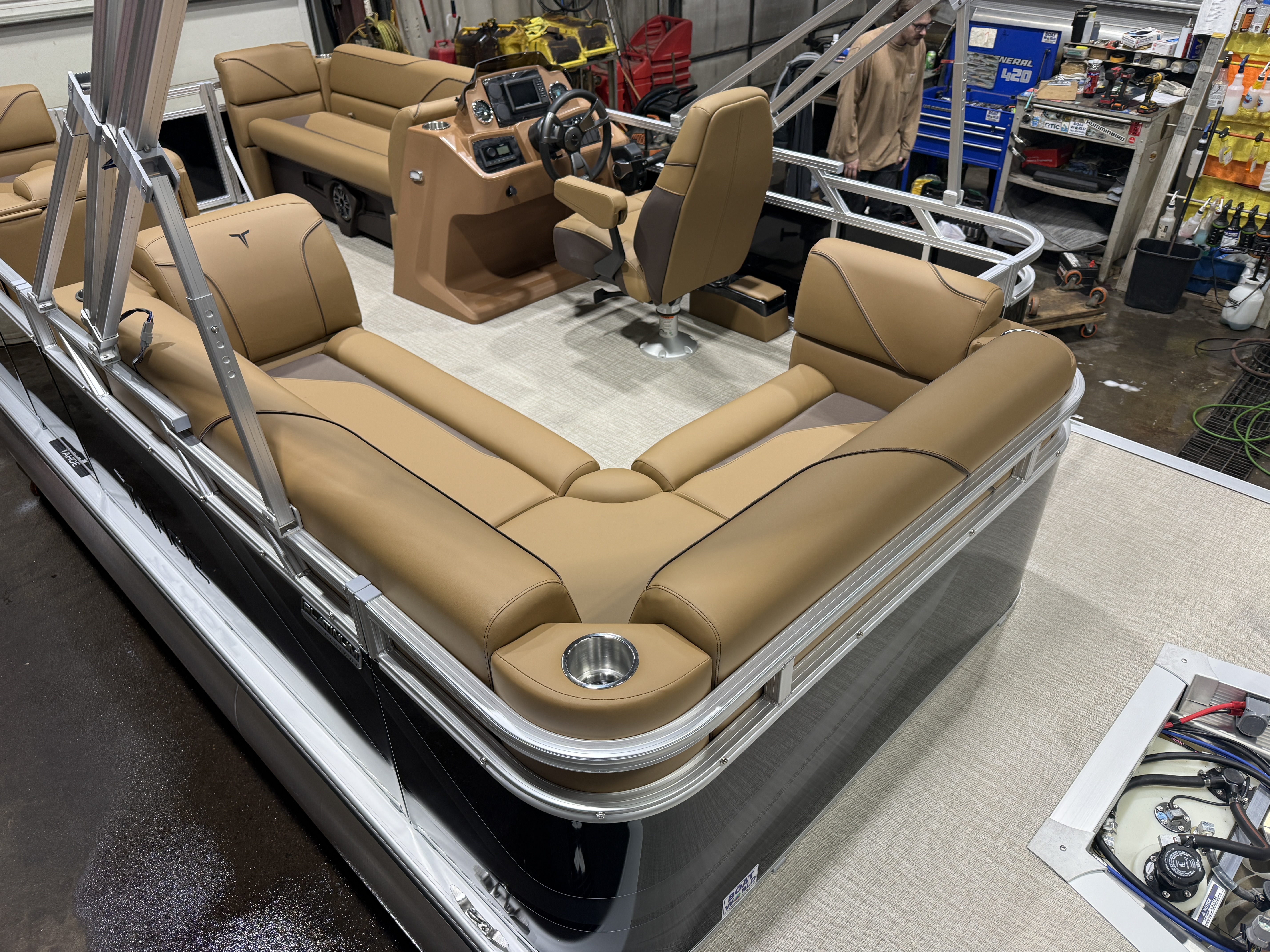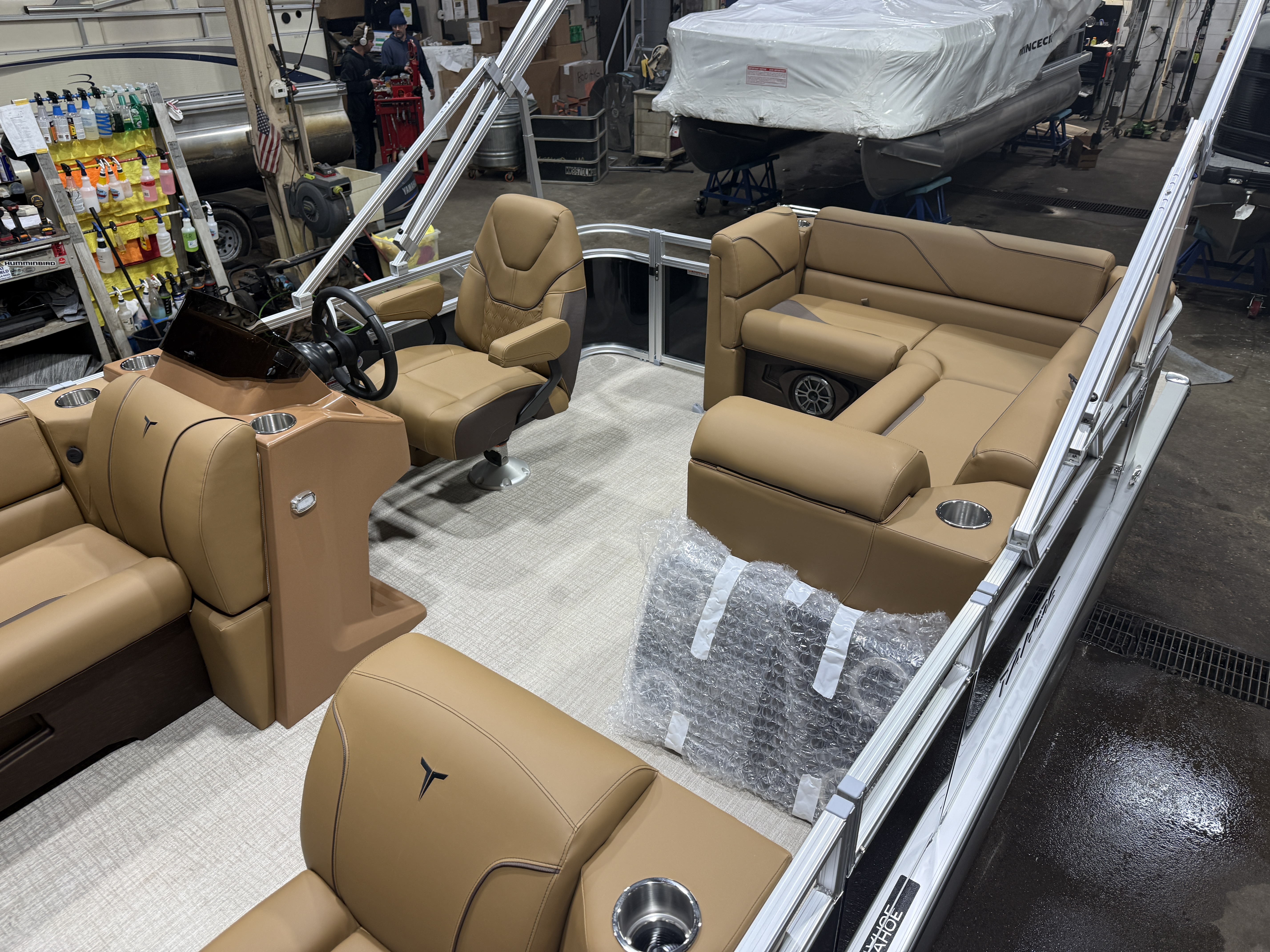 2026 Tahoe Sport 1980 Cruise Pontoon & Honda 4-Stroke EFI. This 19' Pontoon Has Nice Chaise Lounge Seating Up Front With Storage, Wrap Around Chaise Lounge Seating With More Storage, Rear Sun Pad/Storage, Sport Platinum Edition Package (Mid Back Commander's Captain's Chair With Slider, 90 Degree Chrome LED Docking Lights, Garmin 52CV GPS Depth Finder, Polished Corner Caps, Platinum Edition Special Badging) Mooring Cover, Cognac Interior Package w/Expresso Accent, Brushed Bronze Cladding, Tilt Steering, , Smoked Chrome Logos, Riptide Vinyl Flooring, 25" Tubes, Built-In Gallon Gas Tank, LED Nav Lights, New Battery, Battery On/Off Switch, Windshield, 10' Bimini Top, Nice Front And Rear Swim Deck, Greywood Rectangle Table, Rear 4 Step Ladder, Bluetooth Radio w/4 Speakers, Built-In Trash Can, Bow USB Charging Port, Multiple Stainless Steel Cup Holders. Rated For 10 People.