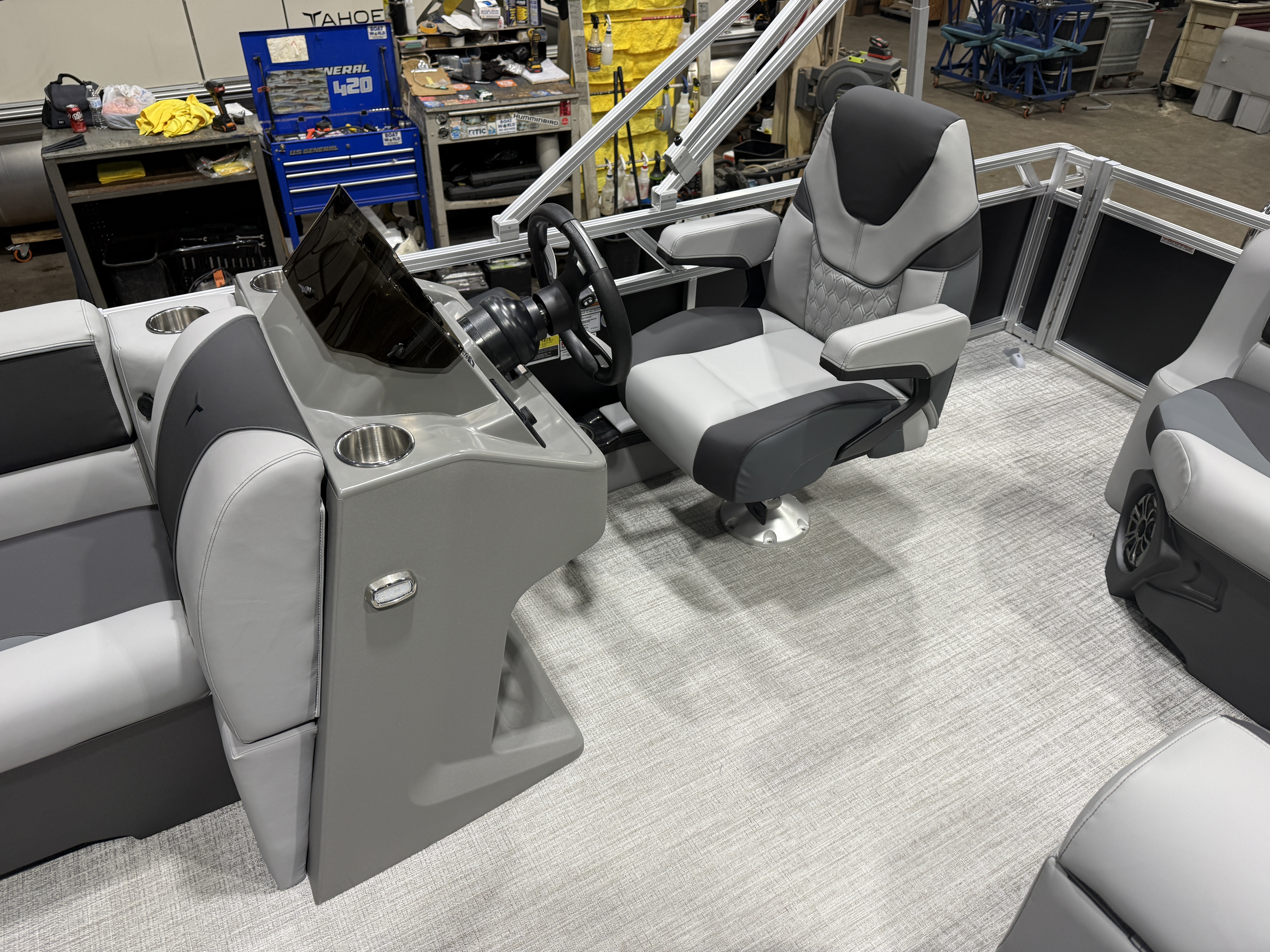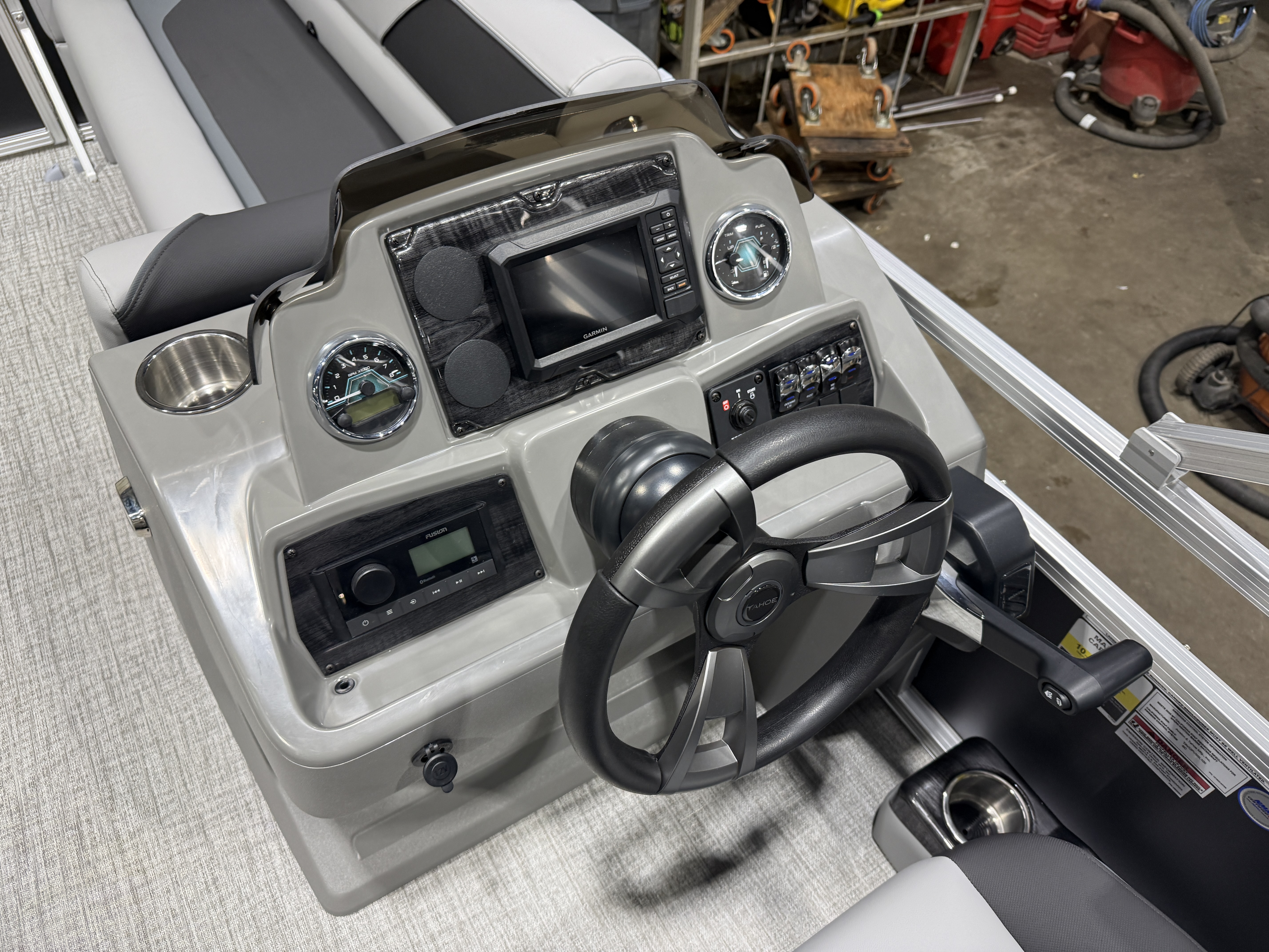 2026 Tahoe Sport 1980 Cruise Rear Bench Pontoon & Honda 4-Stroke EFI. This 19' Pontoon Has Great Chaise Lounge Seating Up Front With Storage, Wrap Around Chaise Lounge Seating With Storage, Mid Back Reclining Commander Captain's Chair, Graphite Interior Package w/Kool Fab Black & Charcoal Accent, Rear Facing Bench Seat w/Storage, Fusion Bluetooth Radio, Built In 25 Gallon Gas Tank, Table, Multiple Cup Holders, Adjustable 10' Bimini Top, Sport Platinum Package (Garmin 52CV GPS Depth Finder, LED 90 Degree Smoked Chrome Docklights, Polished Corner Caps, Platinum Edition Special Badging), Built-In Trash Can, Ladder, Charcoal Cladding, New Battery And Prop, On/Off Battery Switch, Mooring Cover, Riptide Vinyl Floor, Front And Rear Deck, 25" Tubes, LED NAV Lights, Smoked Chrome Logos, Tilt Steering, Bow USB Charging Port, Gauge Package w/Hour Meter. Rated For 10 People.