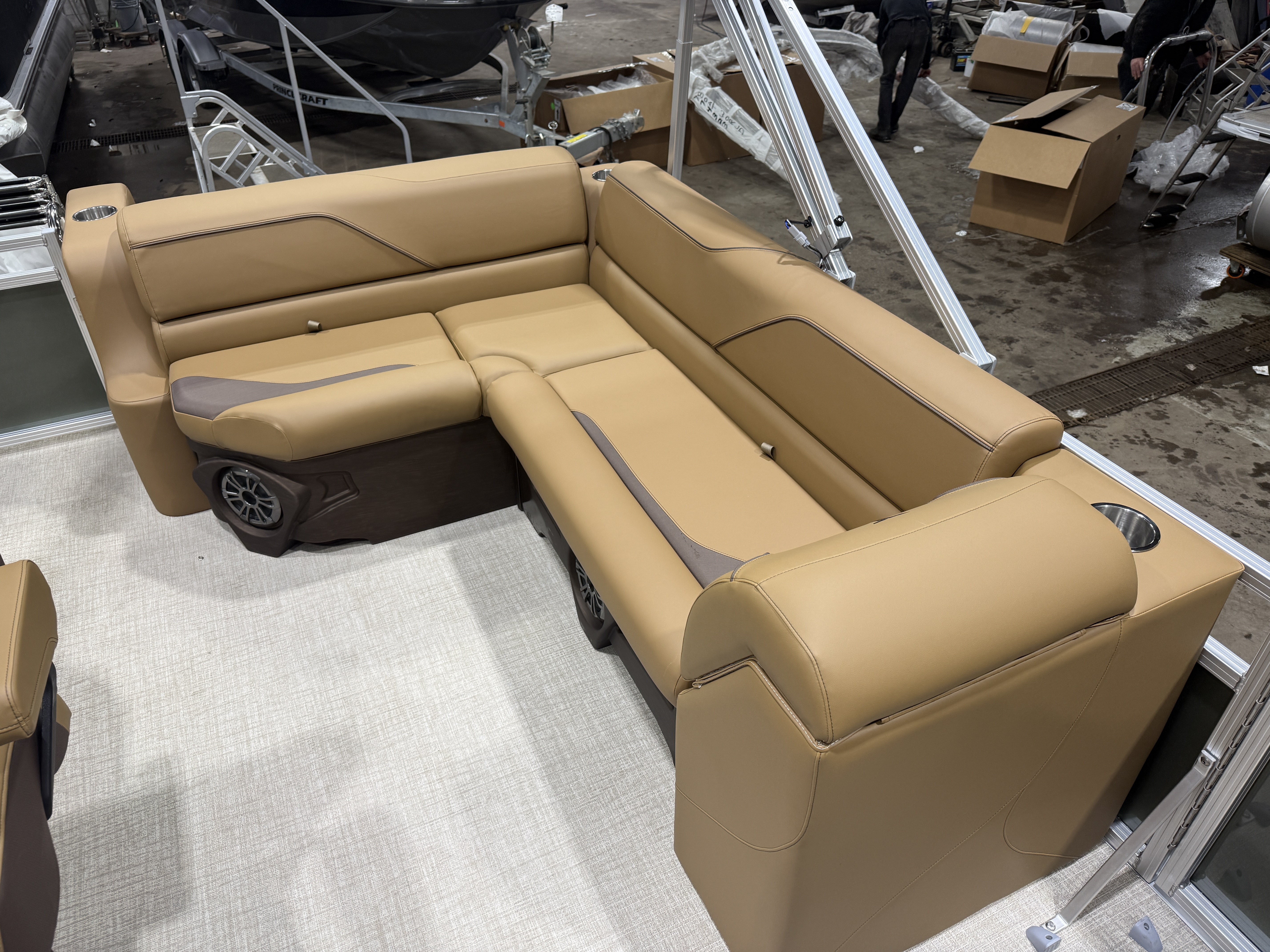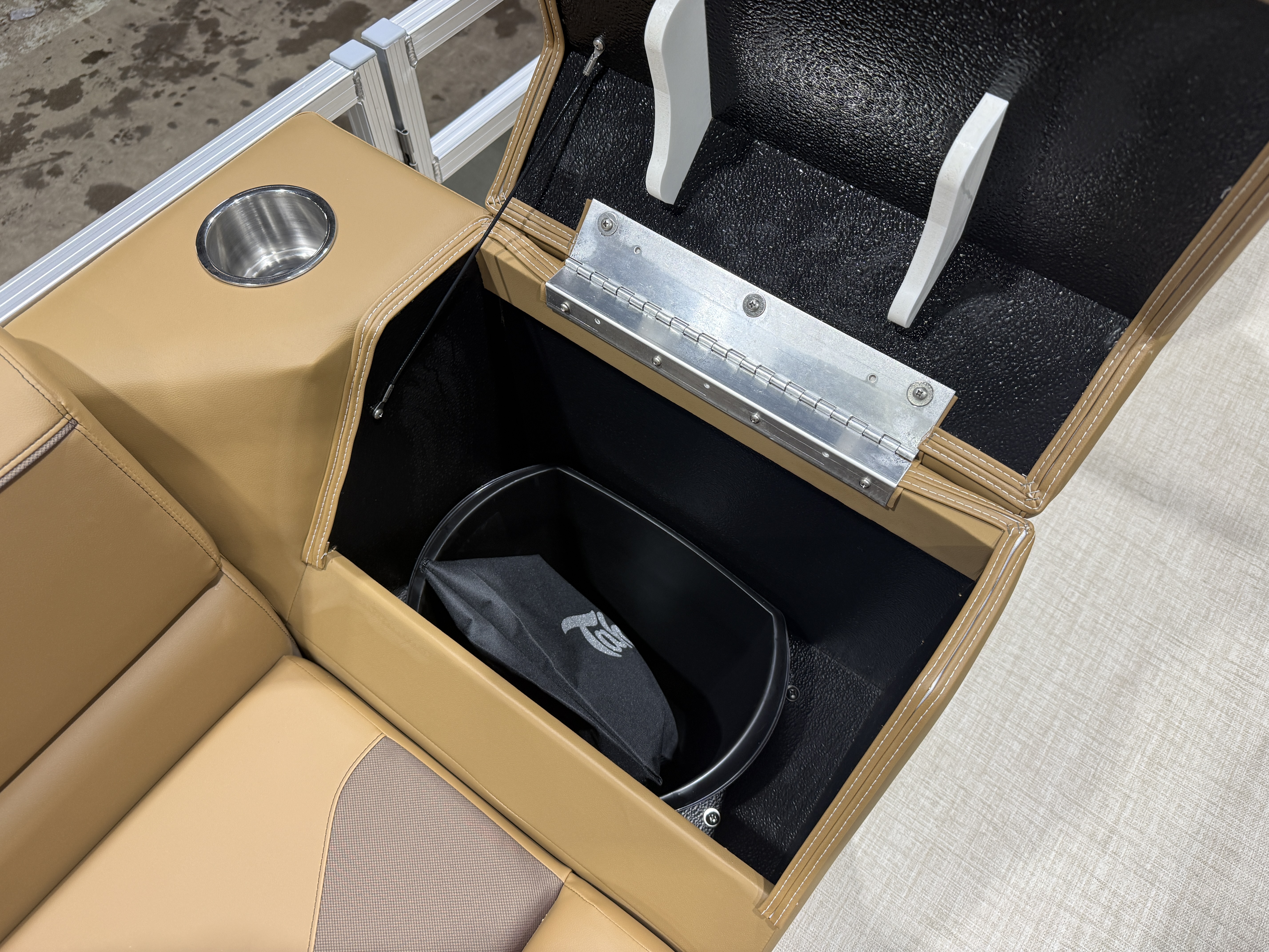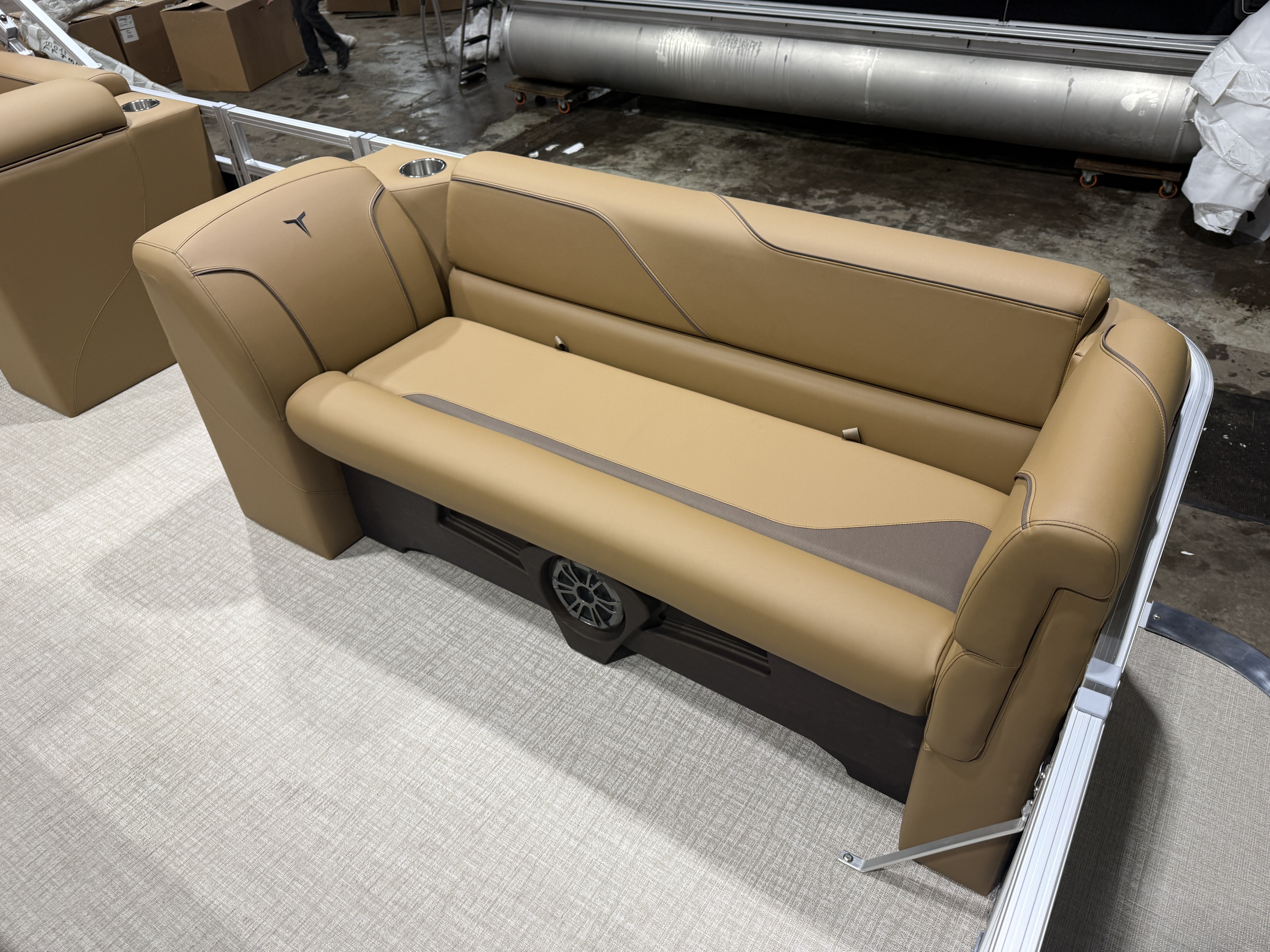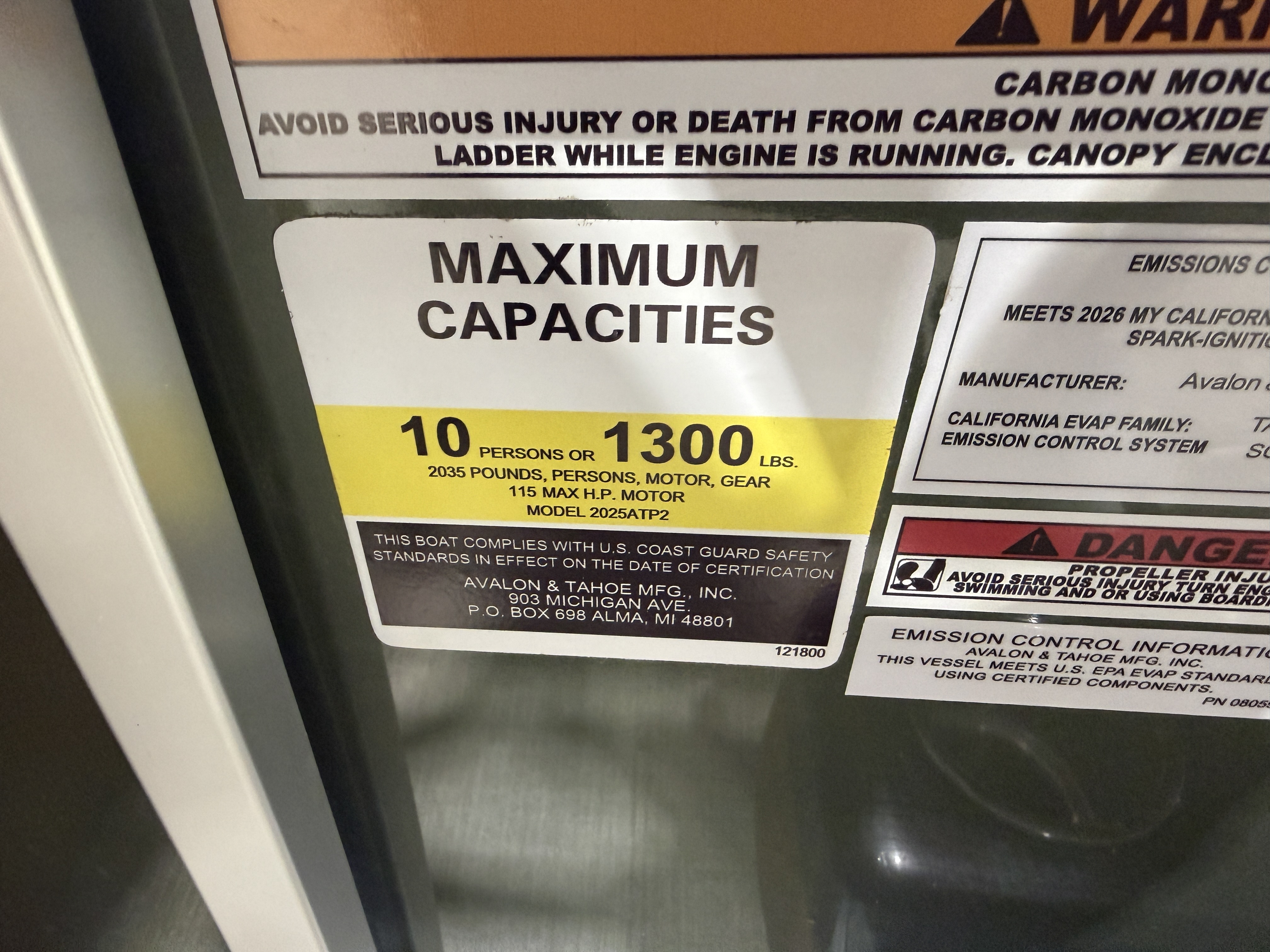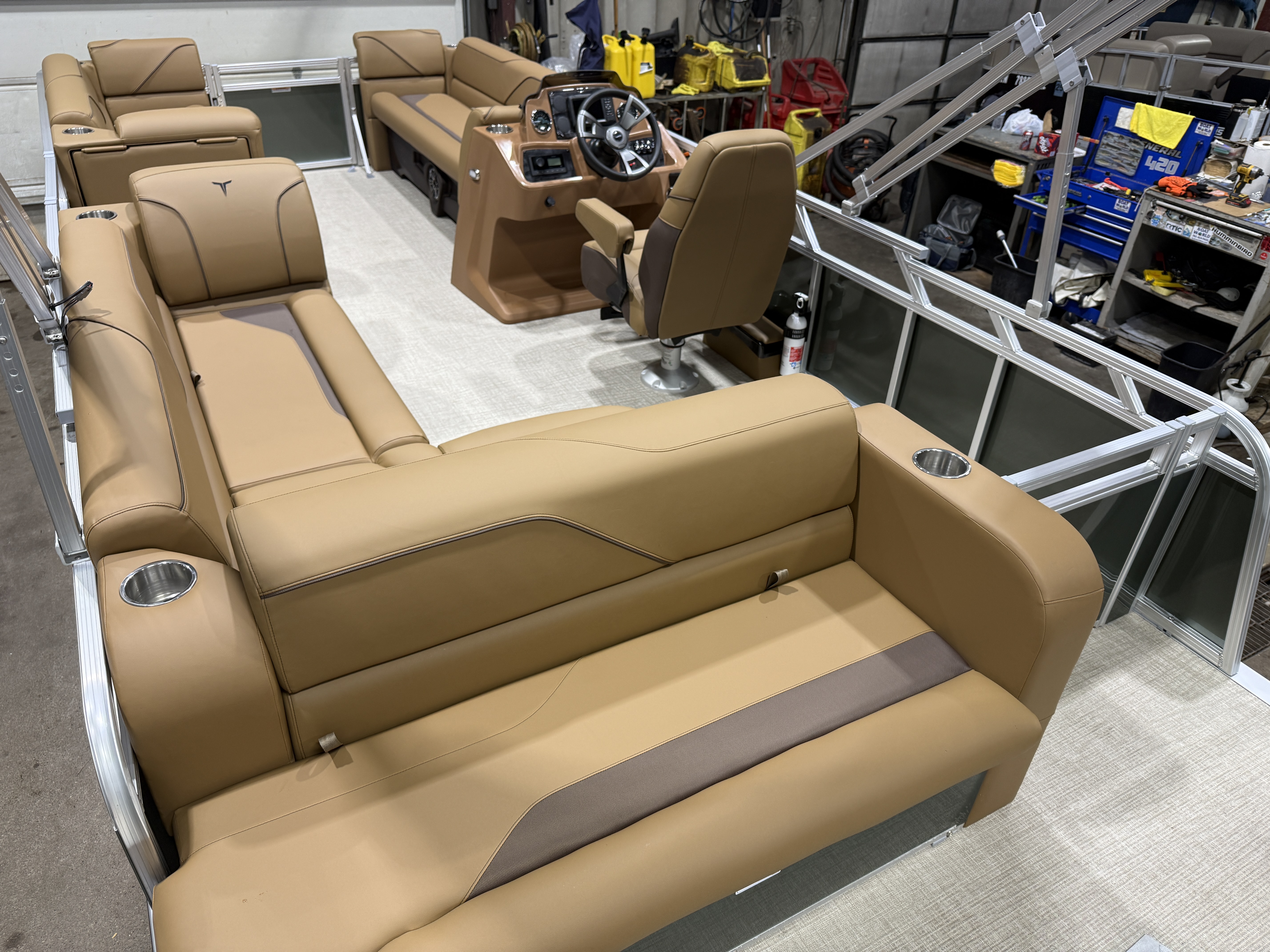 2026 Tahoe Sport 2180 Cruise Rear Bench Pontoon & Honda 4-Stroke EFI. This Pontoon Has Great Chaise Lounge Seating Up Front With Storage, Wrap Around Chaise Lounge Seating With Storage, Mid Back Reclining Commander Captain's Chair, Cognac Interior Package w/Expresso Accent, Rear Facing Bench Seat w/Storage, Fusion Bluetooth Radio, Built In 25 Gallon Gas Tank, Table, Multiple Cup Holders, Adjustable 10' Bimini Top, Sport Platinum Package (Garmin 52CV GPS Depth Finder, LED 90 Degree Smoked Chrome Docklights, Polished Corner Caps, Platinum Edition Special Badging), Built-In Trash Can, Ladder, Brushed Bronze Cladding, New Battery And Prop, On/Off Battery Switch, Mooring Cover, Riptide Vinyl Floor, Front And Rear Deck, 25" Tubes, LED NAV Lights, Smoked Chrome Logos, Tilt Steering, Bow USB Charging Port, Gauge Package w/Hour Meter. Rated For 10 People.
