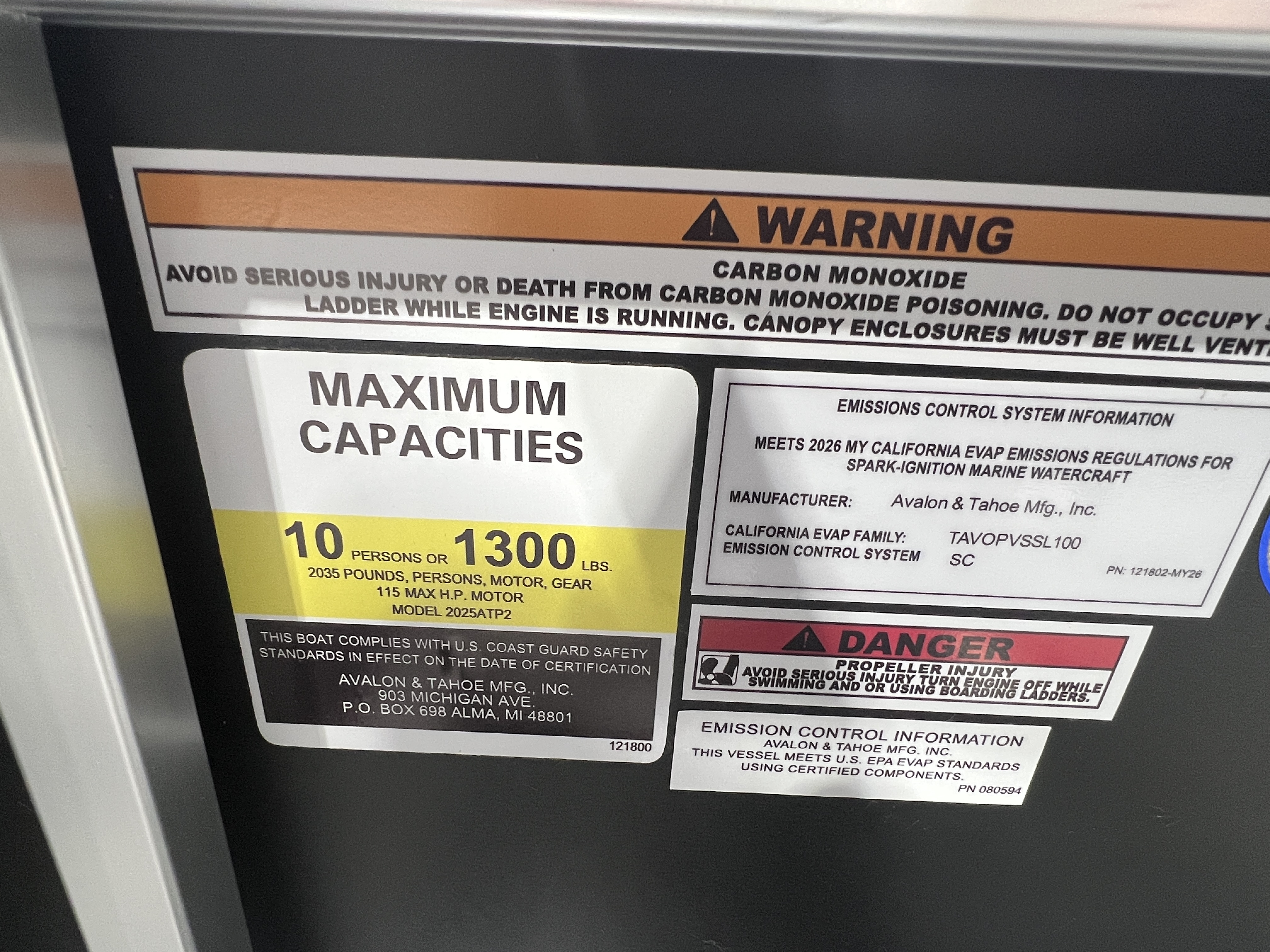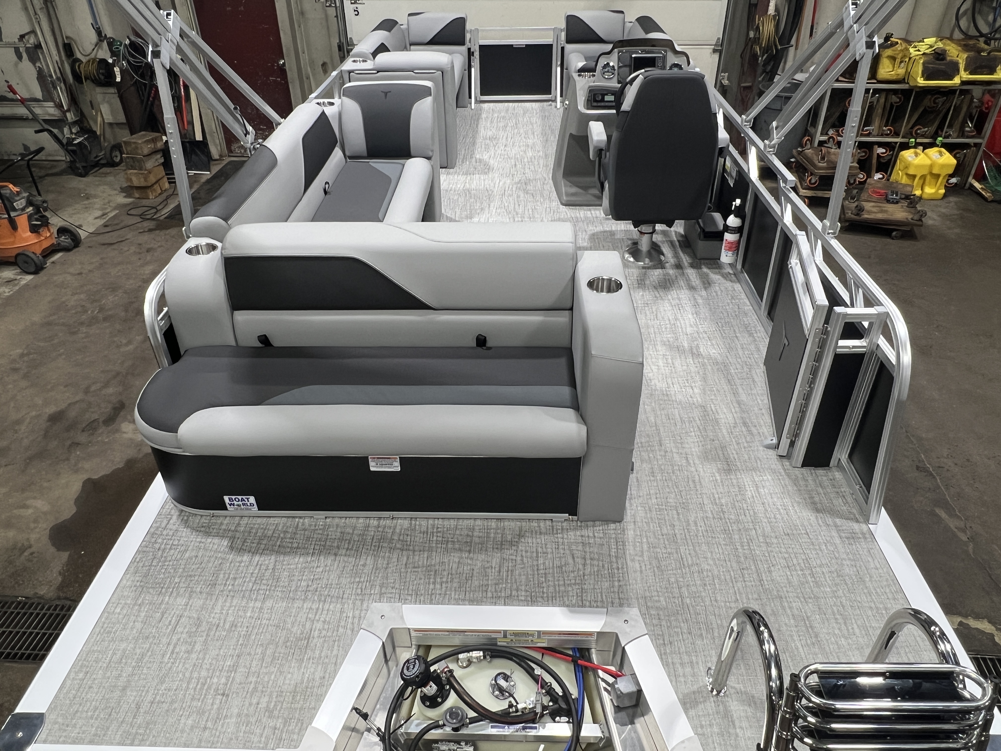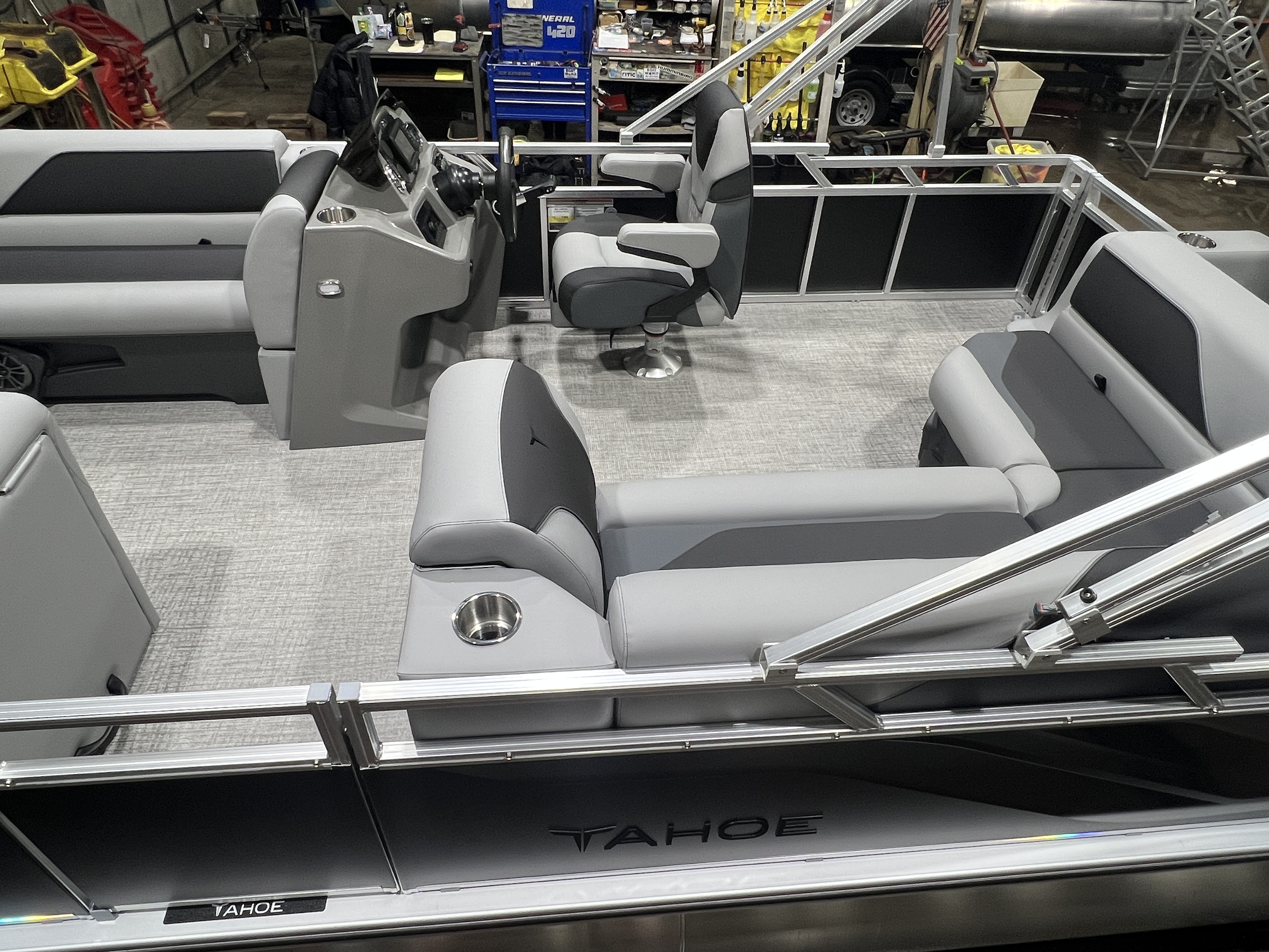 2026 Tahoe Sport 2180 Cruise Rear Bench Pontoon & Honda 4-Stroke EFI. This Pontoon Has Great Chaise Lounge Seating Up Front With Storage, Wrap Around Chaise Lounge Seating With Storage, Mid Back Reclining Commander Captain's Chair, Graphite Interior Package w/Kool Fab Black & Charcoal Accent, Rear Facing Bench Seat w/Storage, Fusion Bluetooth Radio, Built In 25 Gallon Gas Tank, Table, Multiple Cup Holders, Adjustable 10' Bimini Top, Sport Platinum Package (Garmin 52CV GPS Depth Finder, LED 90 Degree Smoked Chrome Docklights, Polished Corner Caps, Platinum Edition Special Badging), Built-In Trash Can, Ladder, Charcoal Cladding, New Battery And Prop, On/Off Battery Switch, Mooring Cover, Riptide Vinyl Floor, Front And Rear Deck, 25" Tubes, LED NAV Lights, Smoked Chrome Logos, Tilt Steering, Bow USB Charging Port, Gauge Package w/Hour Meter. Rated For 10 People.