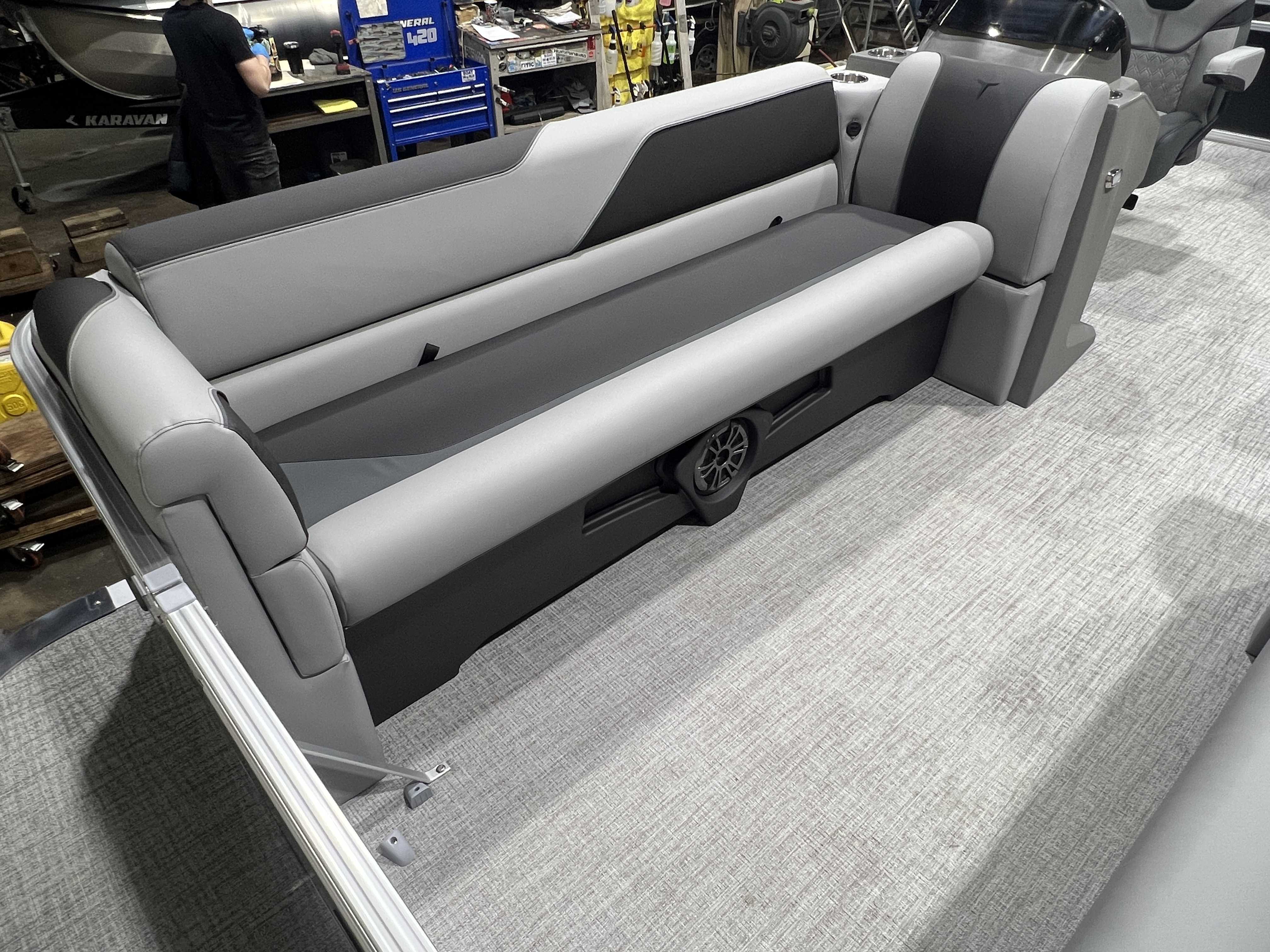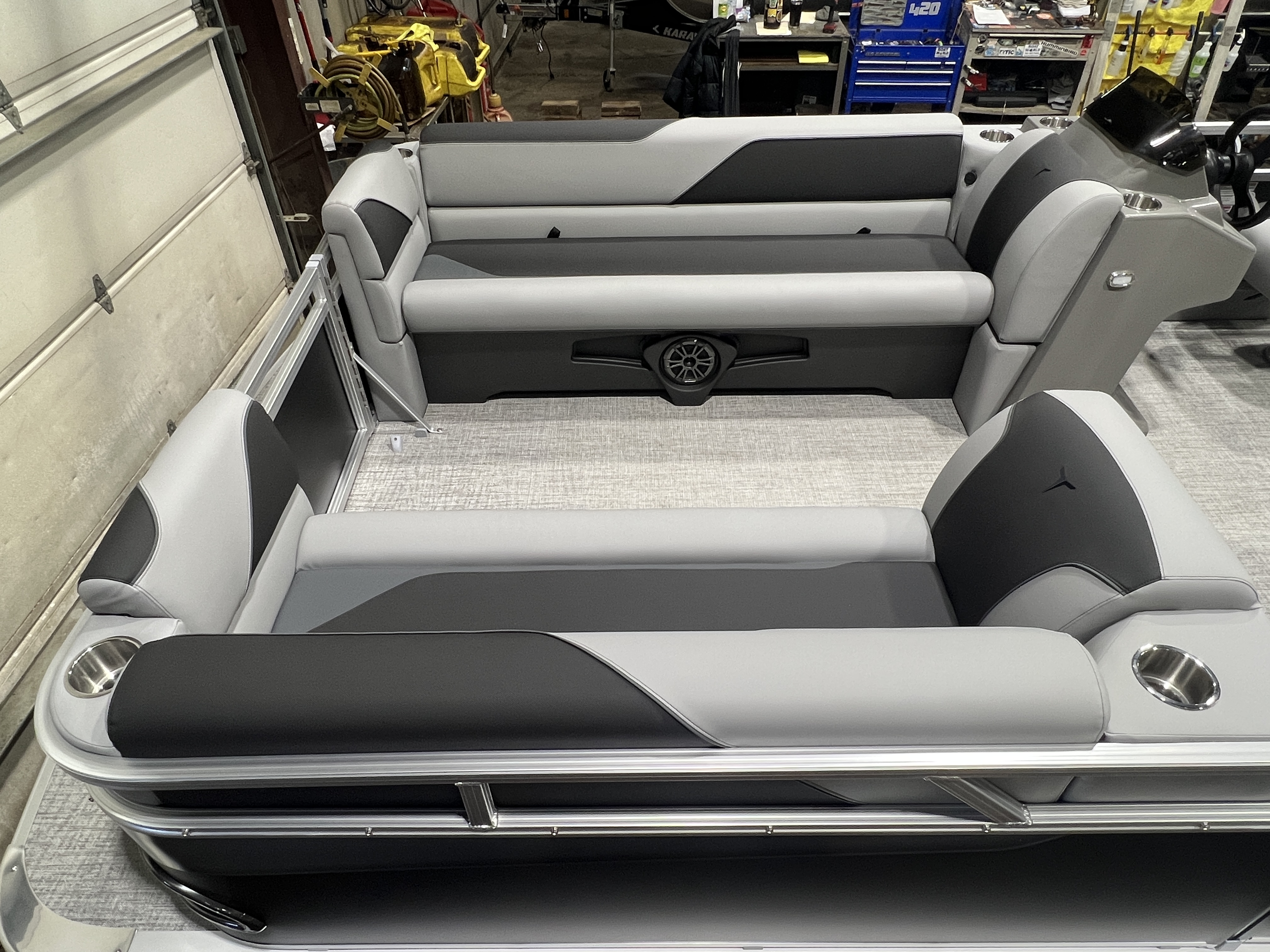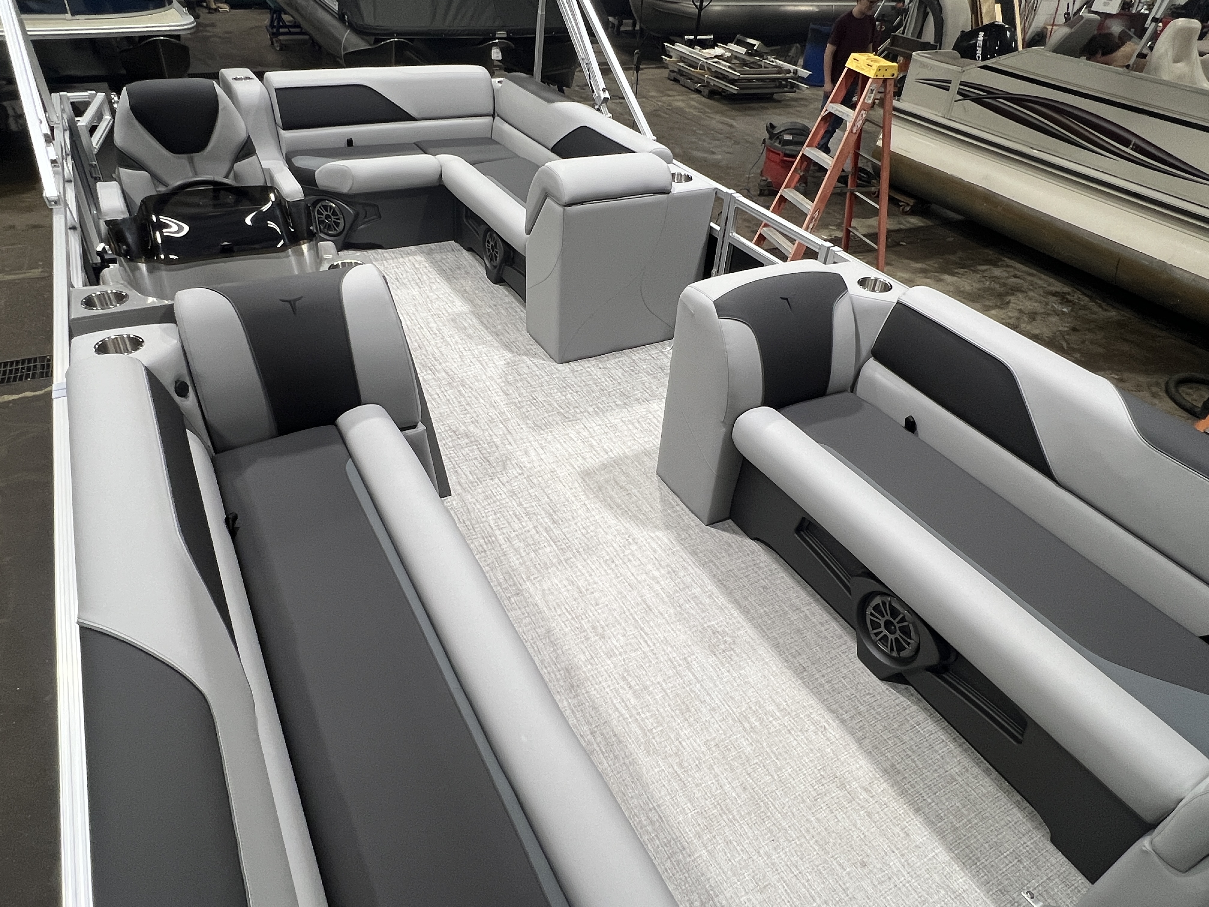 2026 Tahoe Sport 2180 Cruise Rear Bench Pontoon & Honda 4-Stroke EFI. This Pontoon Has Great Chaise Lounge Seating Up Front With Storage, Wrap Around Chaise Lounge Seating With Storage, Mid Back Reclining Commander Captain's Chair, Graphite Interior Package w/Kool Fab Black & Charcoal Accent, Rear Facing Bench Seat w/Storage, Fusion Bluetooth Radio, Built In 25 Gallon Gas Tank, Table, Multiple Cup Holders, Adjustable 10' Bimini Top, Sport Platinum Package (Garmin 52CV GPS Depth Finder, LED 90 Degree Smoked Chrome Docklights, Polished Corner Caps, Platinum Edition Special Badging), Built-In Trash Can, Ladder, Charcoal Cladding, New Battery And Prop, On/Off Battery Switch, Mooring Cover, Riptide Vinyl Floor, Front And Rear Deck, 25" Tubes, LED NAV Lights, Smoked Chrome Logos, Tilt Steering, Bow USB Charging Port, Gauge Package w/Hour Meter. Rated For 10 People.