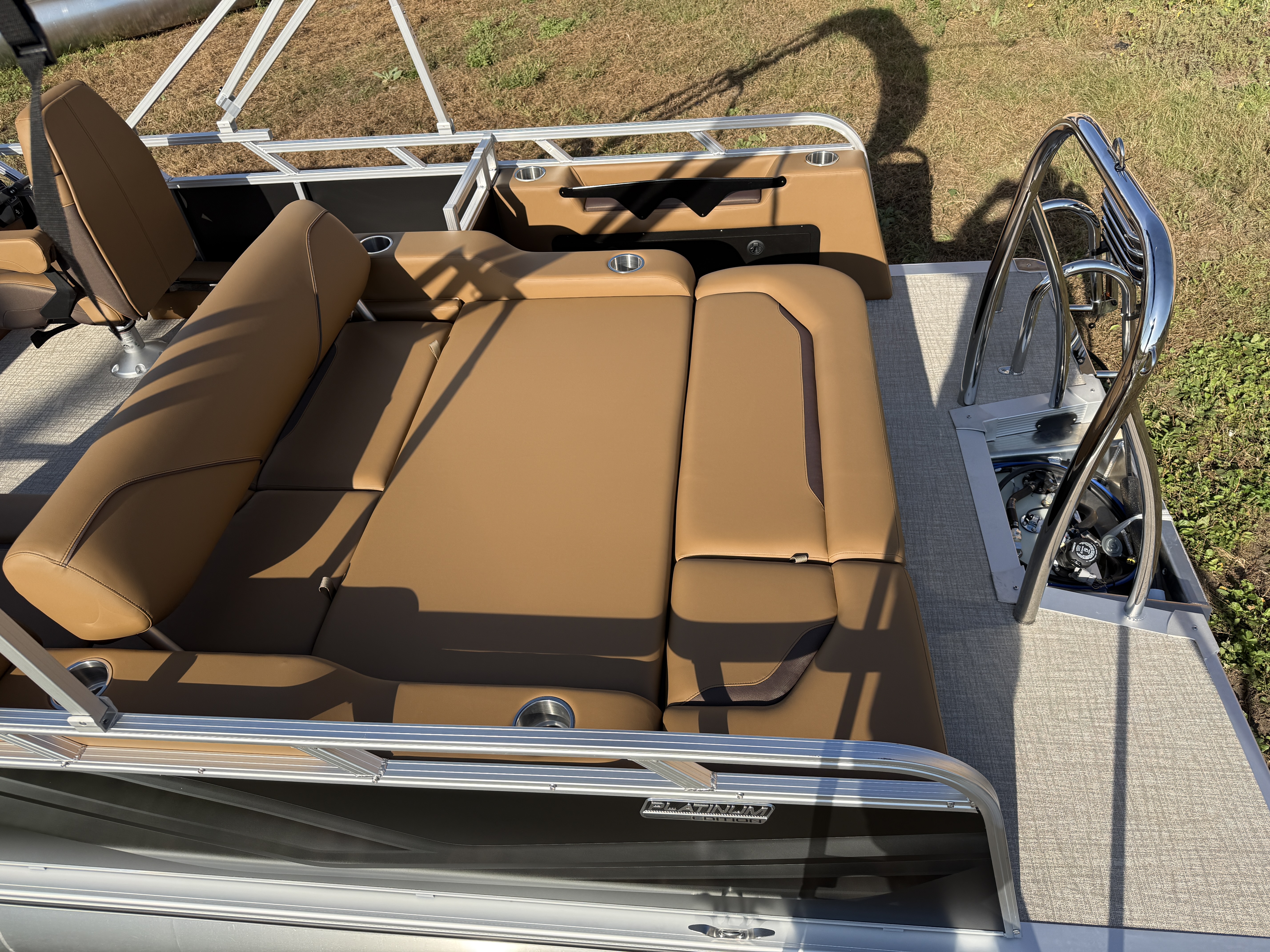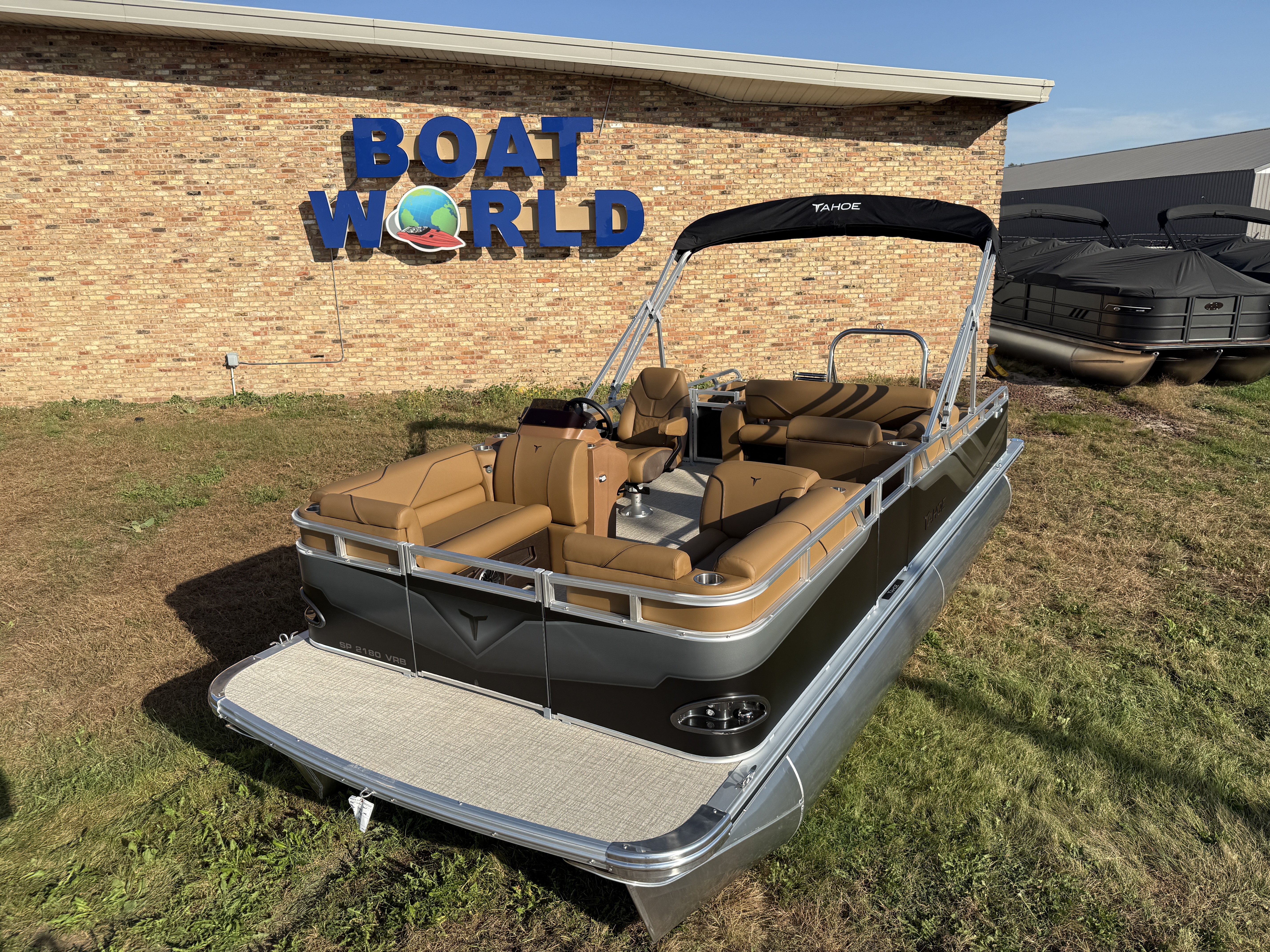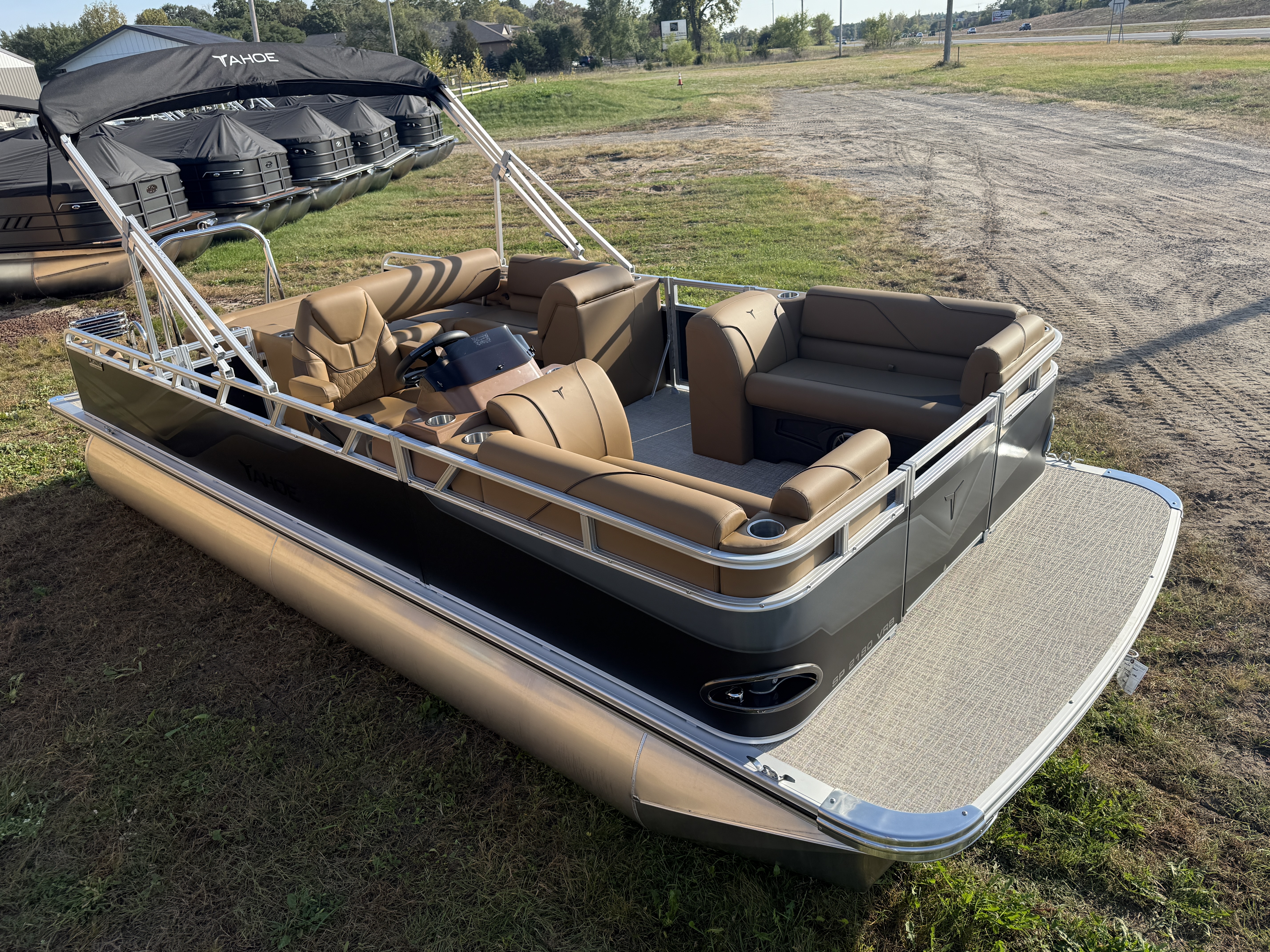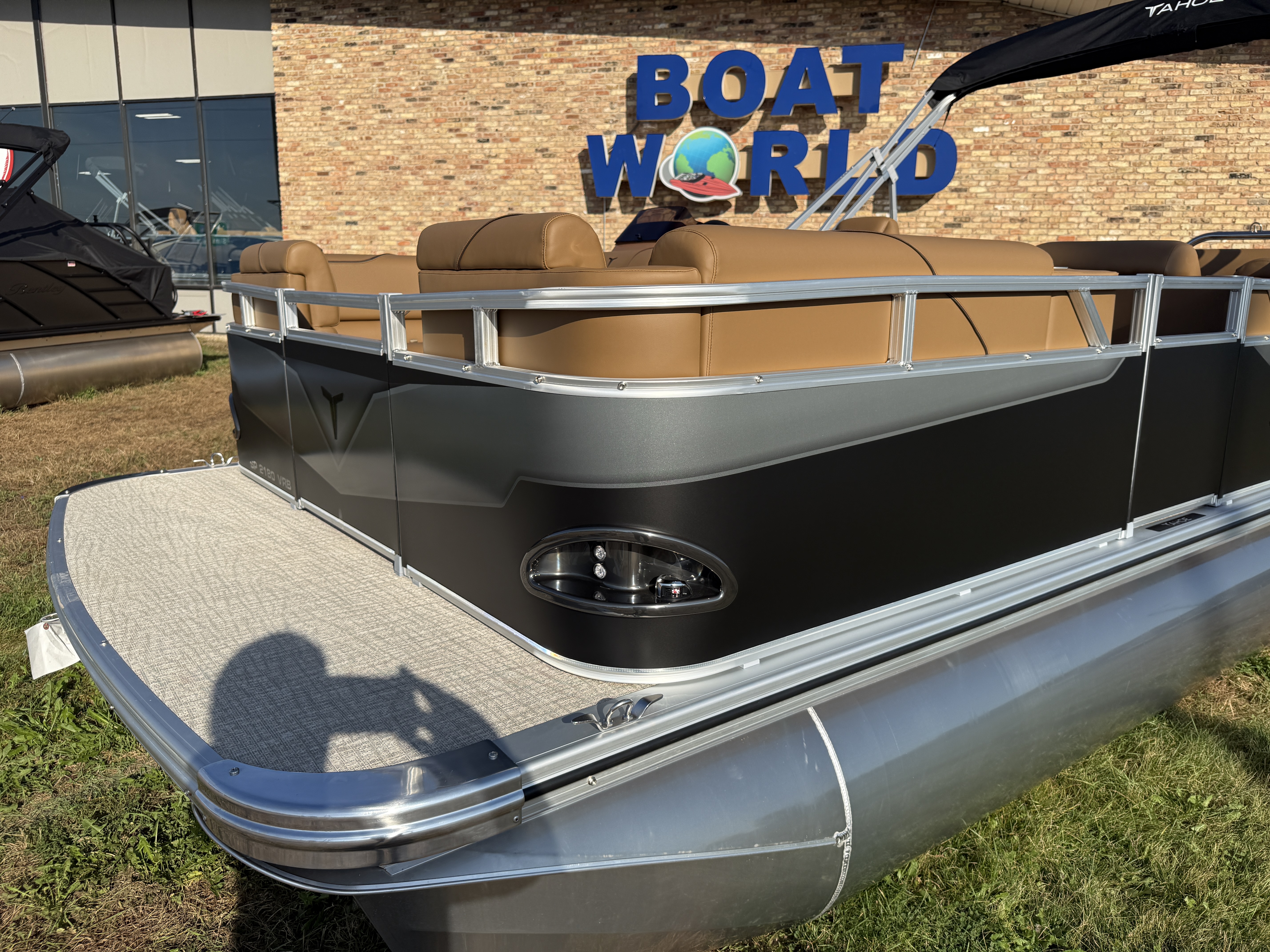 2026 Tahoe Sport 2180 Versatile Rear Bench (VRB) Swingback Pontoon & Honda 4-Stroke EFI. This 21' Matte Black Walls Platinum Edition Pontoon Has Front Chaise Lounge Seating With Storage, Upgraded Commander Reclining Captain's Chair, Wrap Around Chaise Lounge Seating With Storage, Seating That Turns Into A Bed Or Rear Facing Bench Seating, Sport Platinum Edition (Garmin 52CV GPS Depth Finder, Polished Corner Caps, 90 Degree LED Docking Lights, Platinum Edition Special Badging), Rear Swim Deck, Riptide Vinyl Flooring, Greywood Rectangle Table, Mooring Cover, Built-In 25 Gallon Gas Tank, Fusion Bluetooth Radio, Multiple Cup Holders, 25" Tubes, 10' Bimini Top, Gated Aft, Cognac Interior Package, Bow & Aft USB Charging Ports, Ladder, Battery On/Off Switch, Tilt Steering, Smoked Chrome Logos, Built-In Trash Can, Side Storage Behind Captain's Seat, Front Deck. Rated For 10 People
