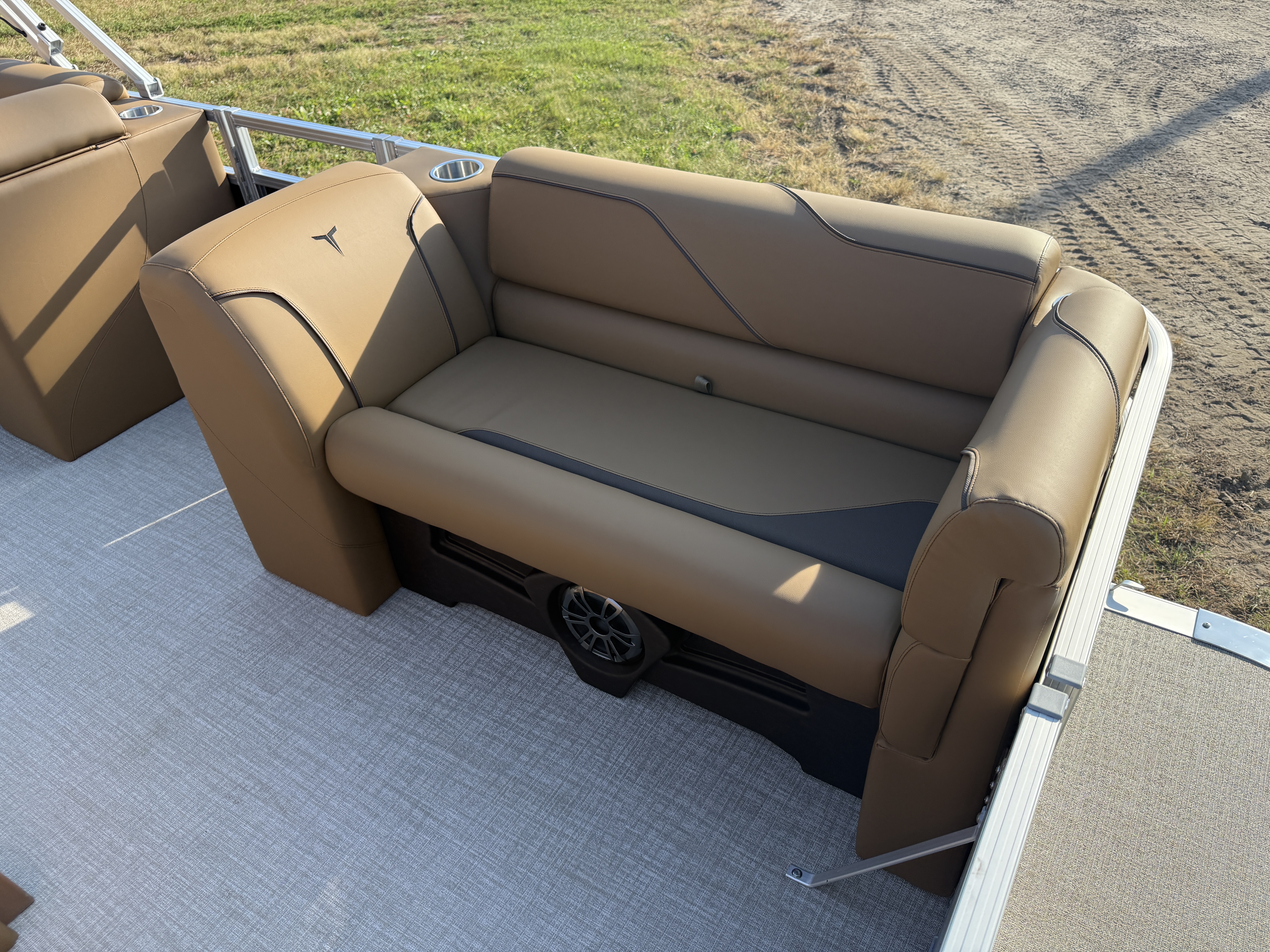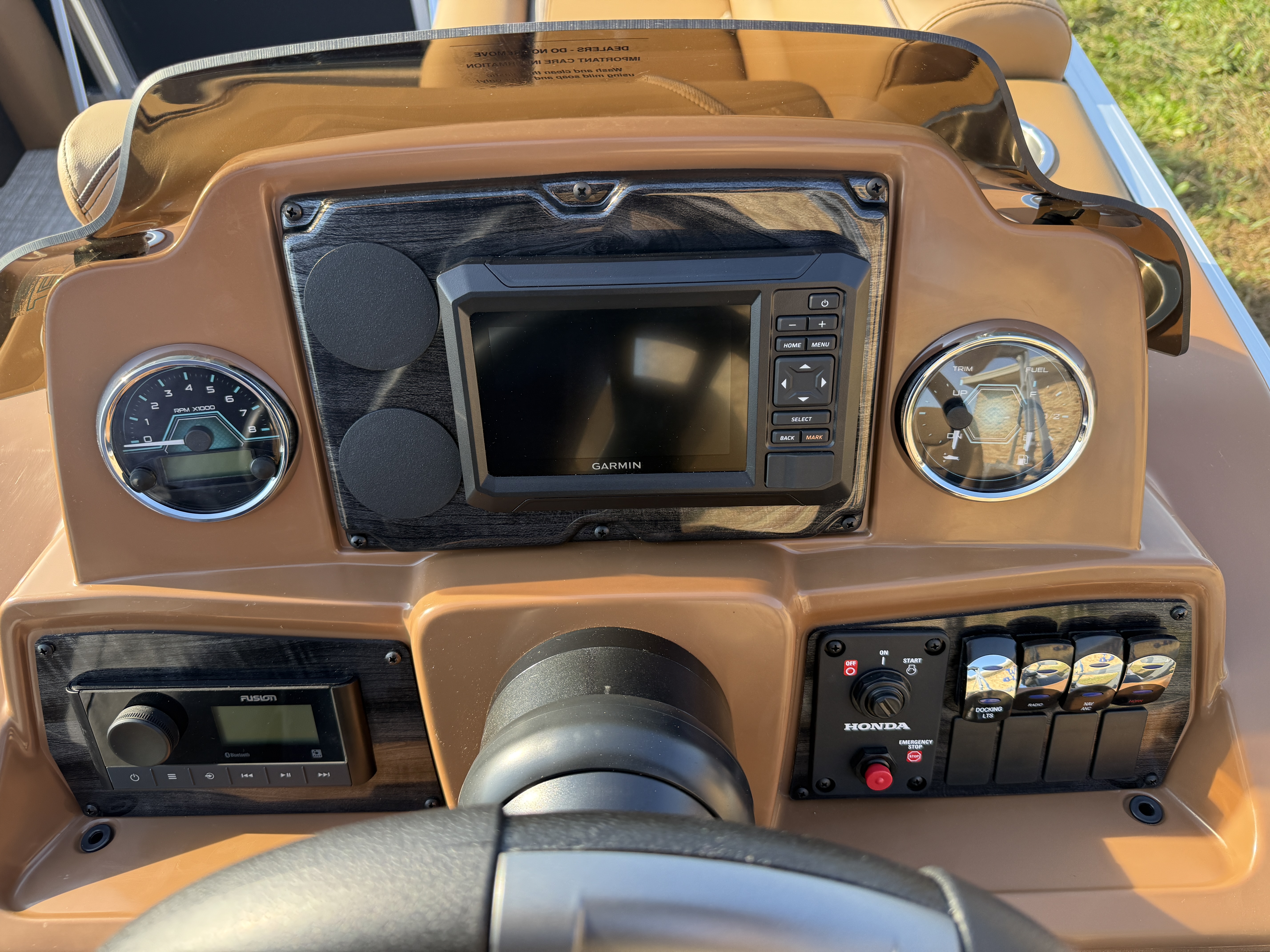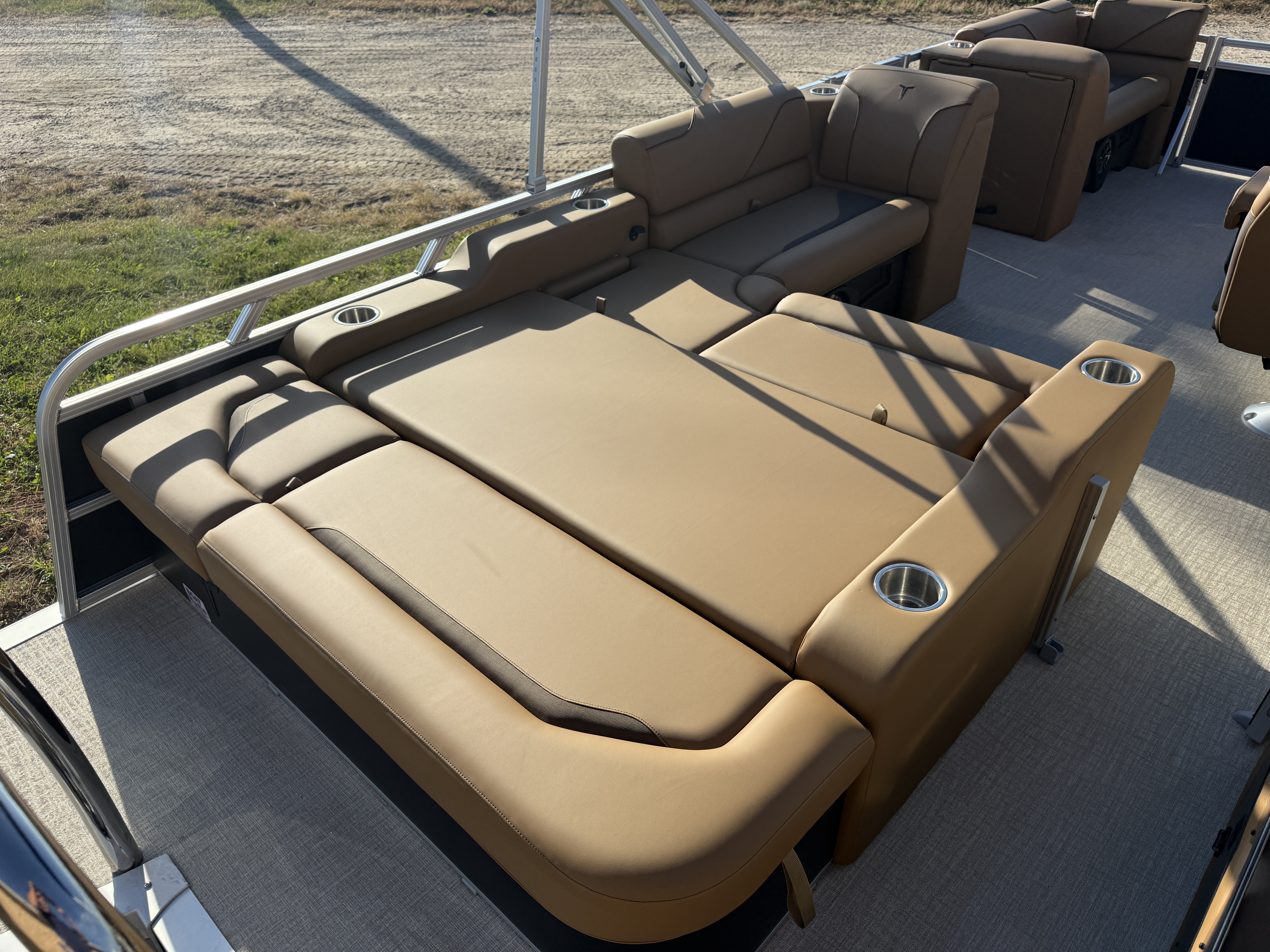 2026 Tahoe Sport 2180 Versatile Rear Bench (VRB) Swingback Pontoon & Honda 4-Stroke EFI. This 21' Matte Black Walls Platinum Edition Pontoon Has Front Chaise Lounge Seating With Storage, Upgraded Commander Reclining Captain's Chair, Wrap Around Chaise Lounge Seating With Storage, Seating That Turns Into A Bed Or Rear Facing Bench Seating, Sport Platinum Edition (Garmin 52CV GPS Depth Finder, Polished Corner Caps, 90 Degree LED Docking Lights, Platinum Edition Special Badging), Rear Swim Deck, Riptide Vinyl Flooring, Greywood Rectangle Table, Mooring Cover, Built-In 25 Gallon Gas Tank, Fusion Bluetooth Radio, Multiple Cup Holders, 25" Tubes, 10' Bimini Top, Gated Aft, Cognac Interior Package, Bow & Aft USB Charging Ports, Ladder, Battery On/Off Switch, Tilt Steering, Smoked Chrome Logos, Built-In Trash Can, Side Storage Behind Captain's Seat, Front Deck. Rated For 10 People