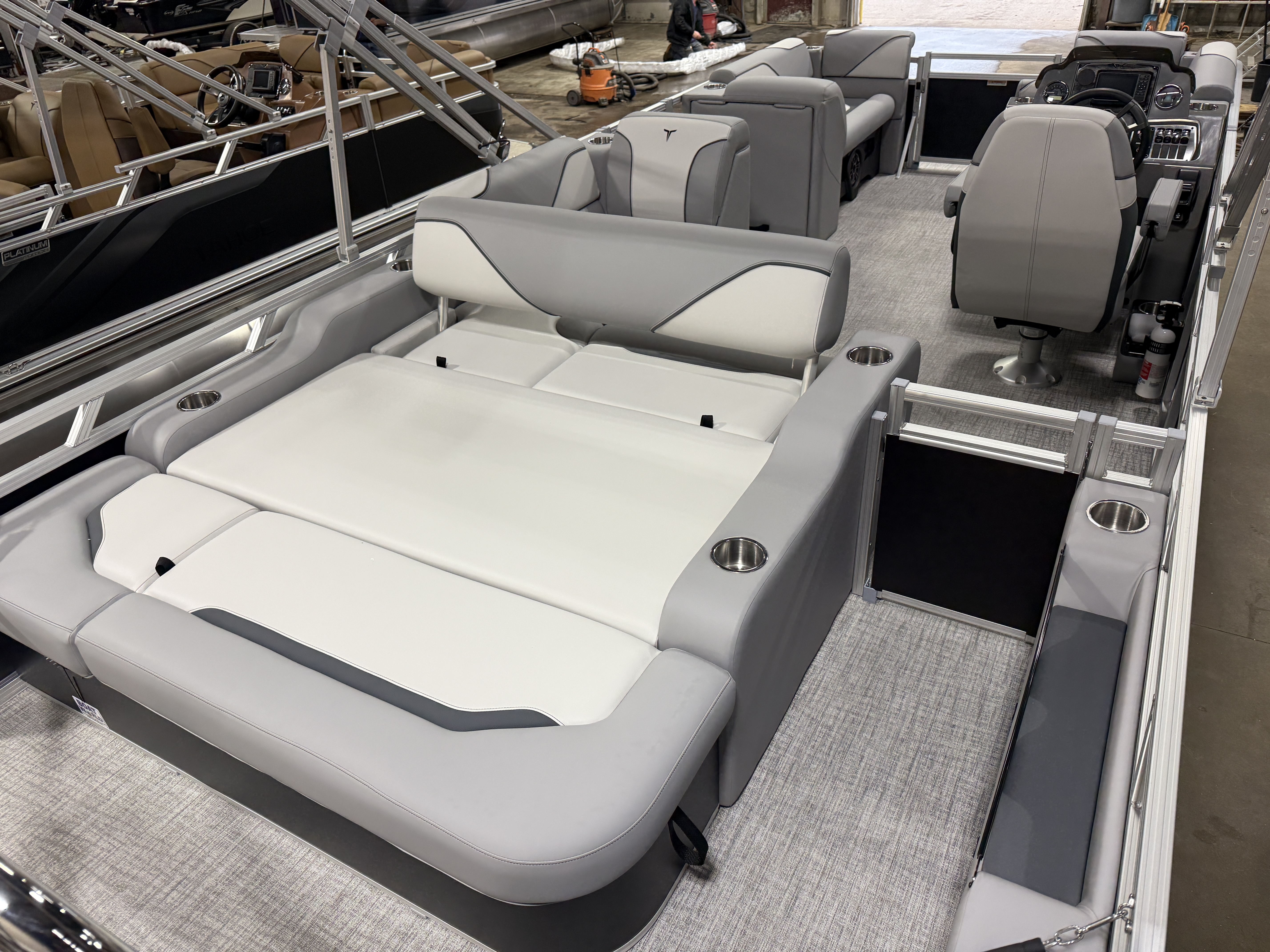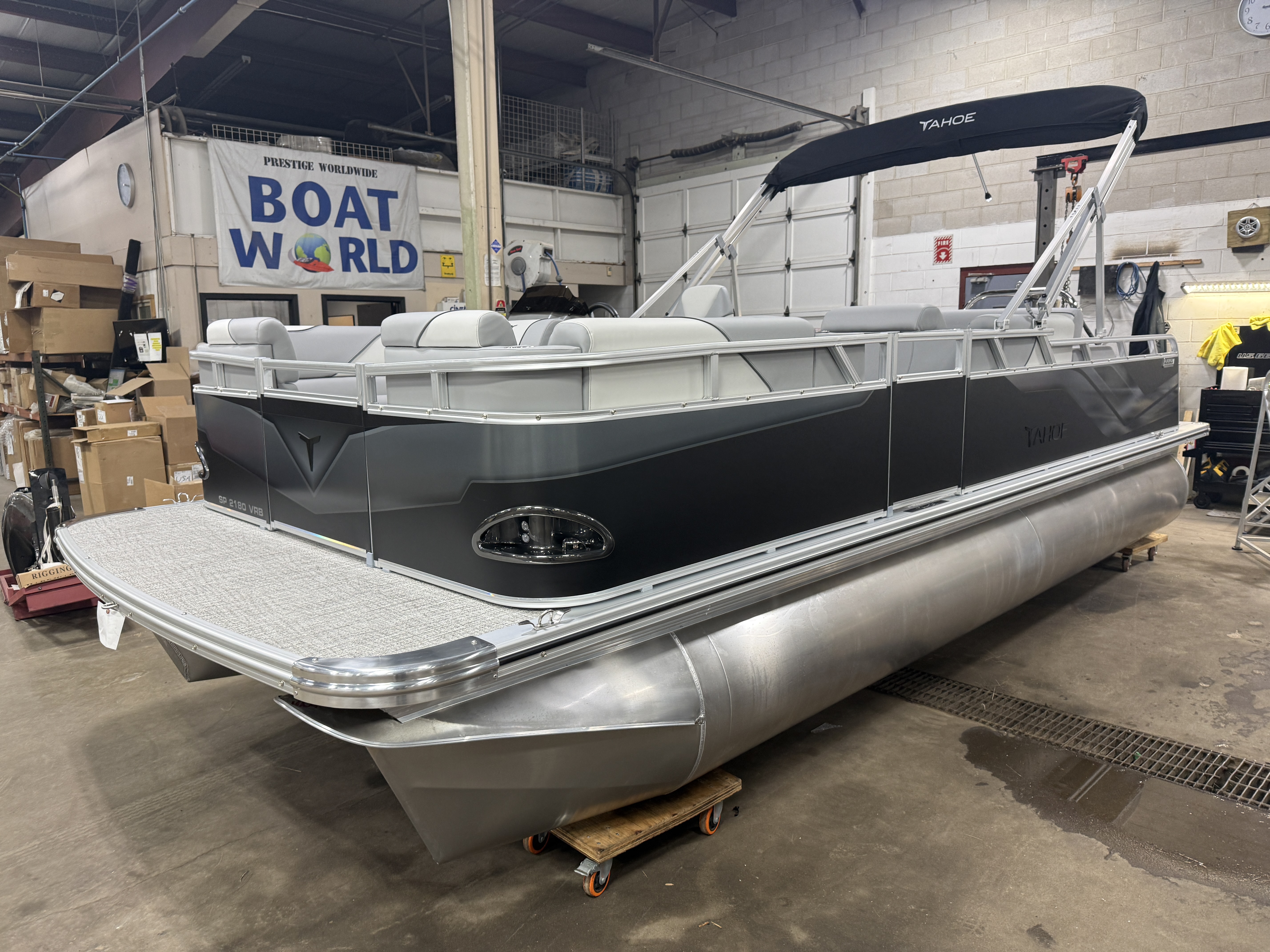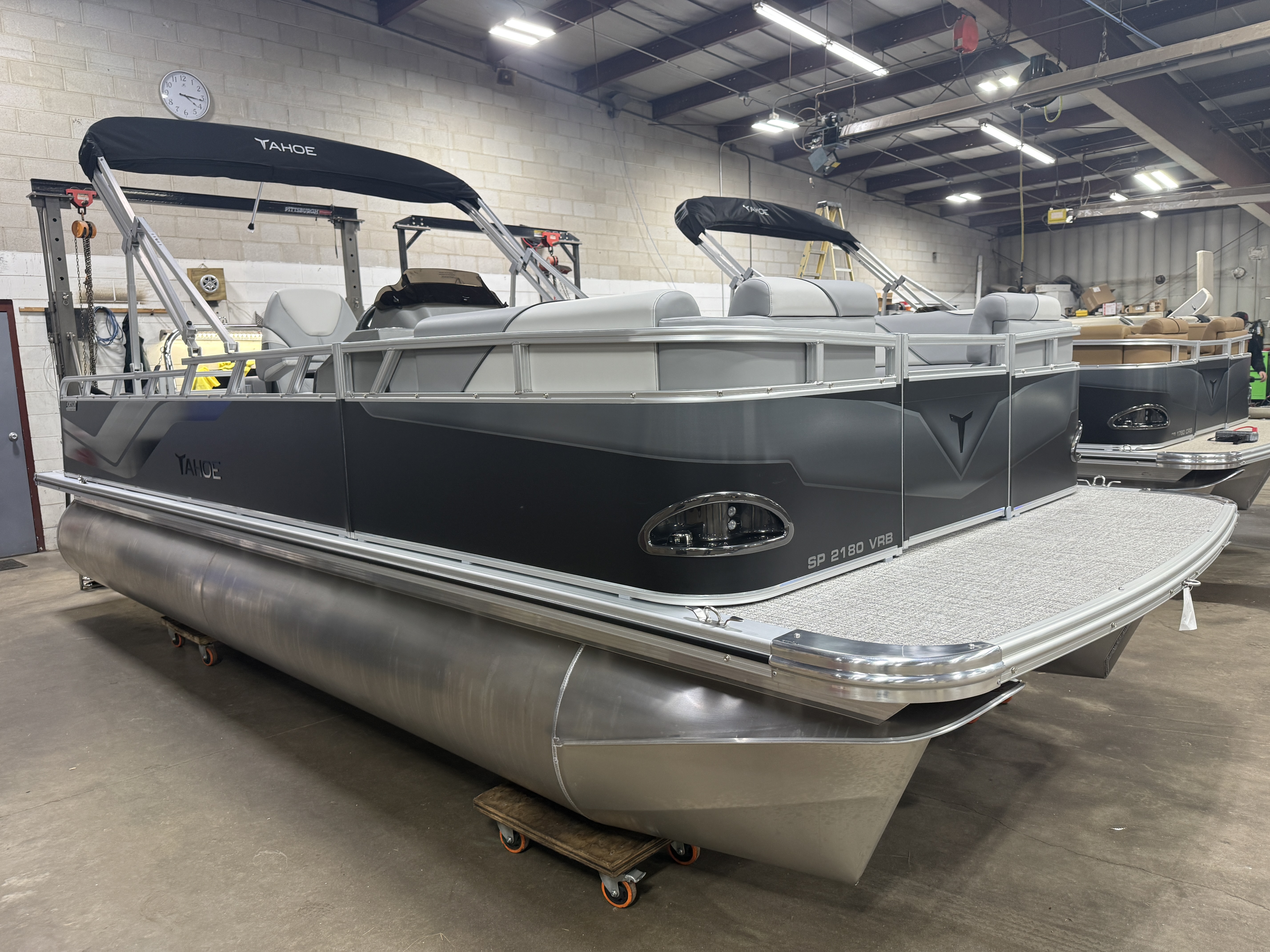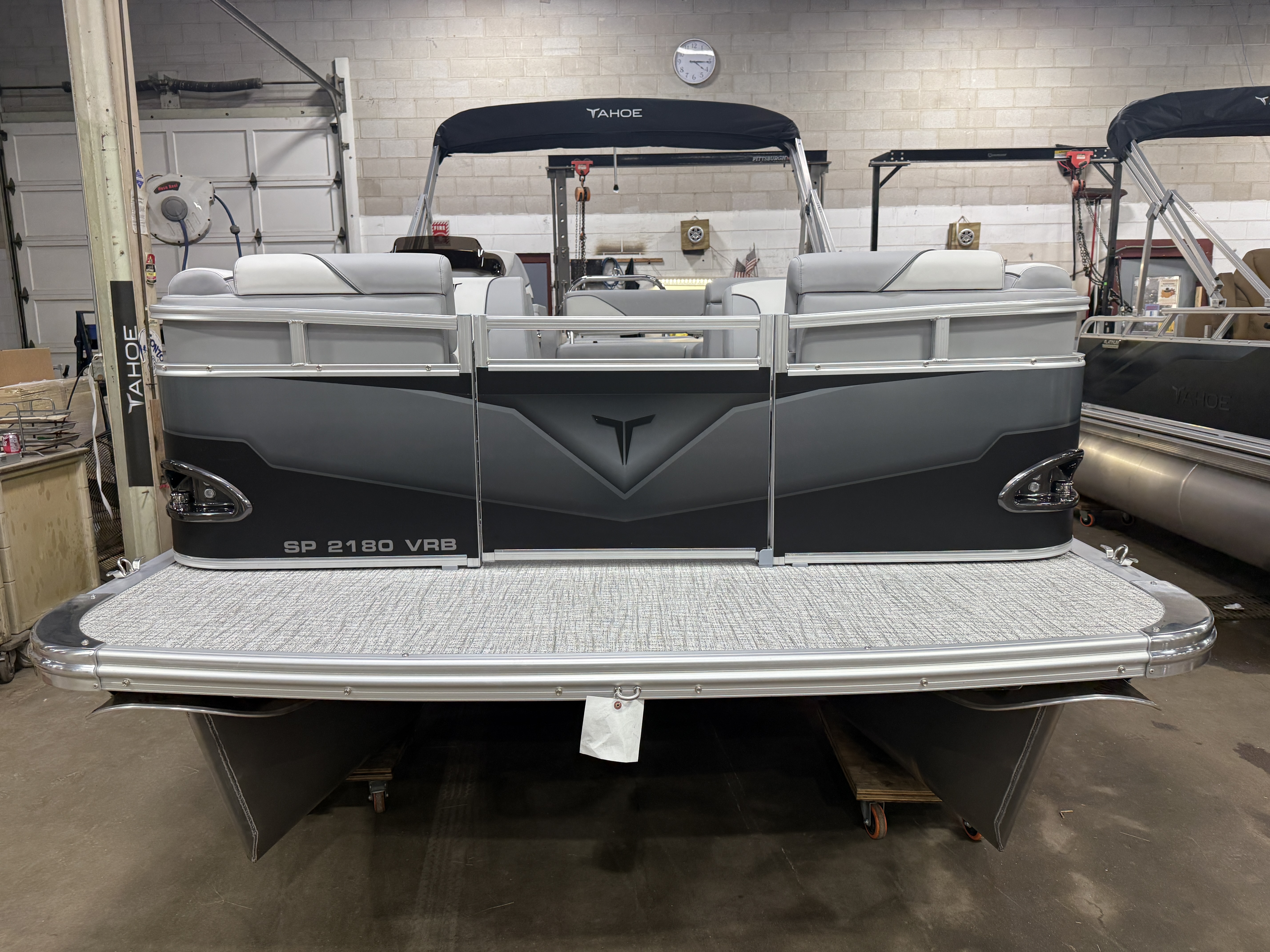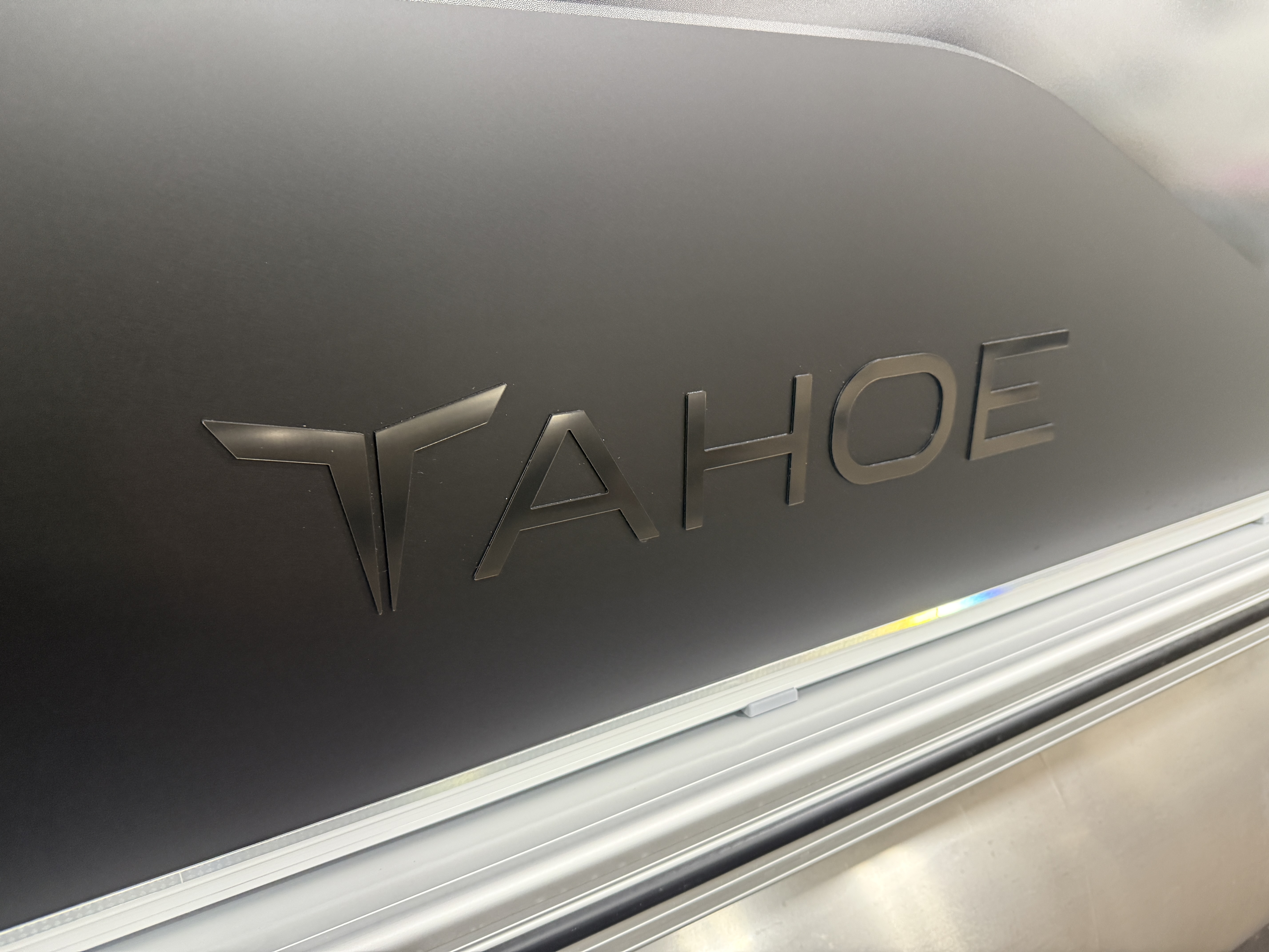 2026 Tahoe Sport 2180 Versatile Rear Bench (VRB) Swingback Pontoon & Honda 4-Stroke EFI. This 21' Matte Black Walls Platinum Edition Pontoon Has Front Chaise Lounge Seating With Storage, Upgraded Commander Reclining Captain's Chair, Wrap Around Chaise Lounge Seating With Storage, Seating That Turns Into A Bed Or Rear Facing Bench Seating, Sport Platinum Edition (Garmin 52CV GPS Depth Finder, Polished Corner Caps, 90 Degree LED Docking Lights, Platinum Edition Special Badging), Rear Swim Deck, Riptide Vinyl Flooring, Greywood Rectangle Table, Mooring Cover, Built-In 25 Gallon Gas Tank, Fusion Bluetooth Radio, Multiple Cup Holders, 25" Tubes, 10' Bimini Top, Gated Aft, Graphite Interior Package, Bow & Aft USB Charging Ports, Ladder, Battery On/Off Switch, Tilt Steering, Smoked Chrome Logos, Built-In Trash Can, Side Storage Behind Captain's Seat, Front Deck. Rated For 10 People