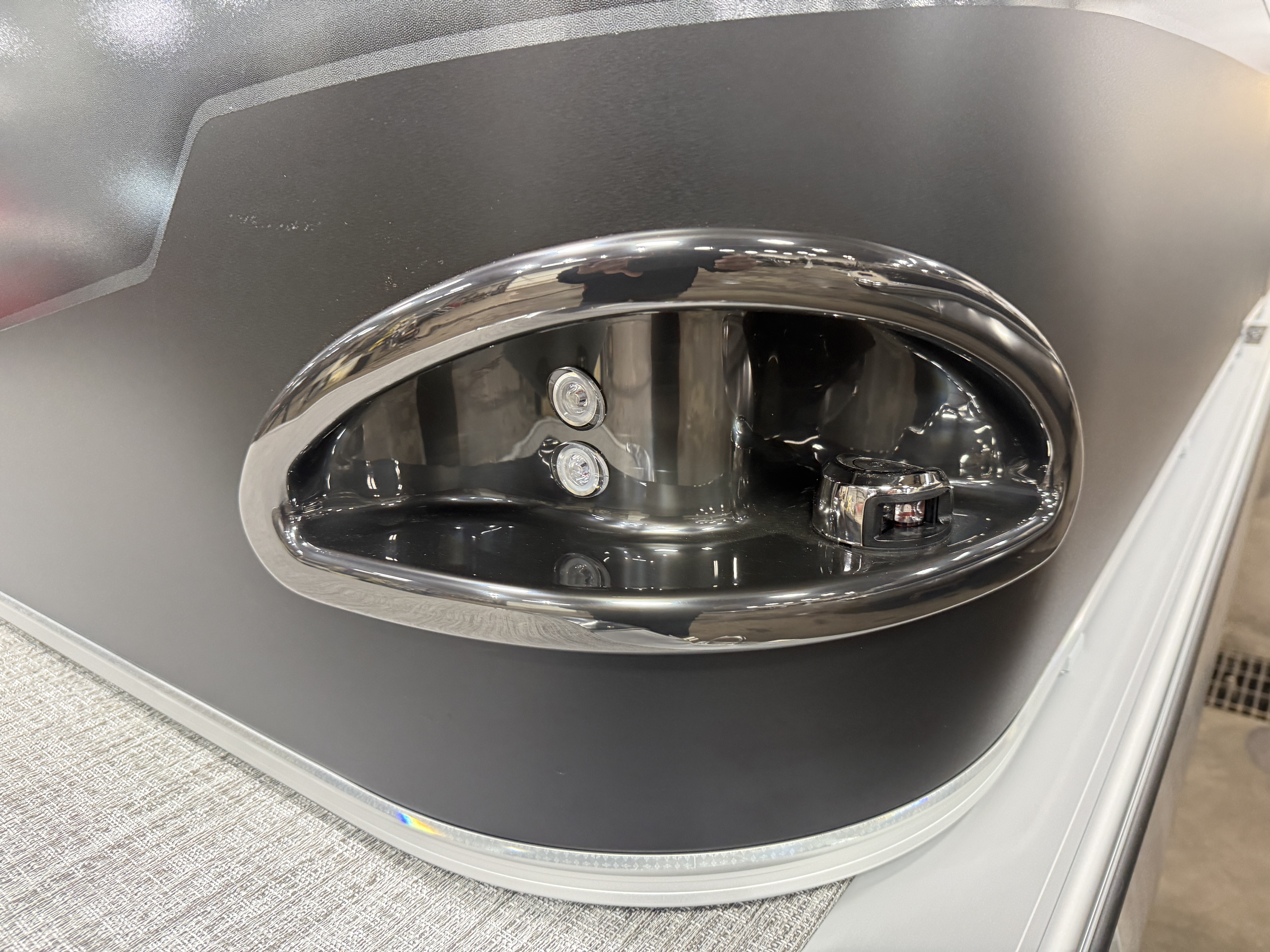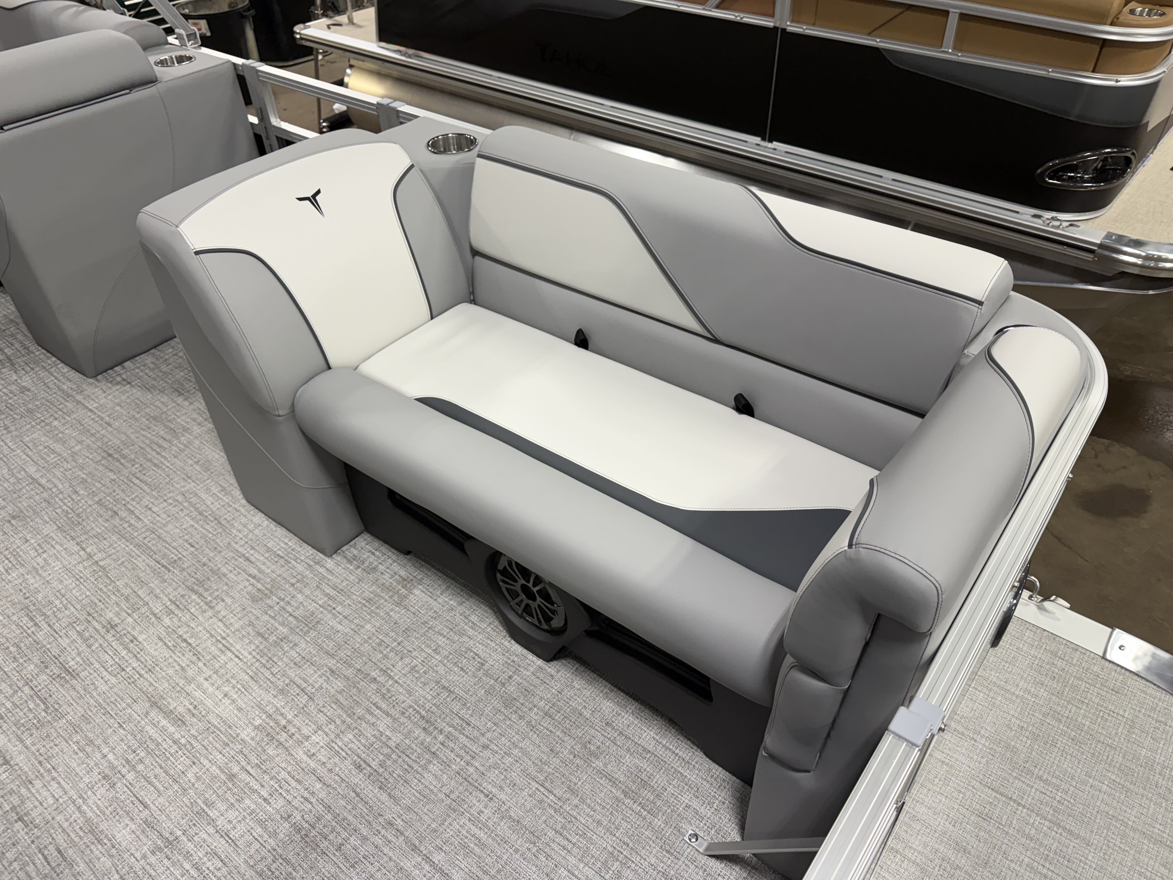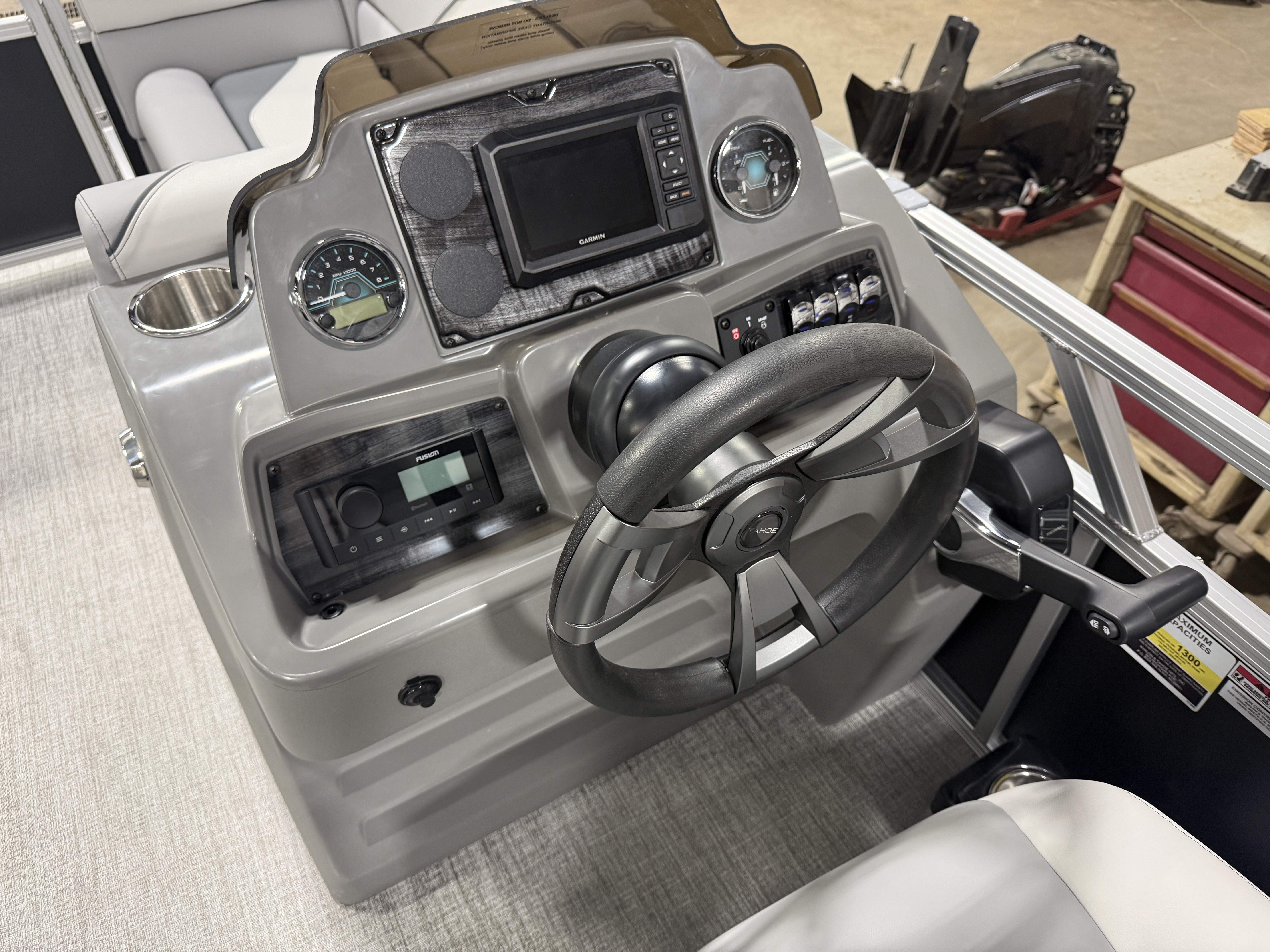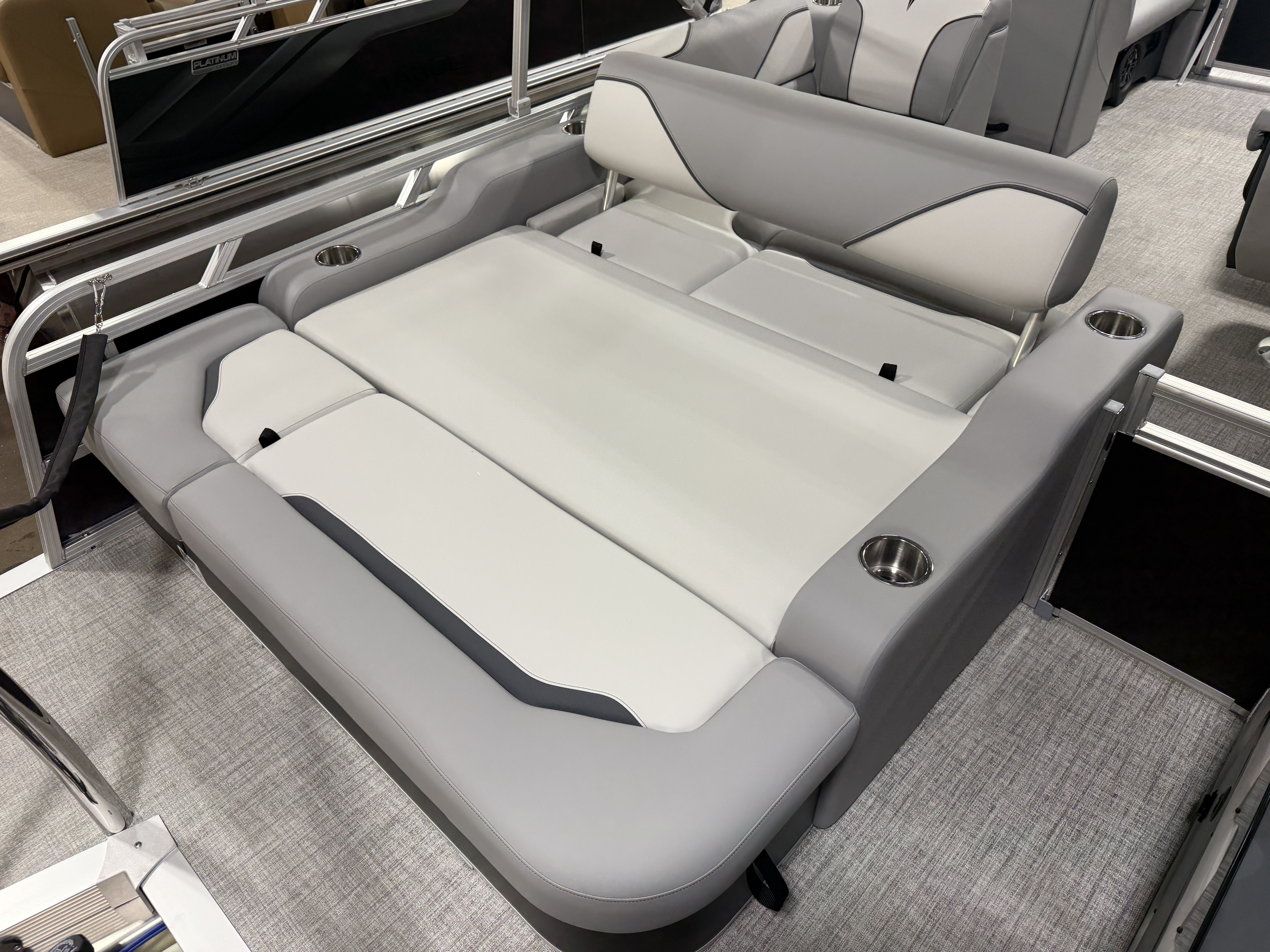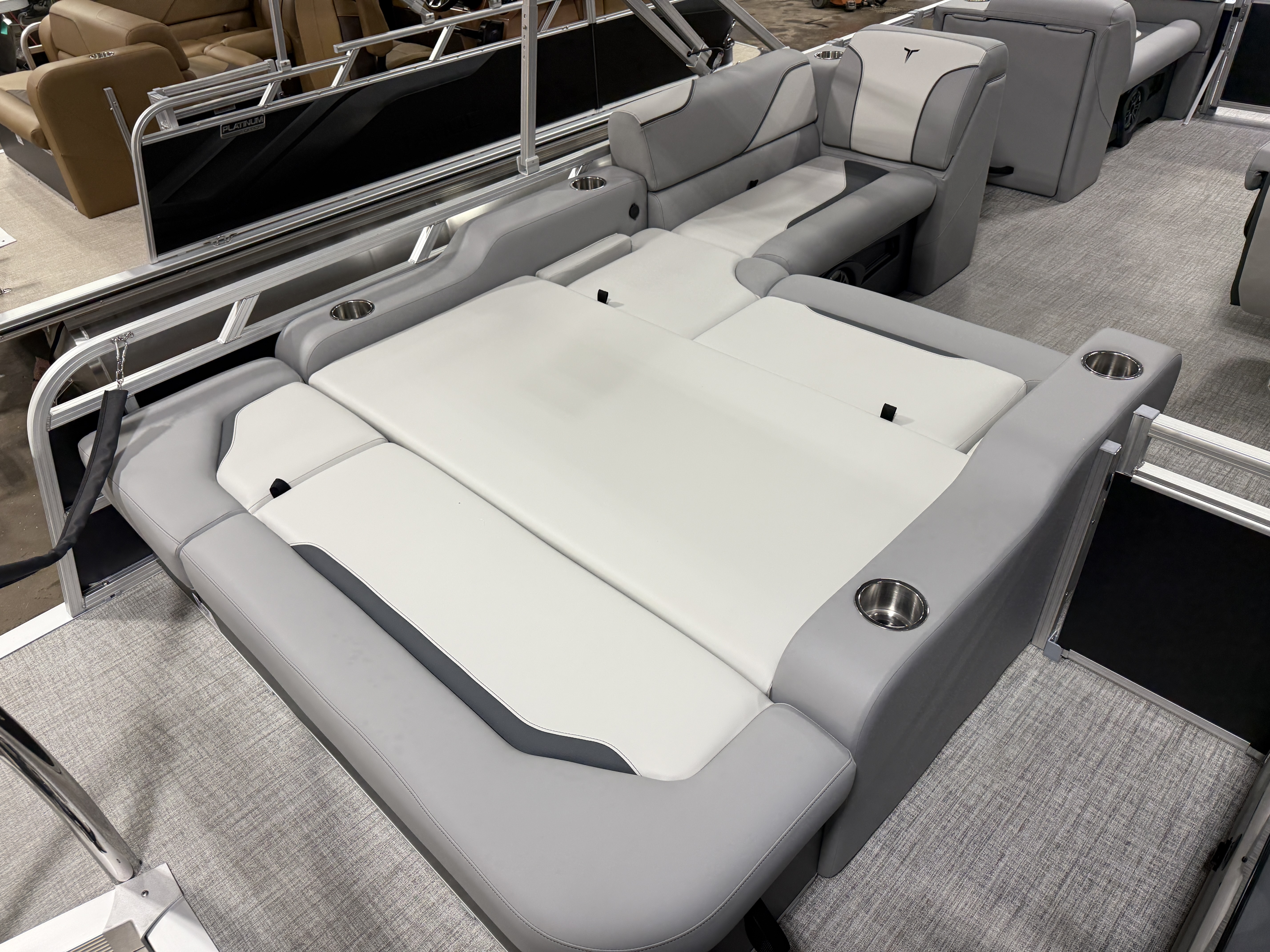 2026 Tahoe Sport 2180 Versatile Rear Bench (VRB) Swingback Pontoon & Honda 4-Stroke EFI. This 21' Matte Black Walls Platinum Edition Pontoon Has Front Chaise Lounge Seating With Storage, Upgraded Commander Reclining Captain's Chair, Wrap Around Chaise Lounge Seating With Storage, Seating That Turns Into A Bed Or Rear Facing Bench Seating, Sport Platinum Edition (Garmin 52CV GPS Depth Finder, Polished Corner Caps, 90 Degree LED Docking Lights, Platinum Edition Special Badging), Rear Swim Deck, Riptide Vinyl Flooring, Greywood Rectangle Table, Mooring Cover, Built-In 25 Gallon Gas Tank, Fusion Bluetooth Radio, Multiple Cup Holders, 25" Tubes, 10' Bimini Top, Gated Aft, Graphite Interior Package, Bow & Aft USB Charging Ports, Ladder, Battery On/Off Switch, Tilt Steering, Smoked Chrome Logos, Built-In Trash Can, Side Storage Behind Captain's Seat, Front Deck. Rated For 10 People