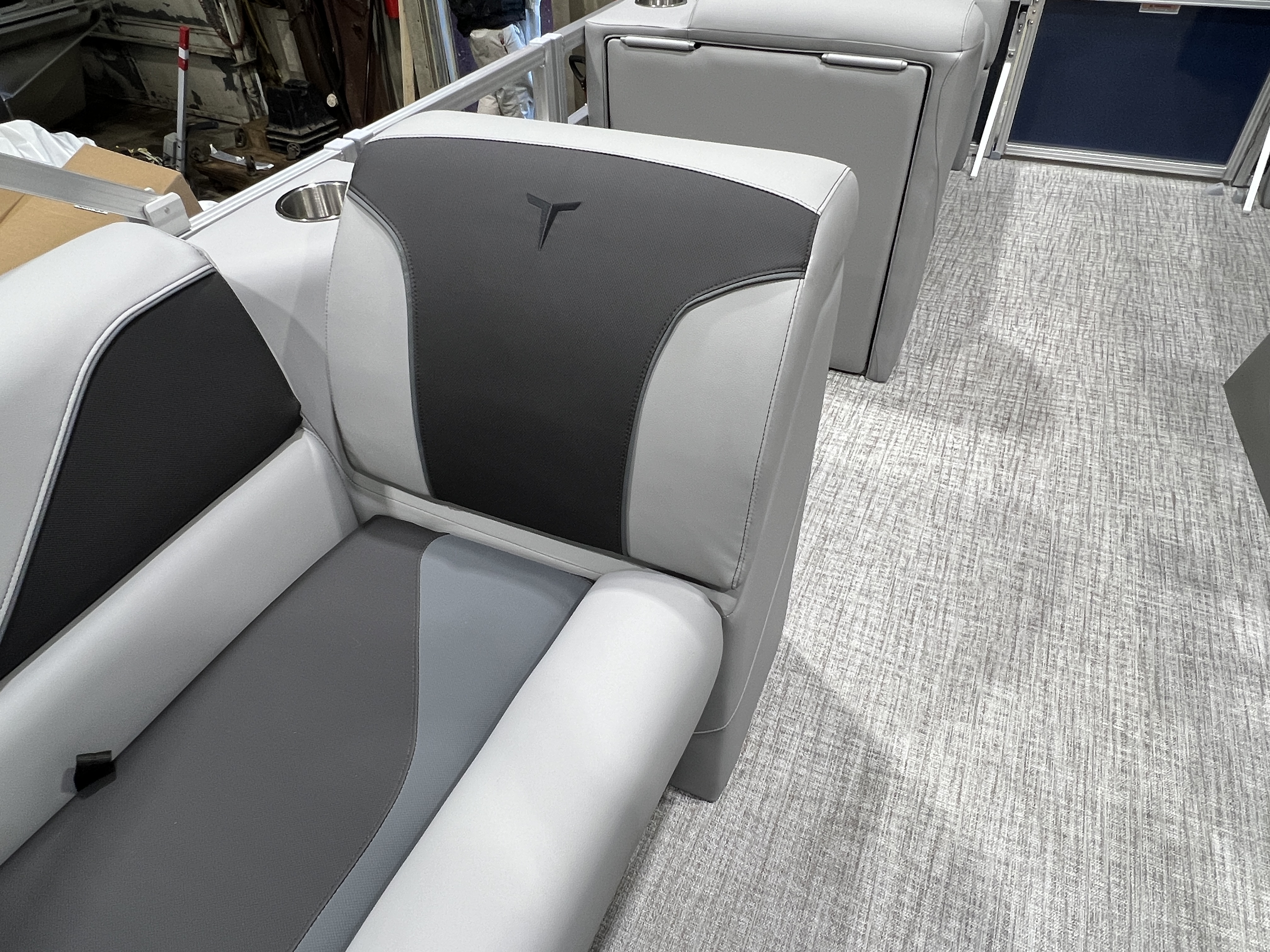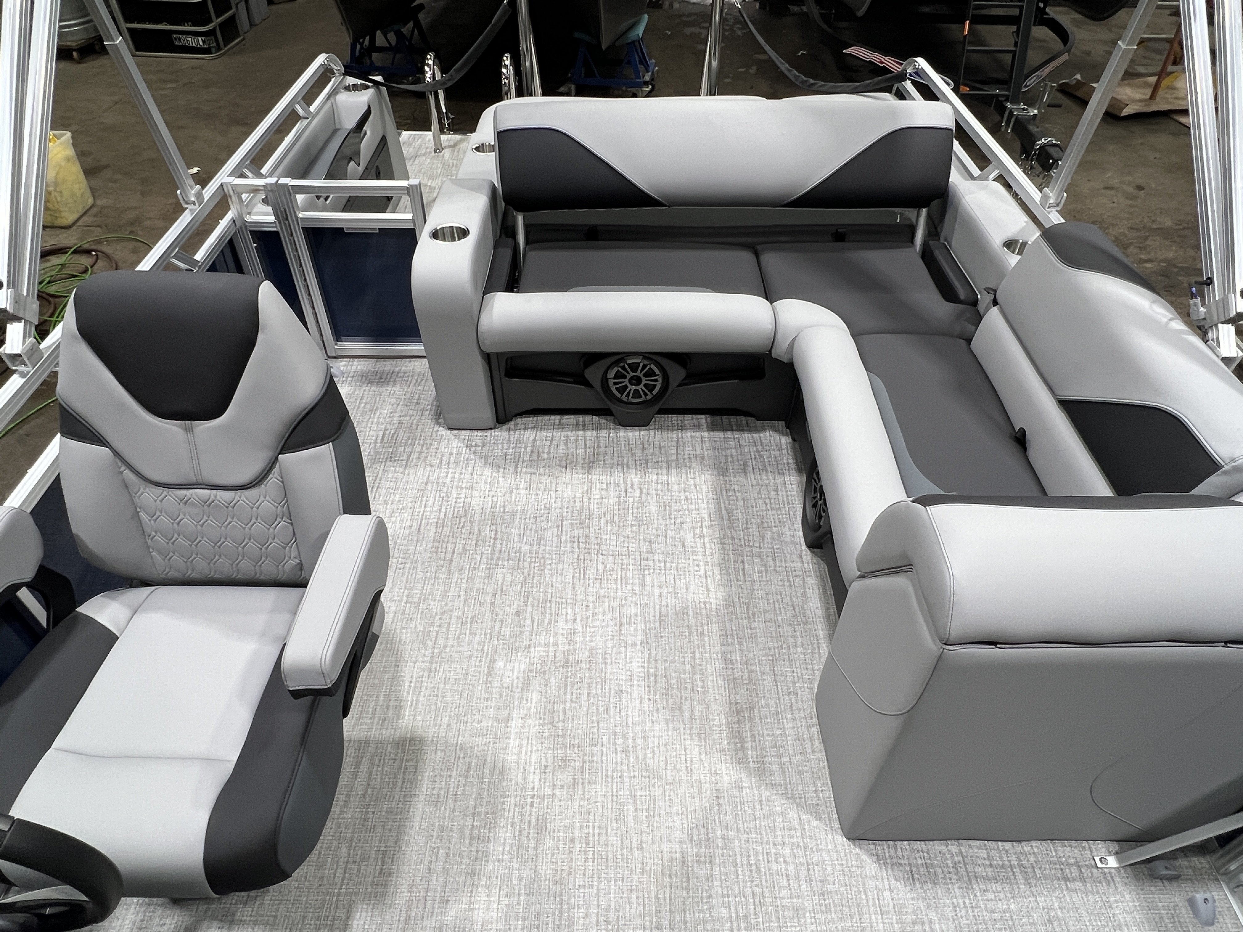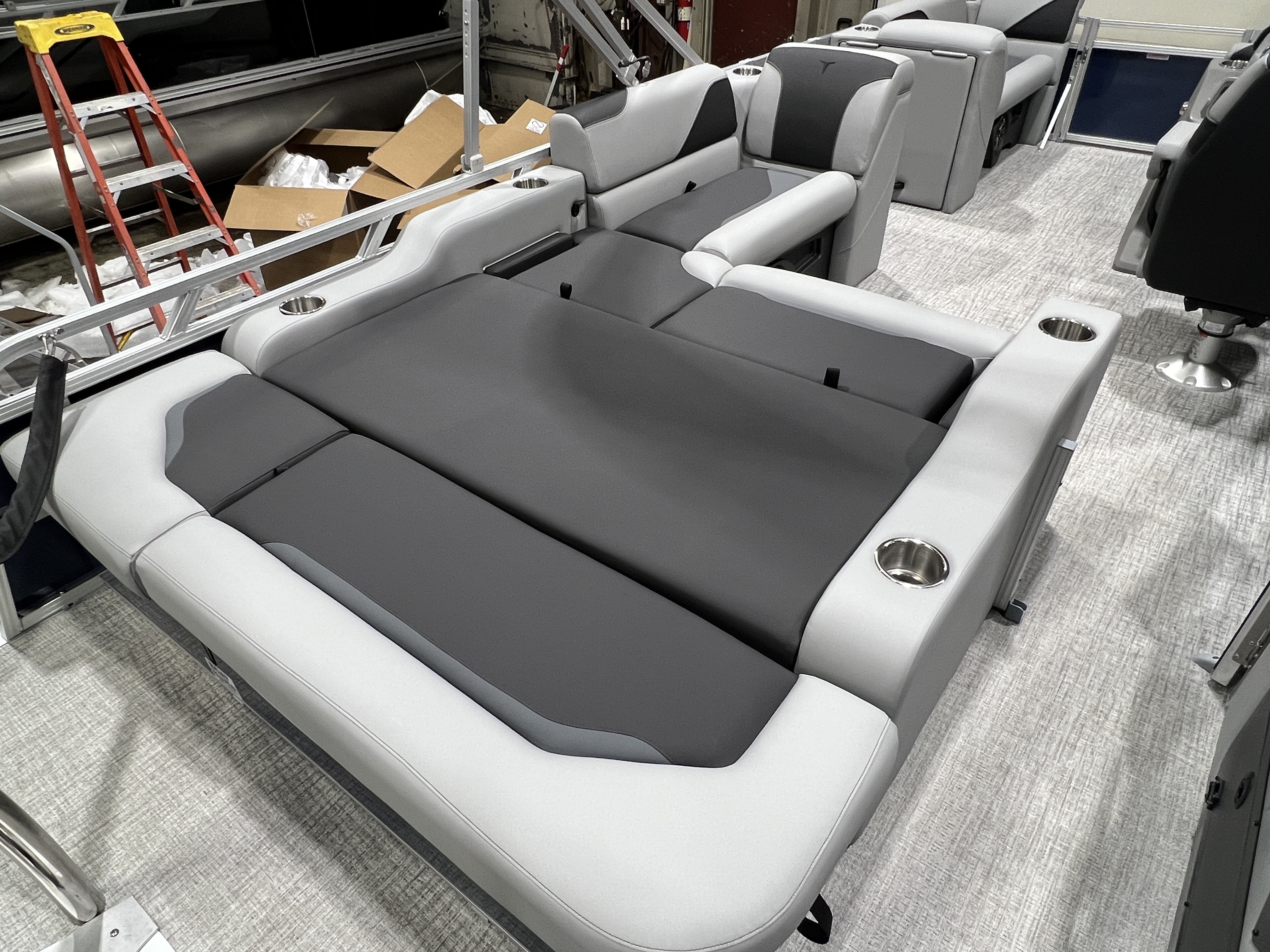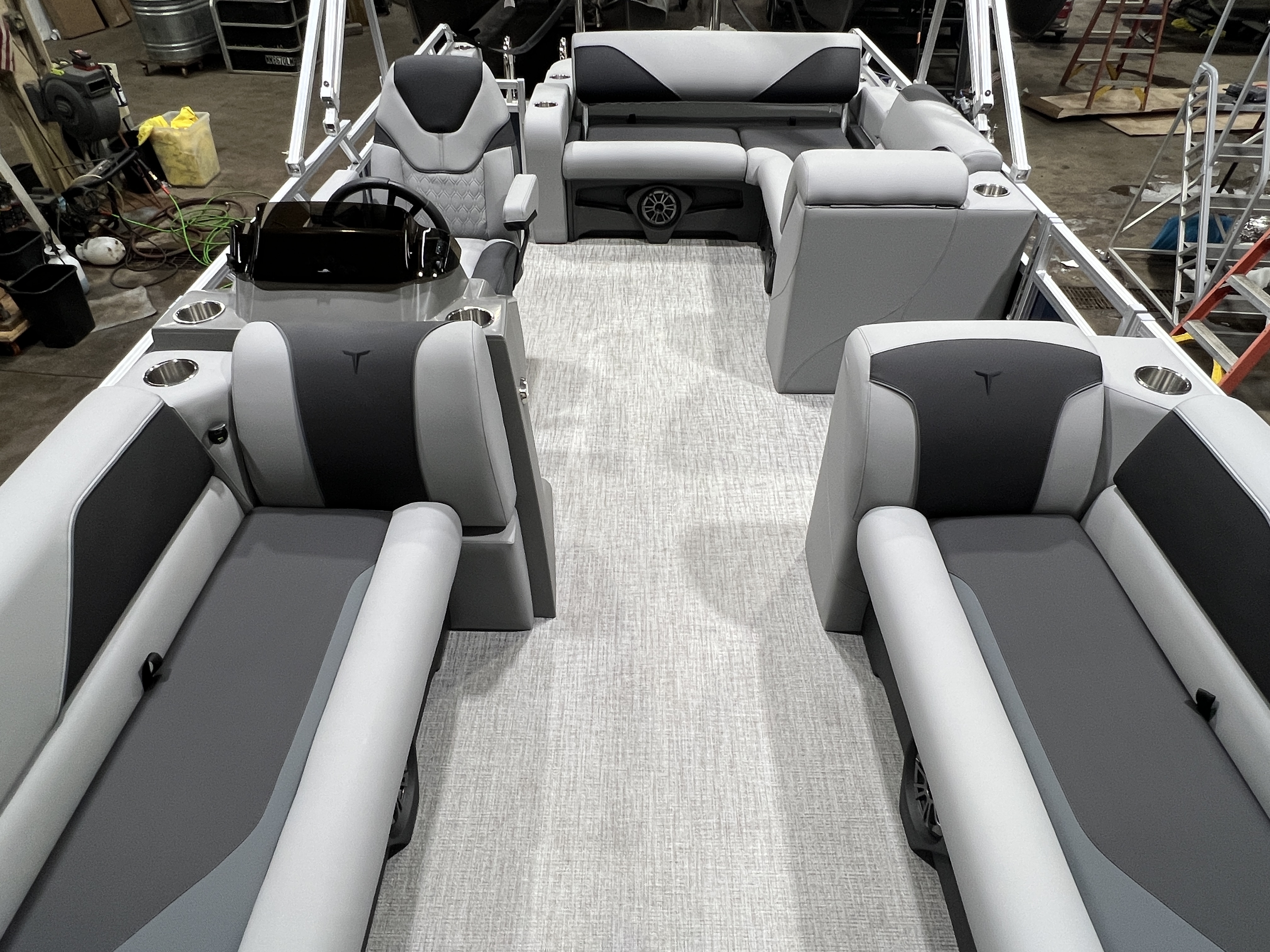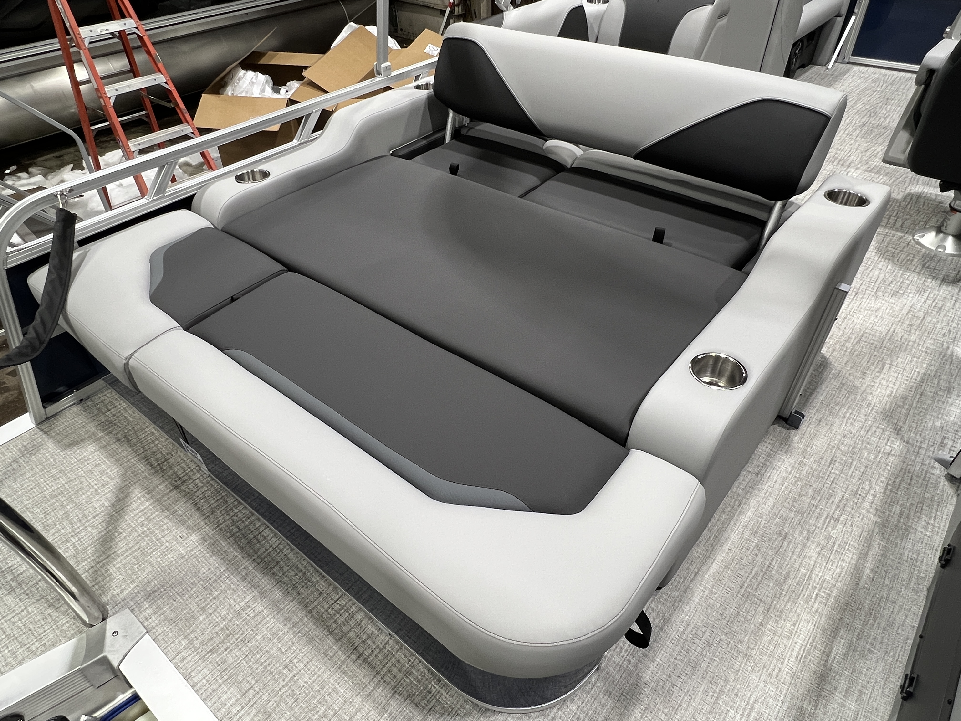 2026 Tahoe Sport 2180 Versatile Rear Bench (VRB) Swingback Pontoon & Honda 4-Stroke EFI. This Platinum Edition Pontoon Has Front Chaise Lounge Seating With Storage, Upgraded Commander Reclining Captain's Chair, Wrap Around Chaise Lounge Seating With Storage, Seating That Turns Into A Bed Or Rear Facing Bench Seating, Sport Platinum Edition (Garmin 52CV GPS Depth Finder, Polished Corner Caps, 90 Degree LED Docking Lights, Platinum Edition Special Badging), Rear Swim Deck, Riptide Vinyl Flooring, Greywood Rectangle Table, Mooring Cover, Built-In 25 Gallon Gas Tank, Fusion Bluetooth Radio, Multiple Cup Holders, 25" Tubes, 10' Bimini Top, Gated Aft, Graphite Interior Package w/Kool Fab Black & Charcoal Accent, Bow & Aft USB Charging Ports, Ladder, Battery On/Off Switch, Tilt Steering, Smoked Chrome Logos, Built-In Trash Can, Side Storage Behind Captain's Seat, Front Deck. Rated For 10 People.