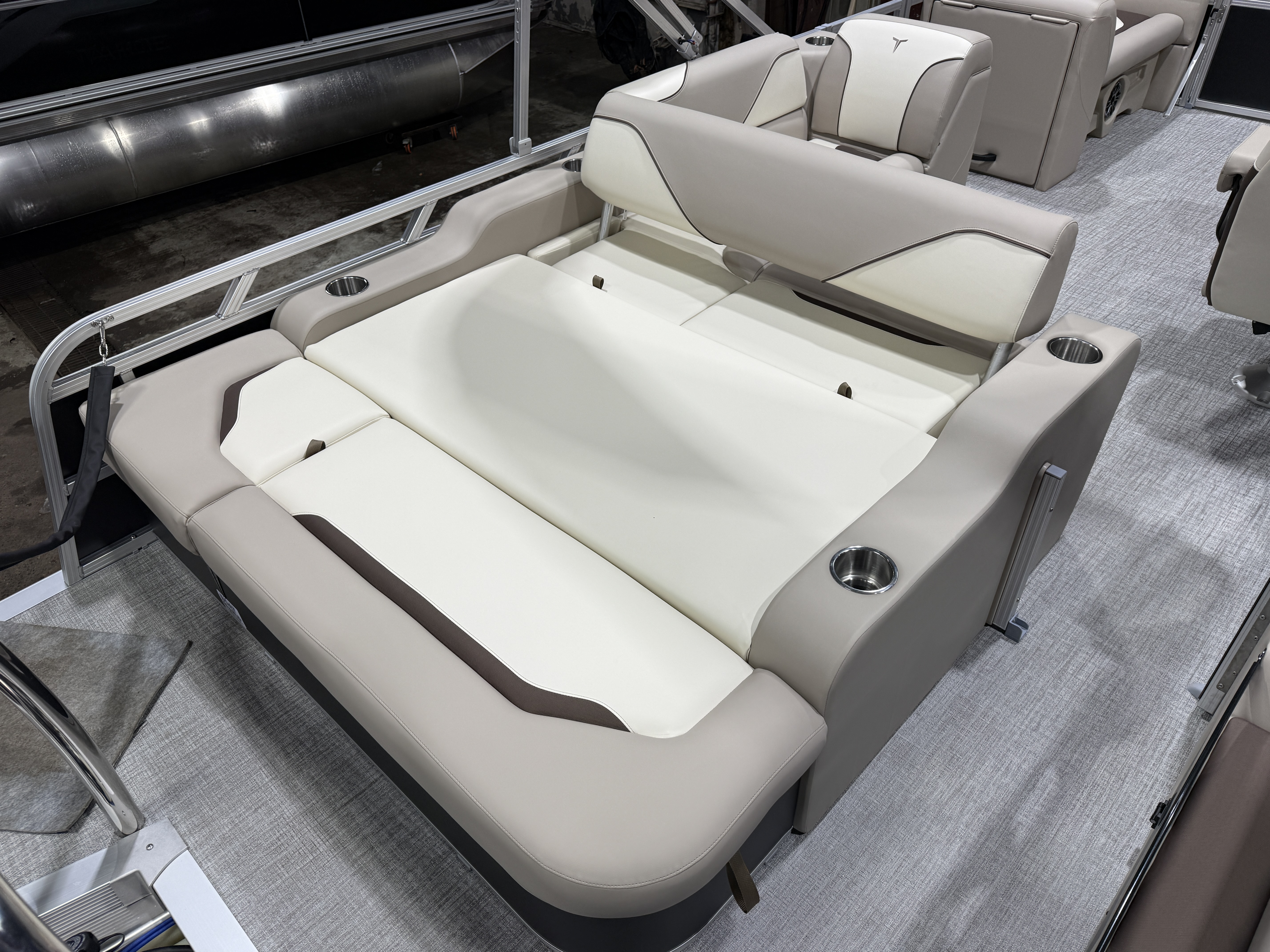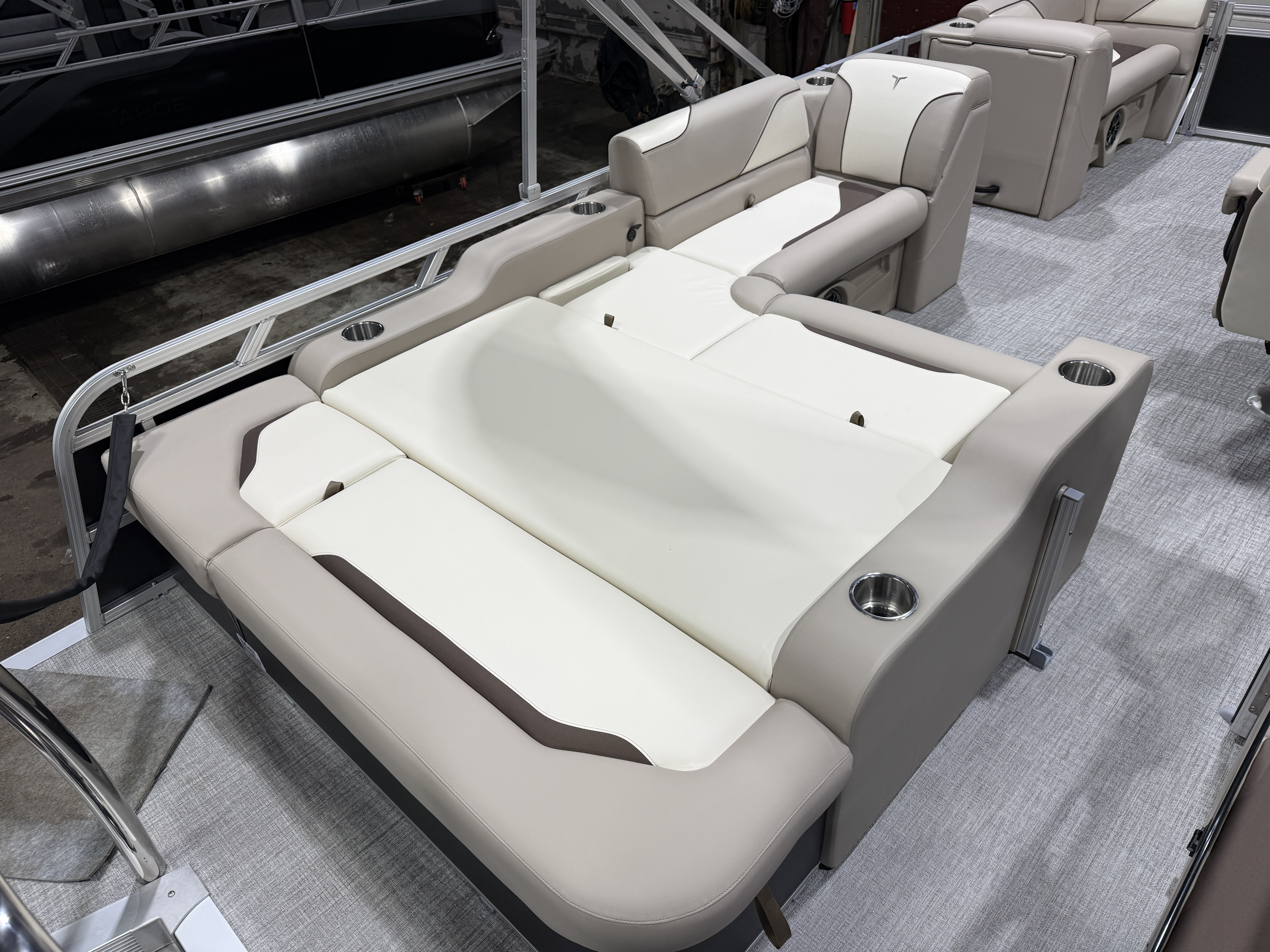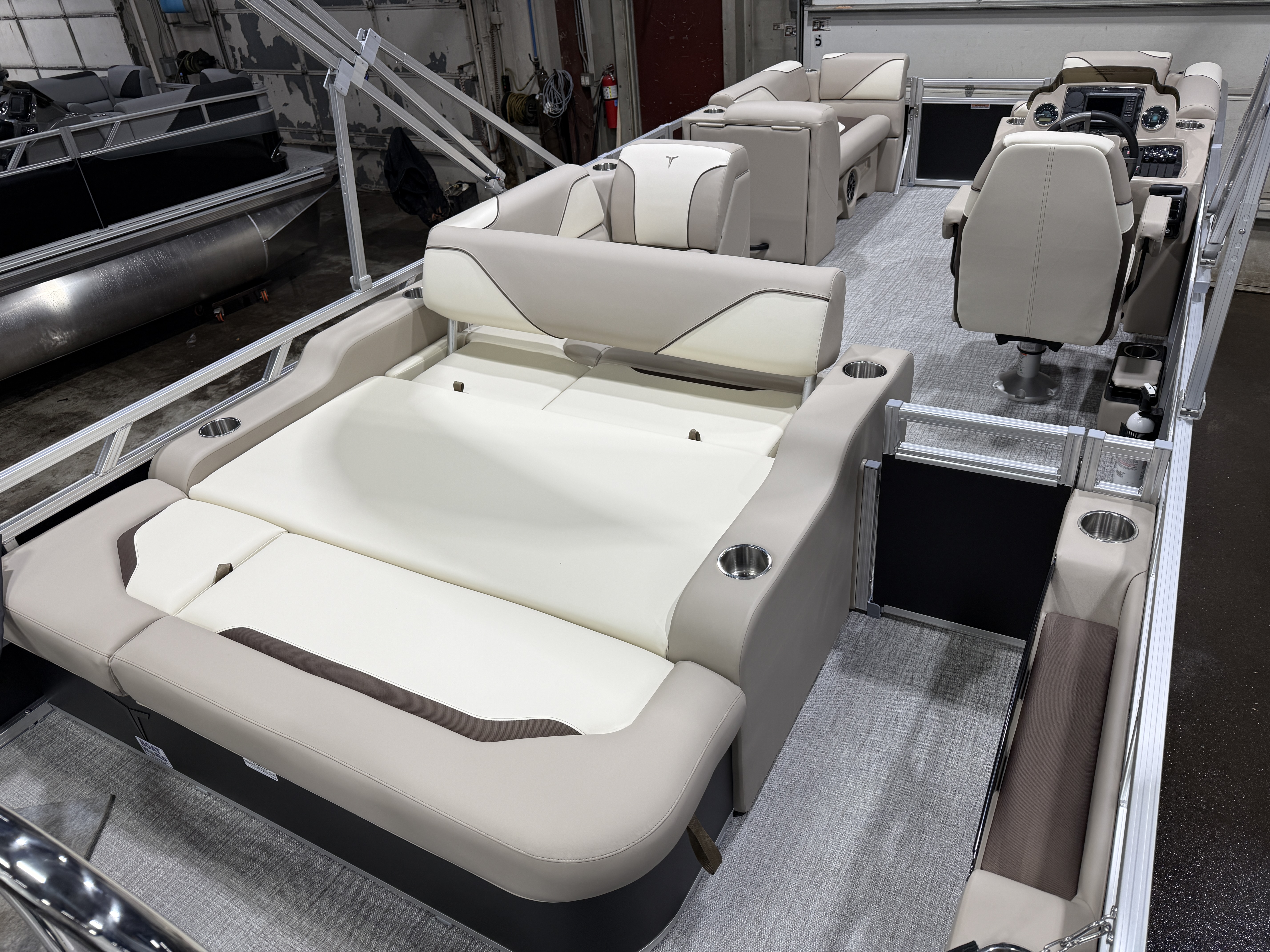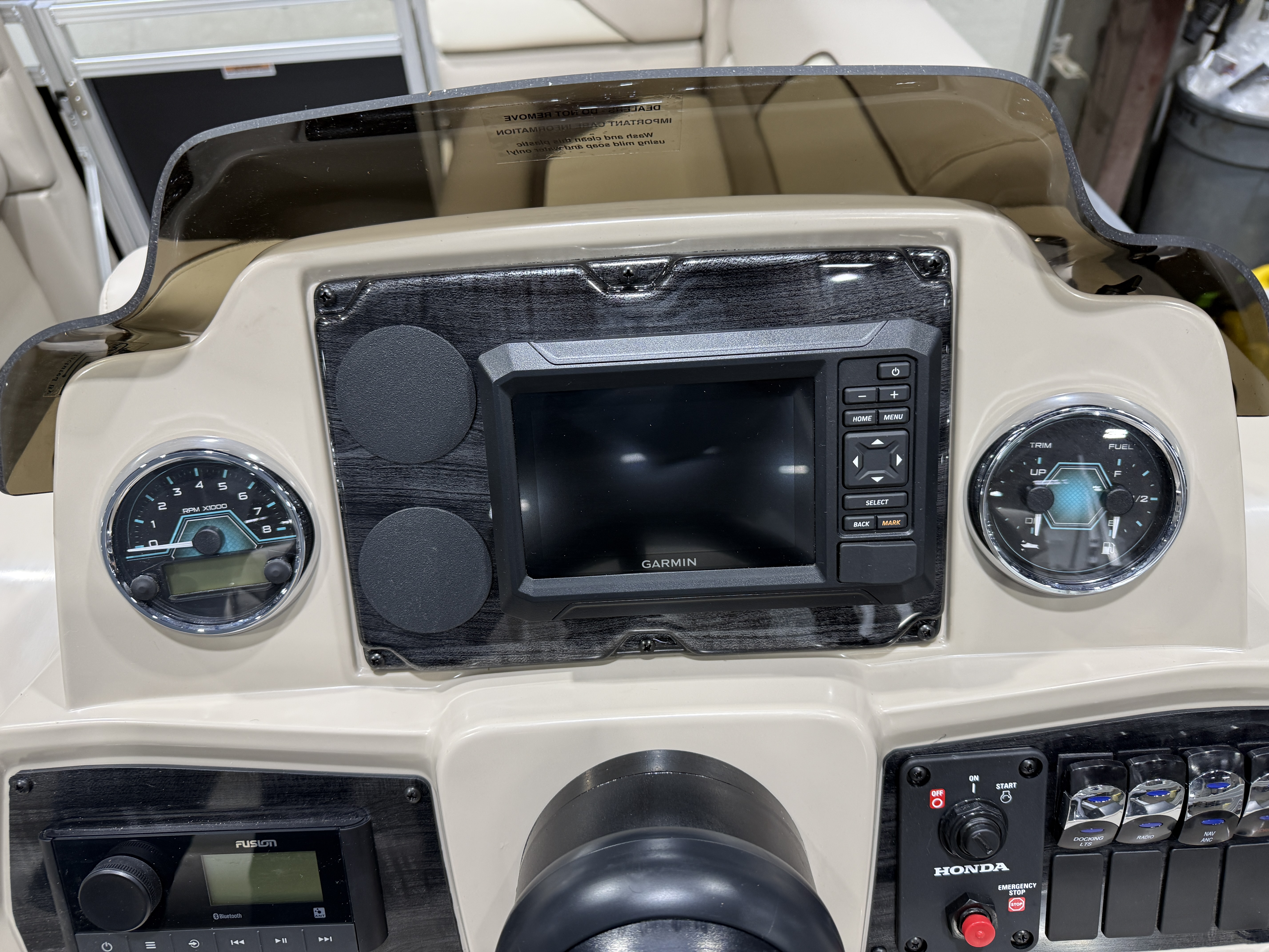2026 Tahoe Sport 2180 Versatile Rear Bench (VRB) Swingback Pontoon & Honda 4-Stroke EFI. This Matte Black Walls Platinum Edition Pontoon Has Front Chaise Lounge Seating With Storage, Upgraded Commander Reclining Captain's Chair, Wrap Around Chaise Lounge Seating With Storage, Seating That Turns Into A Bed Or Rear Facing Bench Seating, Sport Platinum Edition (Garmin 52CV GPS Depth Finder, Polished Corner Caps, 90 Degree LED Docking Lights, Platinum Edition Special Badging), Rear Swim Deck, Riptide Vinyl Flooring, Greywood Rectangle Table, Mooring Cover, Built-In 25 Gallon Gas Tank, Fusion Bluetooth Radio, Multiple Cup Holders, 25" Tubes, 10' Bimini Top, Gated Aft, Buckskin Interior Package, Bow & Aft USB Charging Ports, Ladder, Battery On/Off Switch, Tilt Steering, Smoked Chrome Logos, Built-In Trash Can, Ski Tow Bar w/Chains, Side Storage Behind Captain's Seat, Front Deck. Rated For 10 People.