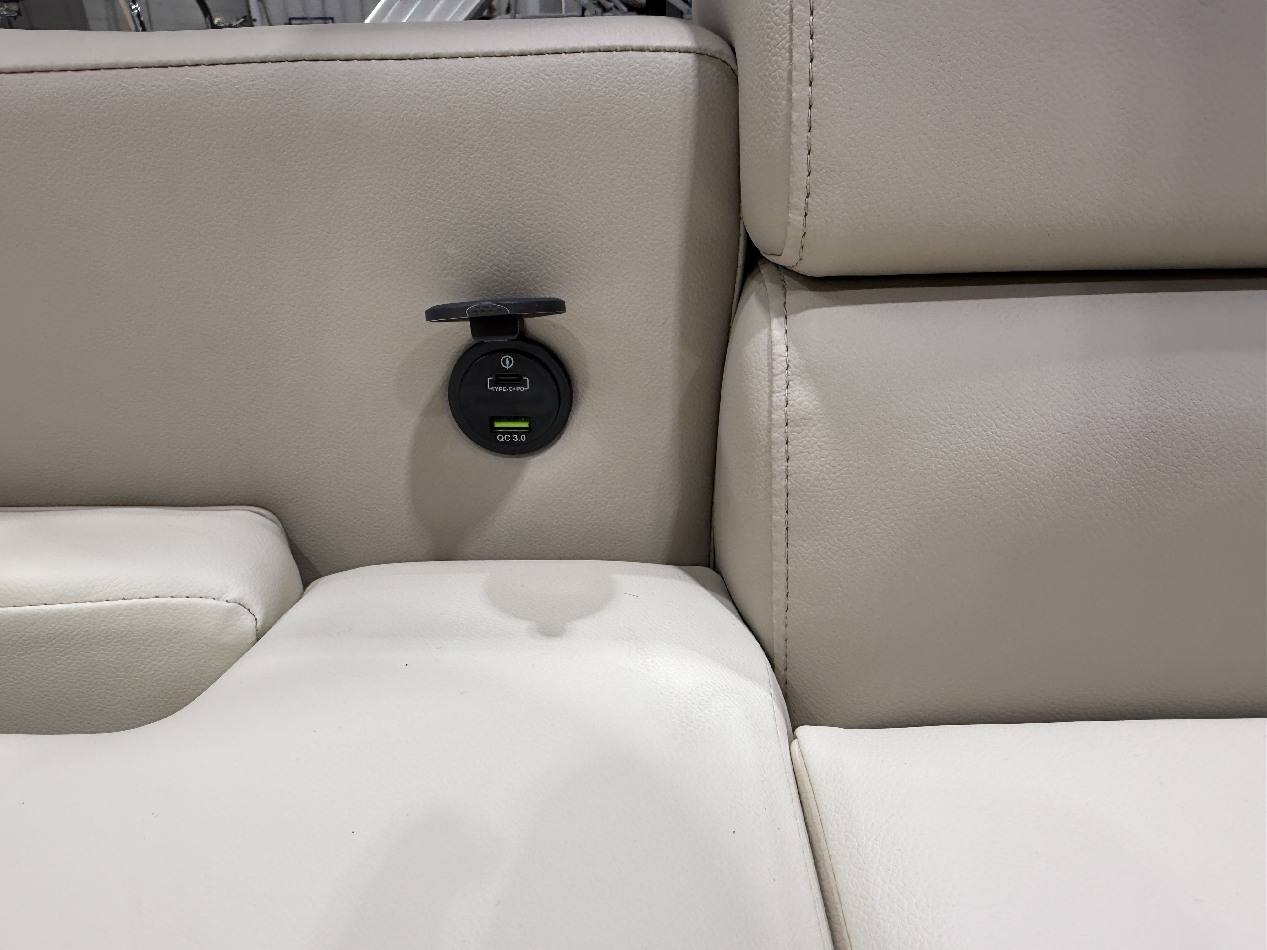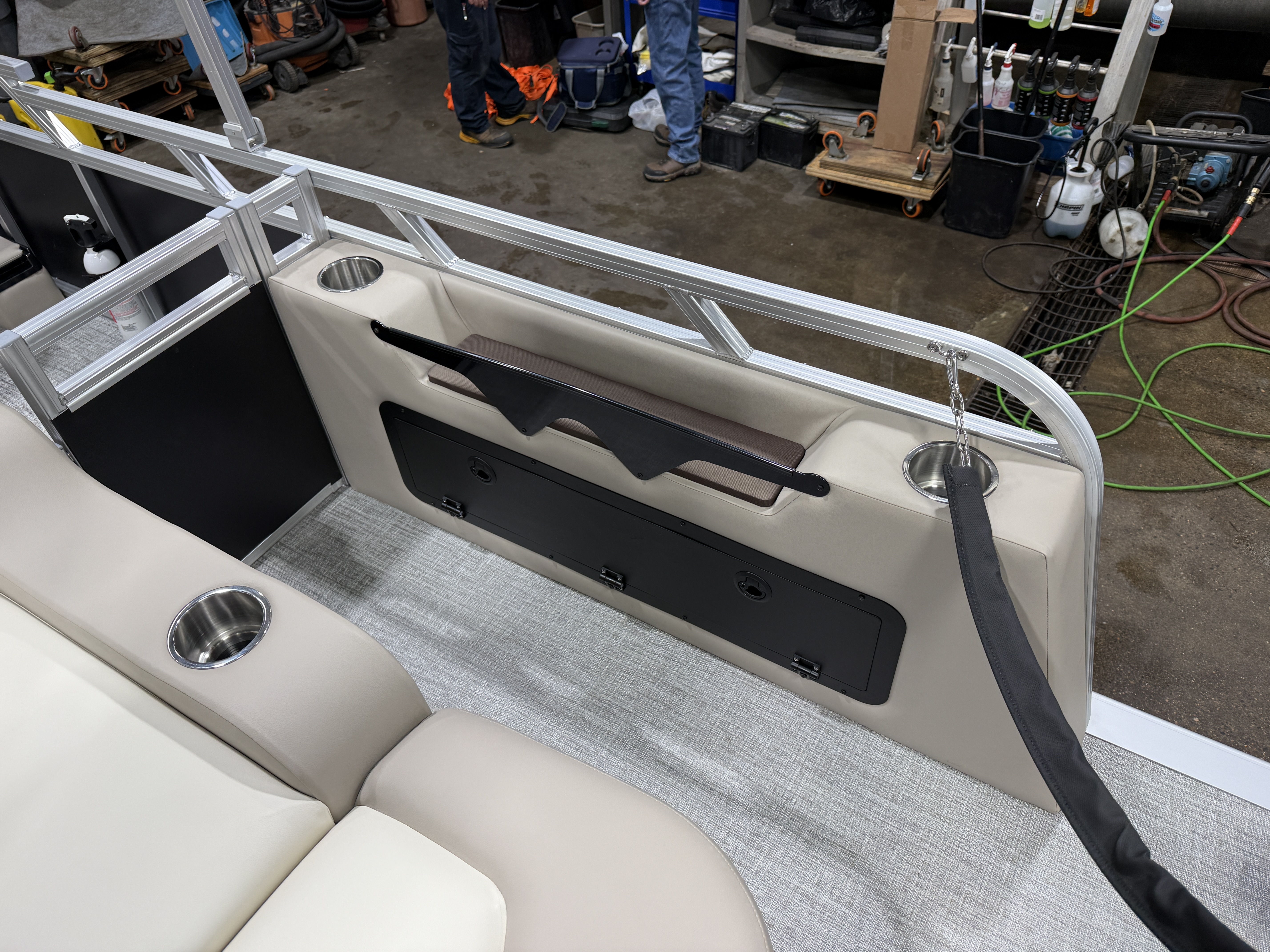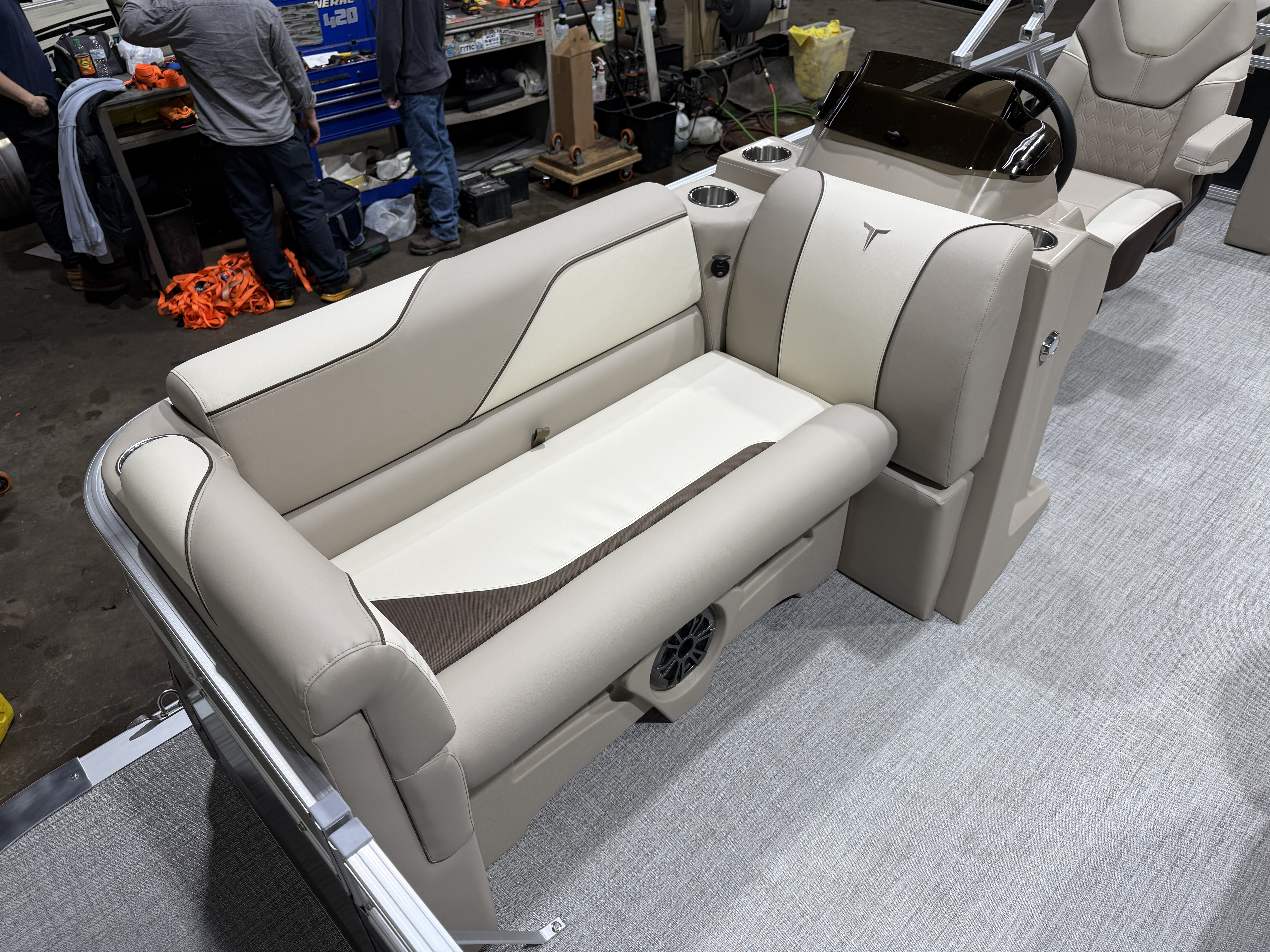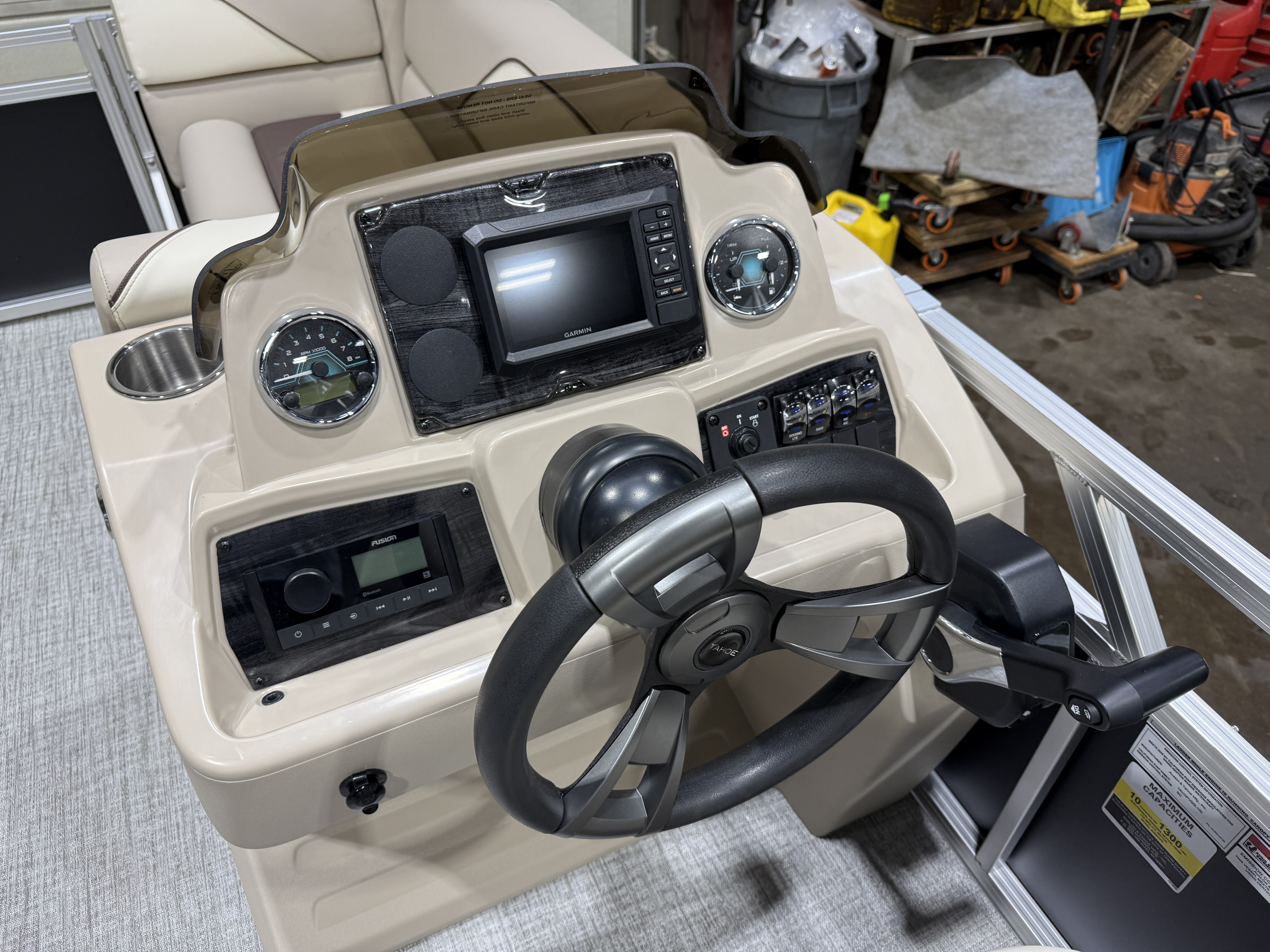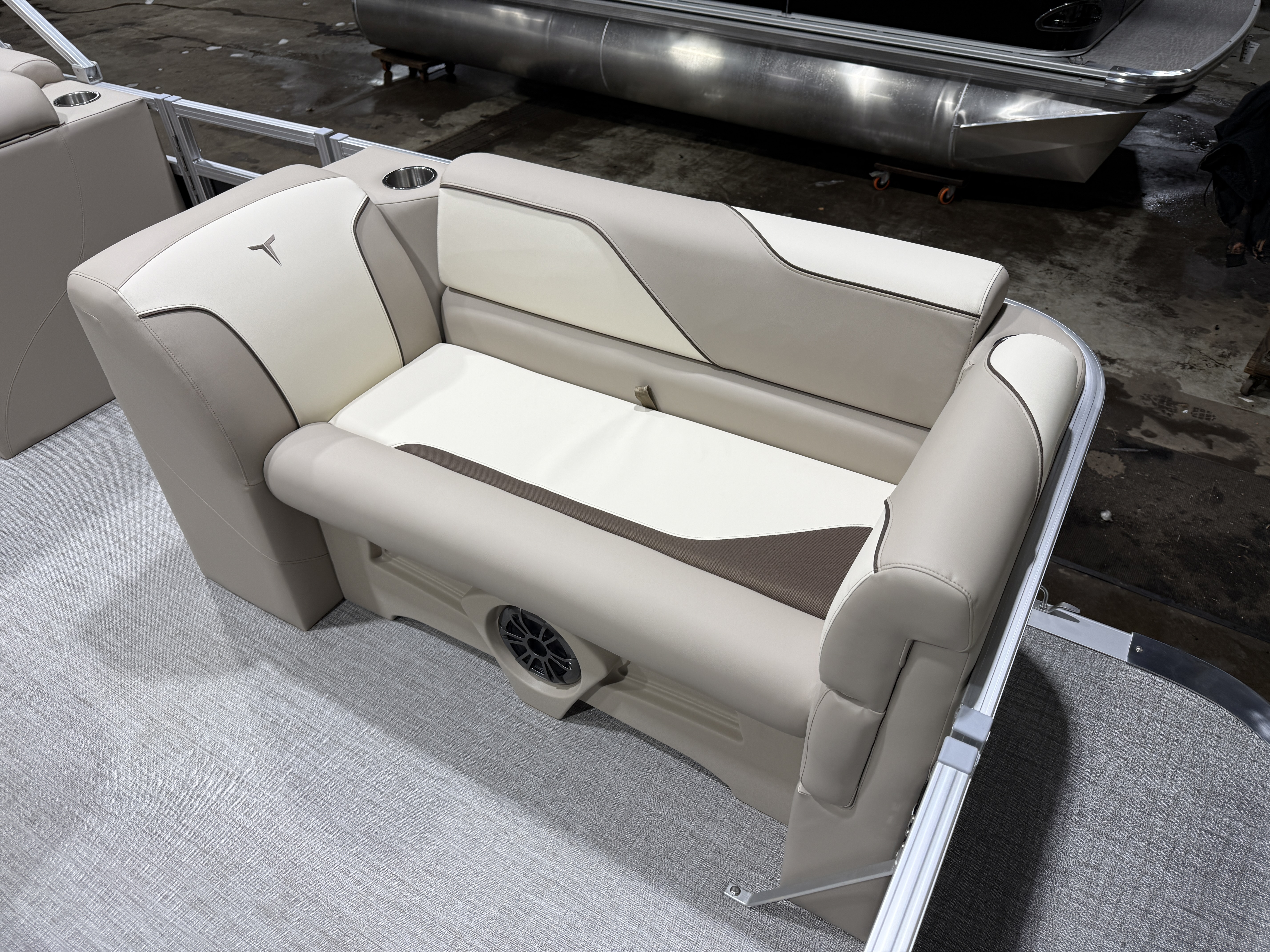2026 Tahoe Sport 2180 Versatile Rear Bench (VRB) Swingback Pontoon & Honda 4-Stroke EFI. This Matte Black Walls Platinum Edition Pontoon Has Front Chaise Lounge Seating With Storage, Upgraded Commander Reclining Captain's Chair, Wrap Around Chaise Lounge Seating With Storage, Seating That Turns Into A Bed Or Rear Facing Bench Seating, Sport Platinum Edition (Garmin 52CV GPS Depth Finder, Polished Corner Caps, 90 Degree LED Docking Lights, Platinum Edition Special Badging), Rear Swim Deck, Riptide Vinyl Flooring, Greywood Rectangle Table, Mooring Cover, Built-In 25 Gallon Gas Tank, Fusion Bluetooth Radio, Multiple Cup Holders, 25" Tubes, 10' Bimini Top, Gated Aft, Buckskin Interior Package, Bow & Aft USB Charging Ports, Ladder, Battery On/Off Switch, Tilt Steering, Smoked Chrome Logos, Built-In Trash Can, Ski Tow Bar w/Chains, Side Storage Behind Captain's Seat, Front Deck. Rated For 10 People.