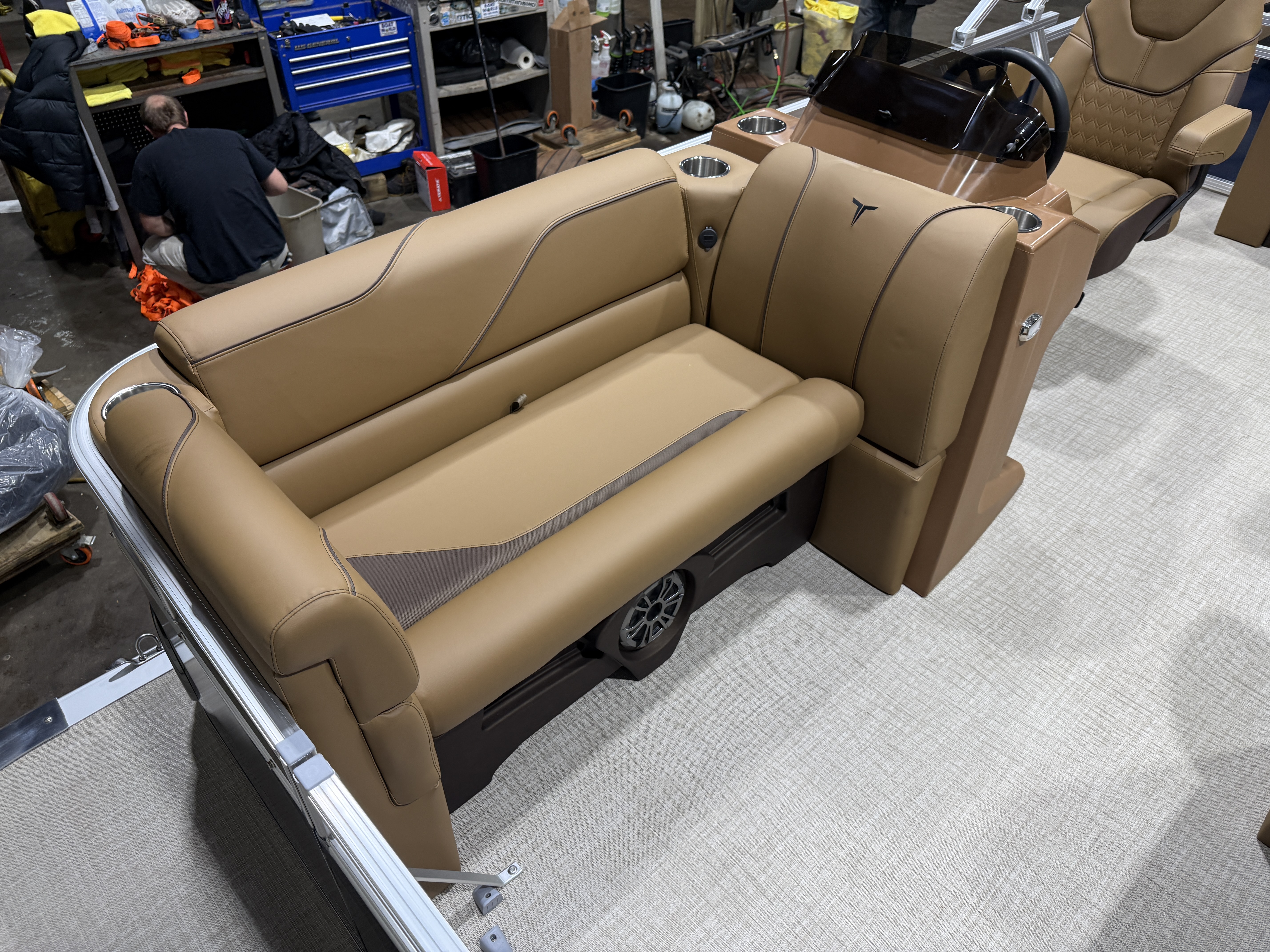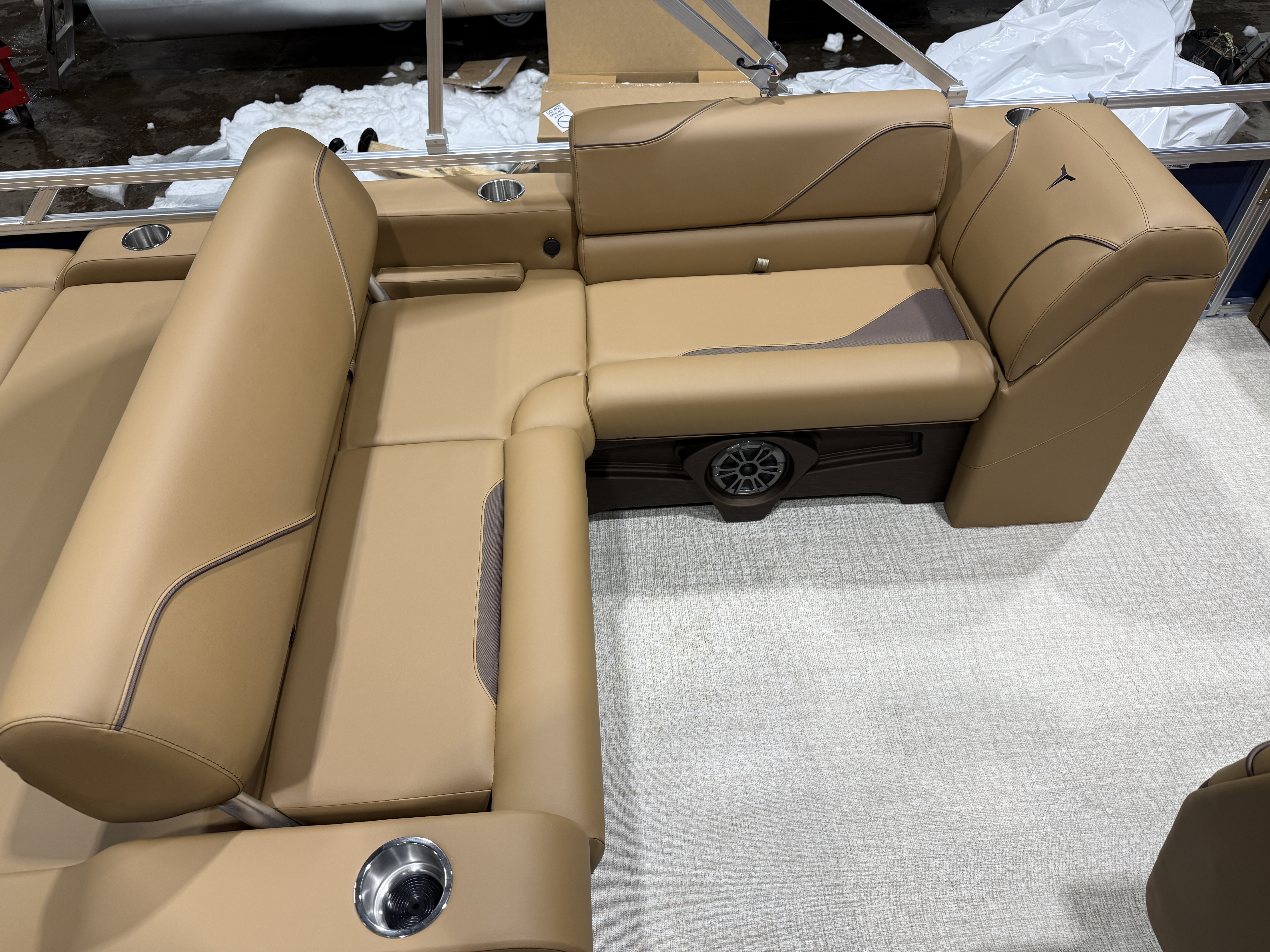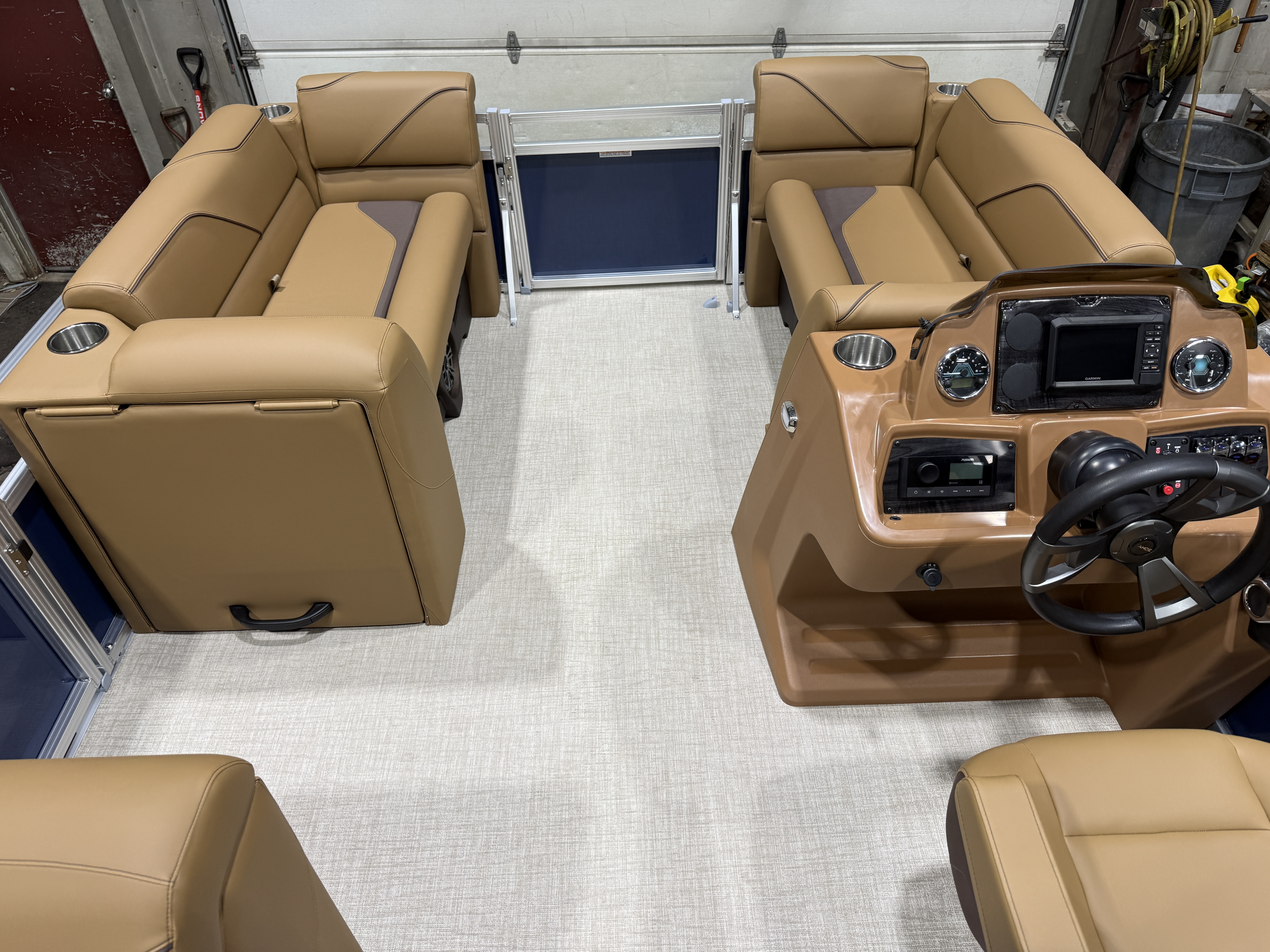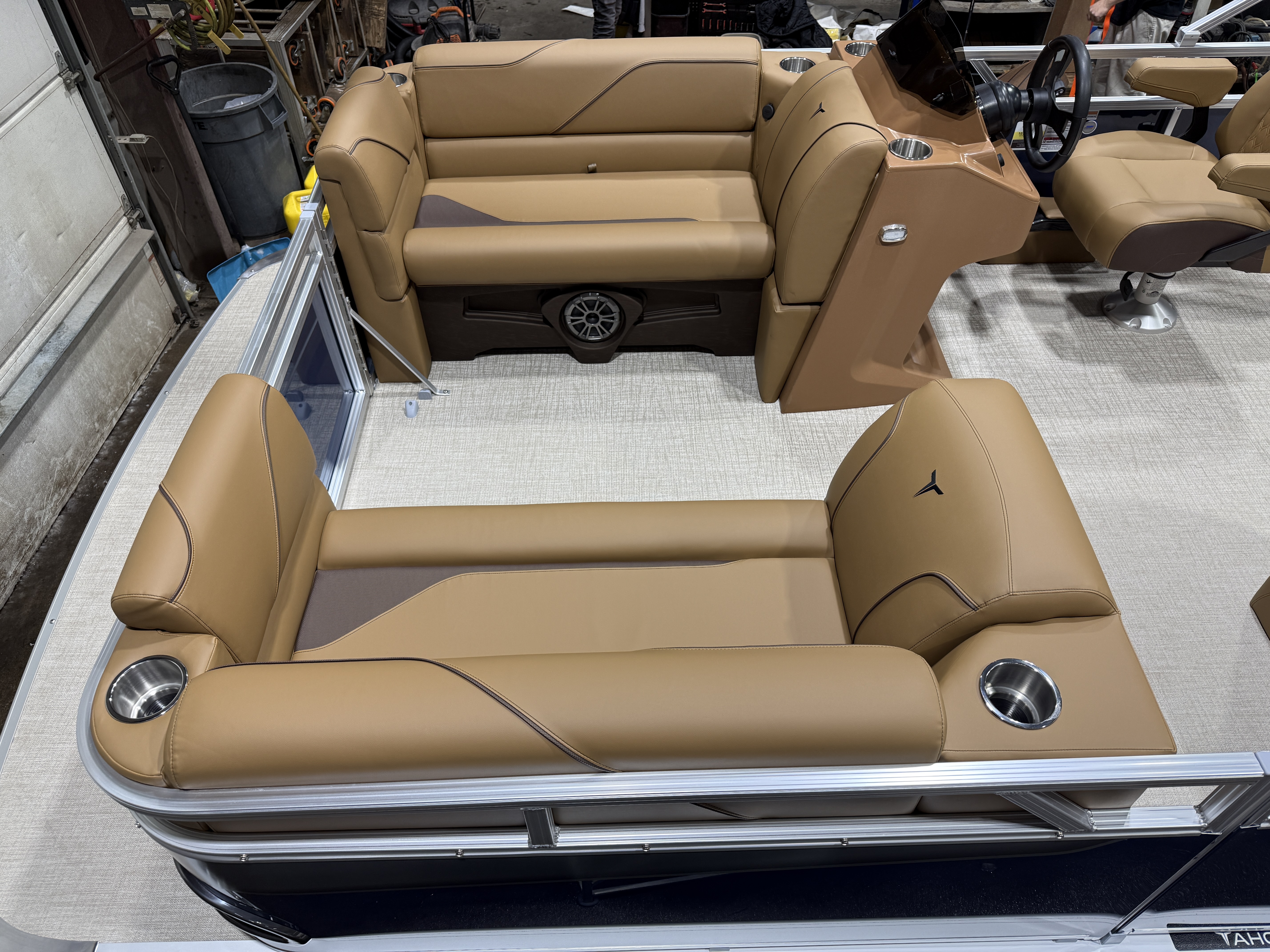 2026 Tahoe Sport 2180 Versatile Rear Bench (VRB) Swingback Pontoon & Honda 4-Stroke EFI. This Platinum Edition Pontoon Has Front Chaise Lounge Seating With Storage, Upgraded Commander Reclining Captain's Chair, Wrap Around Chaise Lounge Seating With Storage, Seating That Turns Into A Bed Or Rear Facing Bench Seating, Sport Platinum Edition (Garmin 52CV GPS Depth Finder, Polished Corner Caps, 90 Degree LED Docking Lights, Platinum Edition Special Badging), Rear Swim Deck, Riptide Vinyl Flooring, Greywood Rectangle Table, Mooring Cover, Built-In 25 Gallon Gas Tank, Fusion Bluetooth Radio, Multiple Cup Holders, 25" Tubes, 10' Bimini Top, Gated Aft, Cognac Interior Package, Bow & Aft USB Charging Ports, Ladder, Battery On/Off Switch, Tilt Steering, Smoked Chrome Logos, Built-In Trash Can, Side Storage Behind Captain's Seat, Front Deck. Rated For 10 People.