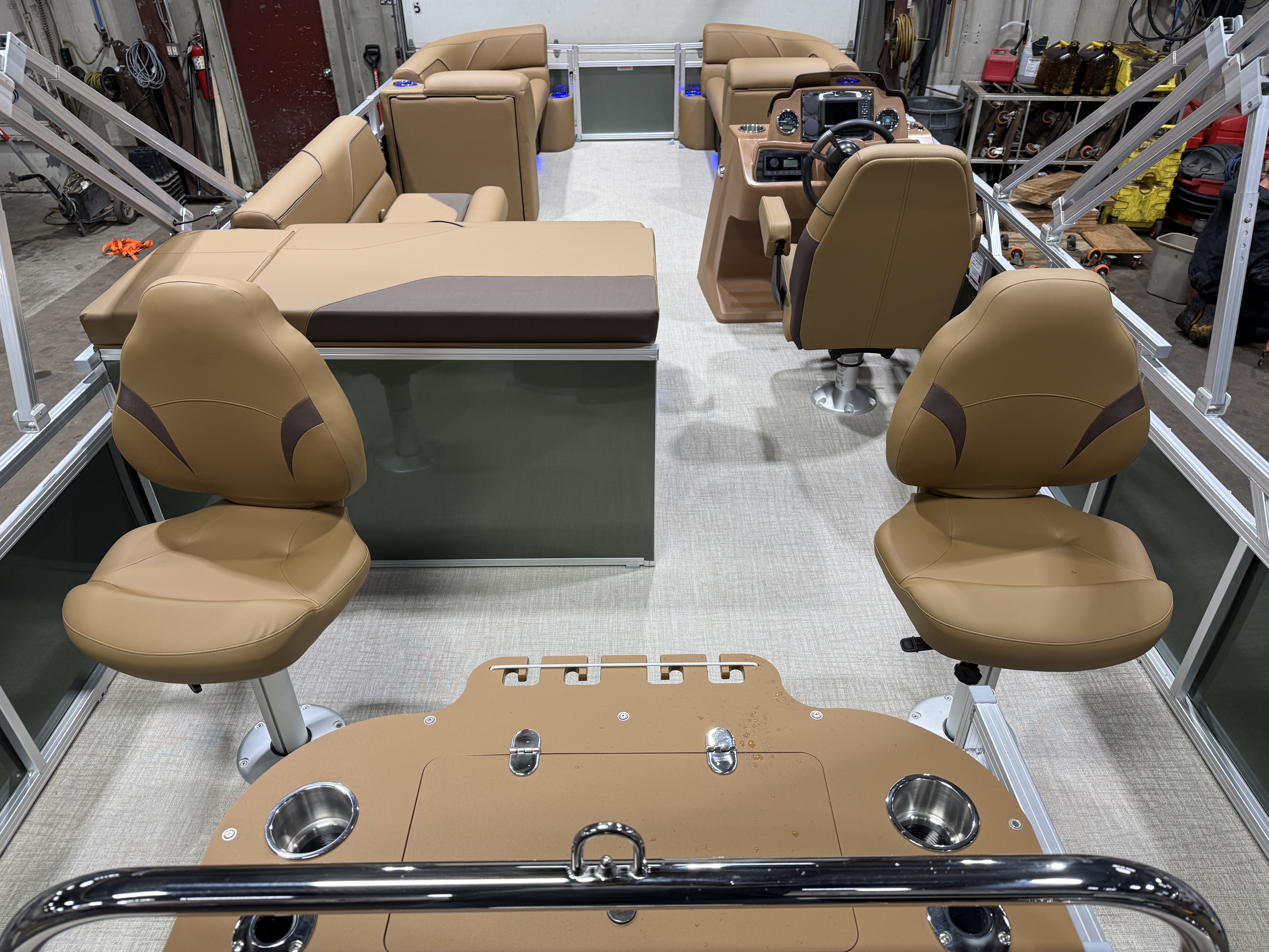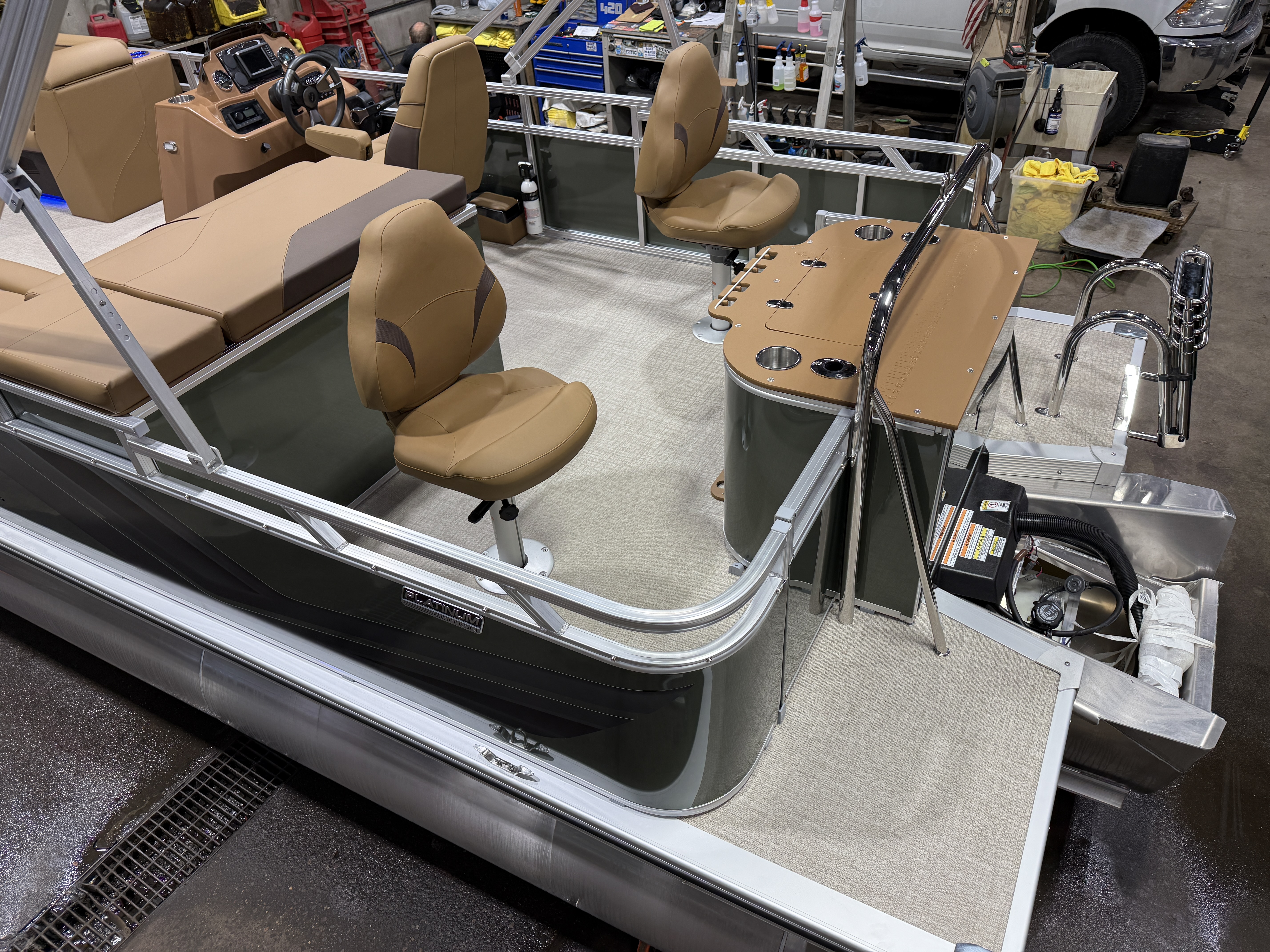 2026 Tahoe Sport 2385 Rear Fish Tritoon & Honda 4-Stroke EFI. This Sage Green Walls Tri-Toon Has Front Lounge Seating With Storage, Wrap Around Seating With Storage, 2 Rear Fishing Seats, 5 Gates, Rear Sun Pad With Storage, Rear Live Well, Rod Holders, Multiple Cup Holders, Table, Sport Platinum Edition (Mid Back Reclining Commander's Helm Seat, Garmin 52CV GPS Depth Finder, LED Smoked Chrome Docklights, Polished Corner Caps, Platinum Edition Special Badging), 10' Bimini Top, Cognac Interior Package, LED Nav Lights, 25' Tubes, Riptide Vinyl Floor, Blue Ice Package (Lighted Cup Holders, Lighted Speakers & Mood Lighting), Lifting Strakes, Underneath Sheeting, Ski Tow Bar, Hydraulic Steering, Bluetooth Fusion Radio w/4 Speakers, Greywood Rectangle Table, Gauge Package w/Hour Meter, Rear Starboard Stainless Steel Ladder, Built-In 25 Gallon Gas Tank, Mooring Cover, Helm Storage, New Battery And Prop, Front And Rear Deck, Tilt Steering. Rated For 11 People. Great Space In This Fish/Cruise Pontoon. Stop By!