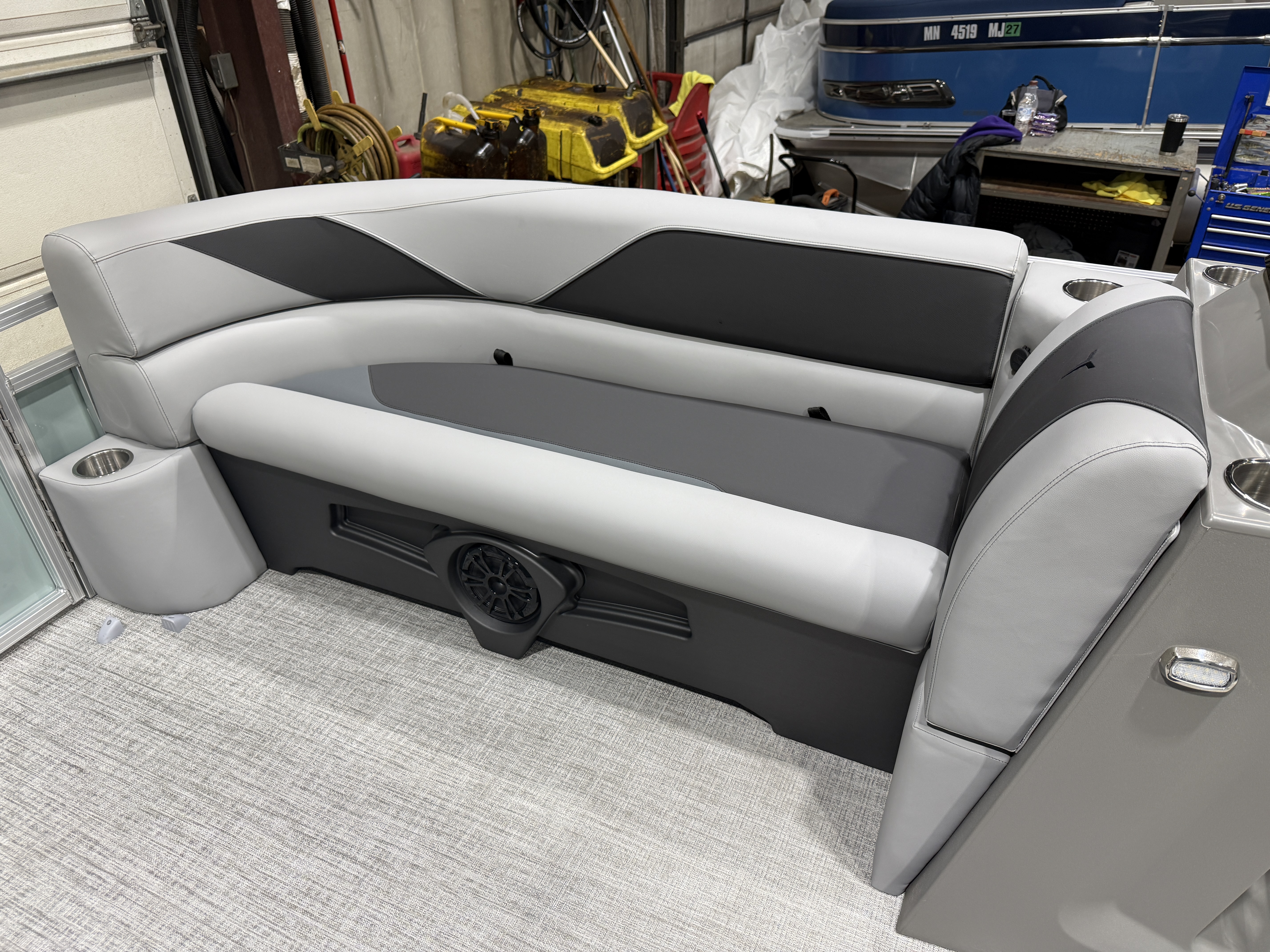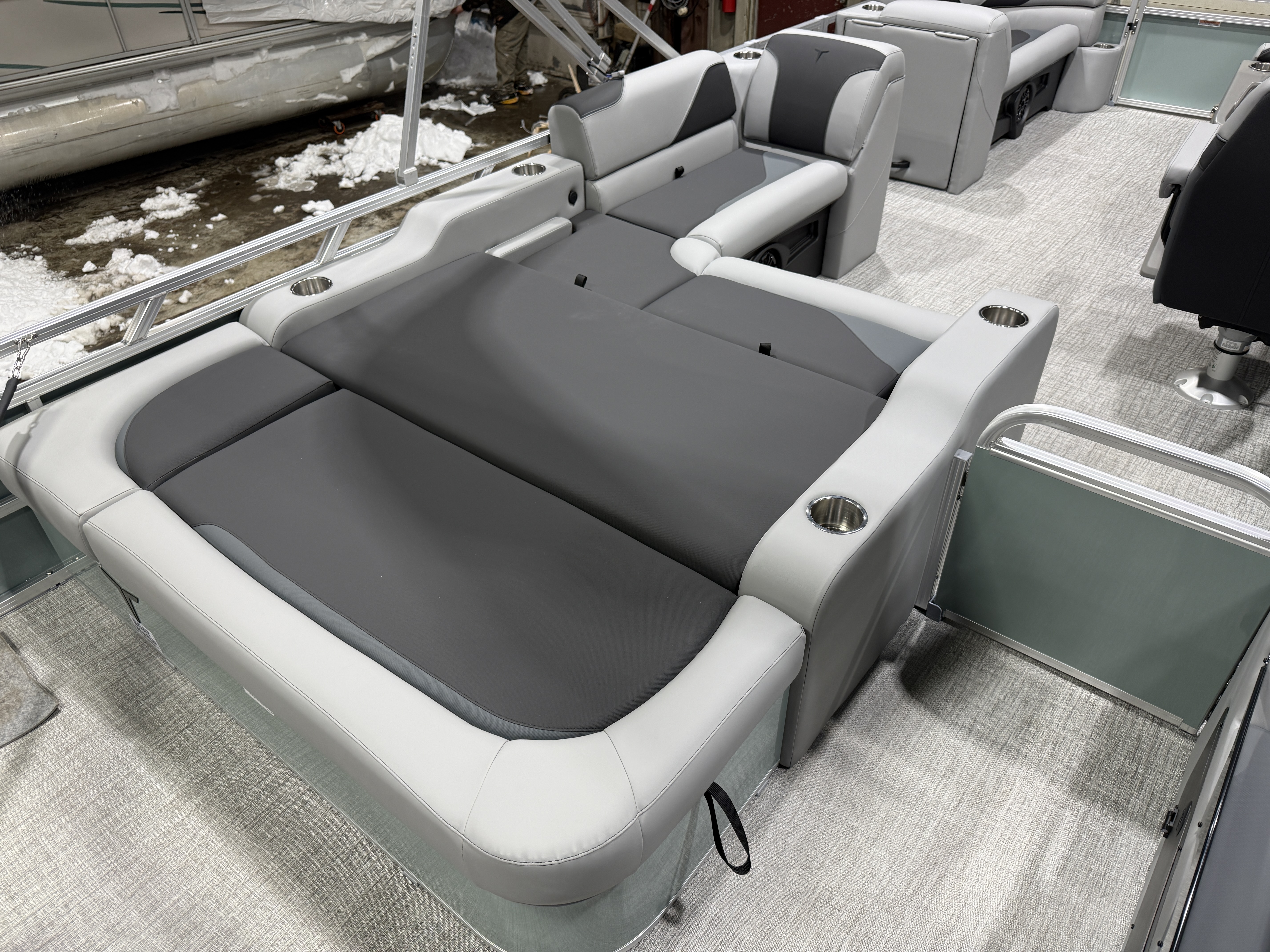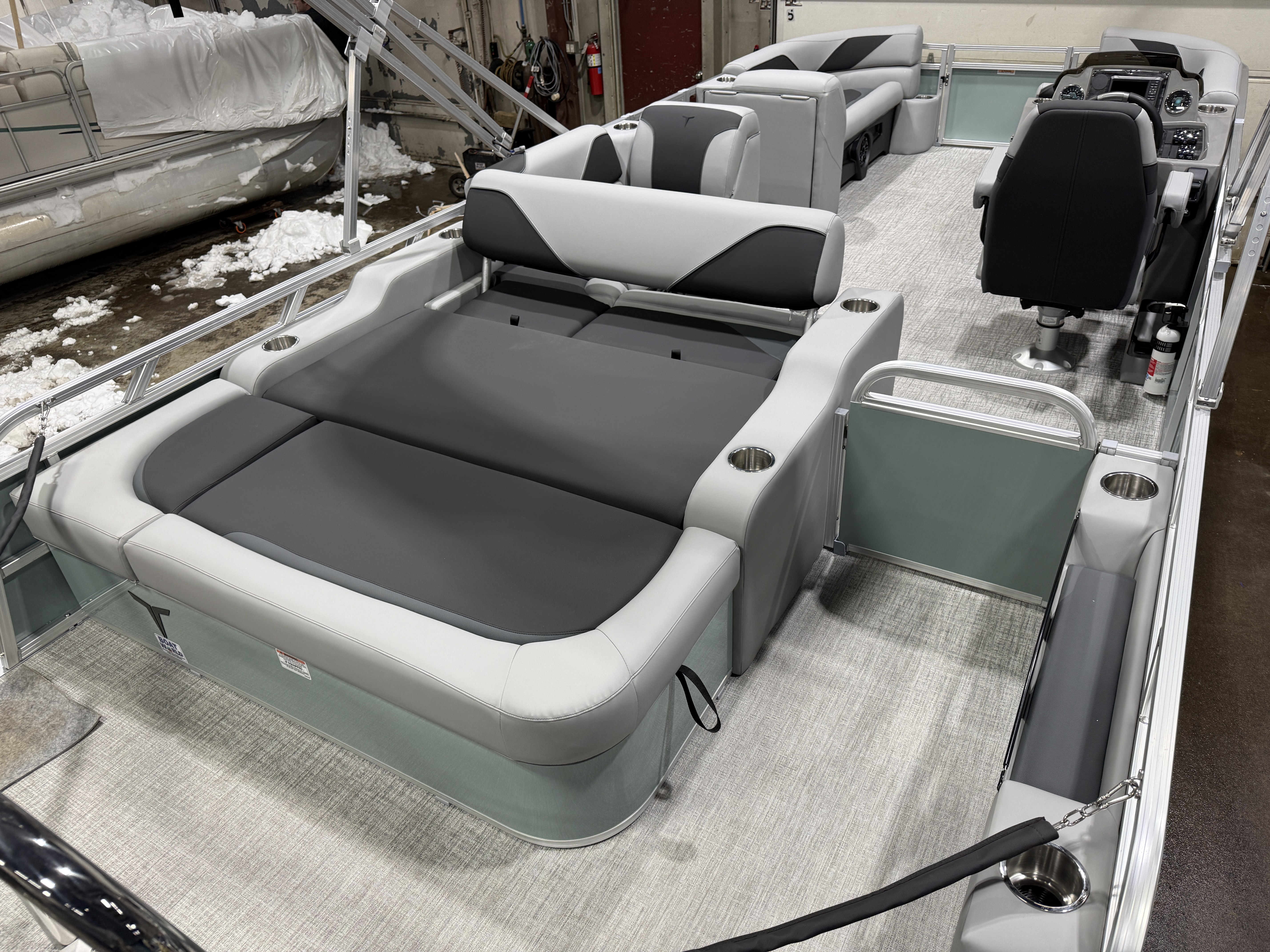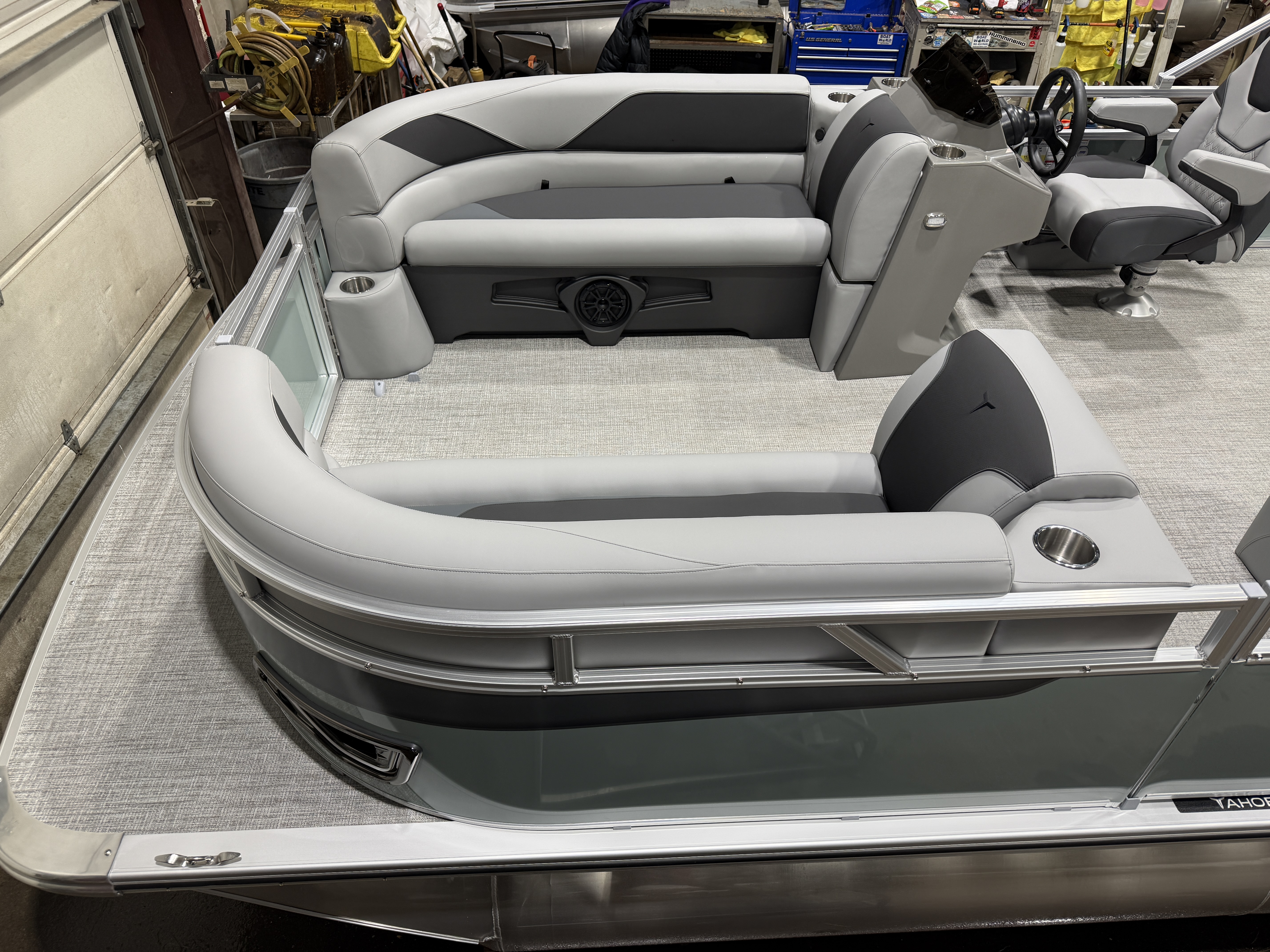 2026 Tahoe Sport 2385 Versatile Rear Bench (VRB) Swingback Pontoon & Honda 4-Stroke EFI. This Platinum Edition Pontoon Has Front Chaise Lounge Seating With Storage, Commander Reclining Captain's Chair, Wrap Around Chaise Lounge Seating With Storage, Seating That Turns Into A Bed Or Rear Facing Bench Seating, Rear Swim Deck, Riptide Vinyl Flooring, Smoked Chrome Docklights, Table, Mooring Cover, Garmin 52CV GPS Depth Finder, Fusion Bluetooth Radio, Multiple Cup Holders, 25" Tubes, 10' Bimini Top, Bead Blast Corner Caps, Gated Aft, Graphite Interior Package w/Kool Fab Black & Charcoal Accent, Ski Tow Bar w/Chains, Bow & Aft USB Charging Ports, Ladder, Side Storage Behind Captain's Seat, Front Deck. Rated For 11 People.