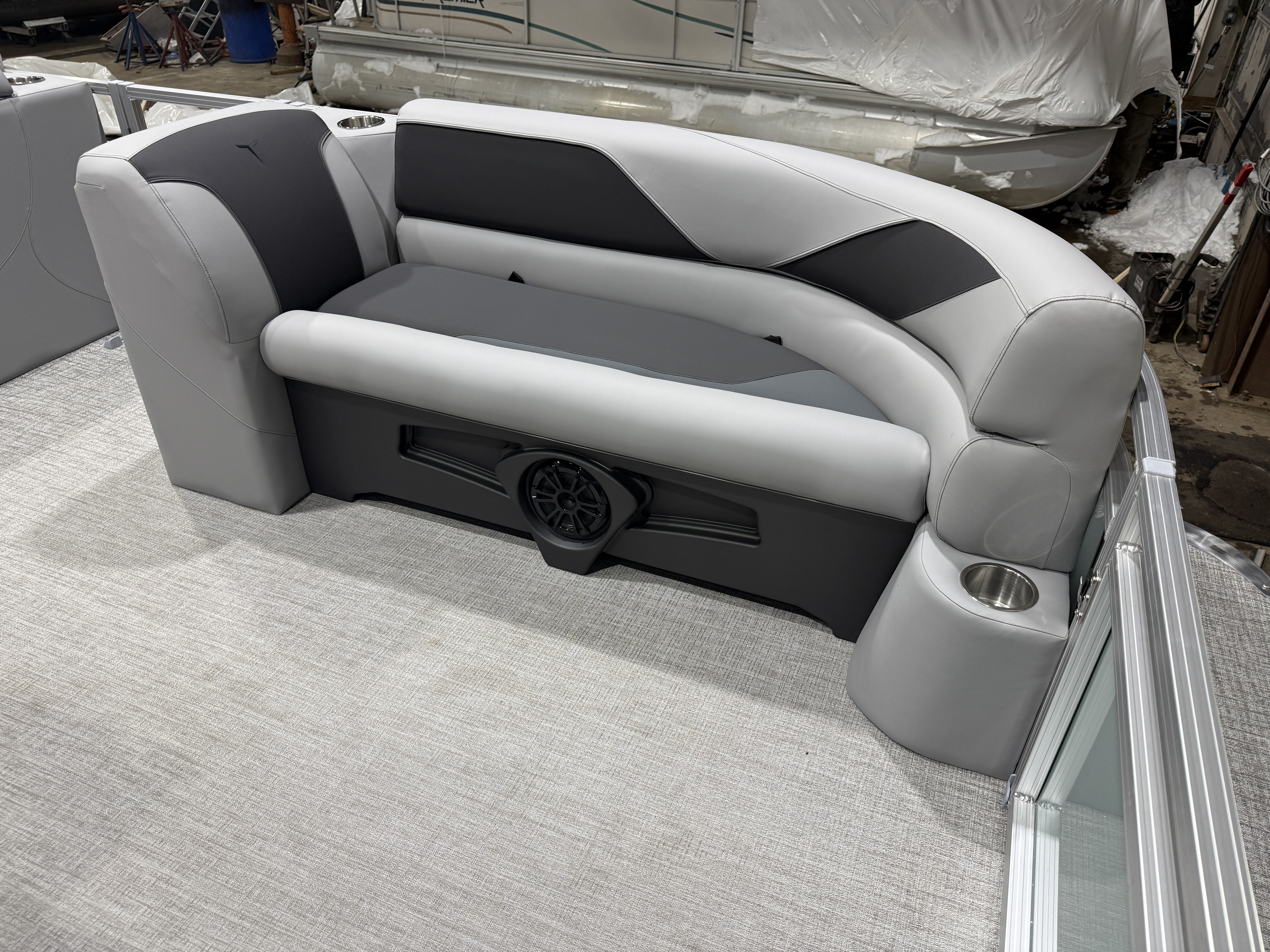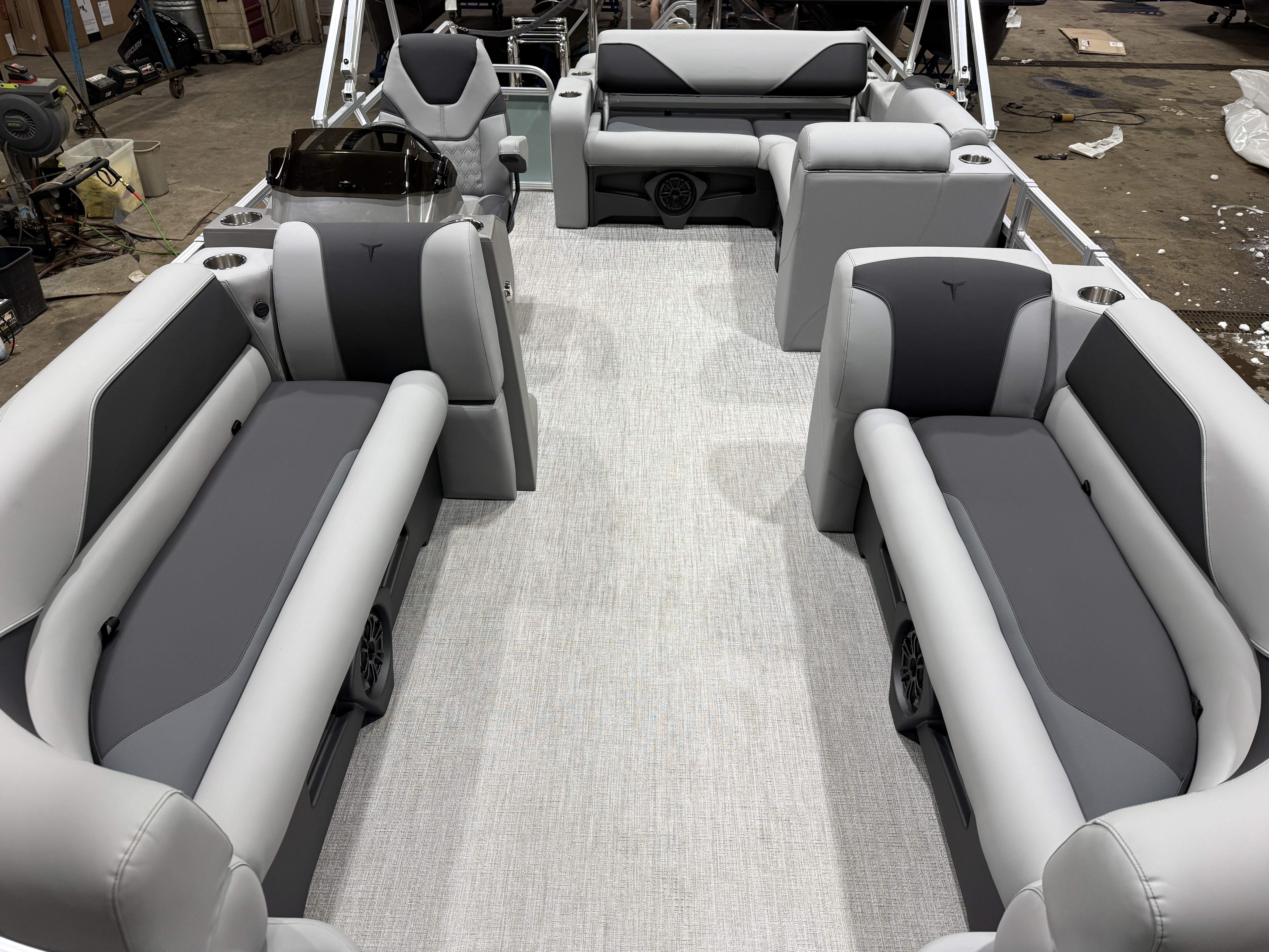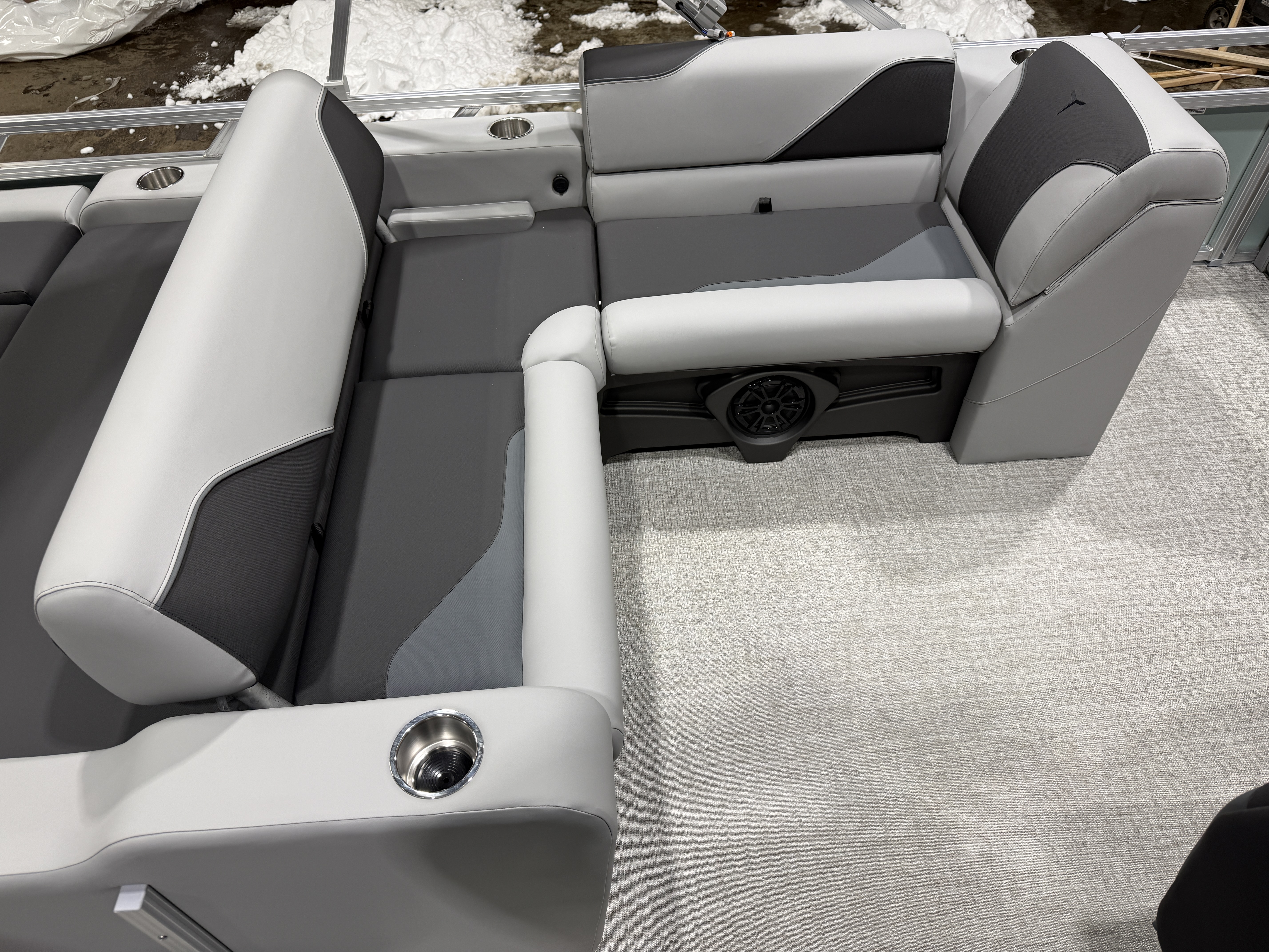 2026 Tahoe Sport 2385 Versatile Rear Bench (VRB) Swingback Pontoon & Honda 4-Stroke EFI. This Platinum Edition Pontoon Has Front Chaise Lounge Seating With Storage, Commander Reclining Captain's Chair, Wrap Around Chaise Lounge Seating With Storage, Seating That Turns Into A Bed Or Rear Facing Bench Seating, Rear Swim Deck, Riptide Vinyl Flooring, Smoked Chrome Docklights, Table, Mooring Cover, Garmin 52CV GPS Depth Finder, Fusion Bluetooth Radio, Multiple Cup Holders, 25" Tubes, 10' Bimini Top, Bead Blast Corner Caps, Gated Aft, Graphite Interior Package w/Kool Fab Black & Charcoal Accent, Ski Tow Bar w/Chains, Bow & Aft USB Charging Ports, Ladder, Side Storage Behind Captain's Seat, Front Deck. Rated For 11 People.